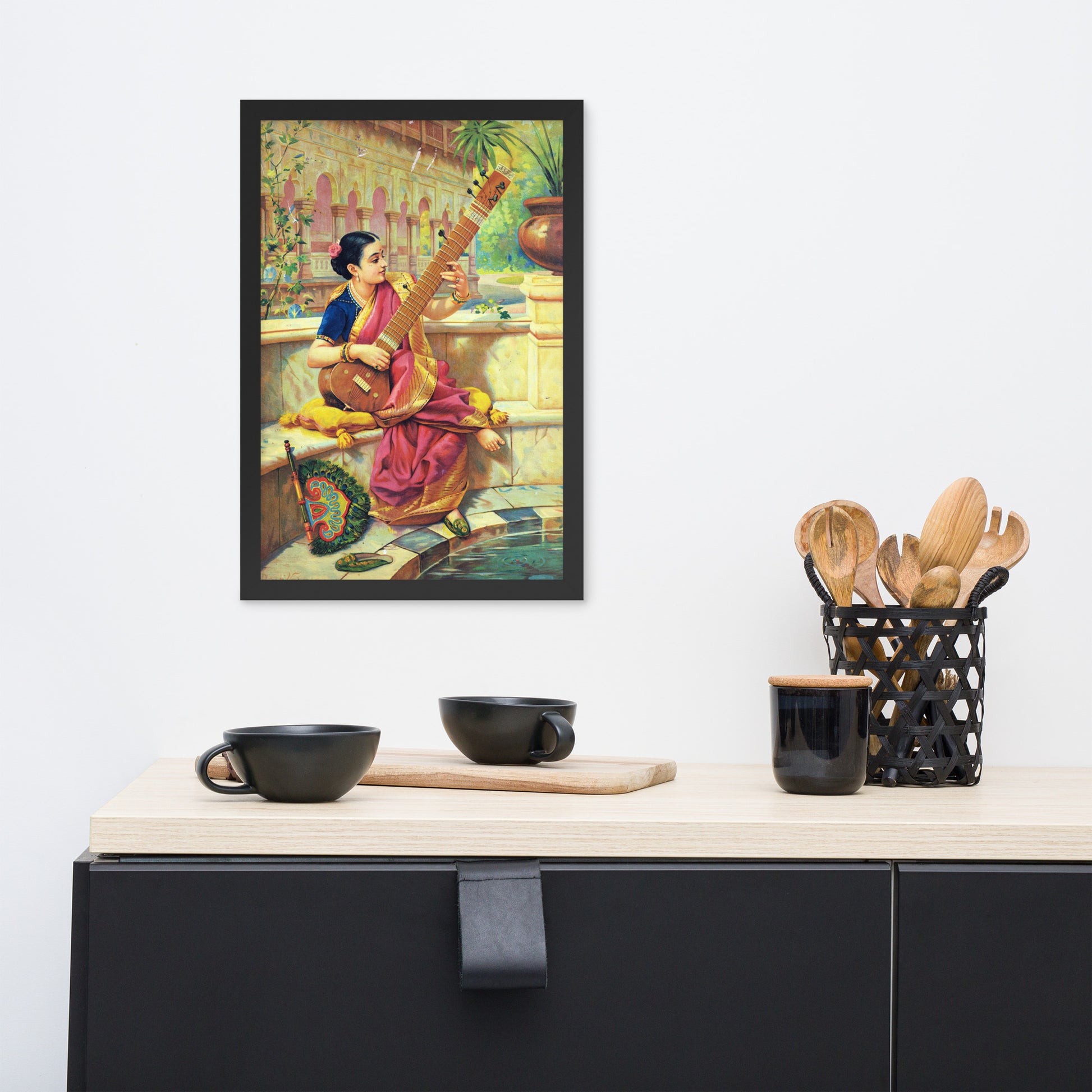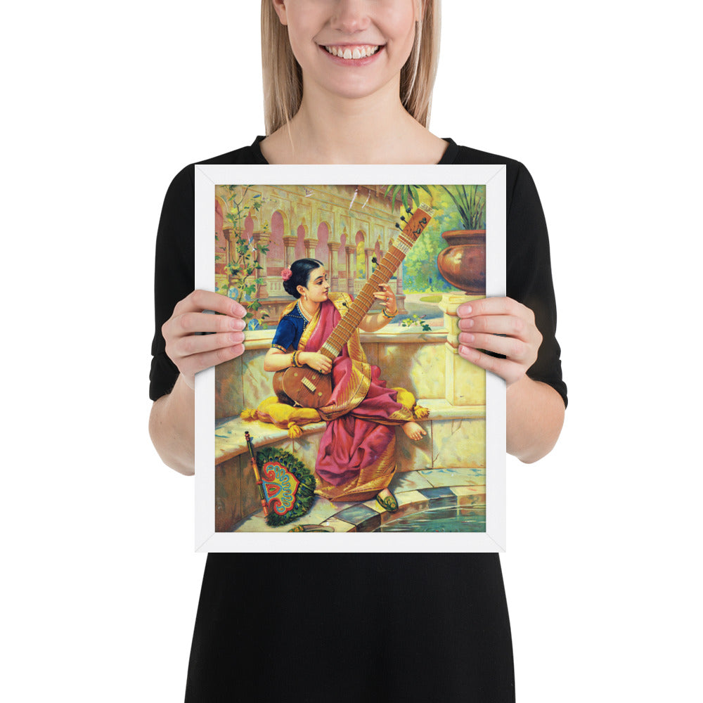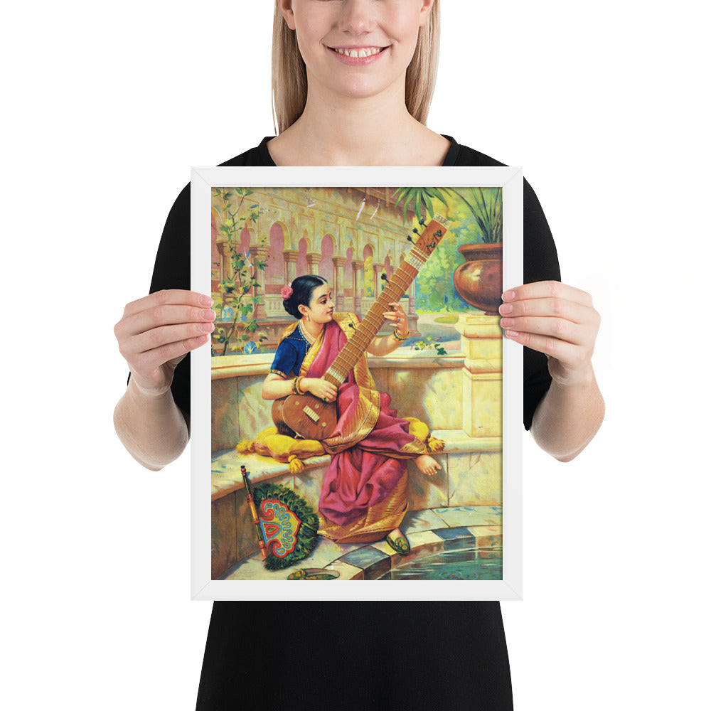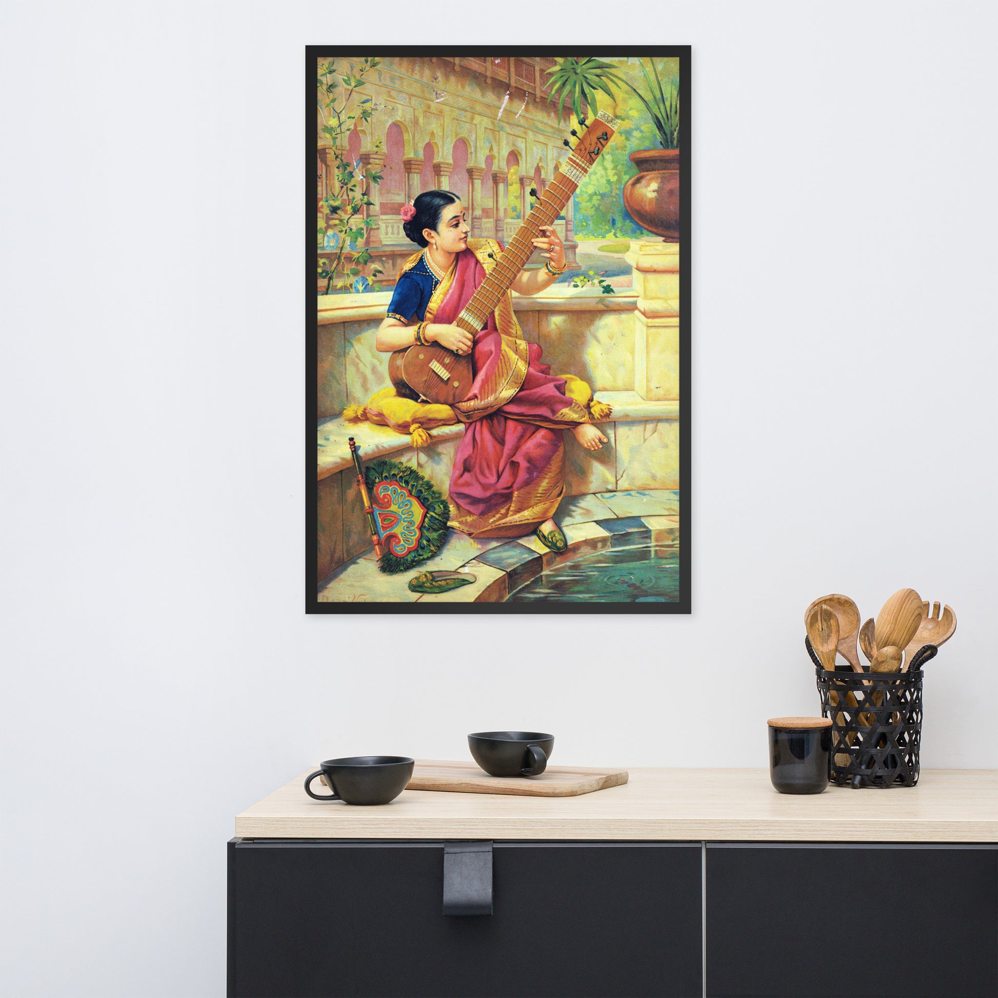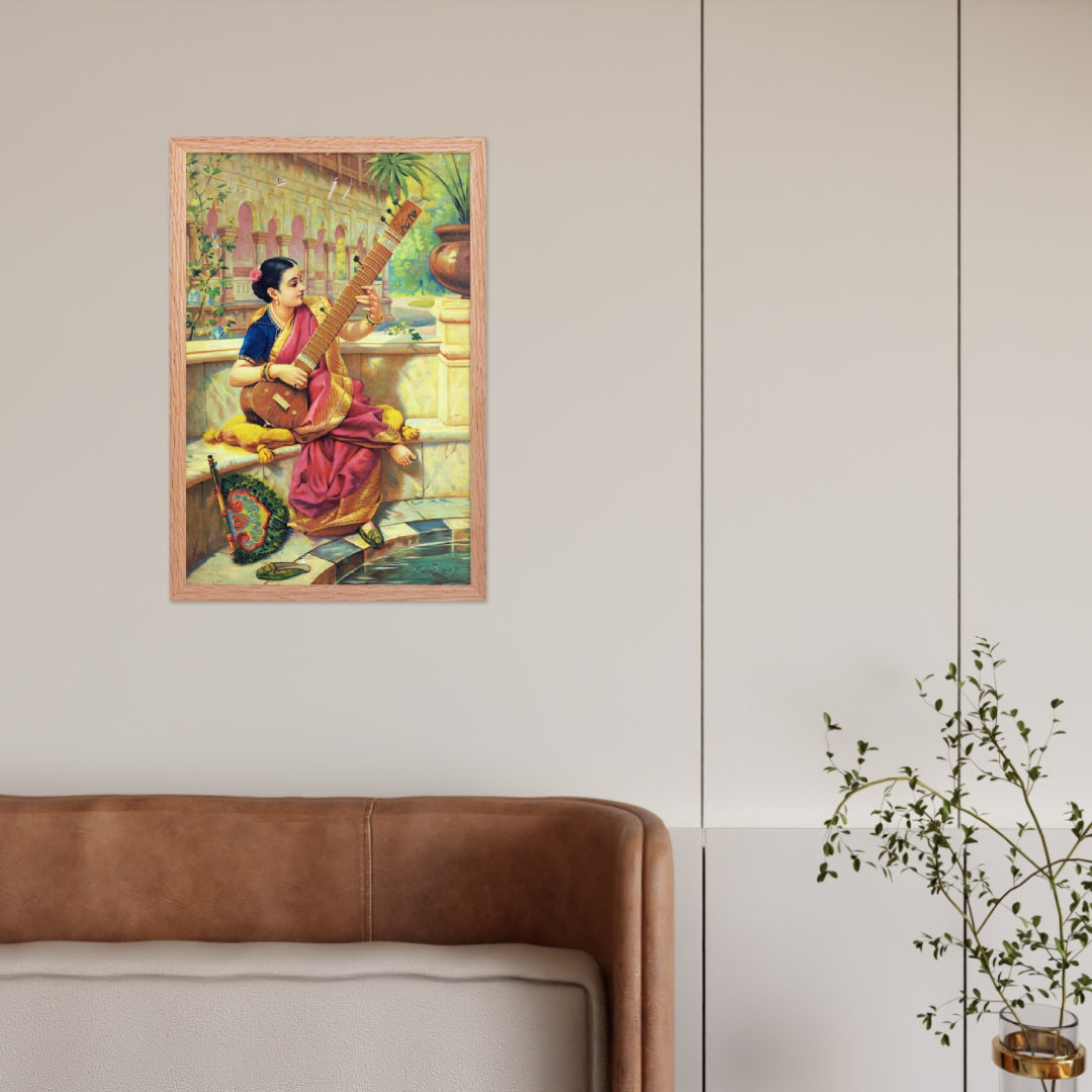 Immerse your space in timeless elegance with Kadambari by Raja Ravi Varma—a celebrated Indian masterpiece that captures the quiet grace of classical music and royal serenity. This framed wall print features a woman seated on marble steps, adorned in a richly detailed red and gold saree, playing a sitar with poised concentration. Her jewelry glimmers softly against the architectural backdrop of arched corridors, potted palms, and a tranquil water body that reflects the scene’s warmth and depth.