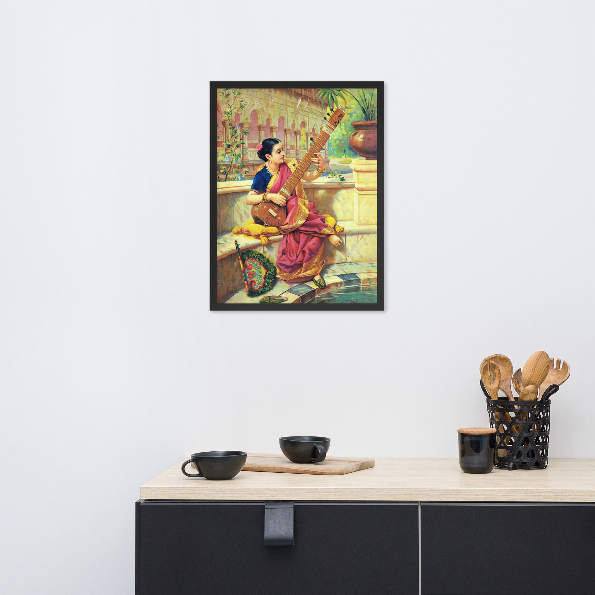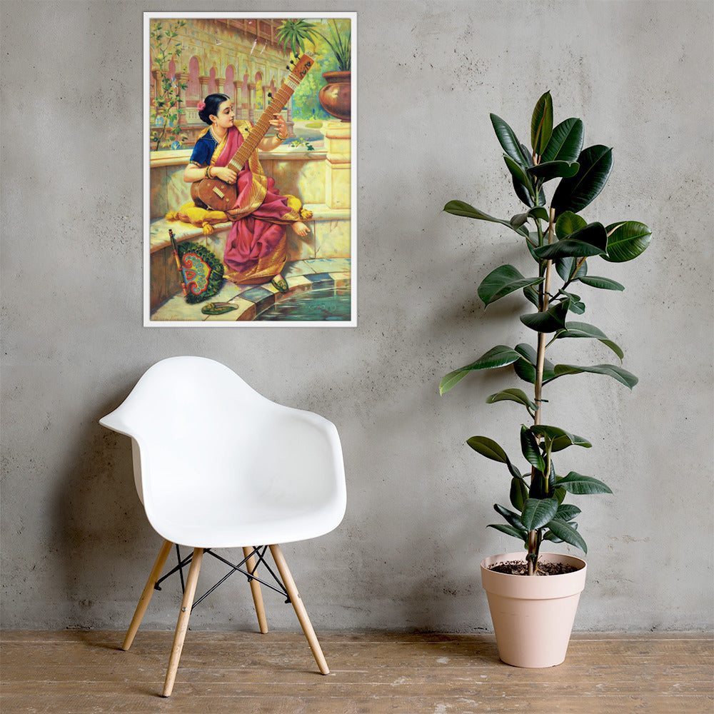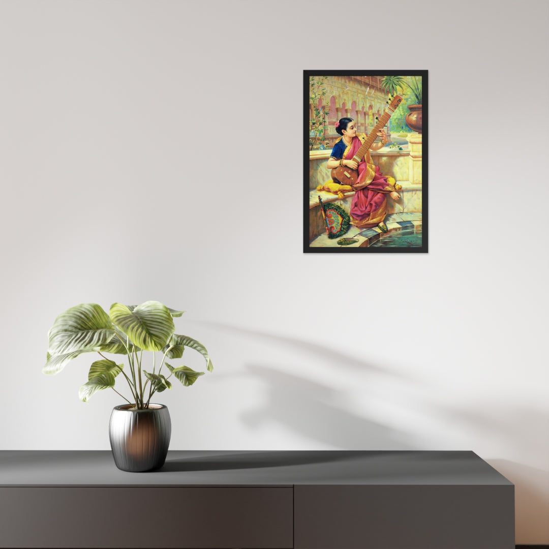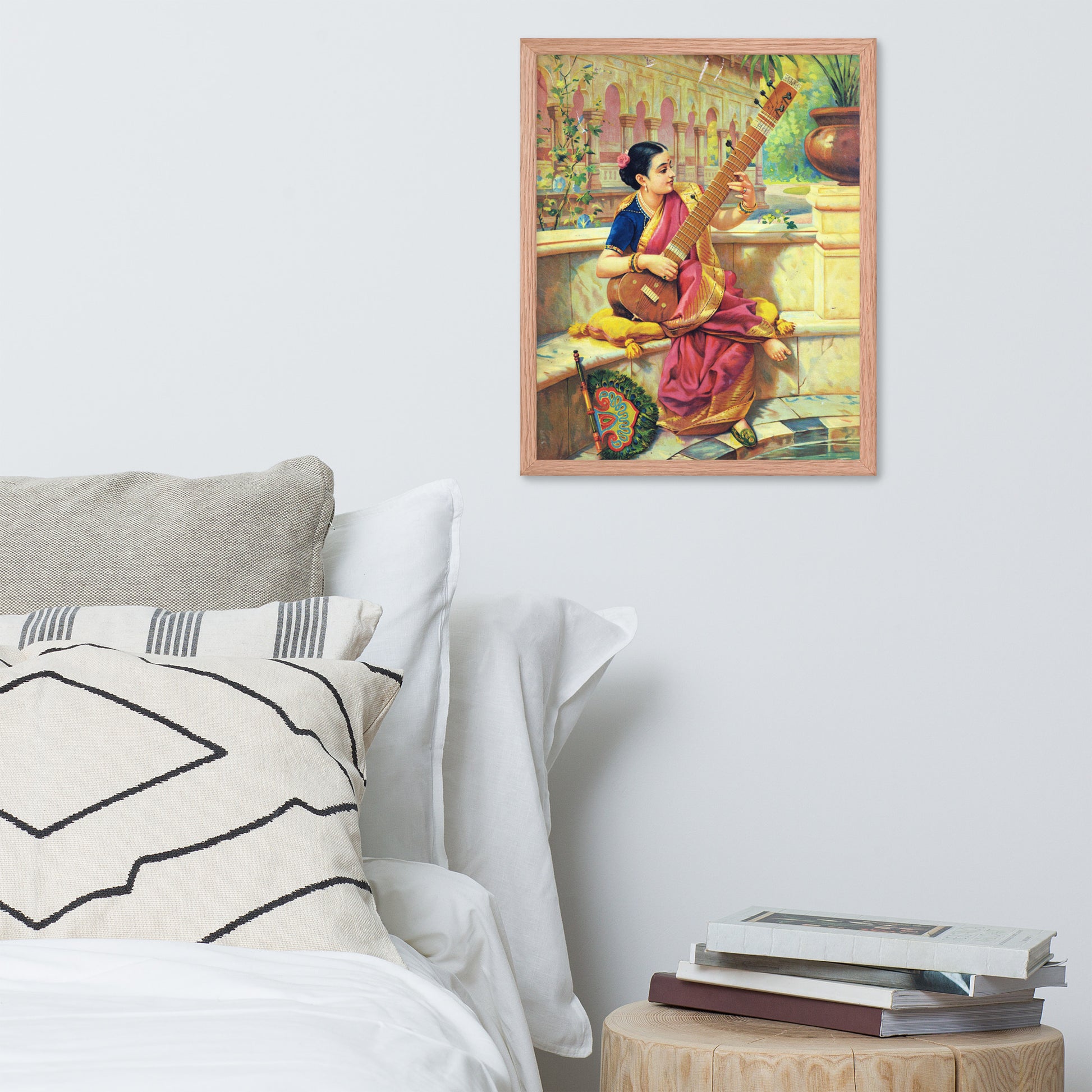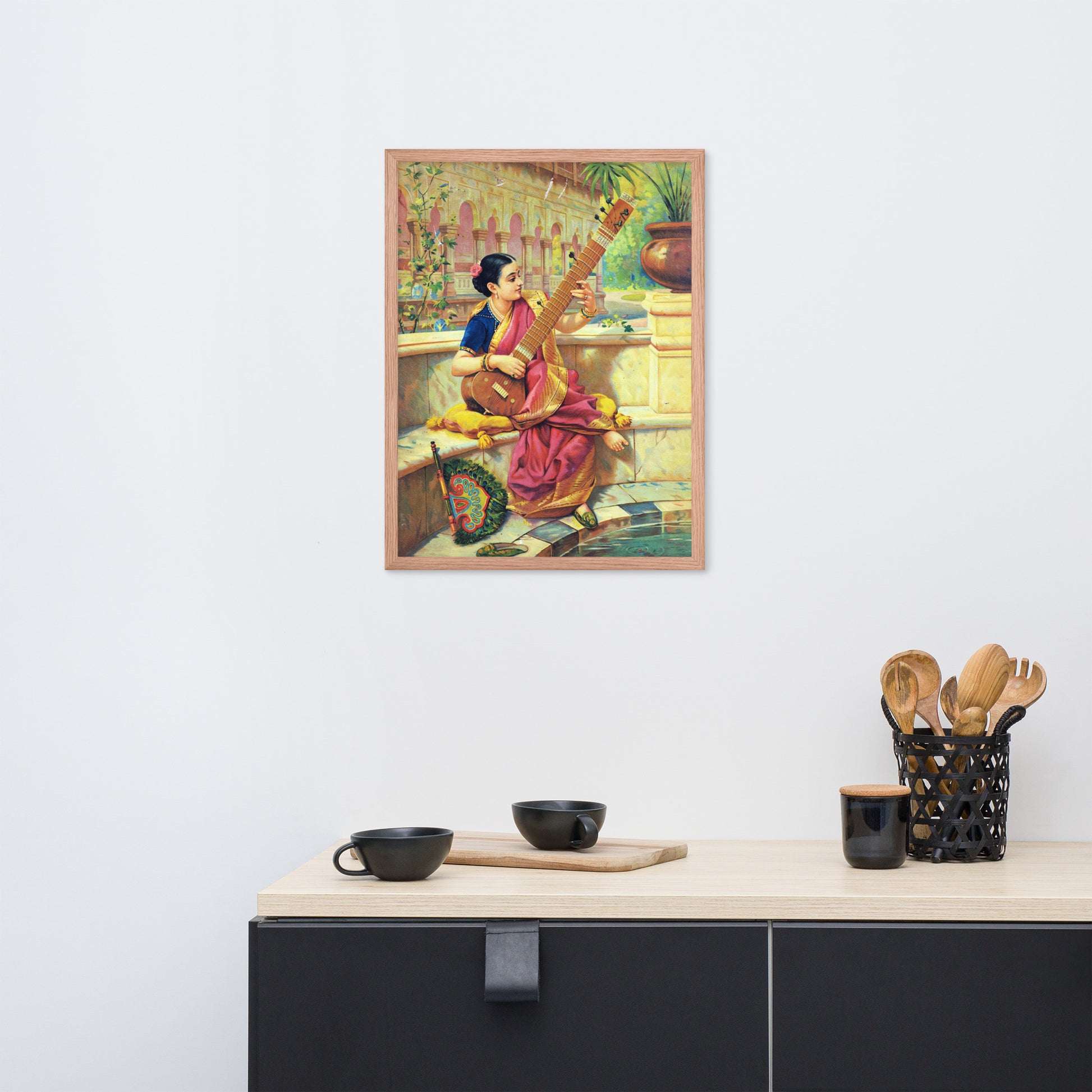 Immerse your space in timeless elegance with Kadambari by Raja Ravi Varma—a celebrated Indian masterpiece that captures the quiet grace of classical music and royal serenity. This framed wall print features a woman seated on marble steps, adorned in a richly detailed red and gold saree, playing a sitar with poised concentration. Her jewelry glimmers softly against the architectural backdrop of arched corridors, potted palms, and a tranquil water body that reflects the scene’s warmth and depth.
