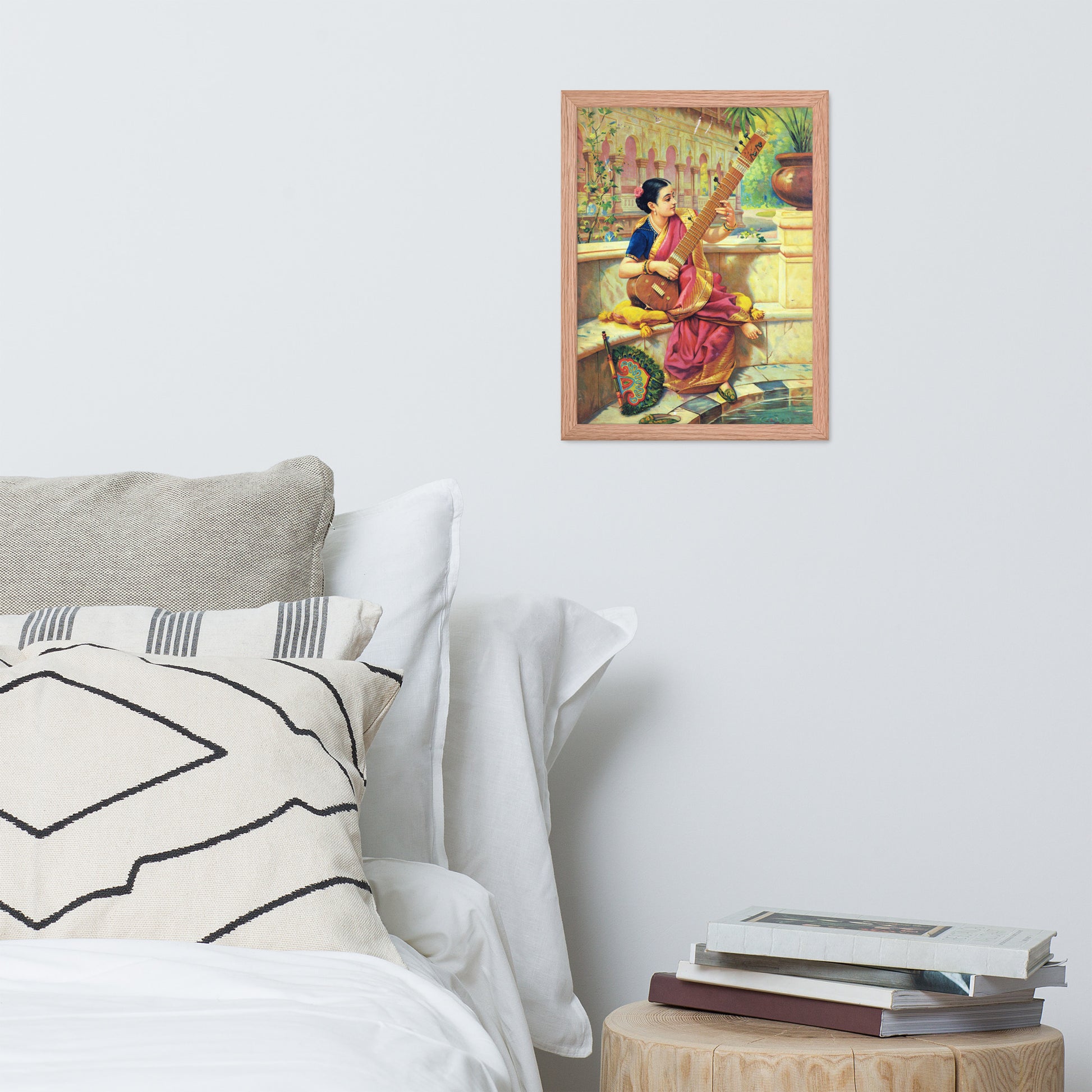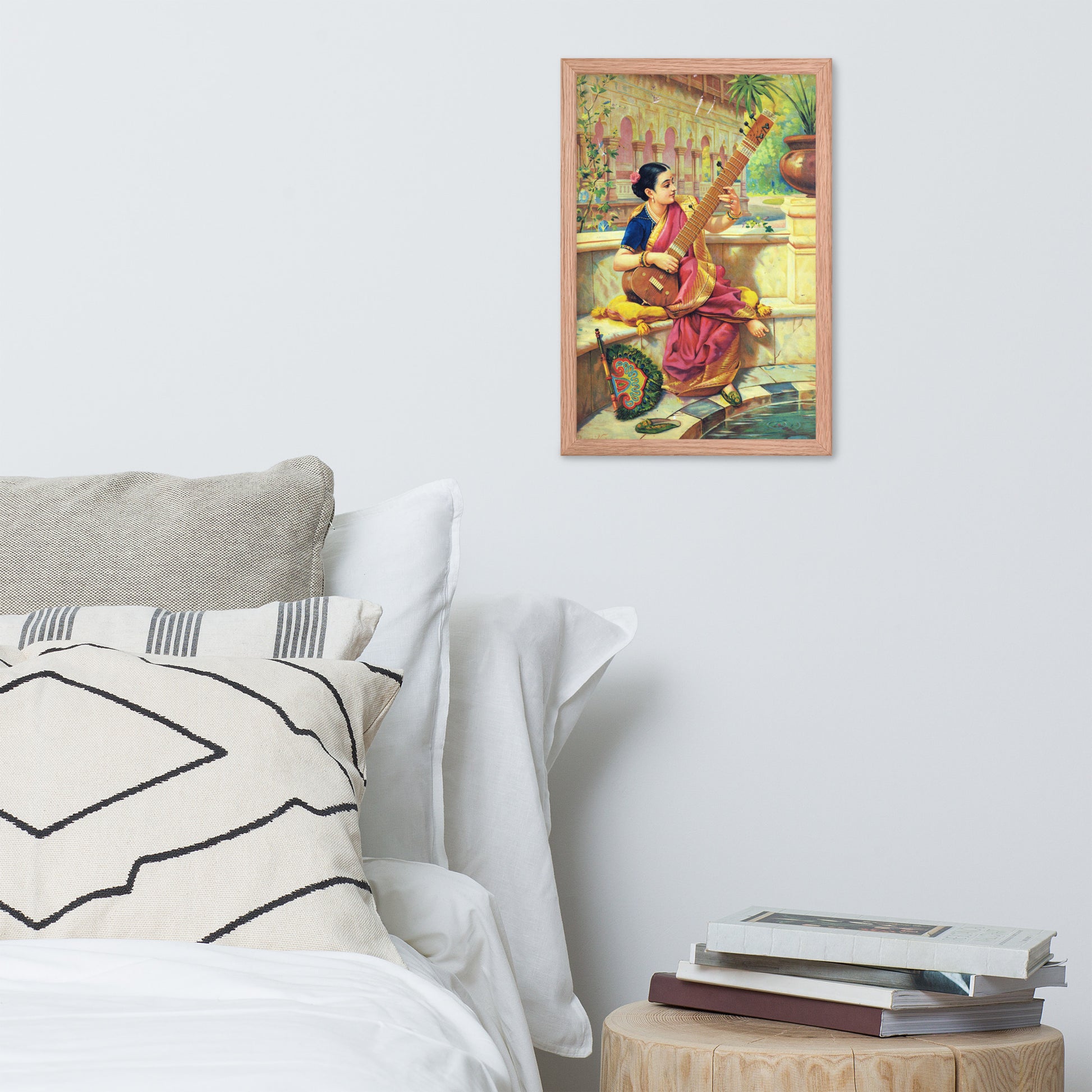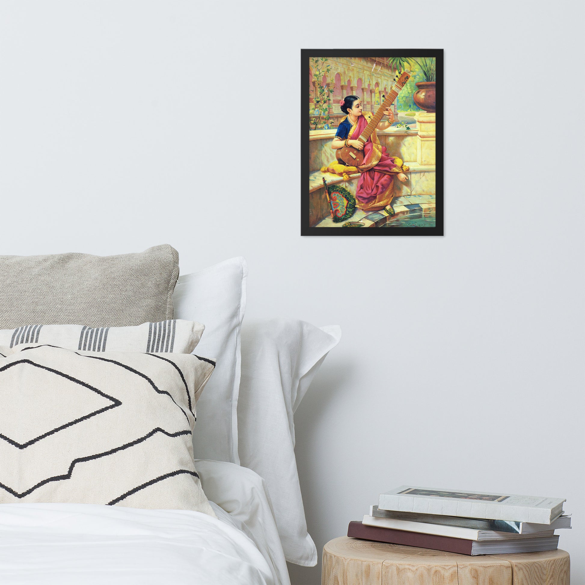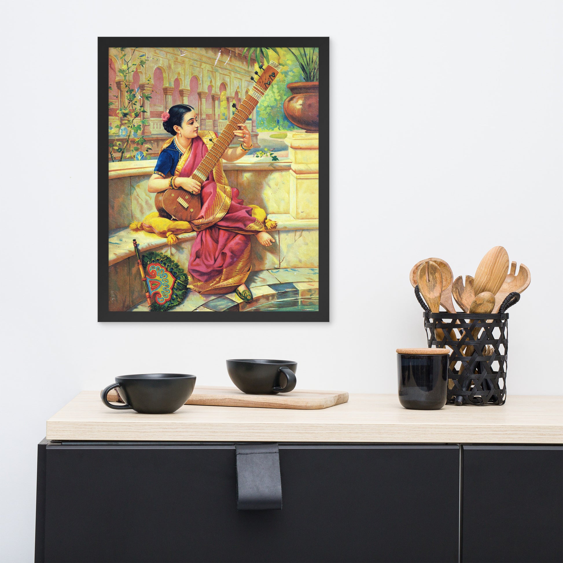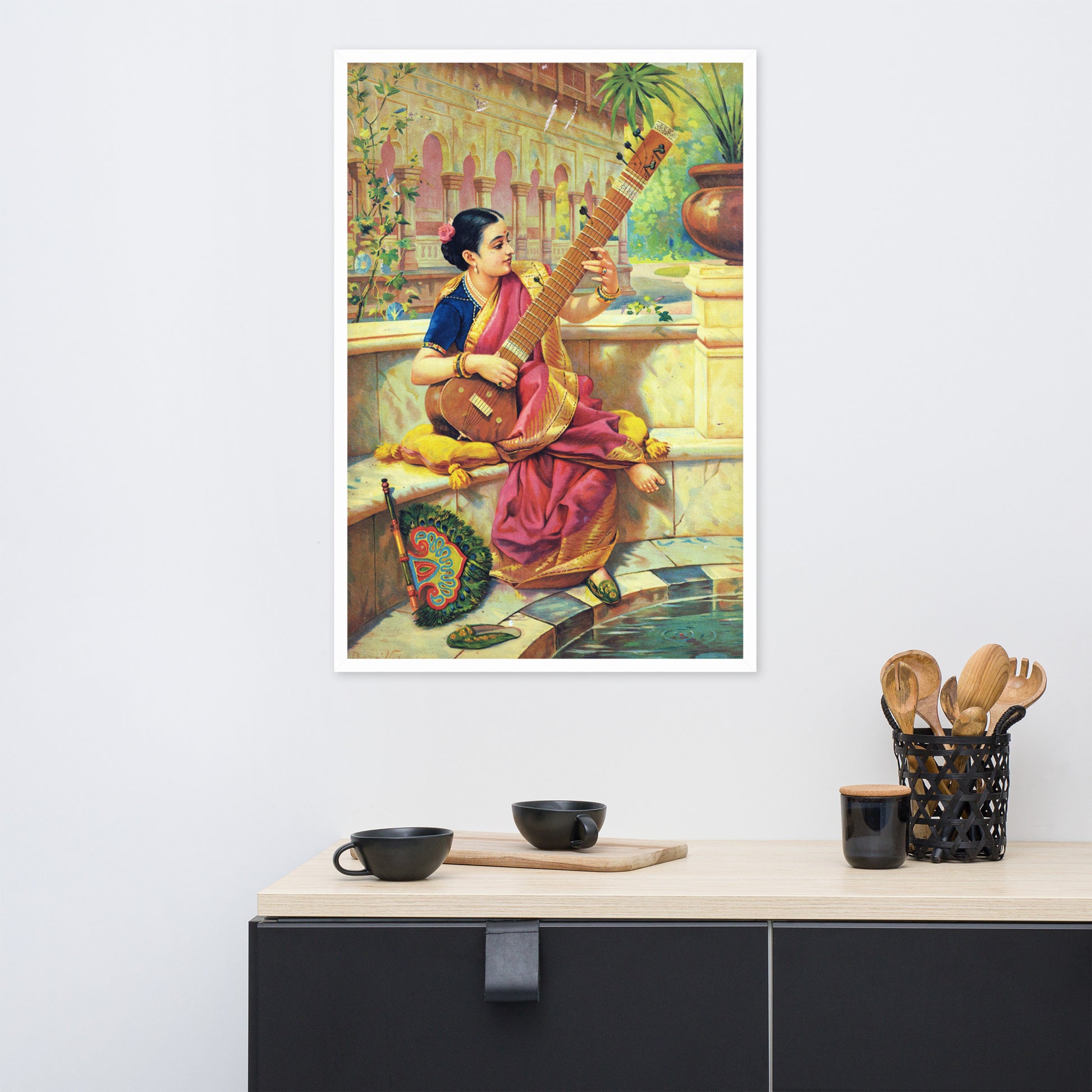 Immerse your space in timeless elegance with Kadambari by Raja Ravi Varma—a celebrated Indian masterpiece that captures the quiet grace of classical music and royal serenity. This framed wall print features a woman seated on marble steps, adorned in a richly detailed red and gold saree, playing a sitar with poised concentration. Her jewelry glimmers softly against the architectural backdrop of arched corridors, potted palms, and a tranquil water body that reflects the scene’s warmth and depth.