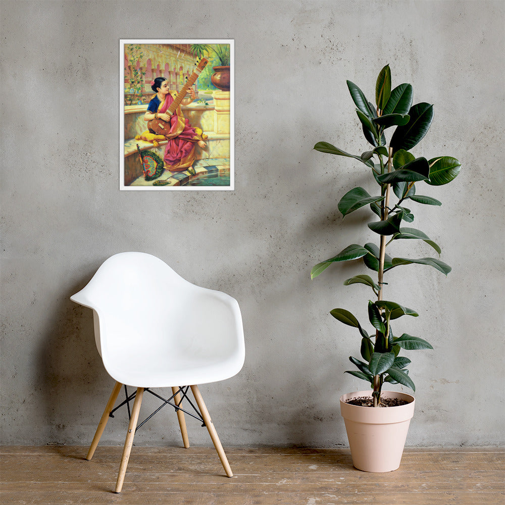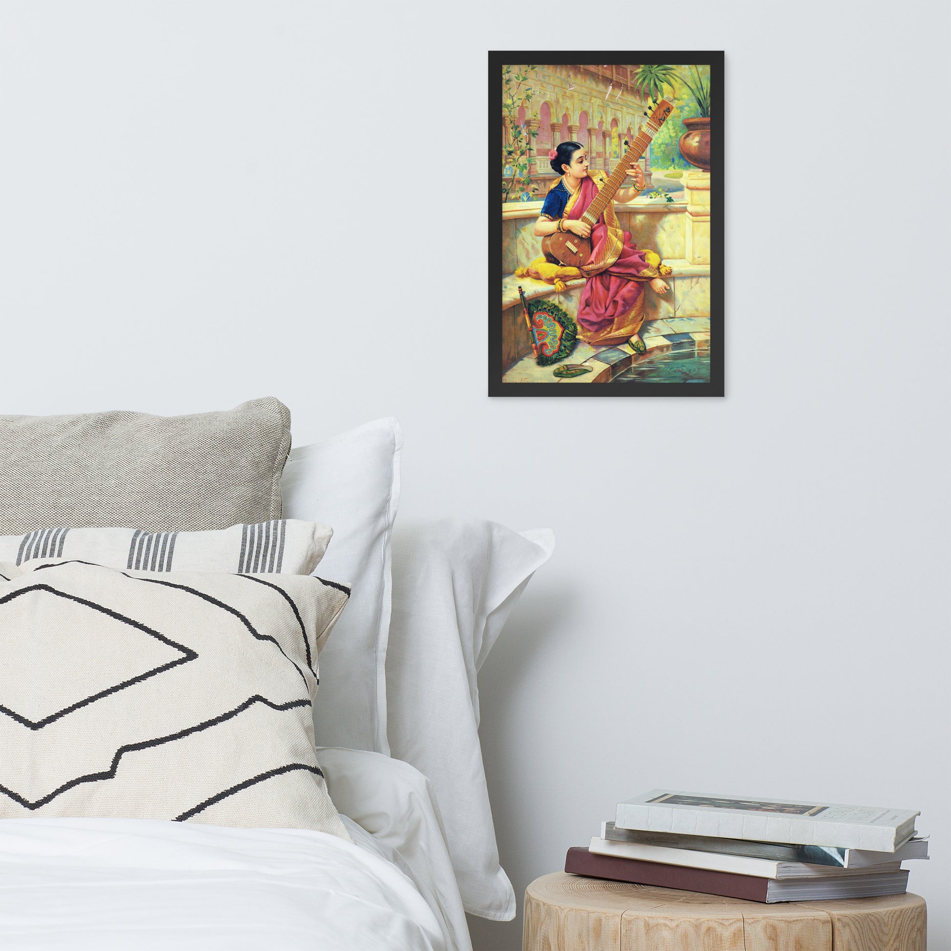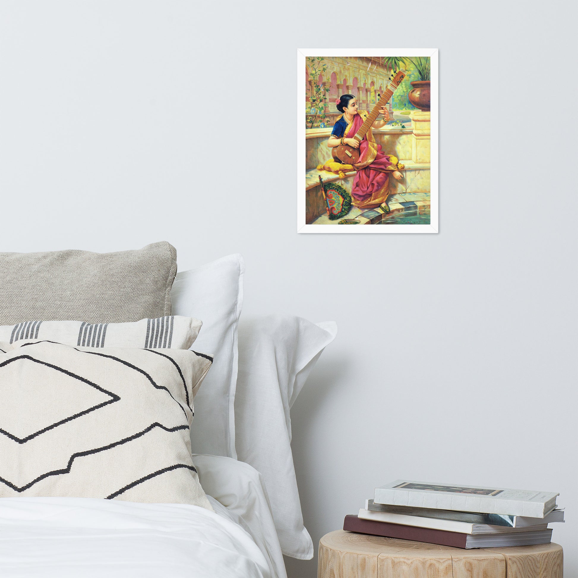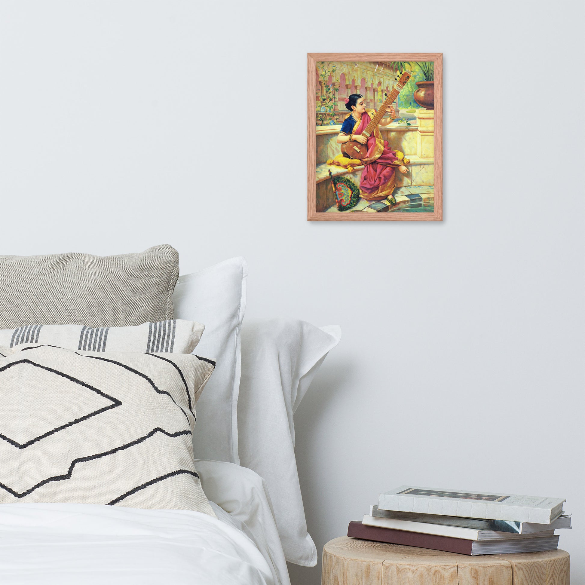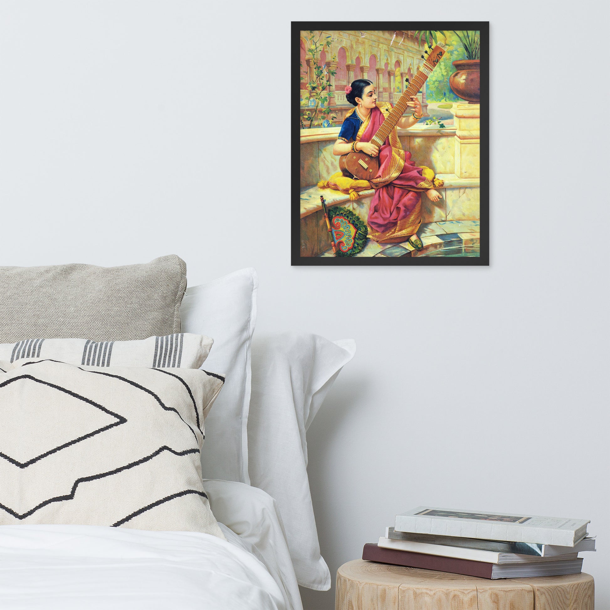 Immerse your space in timeless elegance with Kadambari by Raja Ravi Varma—a celebrated Indian masterpiece that captures the quiet grace of classical music and royal serenity. This framed wall print features a woman seated on marble steps, adorned in a richly detailed red and gold saree, playing a sitar with poised concentration. Her jewelry glimmers softly against the architectural backdrop of arched corridors, potted palms, and a tranquil water body that reflects the scene’s warmth and depth.
