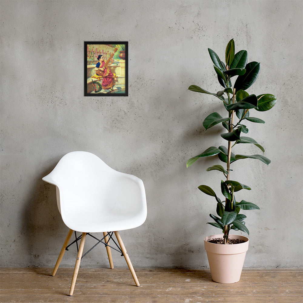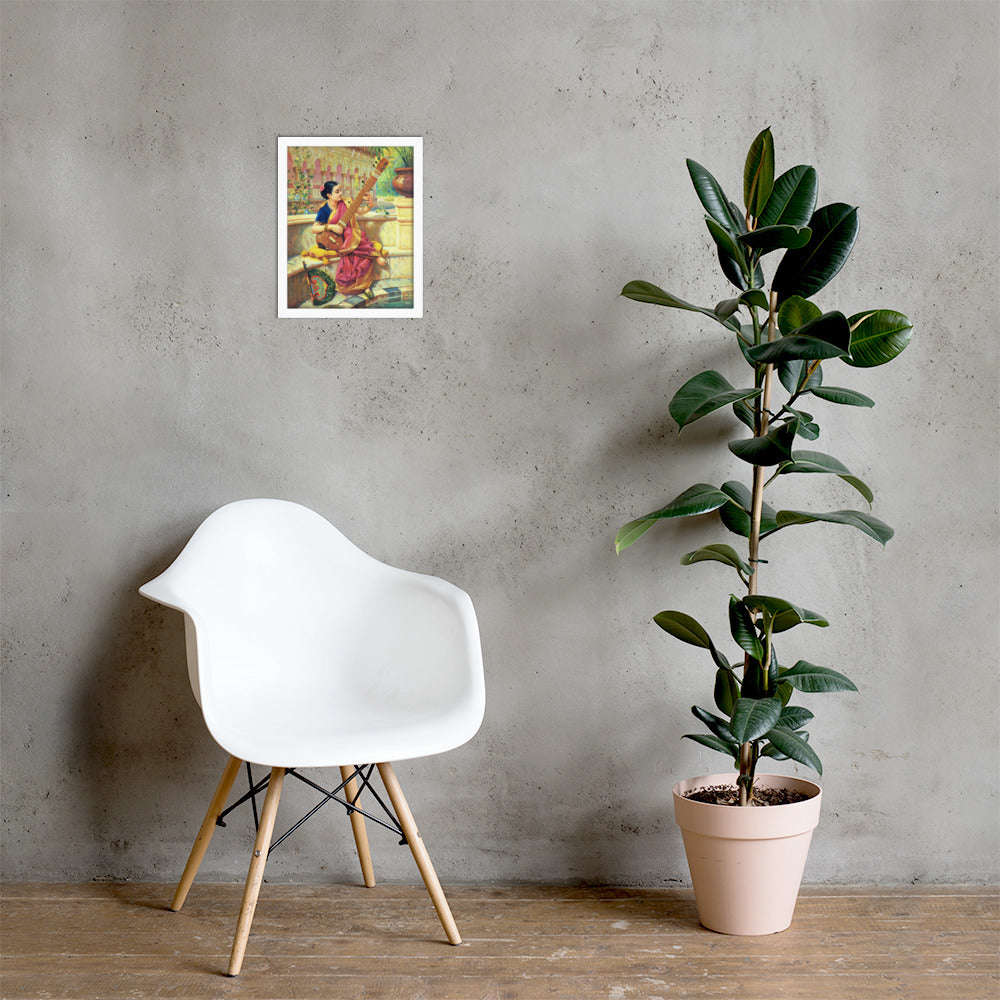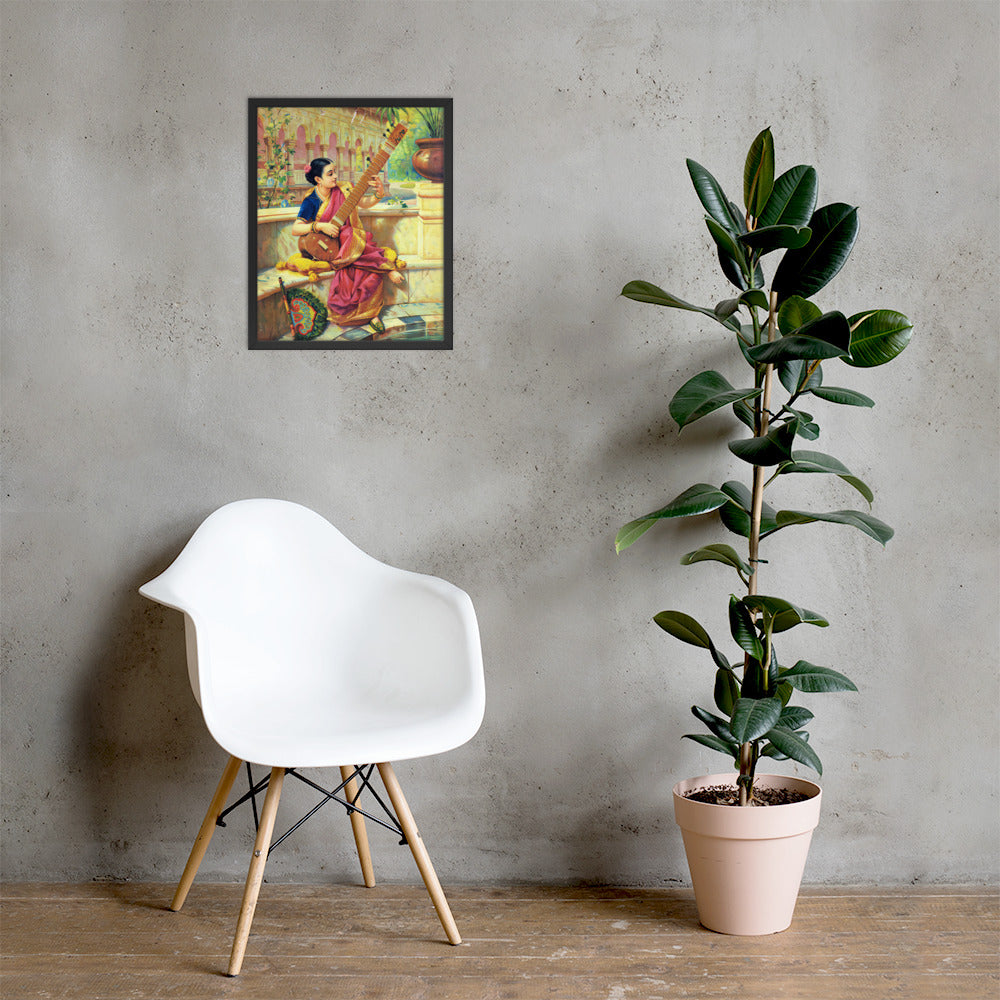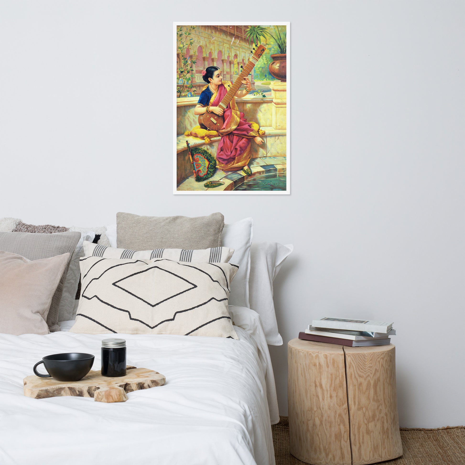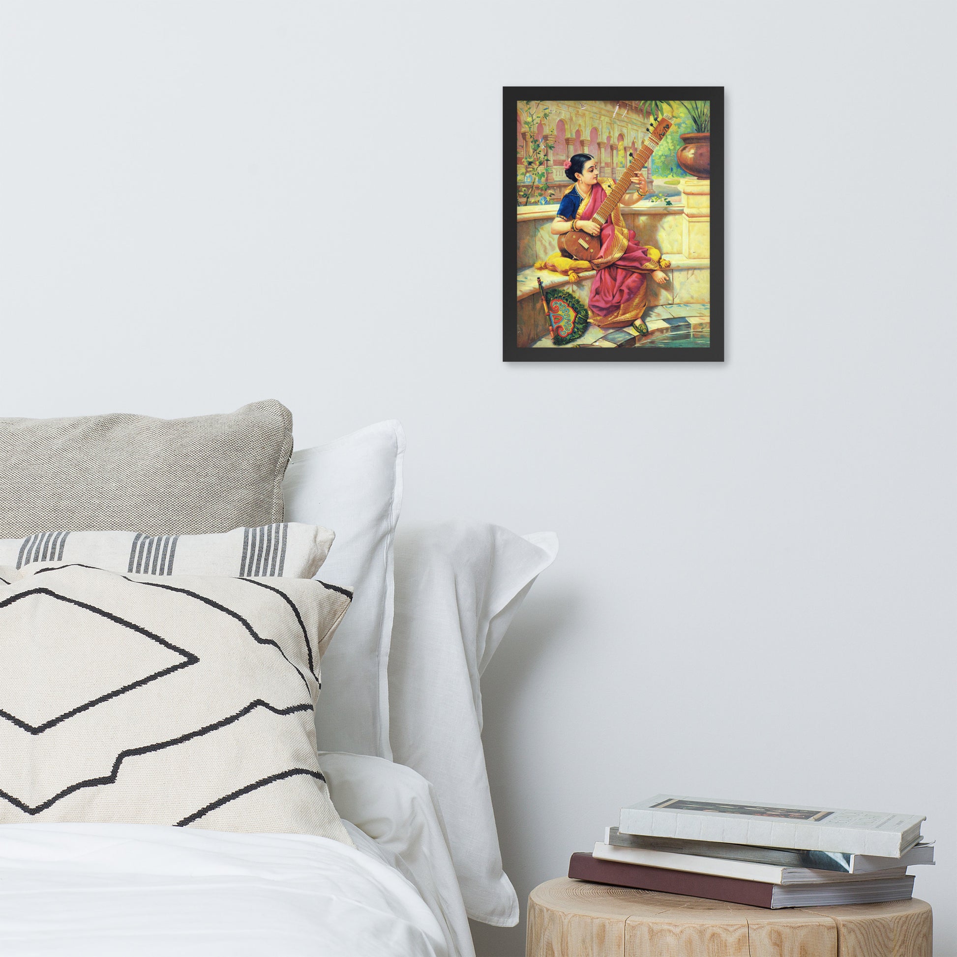 Immerse your space in timeless elegance with Kadambari by Raja Ravi Varma—a celebrated Indian masterpiece that captures the quiet grace of classical music and royal serenity. This framed wall print features a woman seated on marble steps, adorned in a richly detailed red and gold saree, playing a sitar with poised concentration. Her jewelry glimmers softly against the architectural backdrop of arched corridors, potted palms, and a tranquil water body that reflects the scene’s warmth and depth.