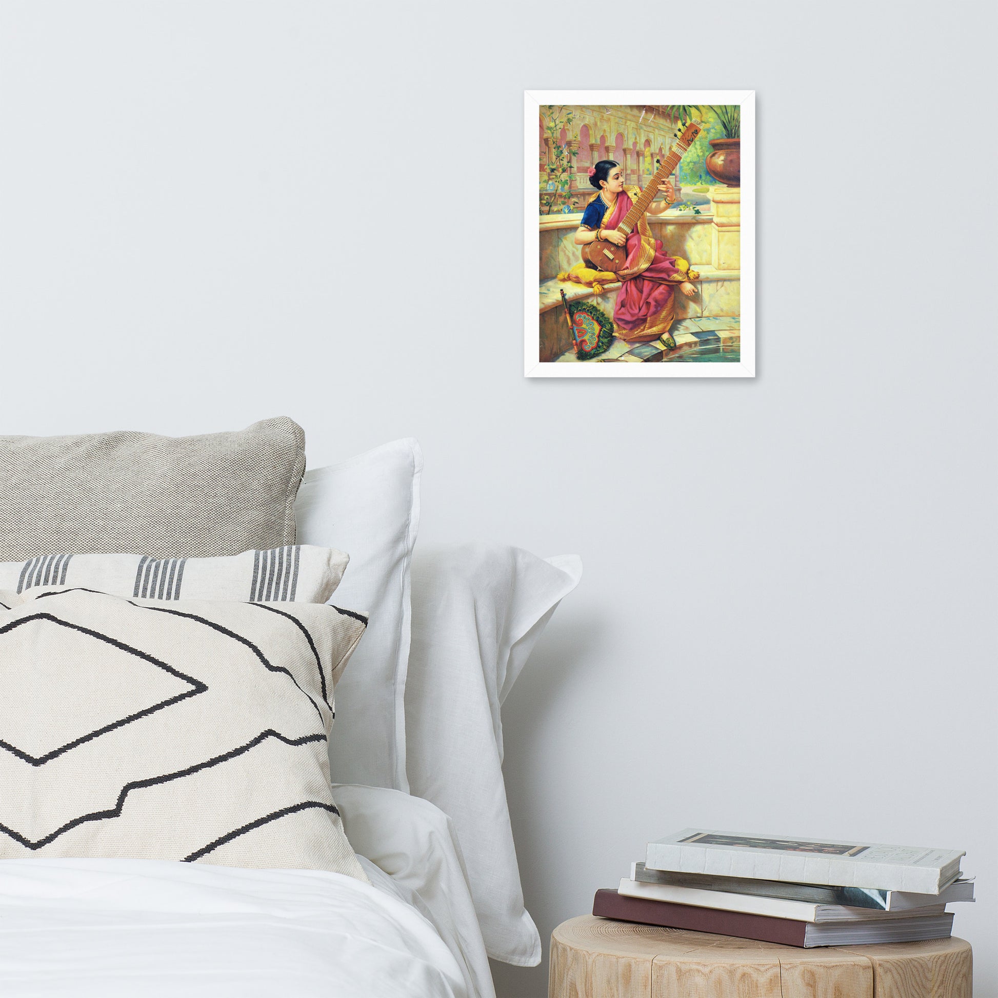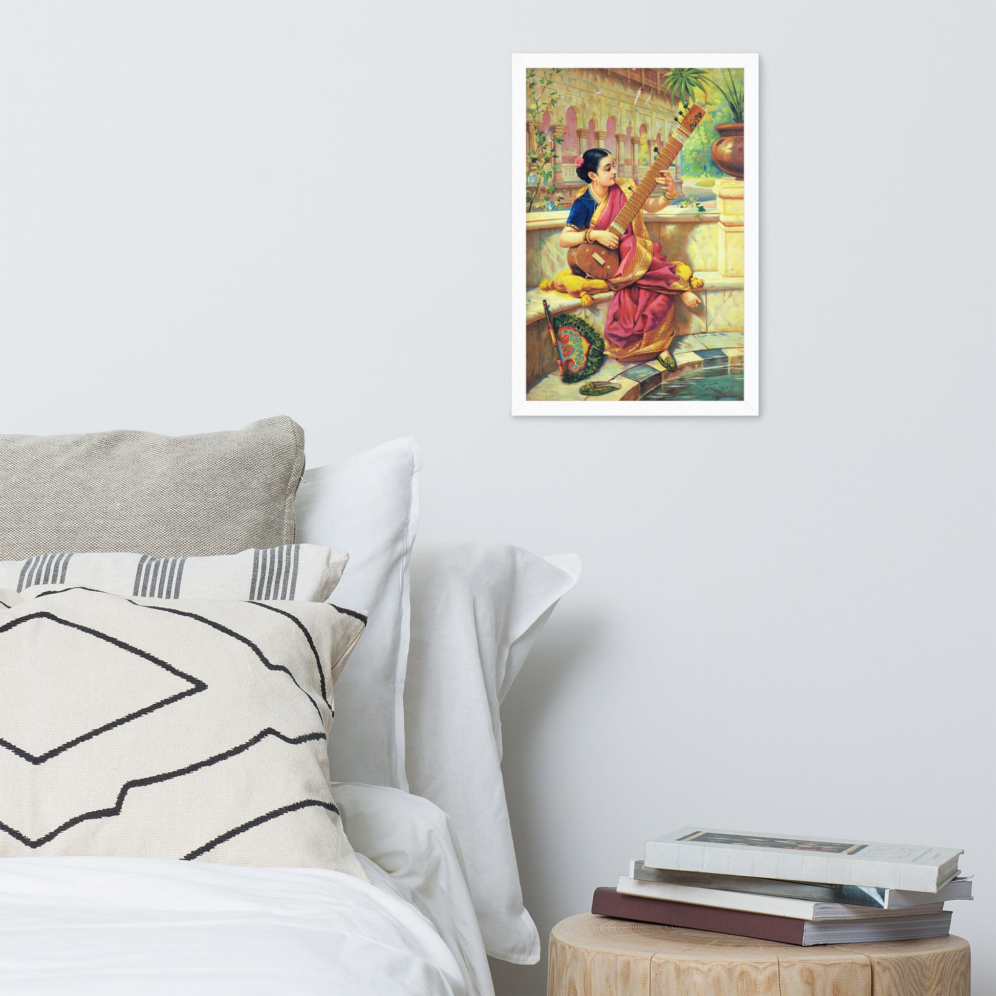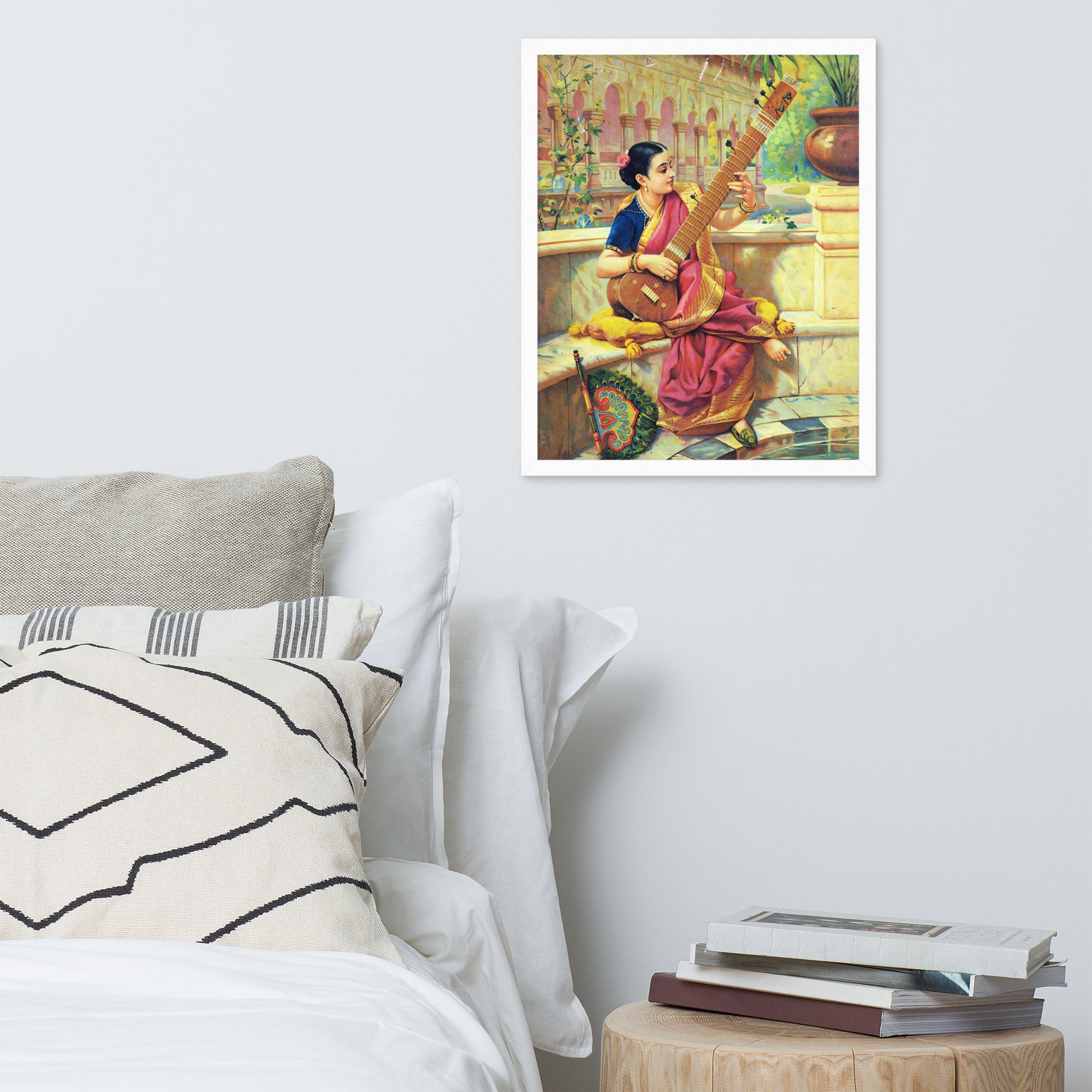 A decorative fan and slender stick rest beside her, adding layers of narrative and cultural symbolism. The composition evokes a bygone era of Indian nobility, where art, music, and tradition harmonized in everyday life. Perfect for living rooms, studios, or gallery-style interiors, this print brings a touch of Indian heritage and emotional storytelling to modern décor.