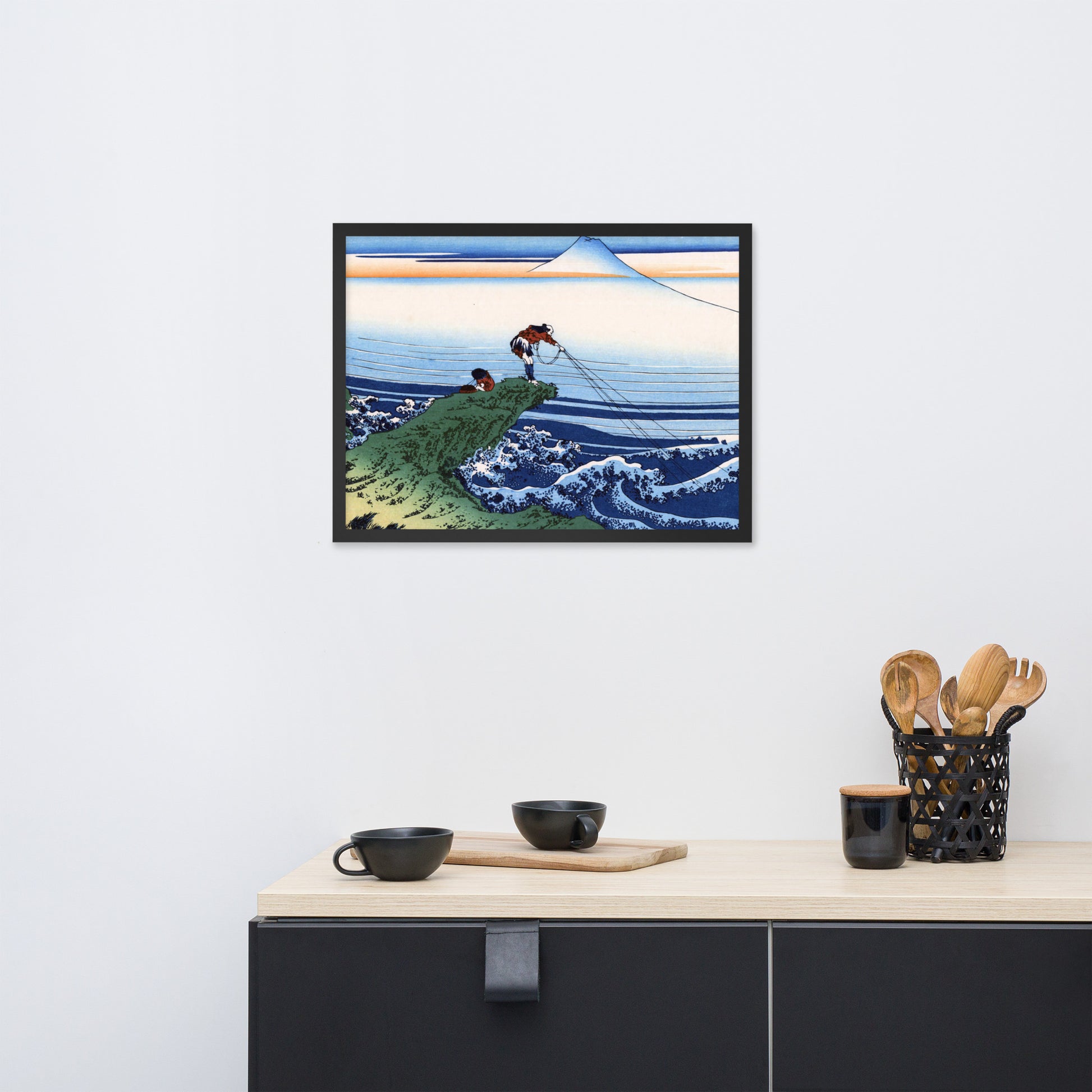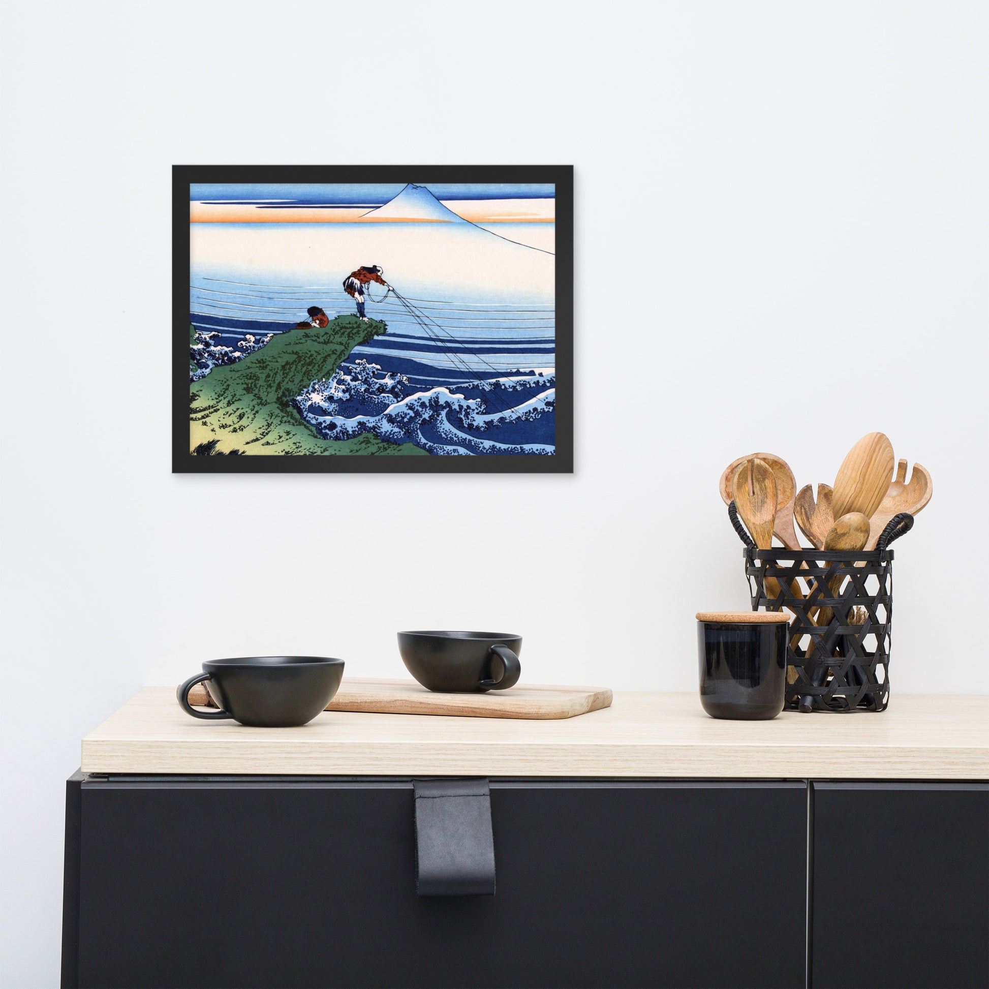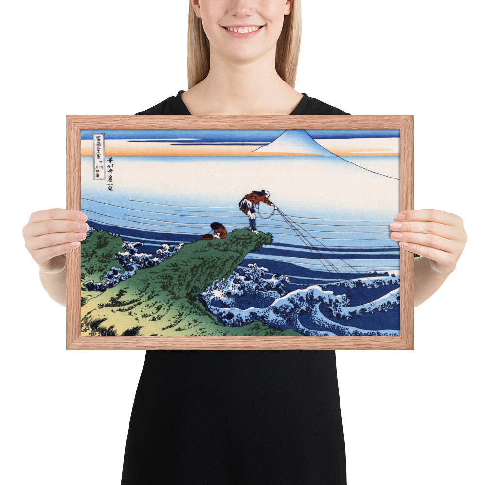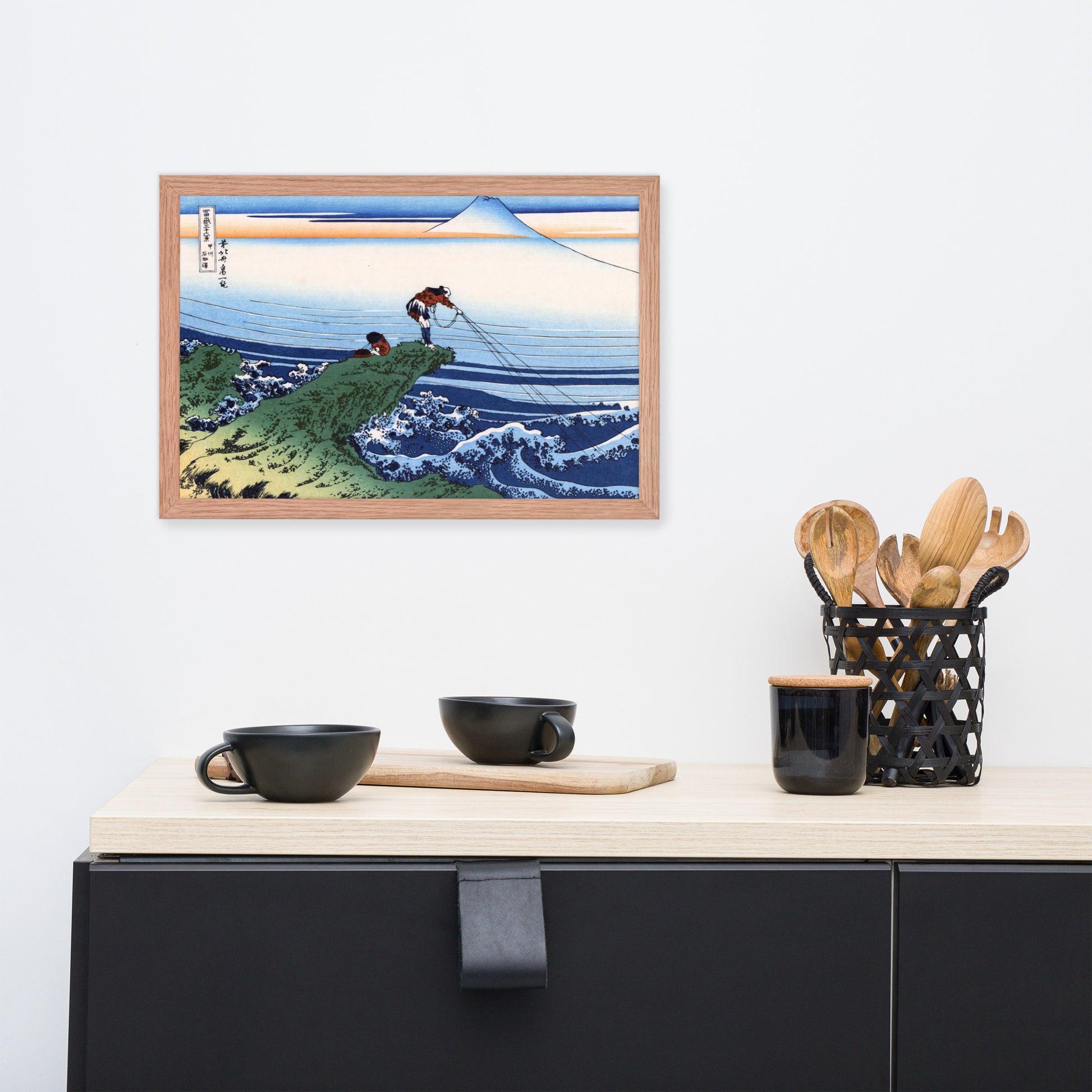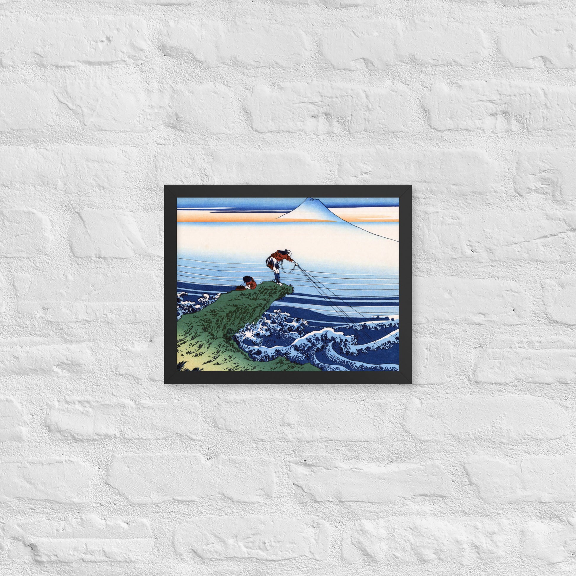 Immerse yourself in the quiet poetry of Kajikazawa in Kai Province by Katsushika Hokusai—a masterful Japanese Woodblock Print (Ukiyo-e) that captures the intimate relationship between humanity and nature. This framed wall print depicts a fisherman perched on rocky cliffs, casting his lines into stylized waves, while Mount Fuji rises serenely in the distance. The composition balances dynamic movement with meditative stillness, rendered in rich blues, soft gradients, and precise linework.