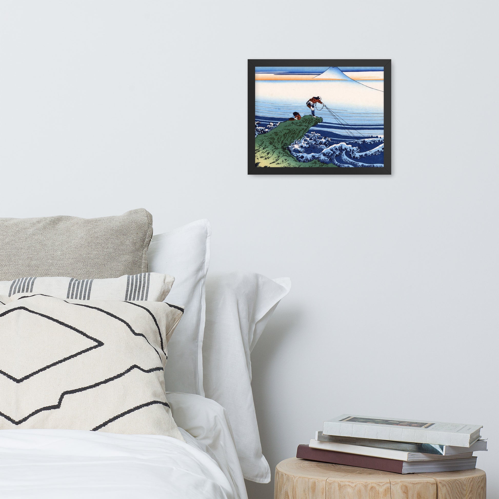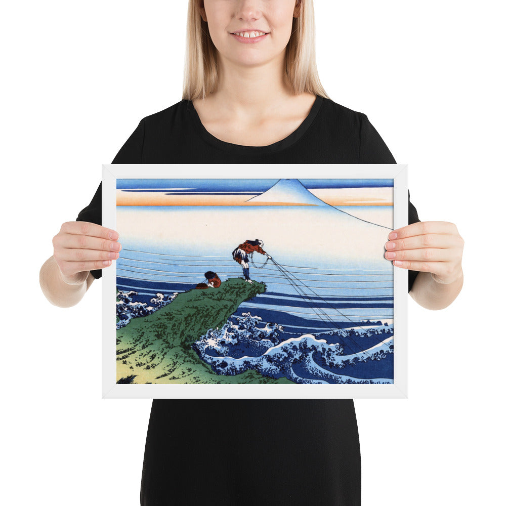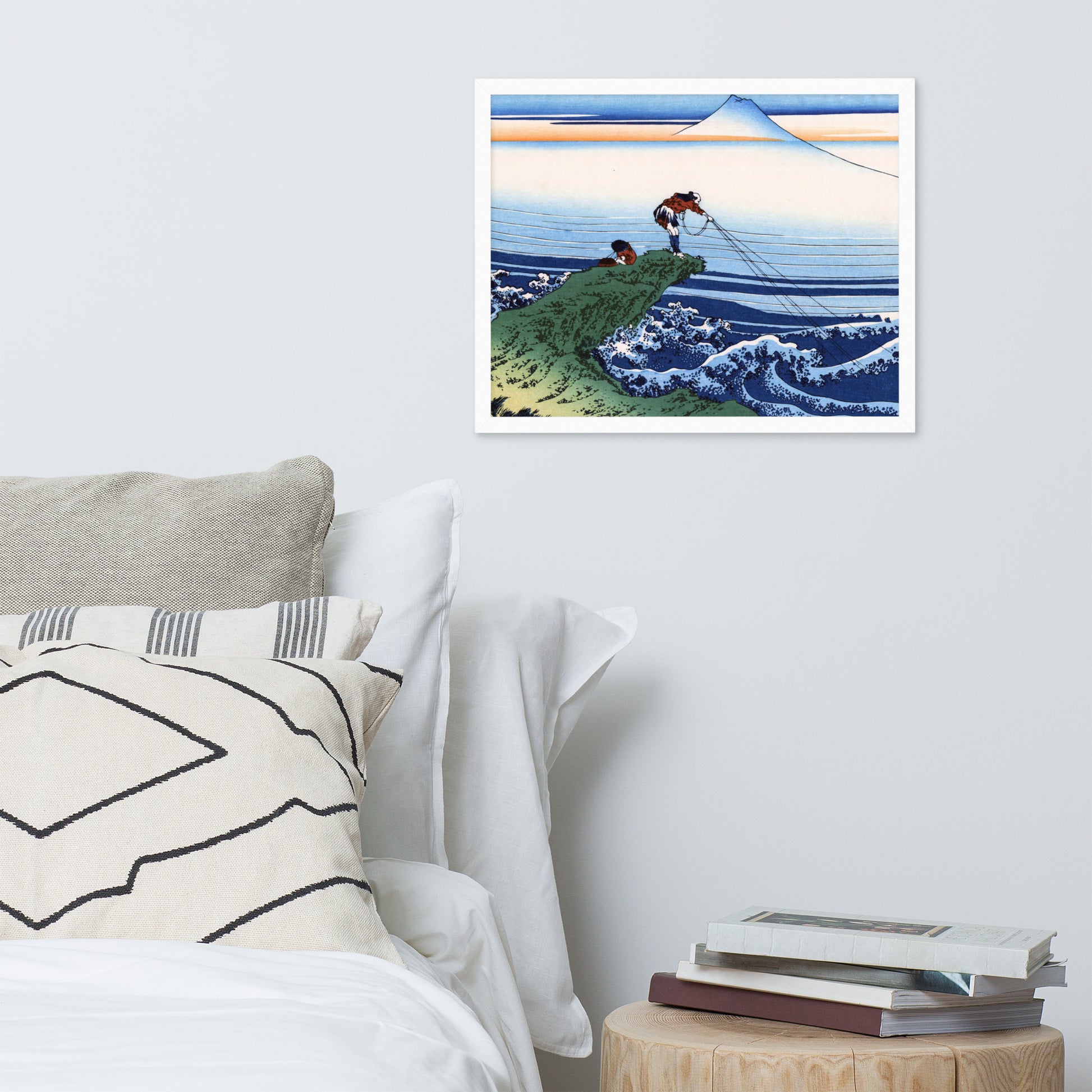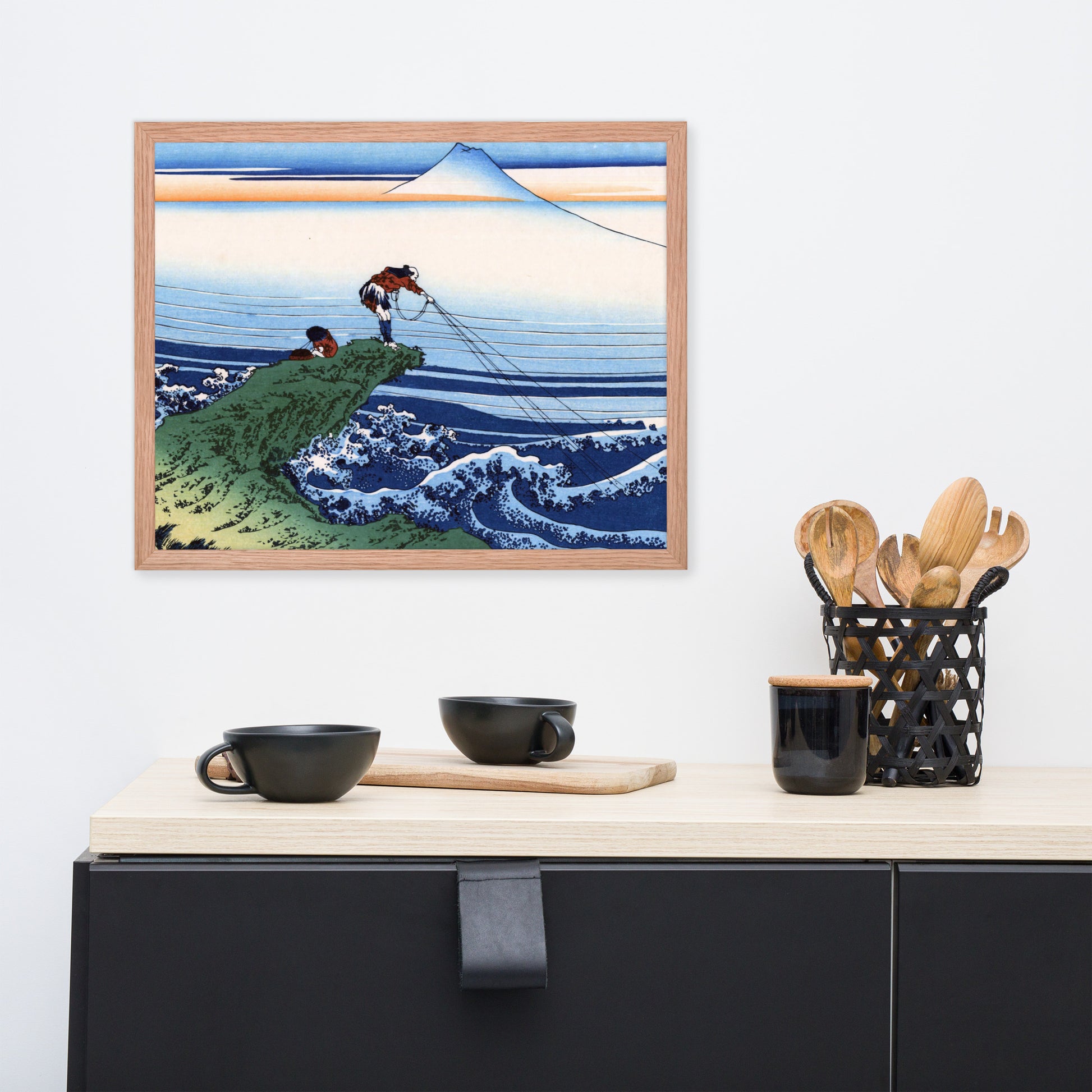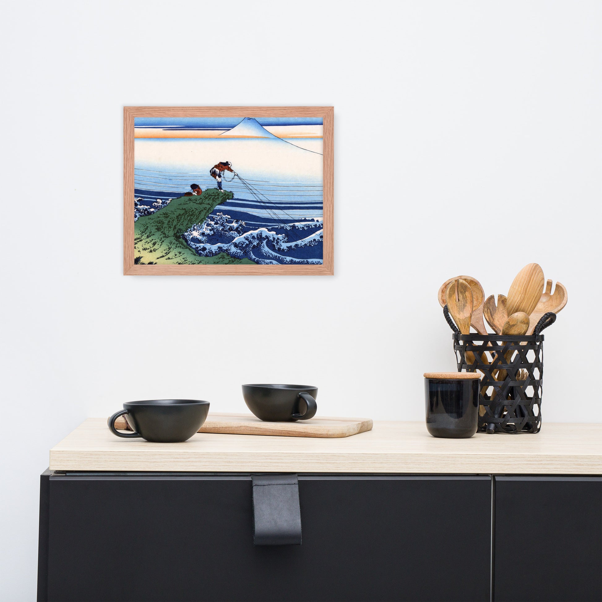 Immerse yourself in the quiet poetry of Kajikazawa in Kai Province by Katsushika Hokusai—a masterful Japanese Woodblock Print (Ukiyo-e) that captures the intimate relationship between humanity and nature. This framed wall print depicts a fisherman perched on rocky cliffs, casting his lines into stylized waves, while Mount Fuji rises serenely in the distance. The composition balances dynamic movement with meditative stillness, rendered in rich blues, soft gradients, and precise linework.