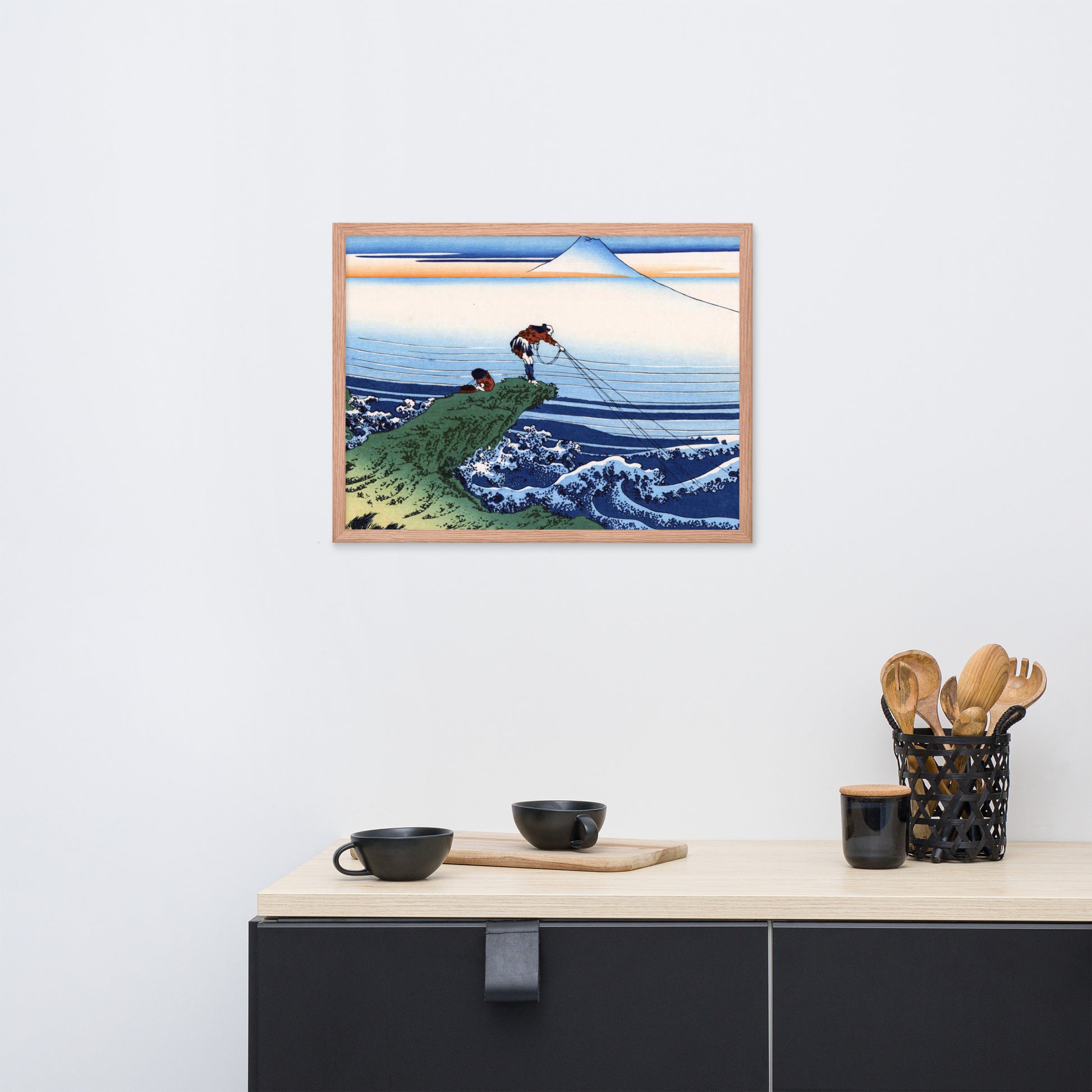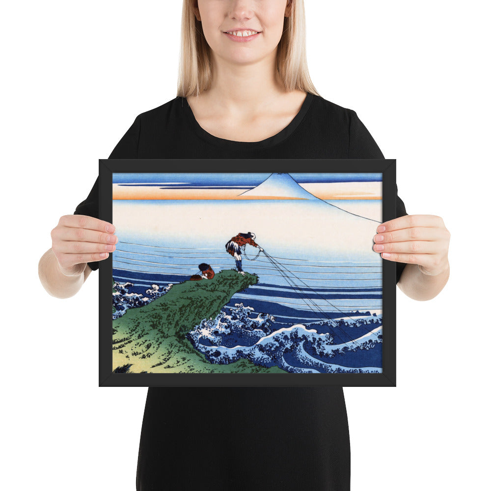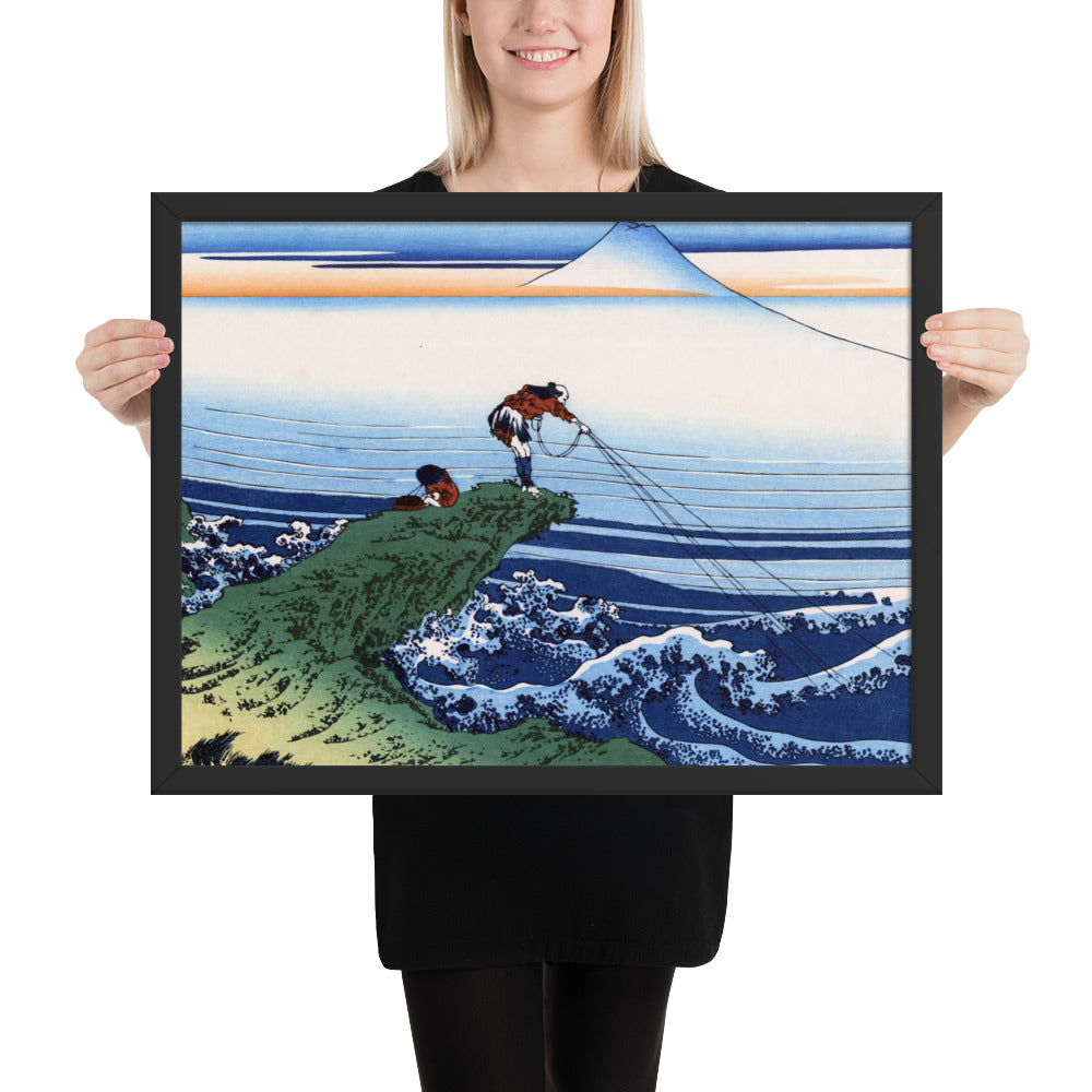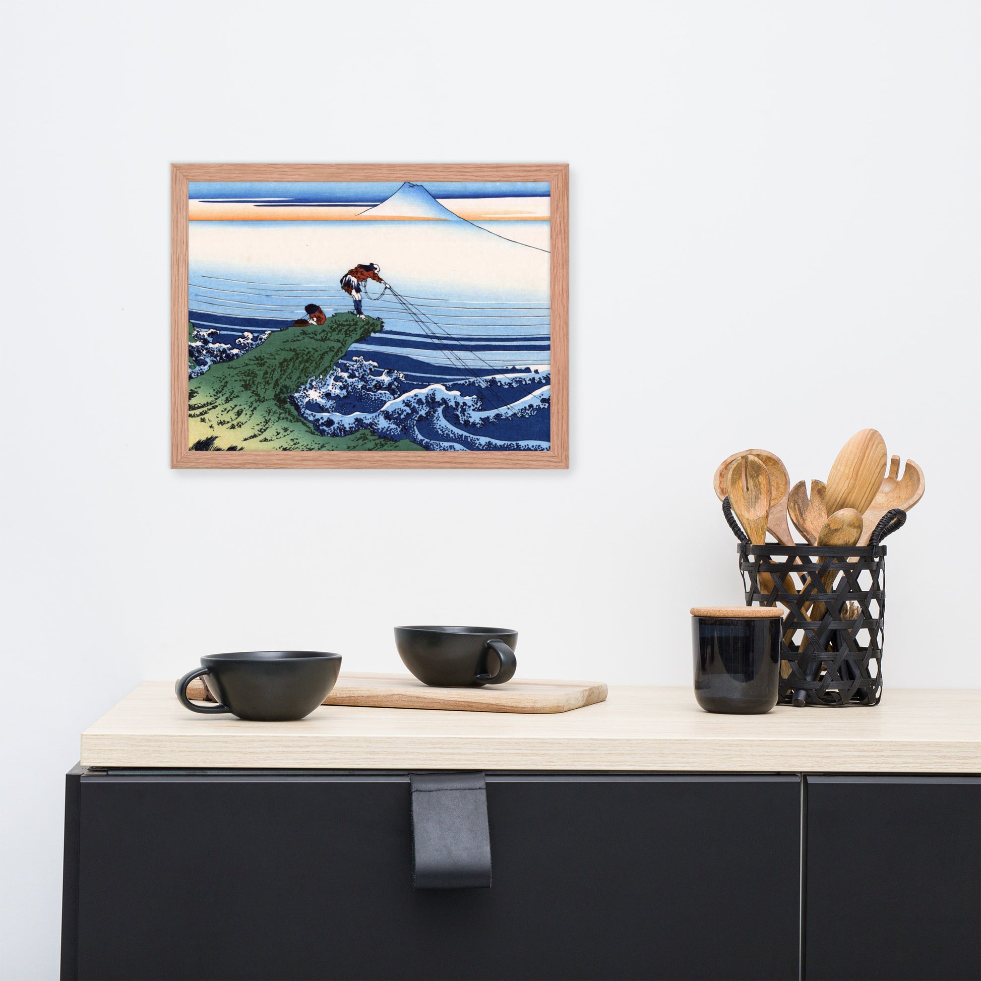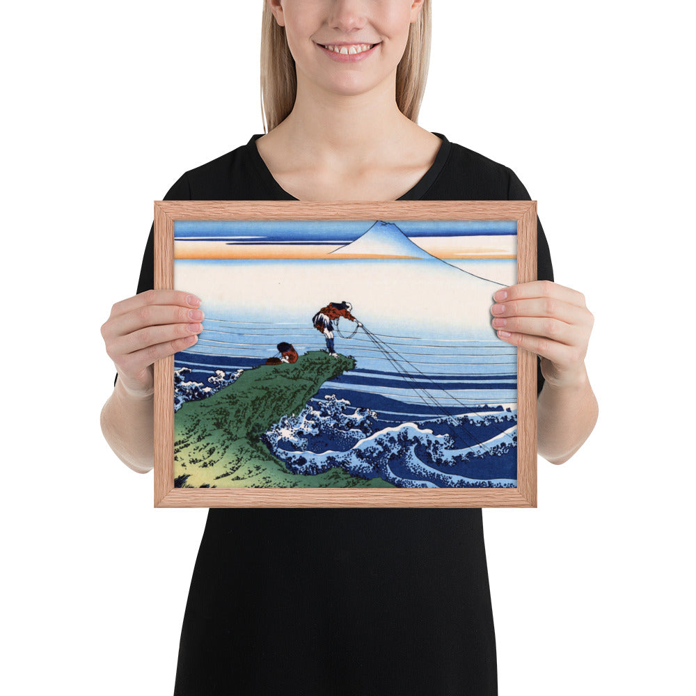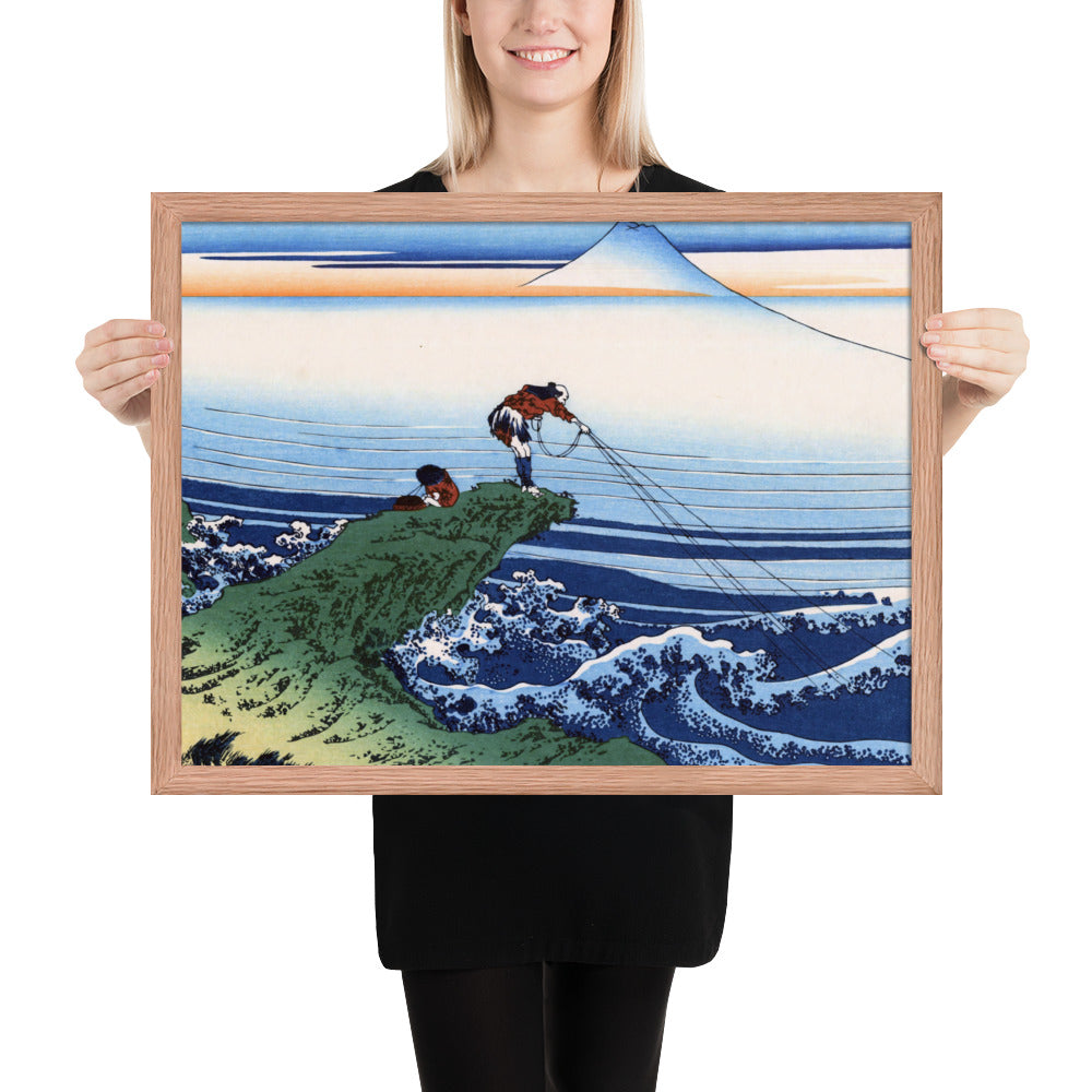 Immerse yourself in the quiet poetry of Kajikazawa in Kai Province by Katsushika Hokusai—a masterful Japanese Woodblock Print (Ukiyo-e) that captures the intimate relationship between humanity and nature. This framed wall print depicts a fisherman perched on rocky cliffs, casting his lines into stylized waves, while Mount Fuji rises serenely in the distance. The composition balances dynamic movement with meditative stillness, rendered in rich blues, soft gradients, and precise linework.