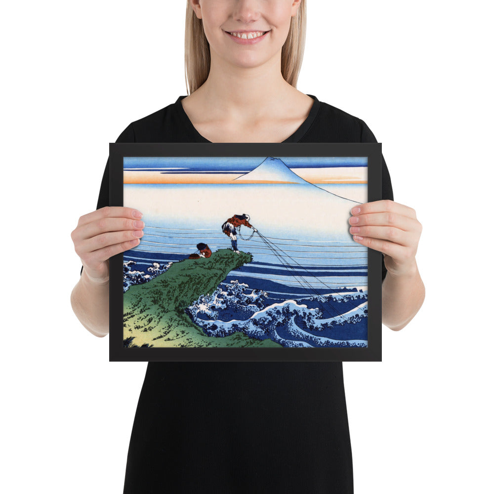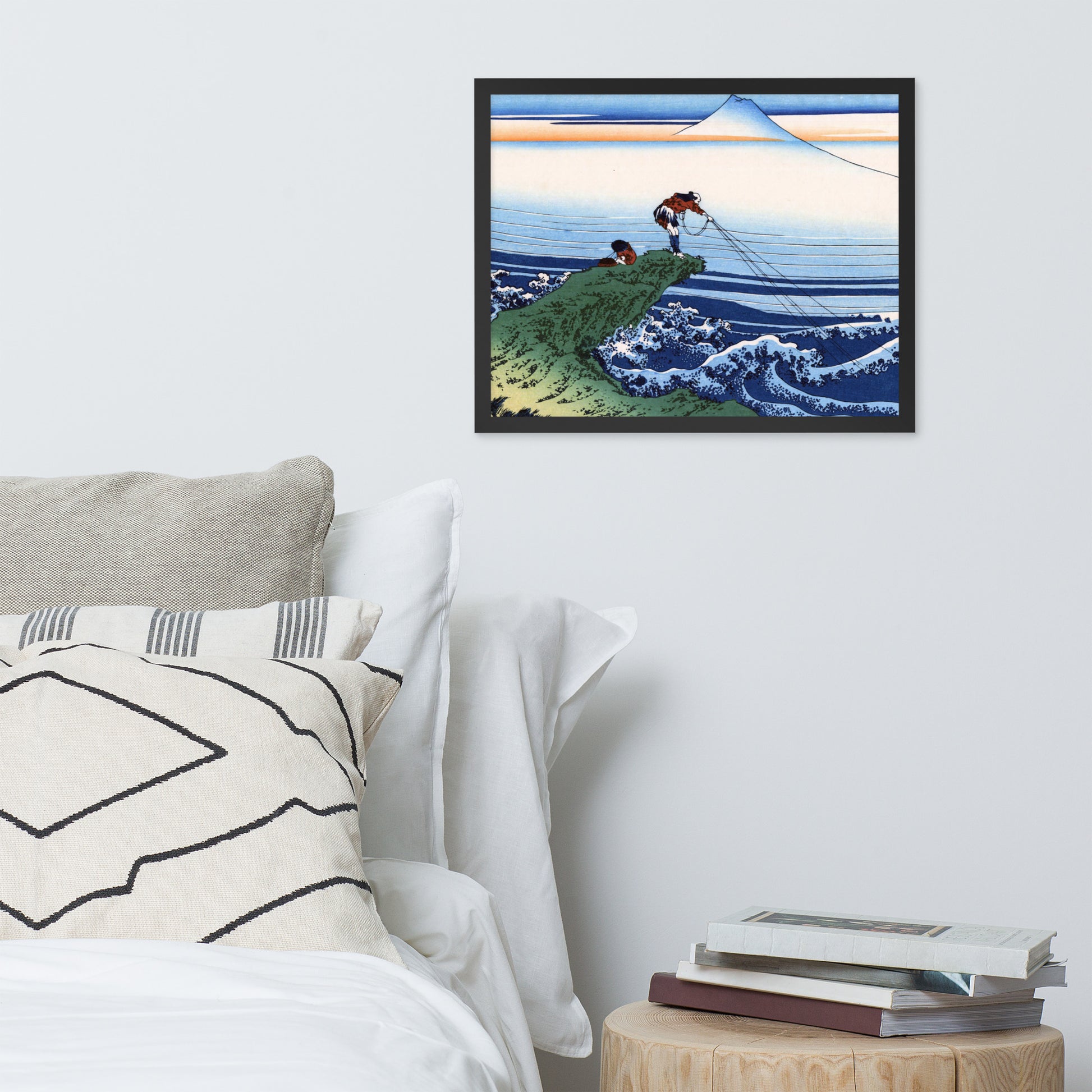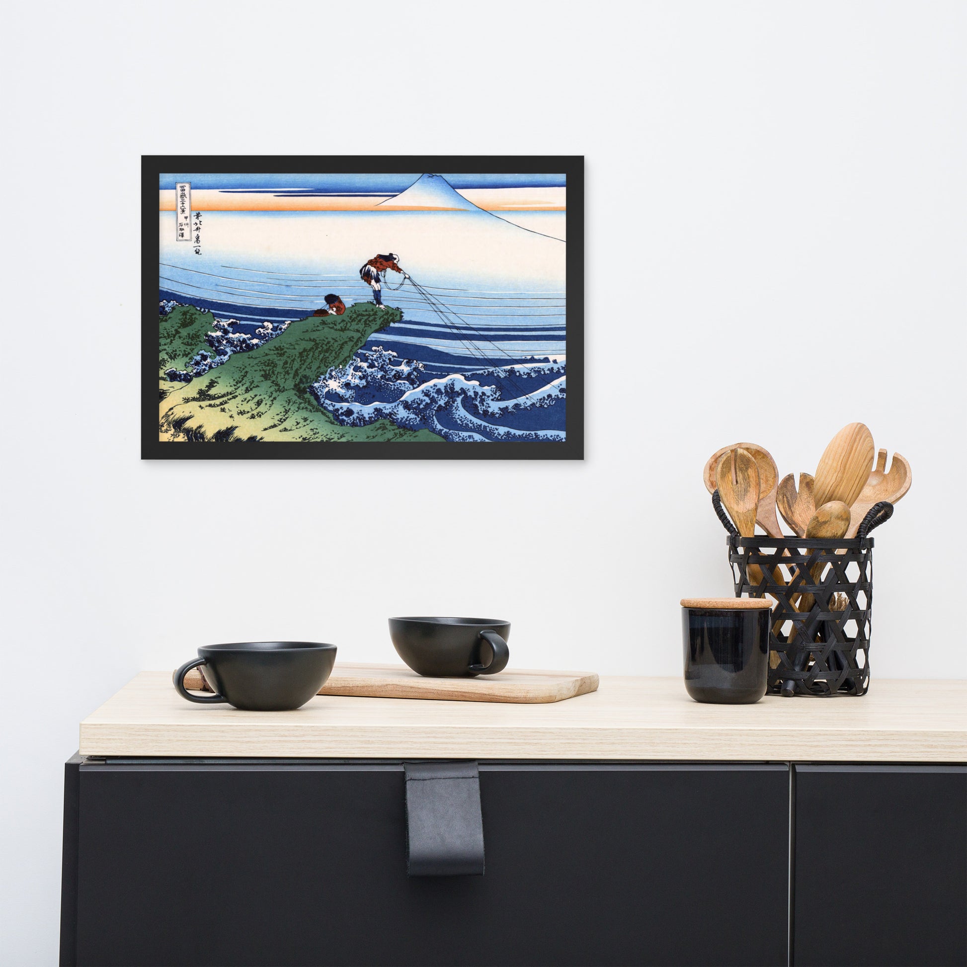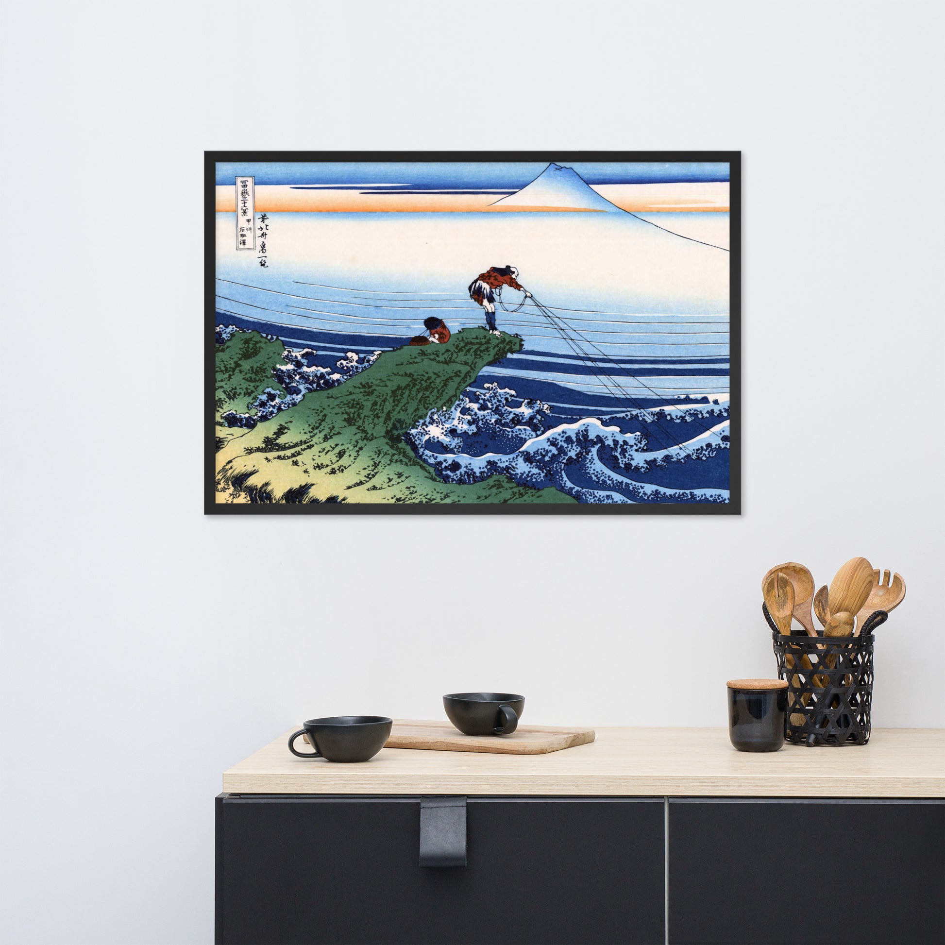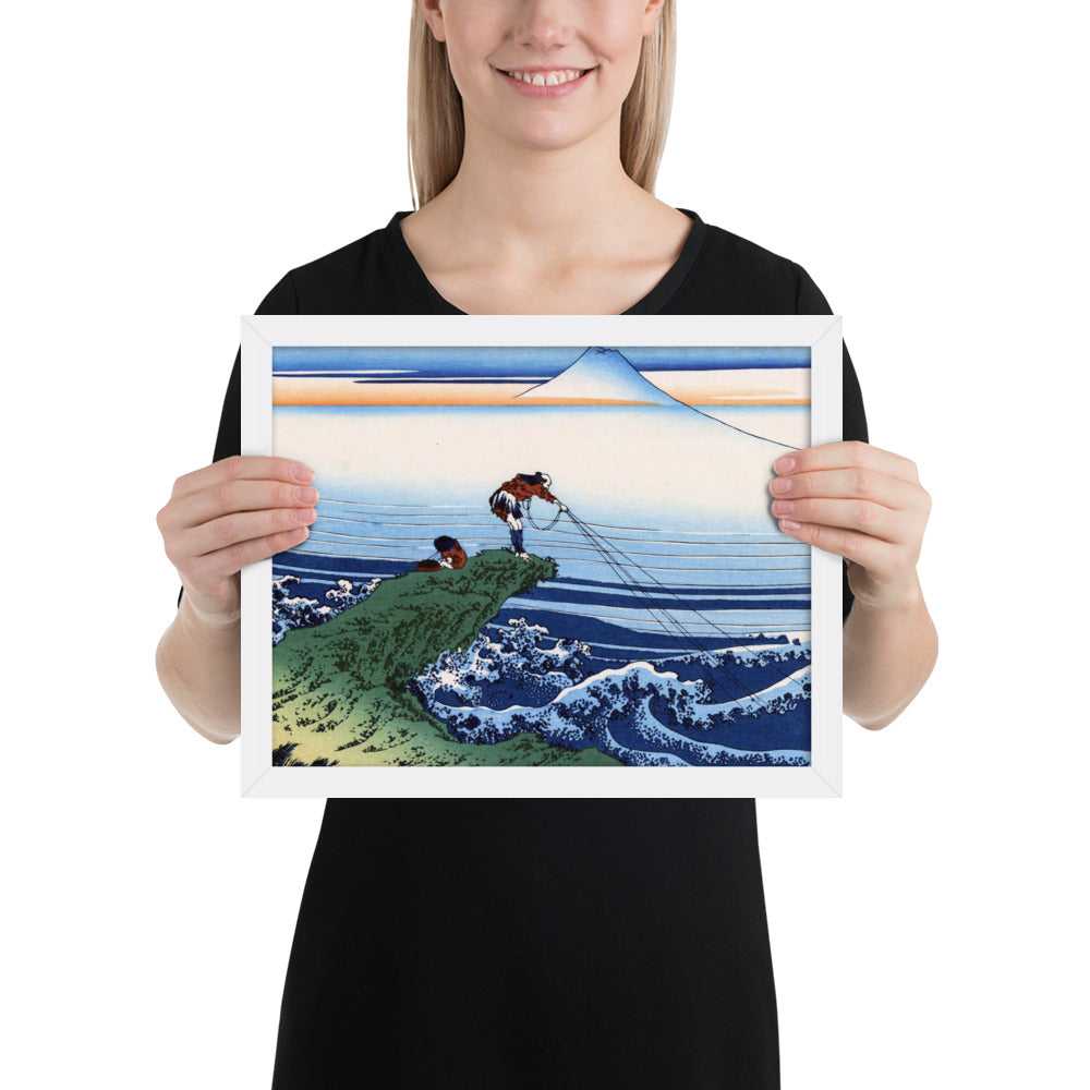 Immerse yourself in the quiet poetry of Kajikazawa in Kai Province by Katsushika Hokusai—a masterful Japanese Woodblock Print (Ukiyo-e) that captures the intimate relationship between humanity and nature. This framed wall print depicts a fisherman perched on rocky cliffs, casting his lines into stylized waves, while Mount Fuji rises serenely in the distance. The composition balances dynamic movement with meditative stillness, rendered in rich blues, soft gradients, and precise linework.