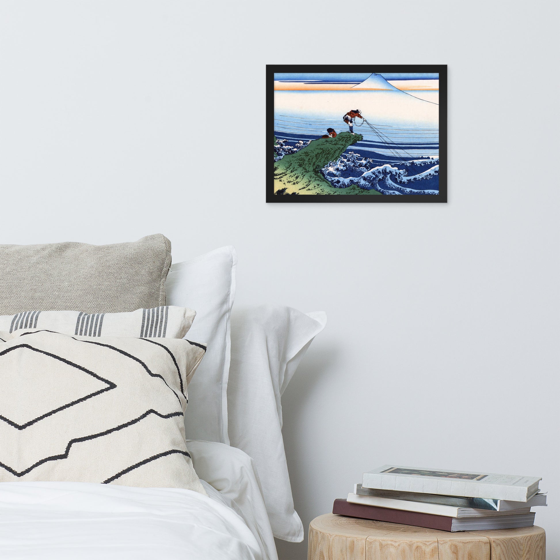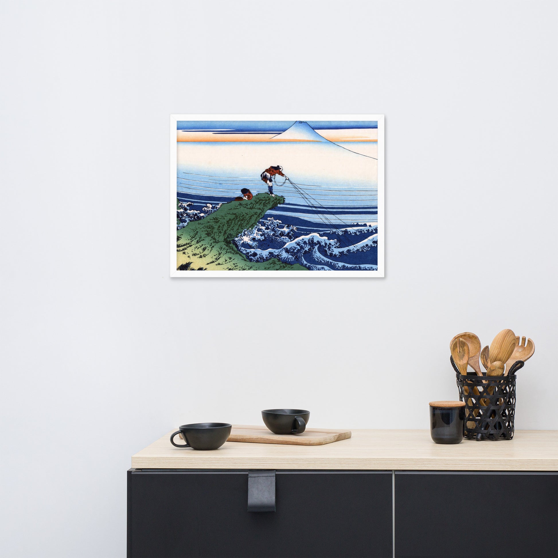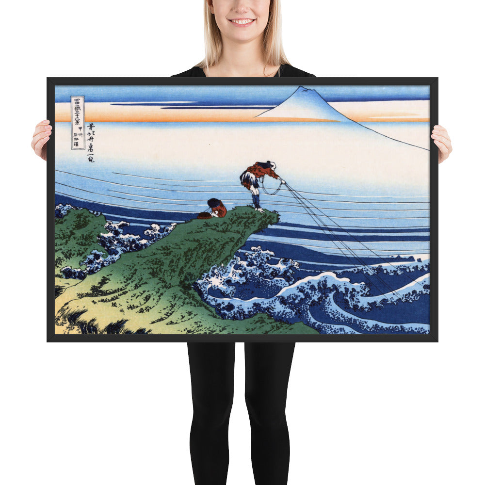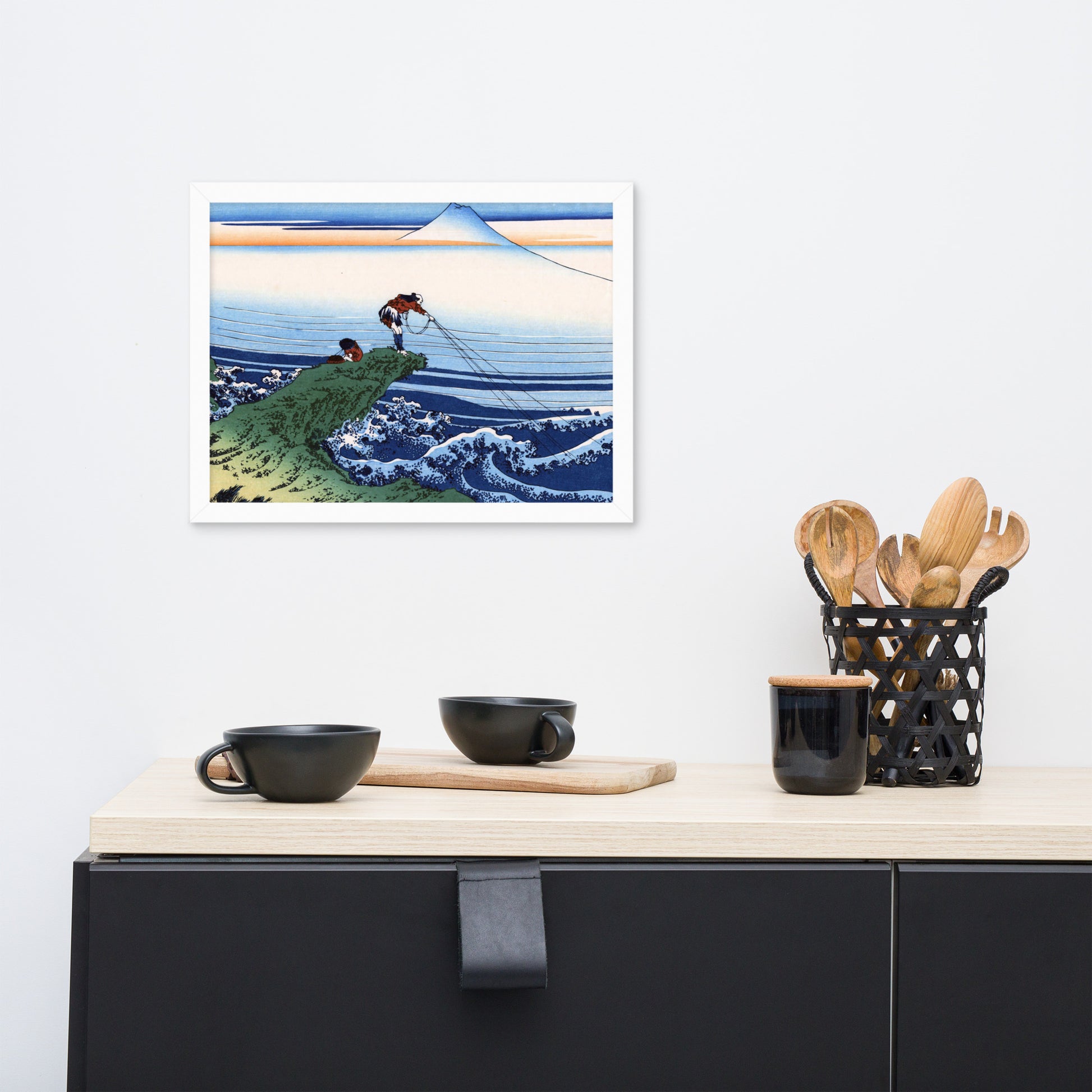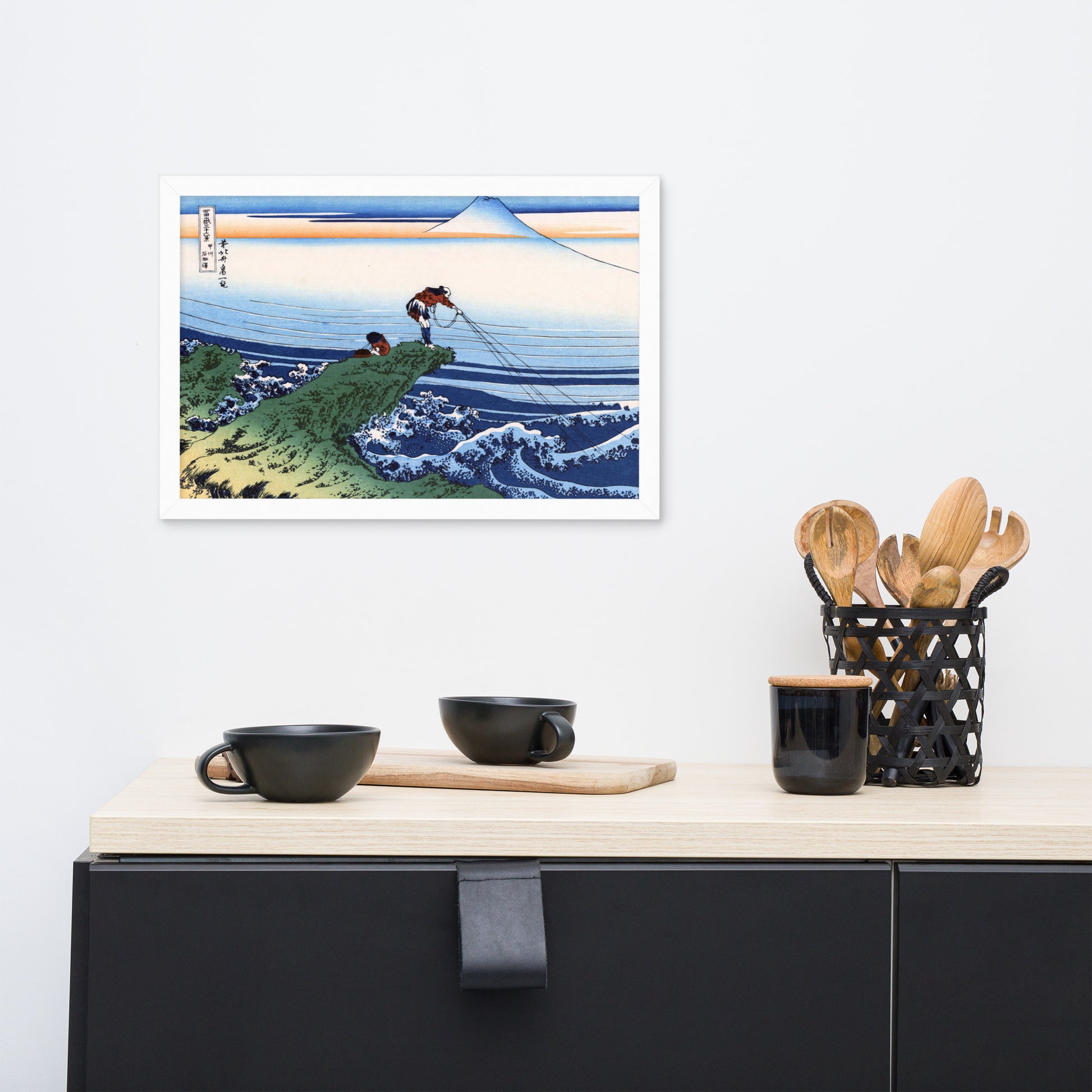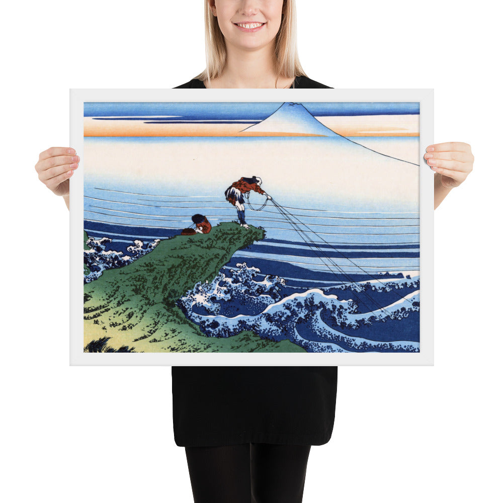 Immerse yourself in the quiet poetry of Kajikazawa in Kai Province by Katsushika Hokusai—a masterful Japanese Woodblock Print (Ukiyo-e) that captures the intimate relationship between humanity and nature. This framed wall print depicts a fisherman perched on rocky cliffs, casting his lines into stylized waves, while Mount Fuji rises serenely in the distance. The composition balances dynamic movement with meditative stillness, rendered in rich blues, soft gradients, and precise linework.