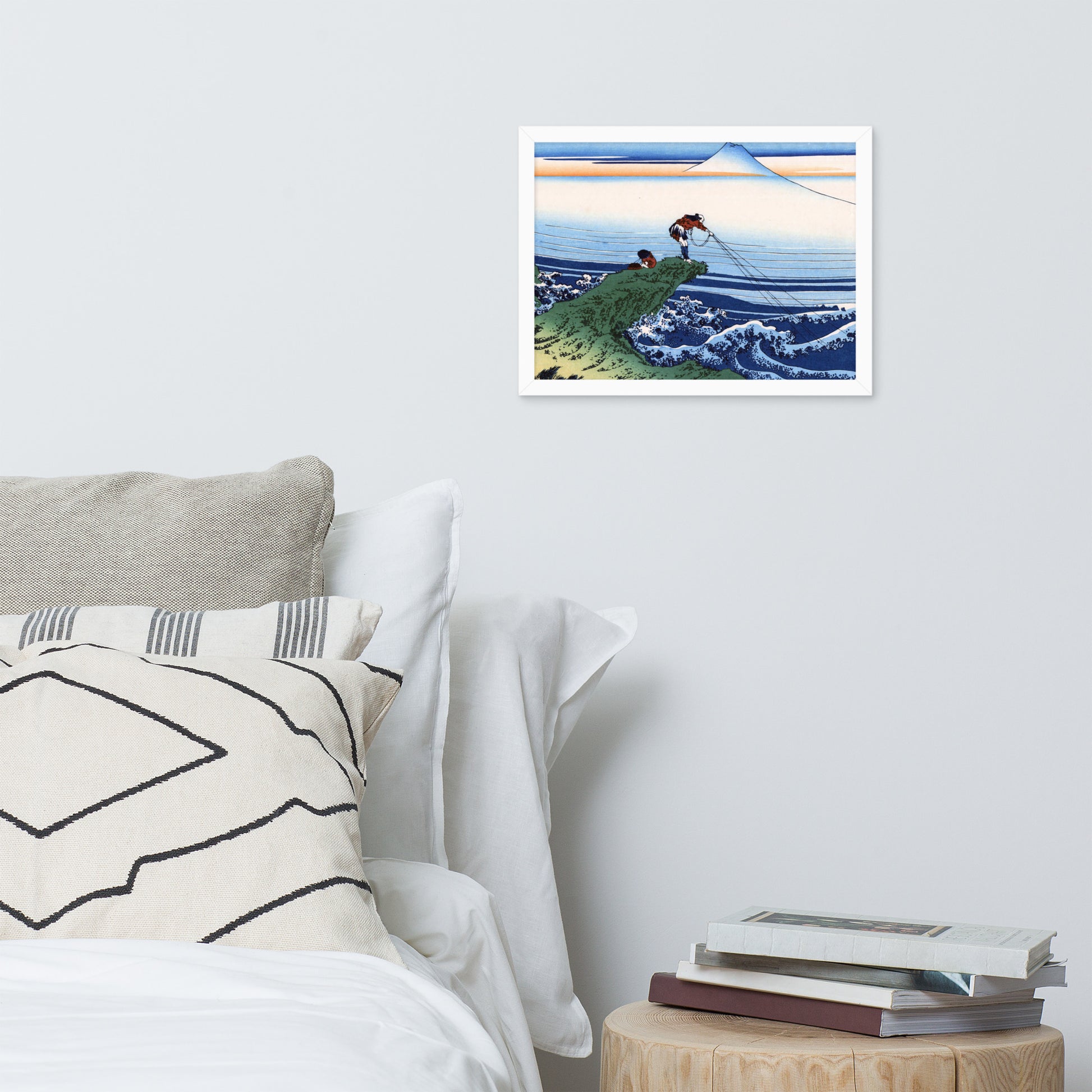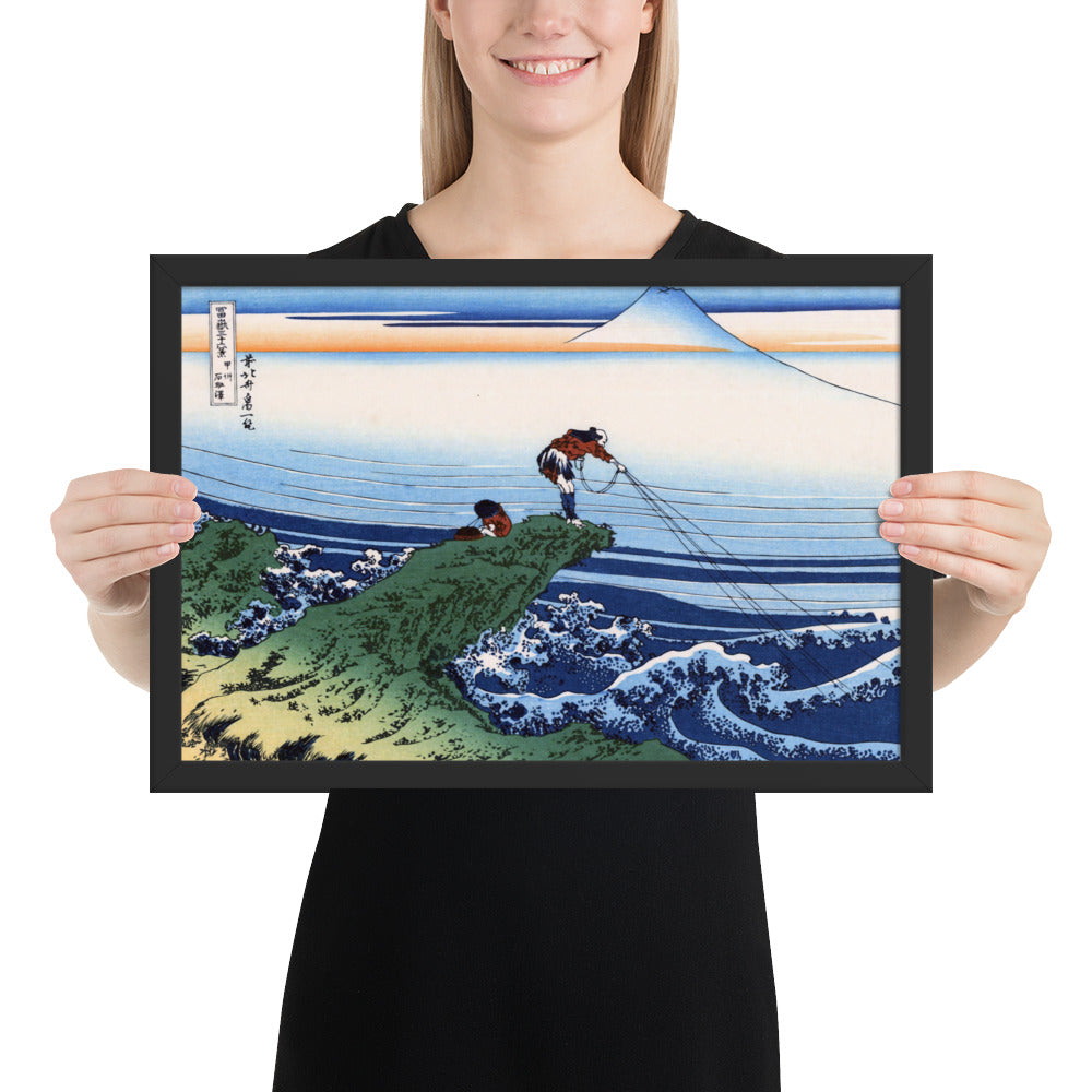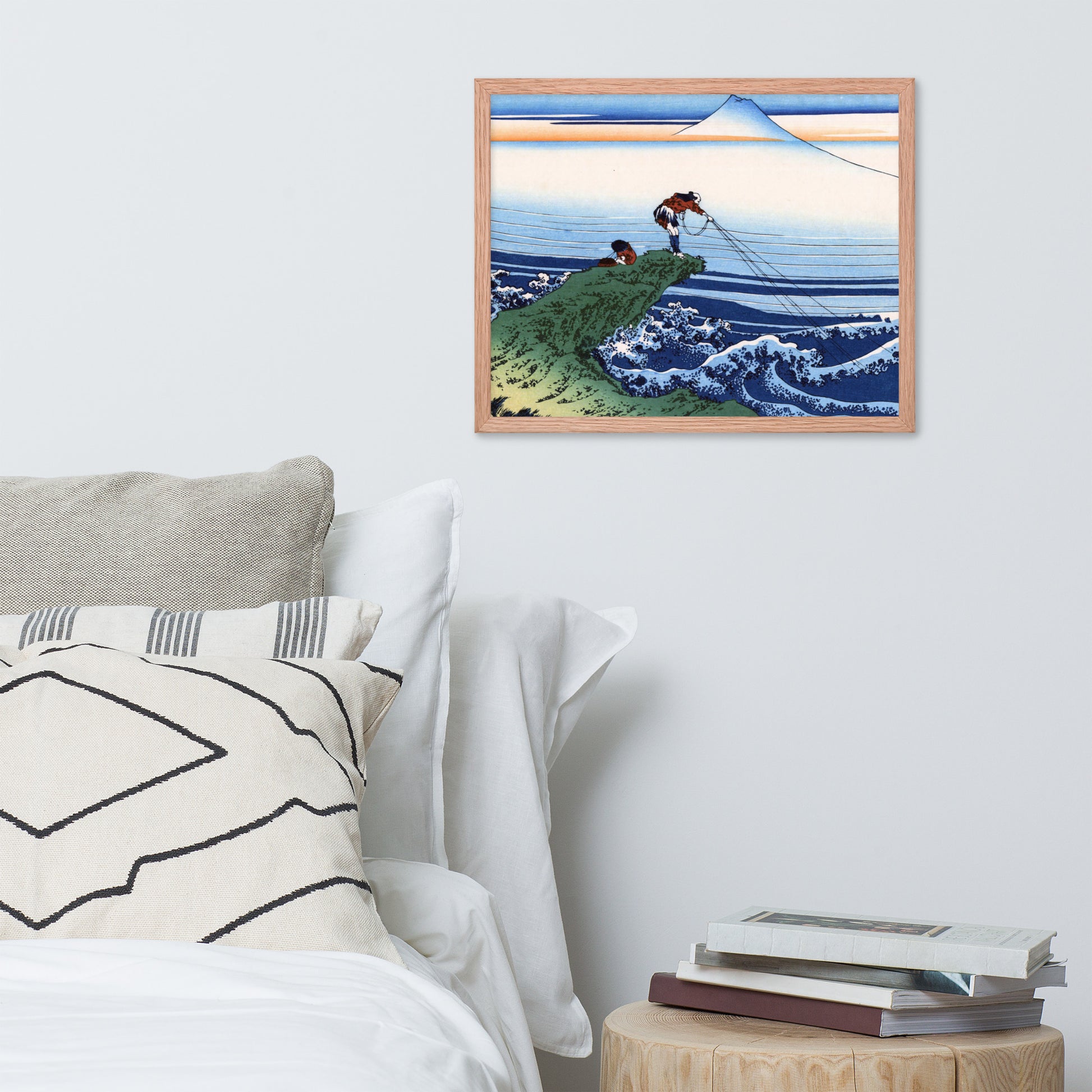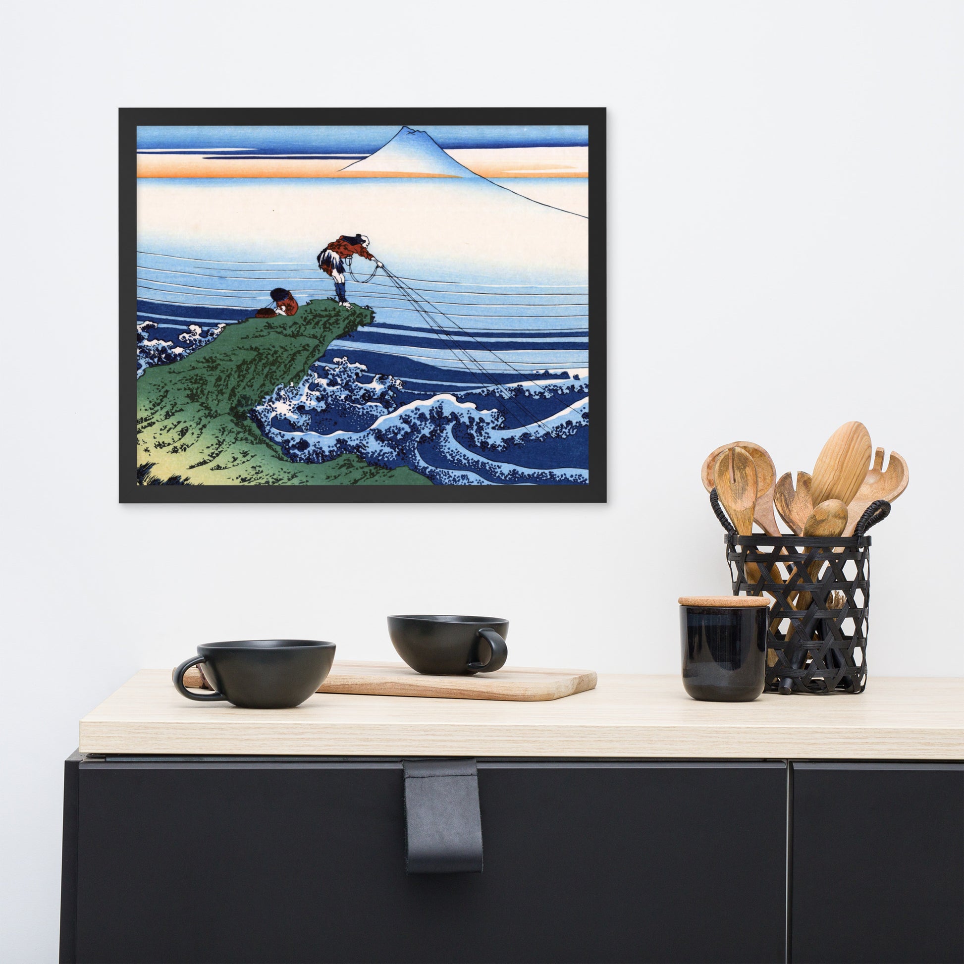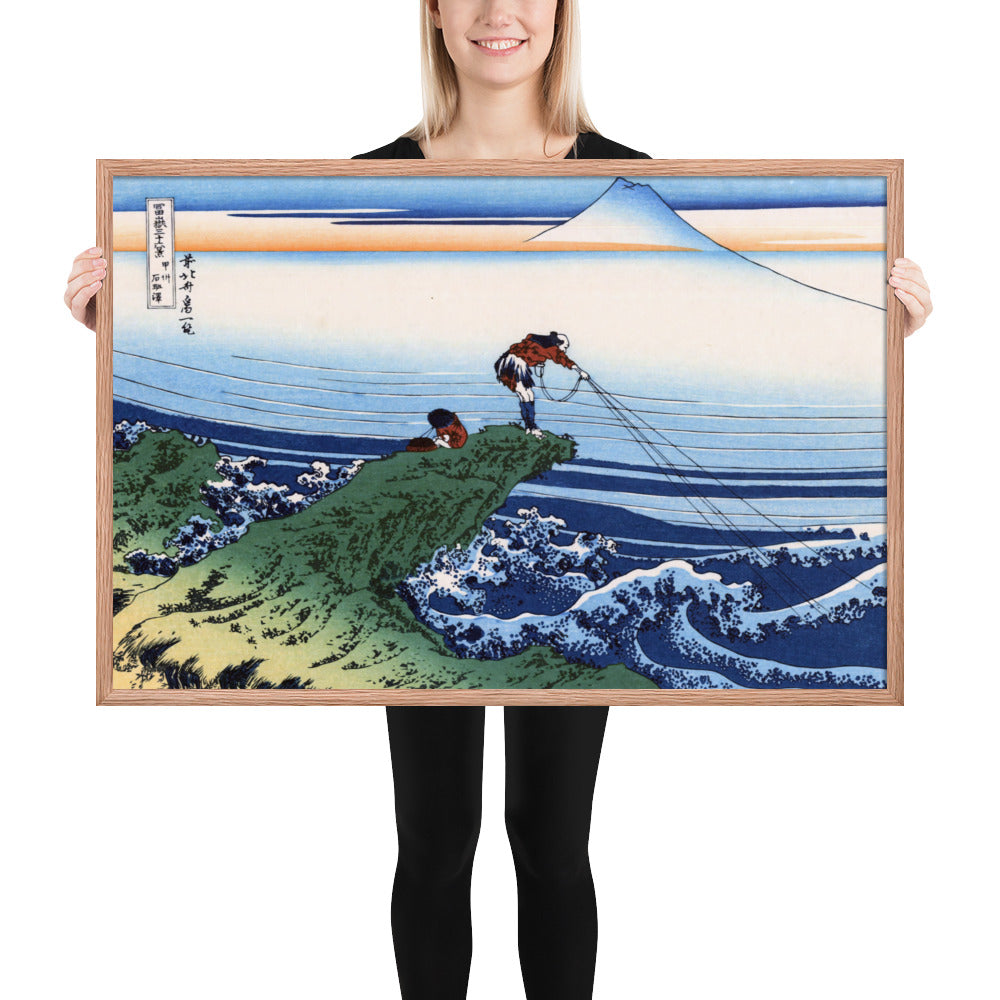 Immerse yourself in the quiet poetry of Kajikazawa in Kai Province by Katsushika Hokusai—a masterful Japanese Woodblock Print (Ukiyo-e) that captures the intimate relationship between humanity and nature. This framed wall print depicts a fisherman perched on rocky cliffs, casting his lines into stylized waves, while Mount Fuji rises serenely in the distance. The composition balances dynamic movement with meditative stillness, rendered in rich blues, soft gradients, and precise linework.
