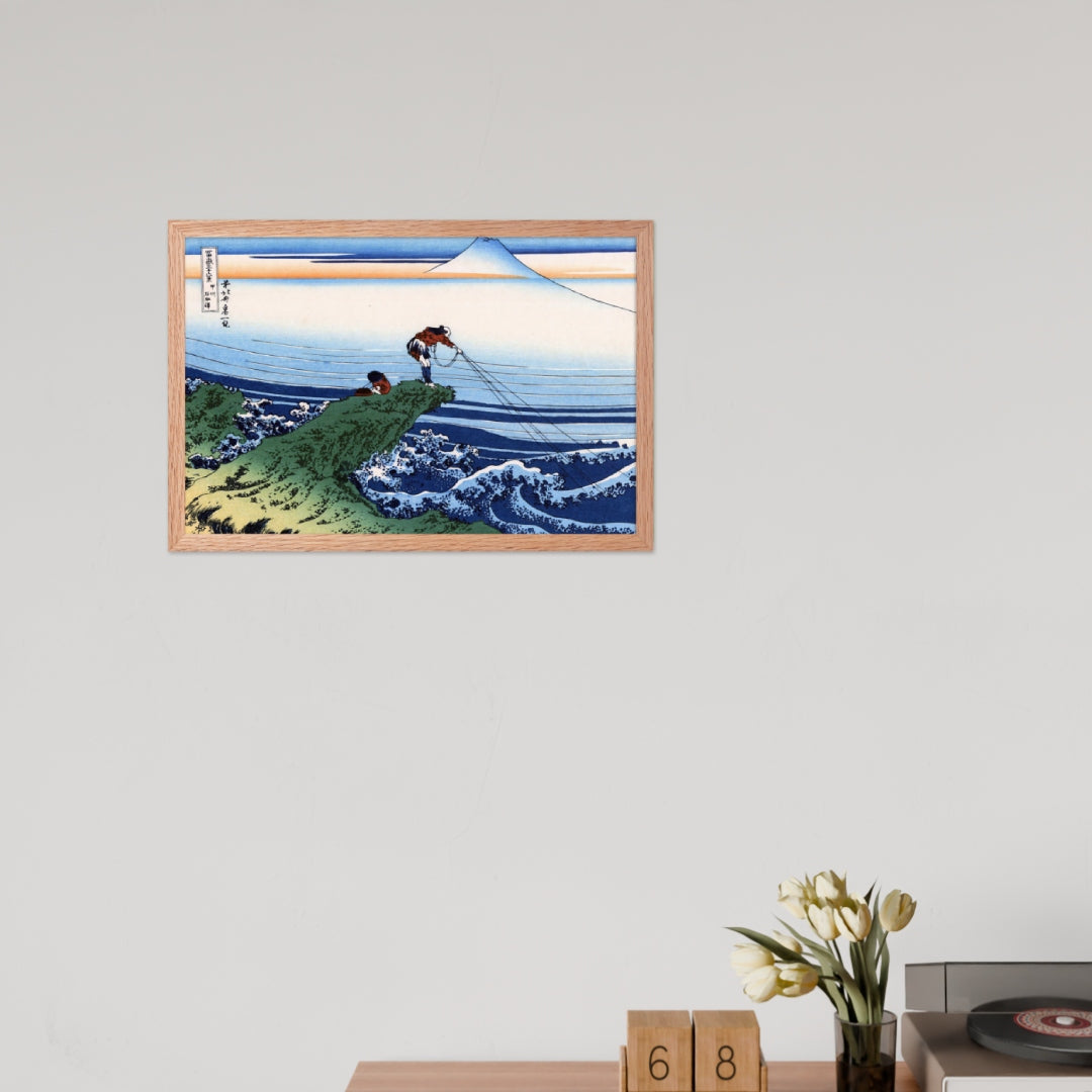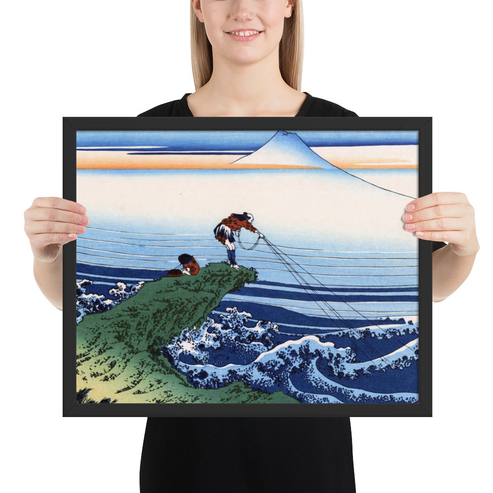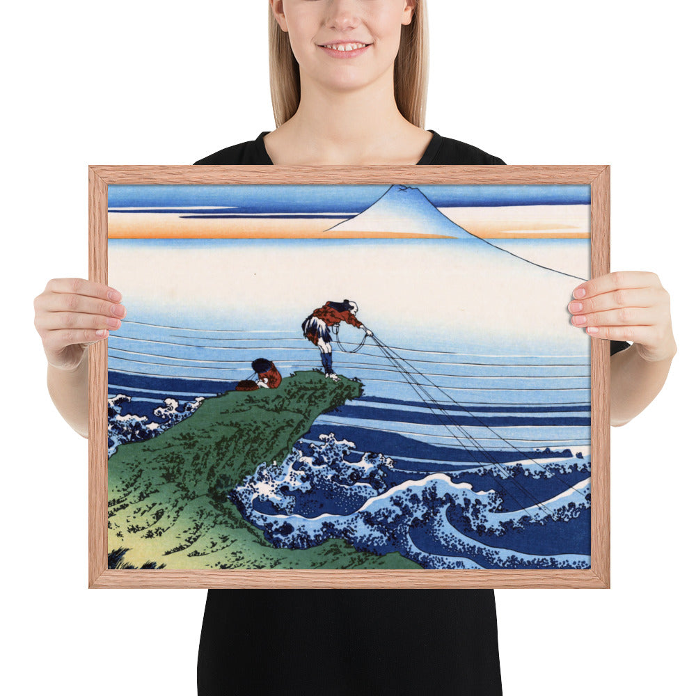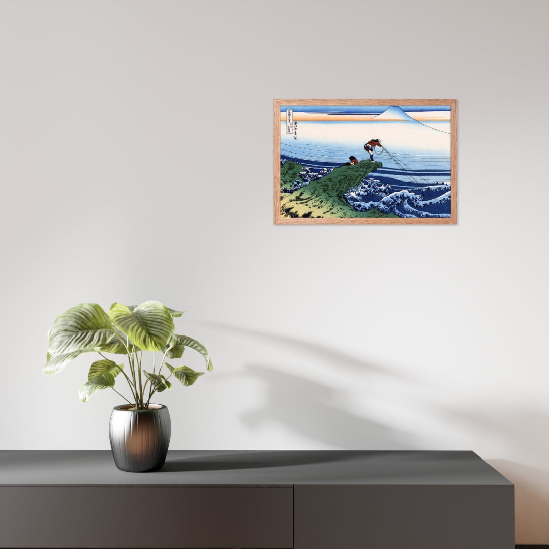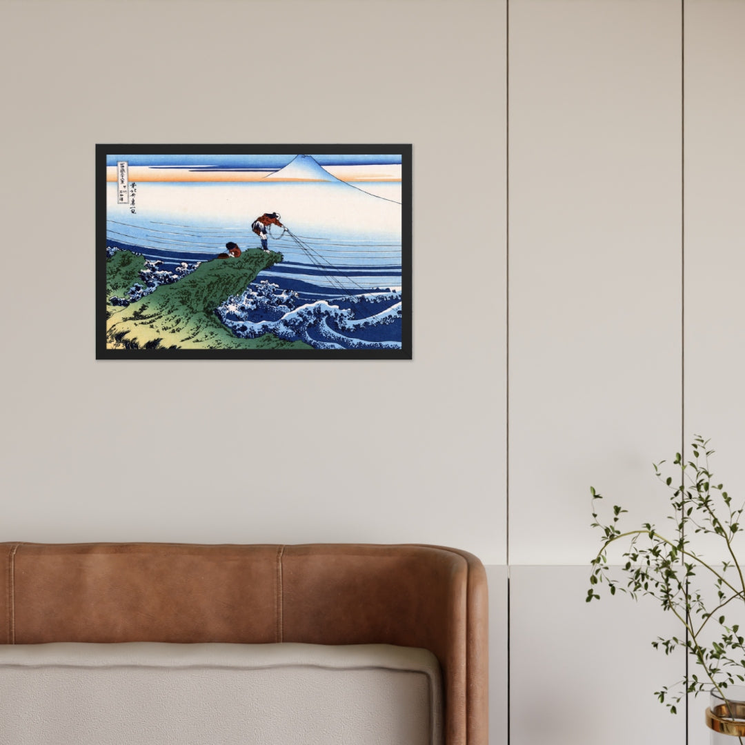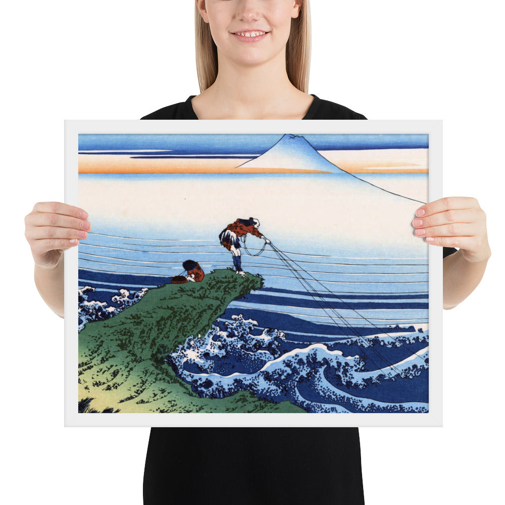 Immerse yourself in the quiet poetry of Kajikazawa in Kai Province by Katsushika Hokusai—a masterful Japanese Woodblock Print (Ukiyo-e) that captures the intimate relationship between humanity and nature. This framed wall print depicts a fisherman perched on rocky cliffs, casting his lines into stylized waves, while Mount Fuji rises serenely in the distance. The composition balances dynamic movement with meditative stillness, rendered in rich blues, soft gradients, and precise linework.