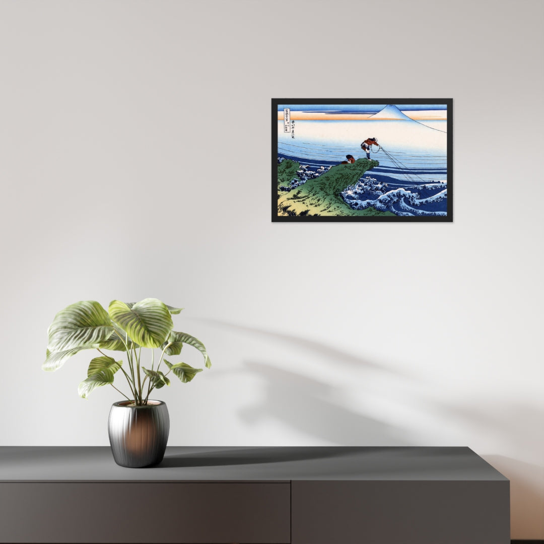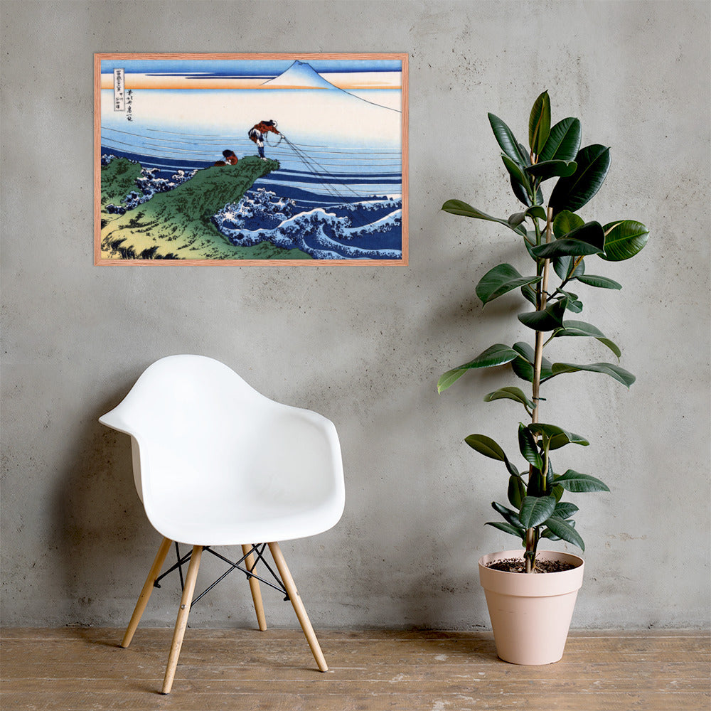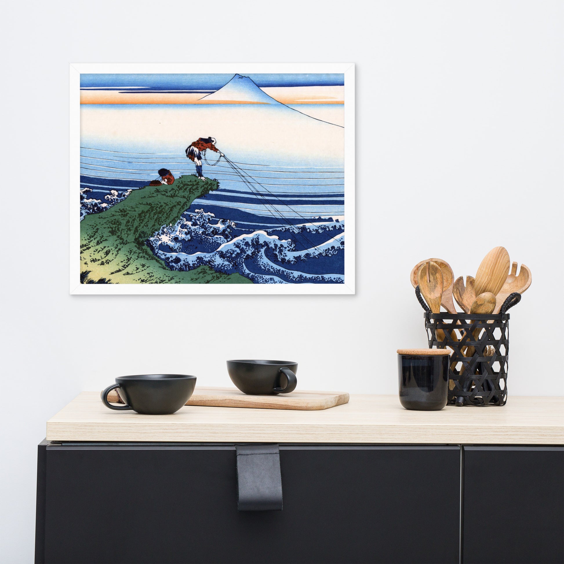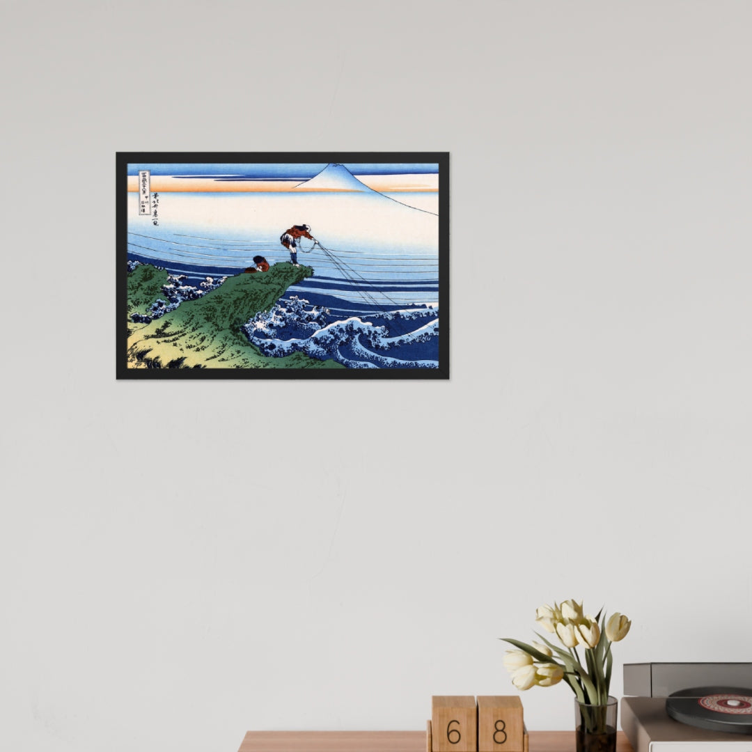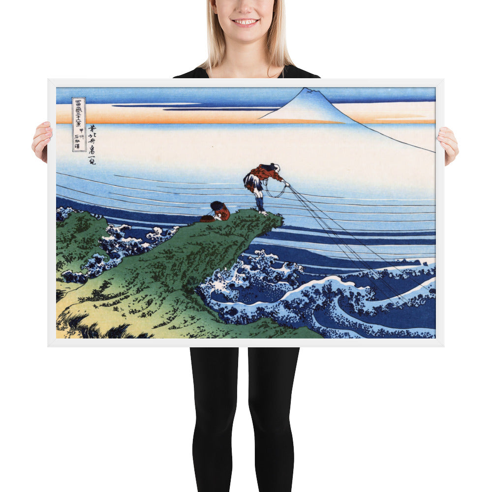 Immerse yourself in the quiet poetry of Kajikazawa in Kai Province by Katsushika Hokusai—a masterful Japanese Woodblock Print (Ukiyo-e) that captures the intimate relationship between humanity and nature. This framed wall print depicts a fisherman perched on rocky cliffs, casting his lines into stylized waves, while Mount Fuji rises serenely in the distance. The composition balances dynamic movement with meditative stillness, rendered in rich blues, soft gradients, and precise linework.