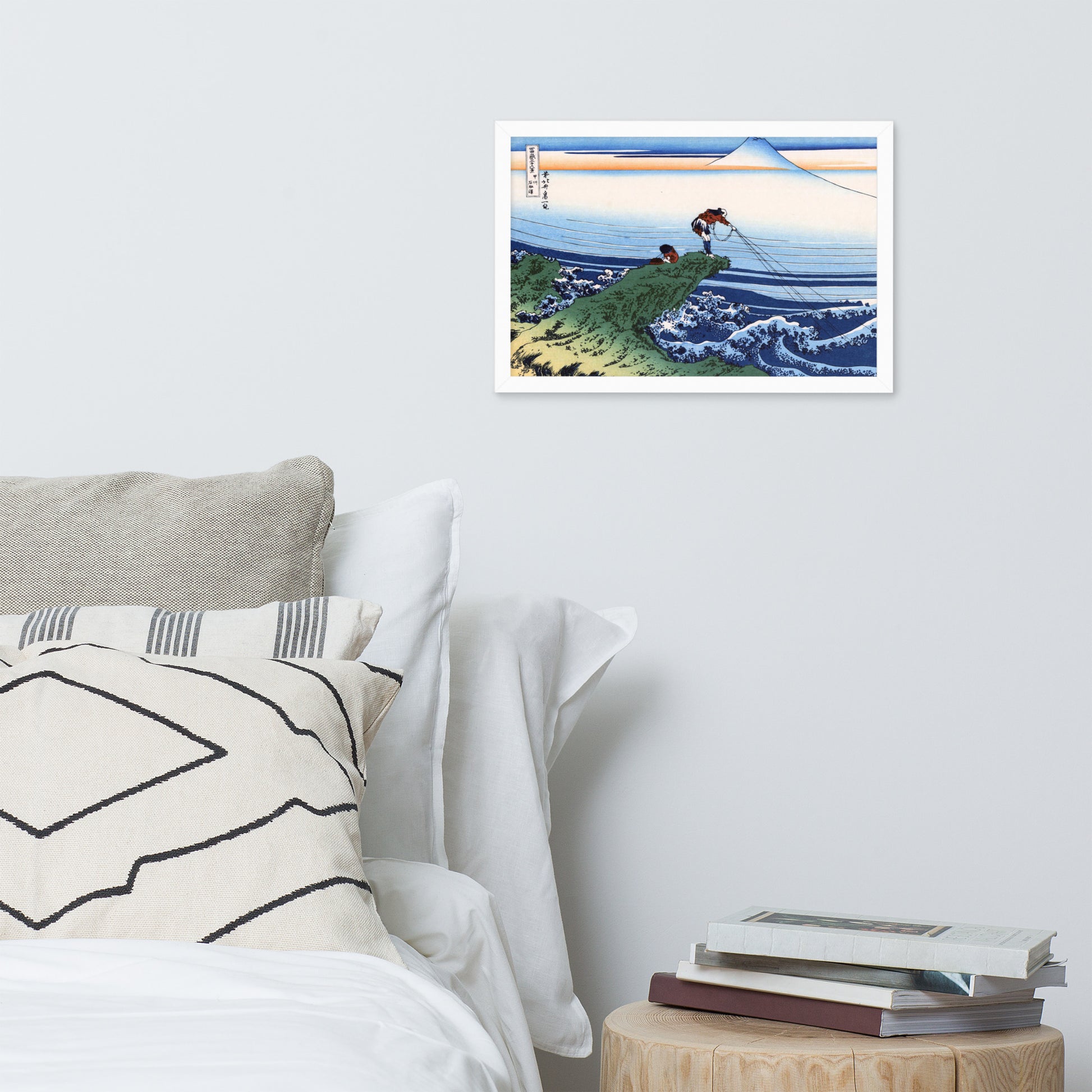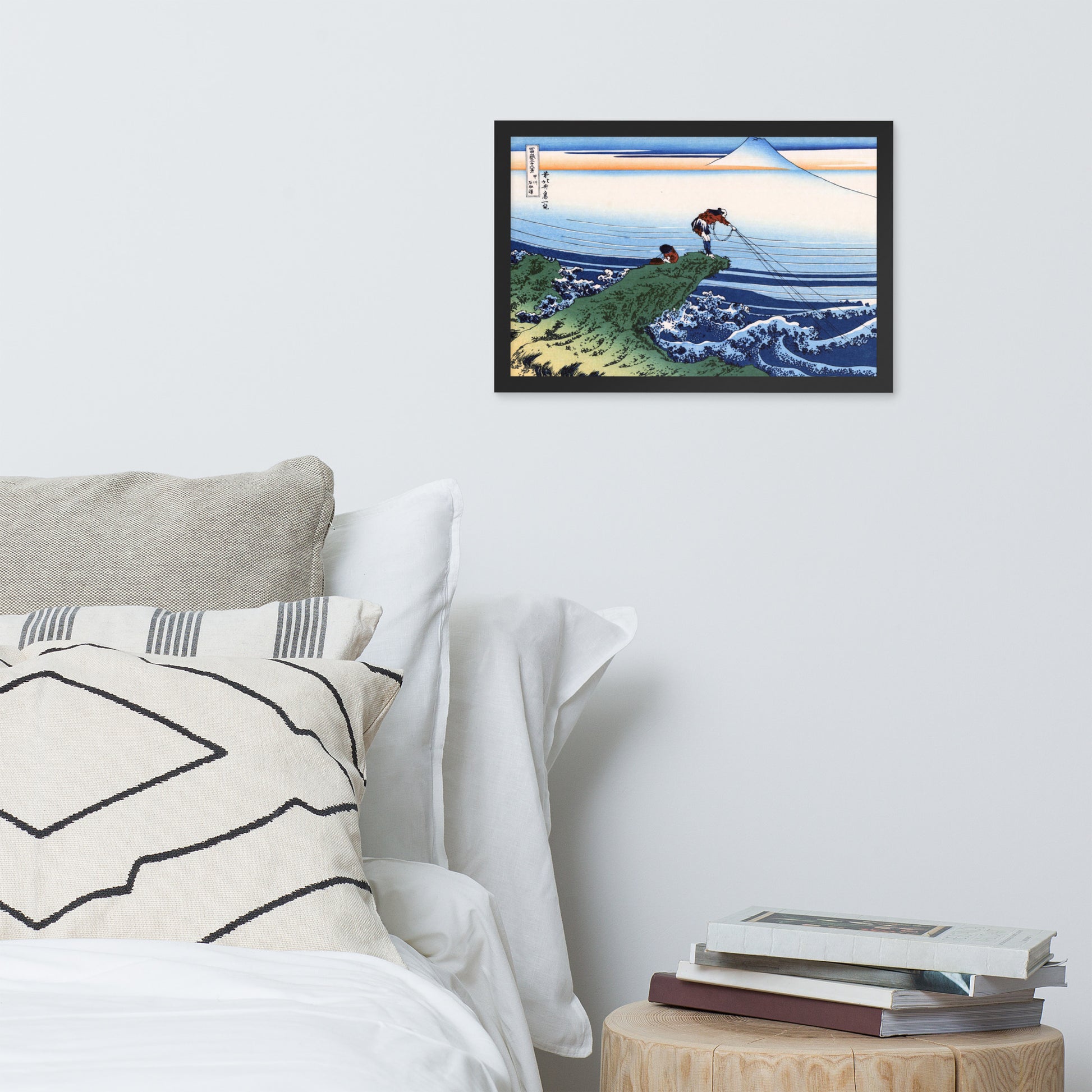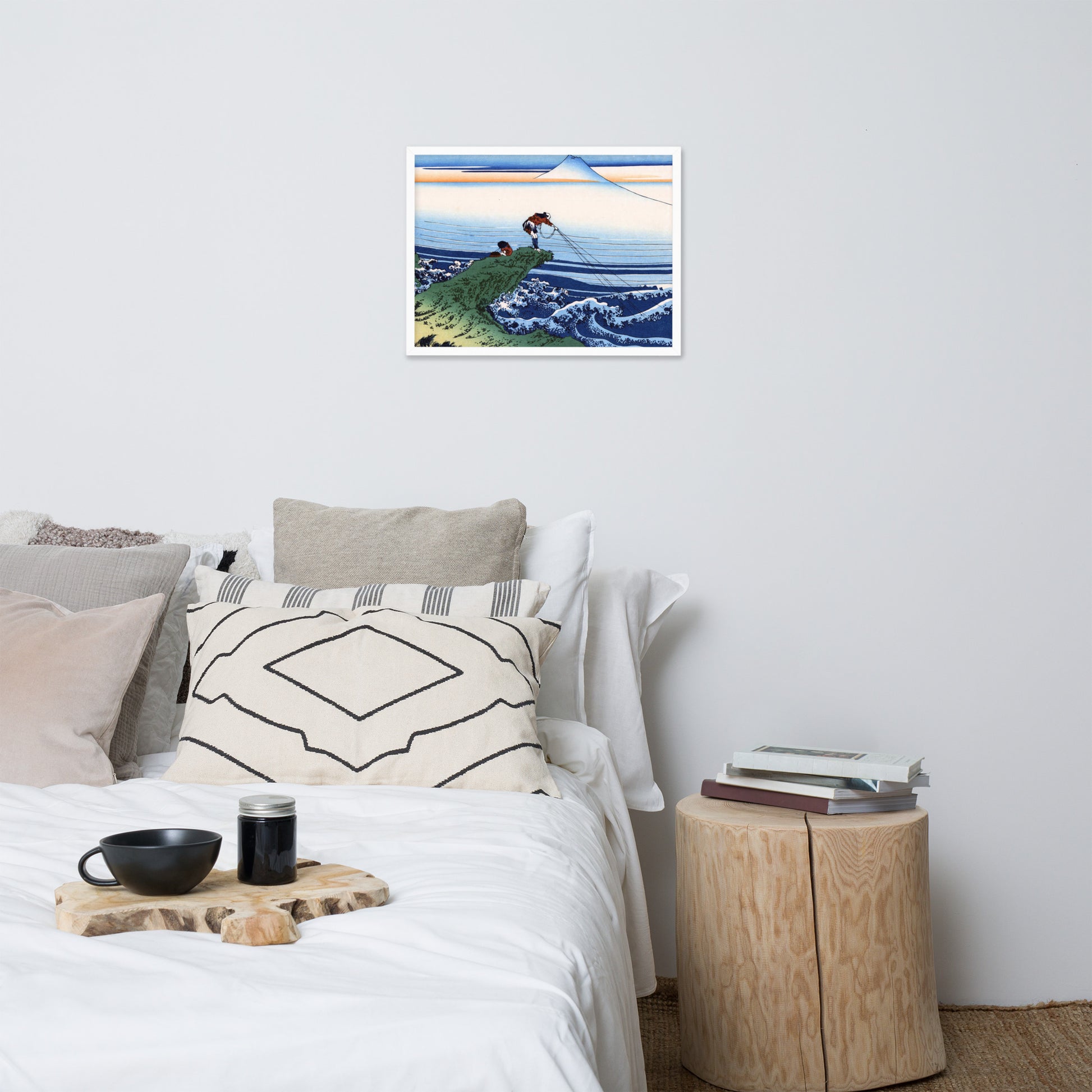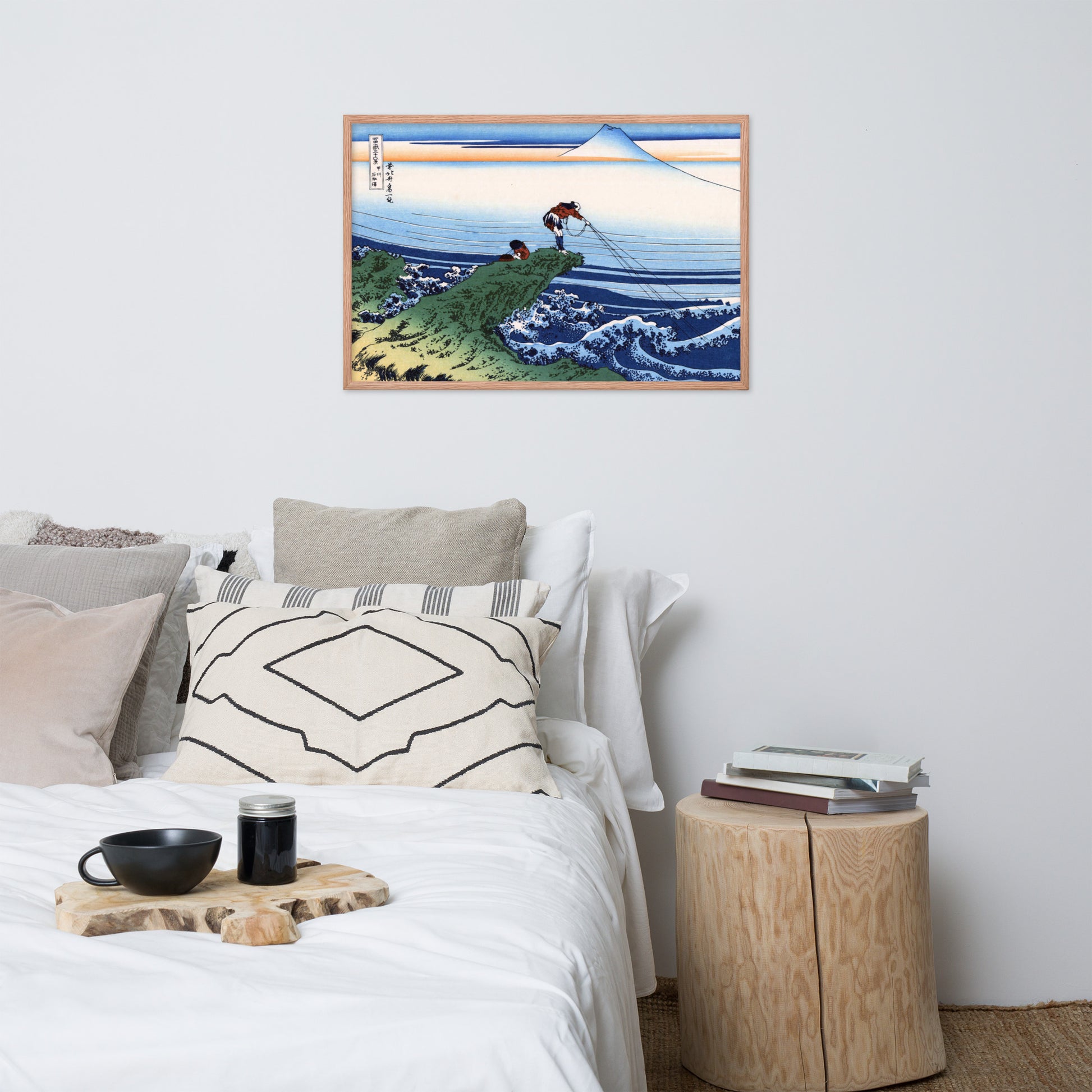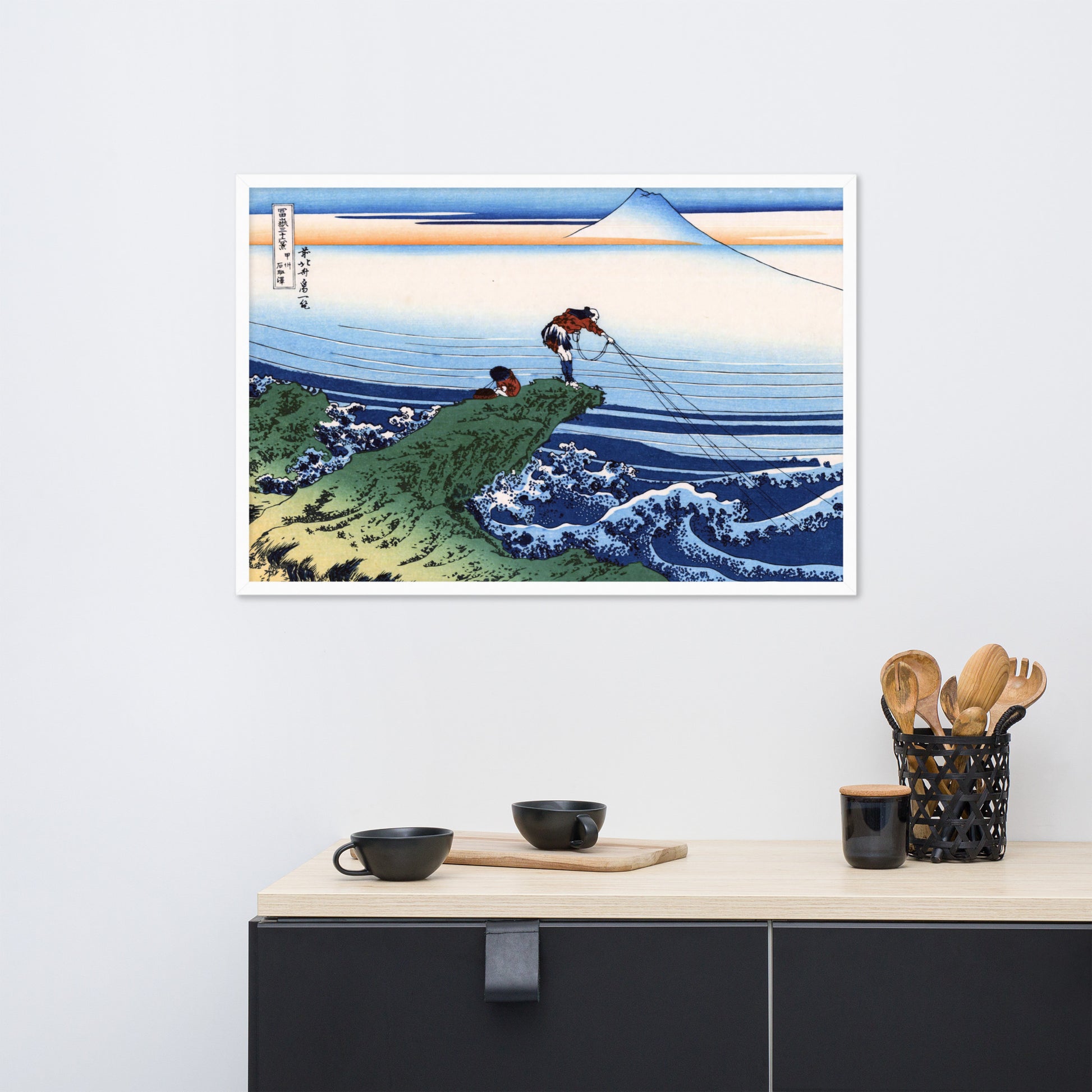 Immerse yourself in the quiet poetry of Kajikazawa in Kai Province by Katsushika Hokusai—a masterful Japanese Woodblock Print (Ukiyo-e) that captures the intimate relationship between humanity and nature. This framed wall print depicts a fisherman perched on rocky cliffs, casting his lines into stylized waves, while Mount Fuji rises serenely in the distance. The composition balances dynamic movement with meditative stillness, rendered in rich blues, soft gradients, and precise linework.