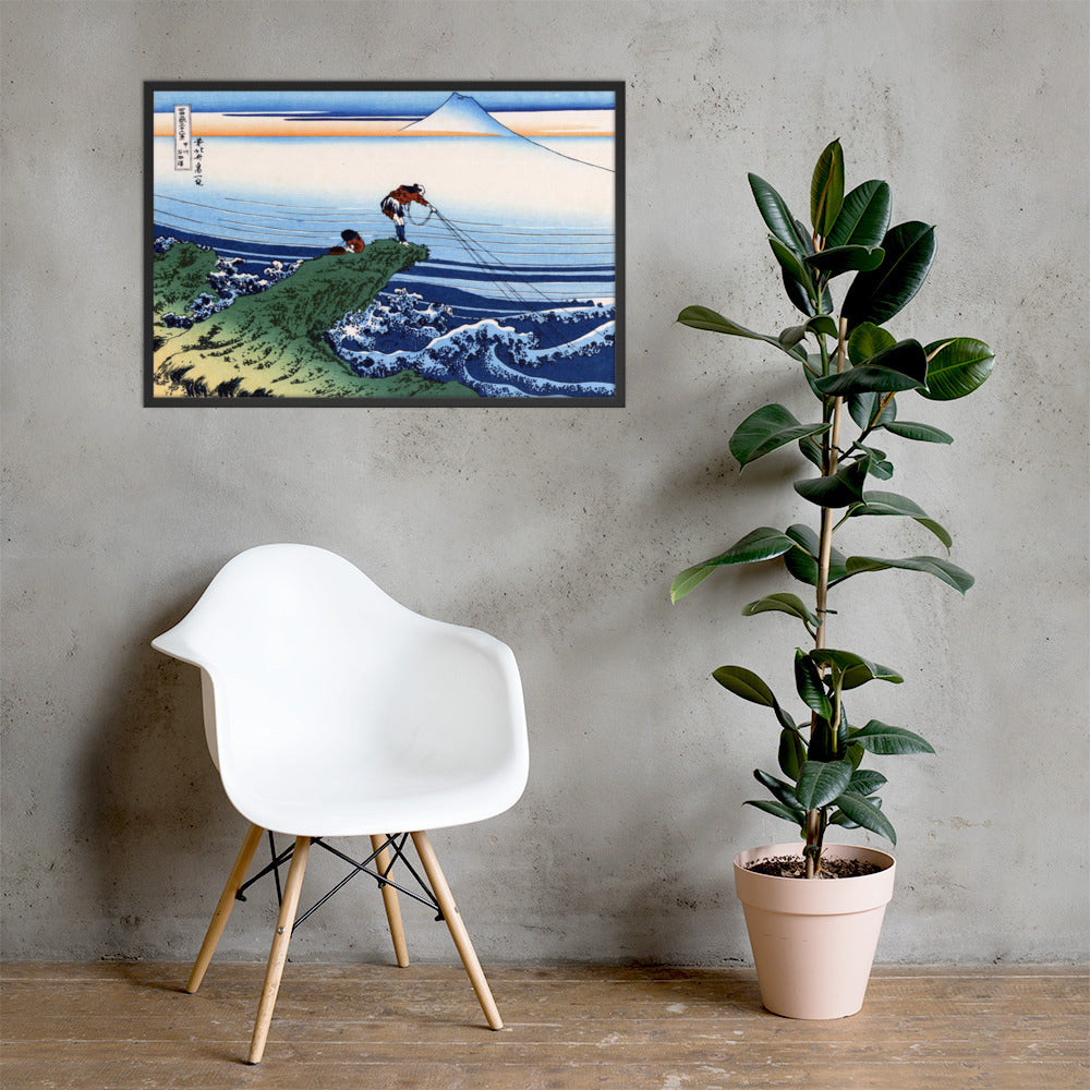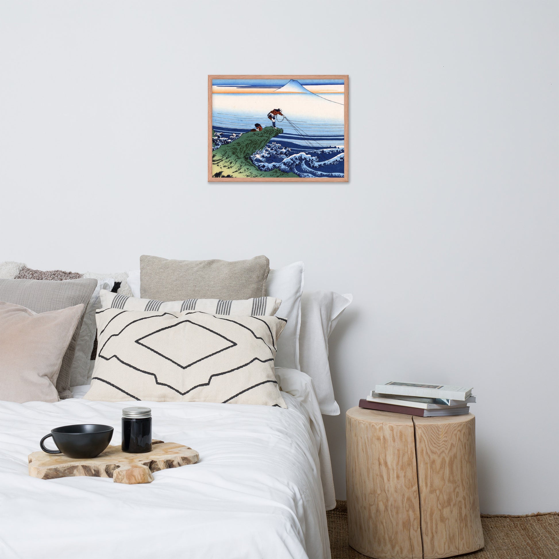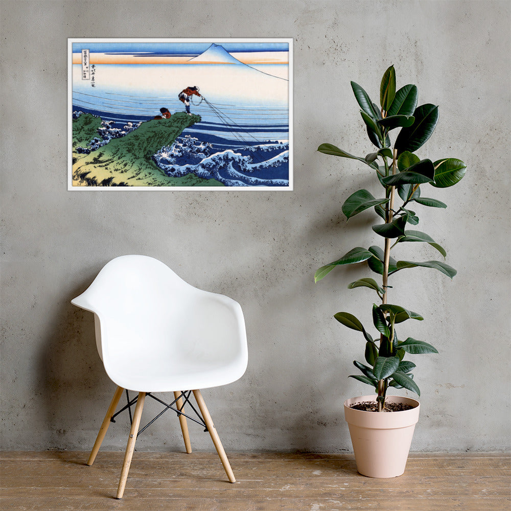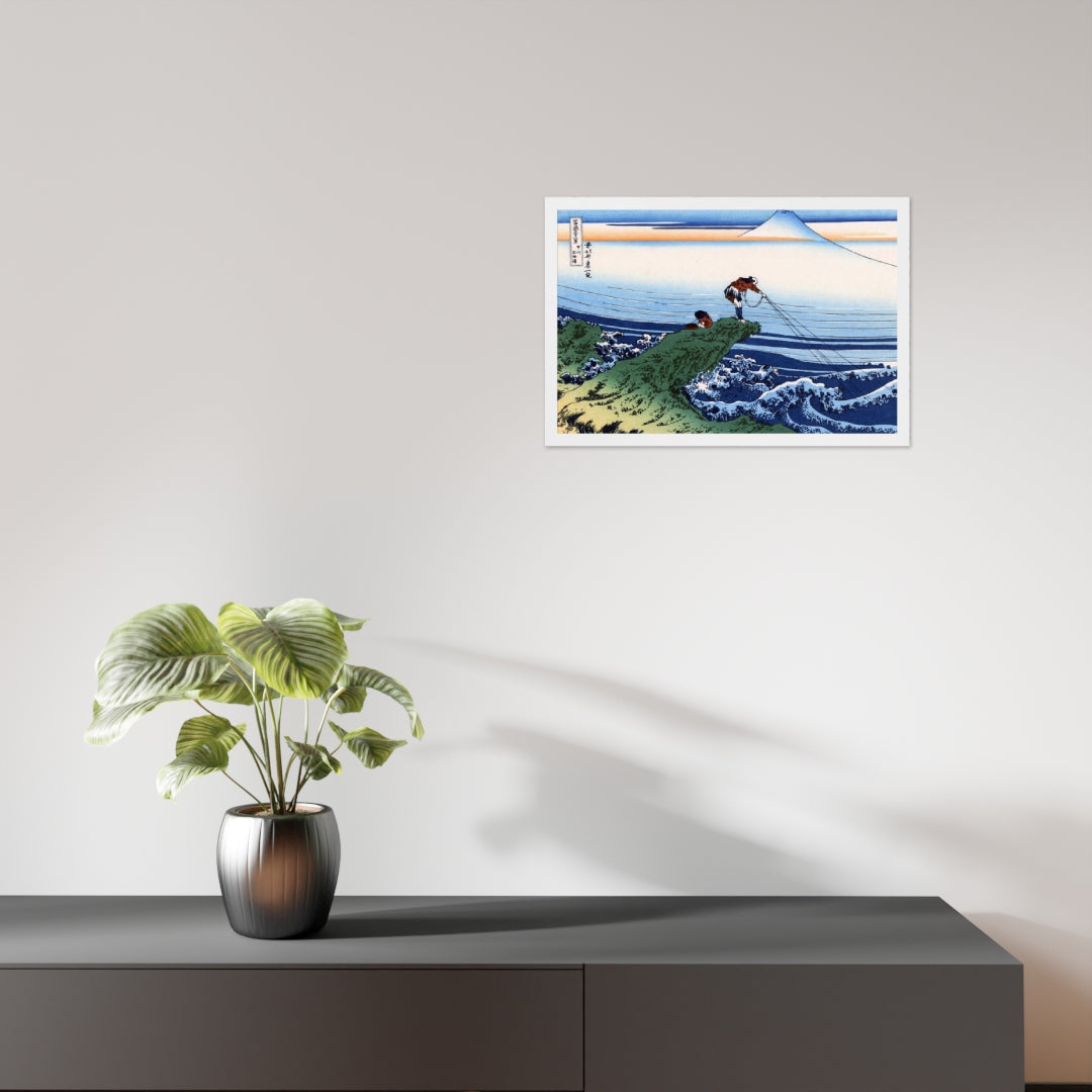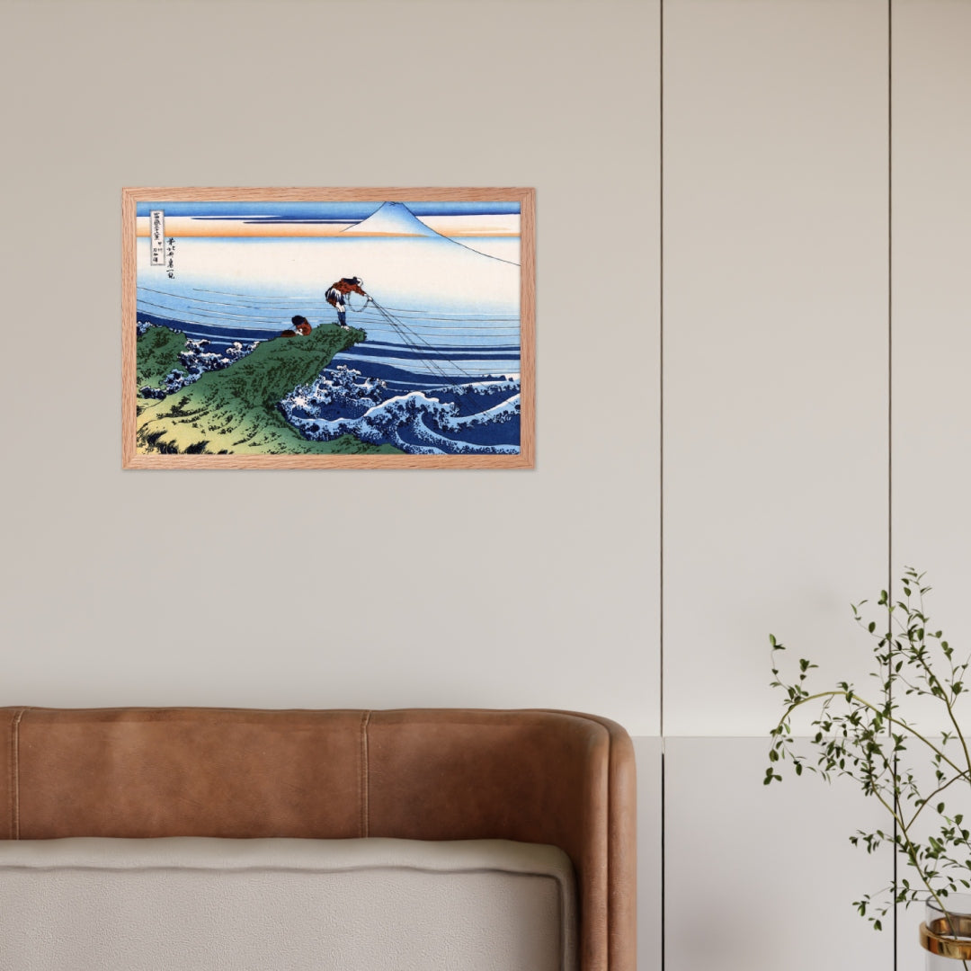 Immerse yourself in the quiet poetry of Kajikazawa in Kai Province by Katsushika Hokusai—a masterful Japanese Woodblock Print (Ukiyo-e) that captures the intimate relationship between humanity and nature. This framed wall print depicts a fisherman perched on rocky cliffs, casting his lines into stylized waves, while Mount Fuji rises serenely in the distance. The composition balances dynamic movement with meditative stillness, rendered in rich blues, soft gradients, and precise linework.