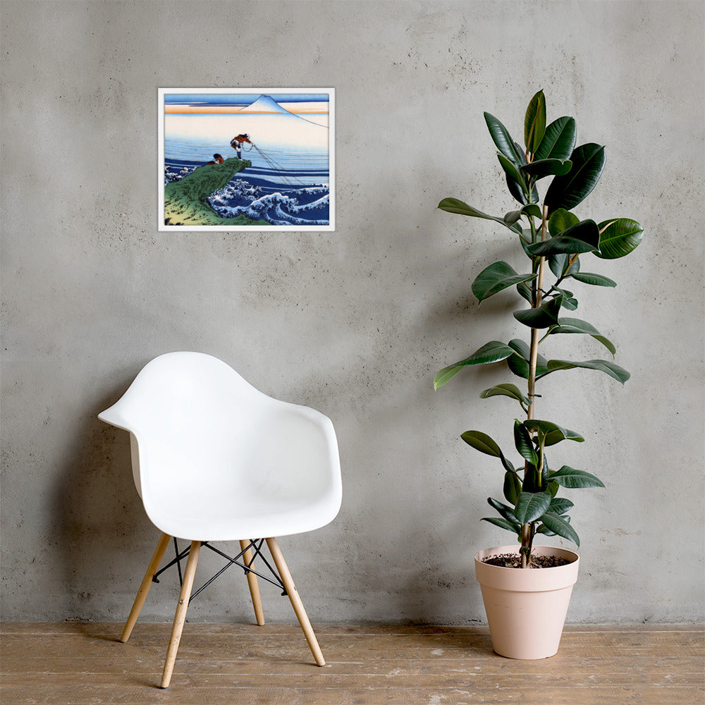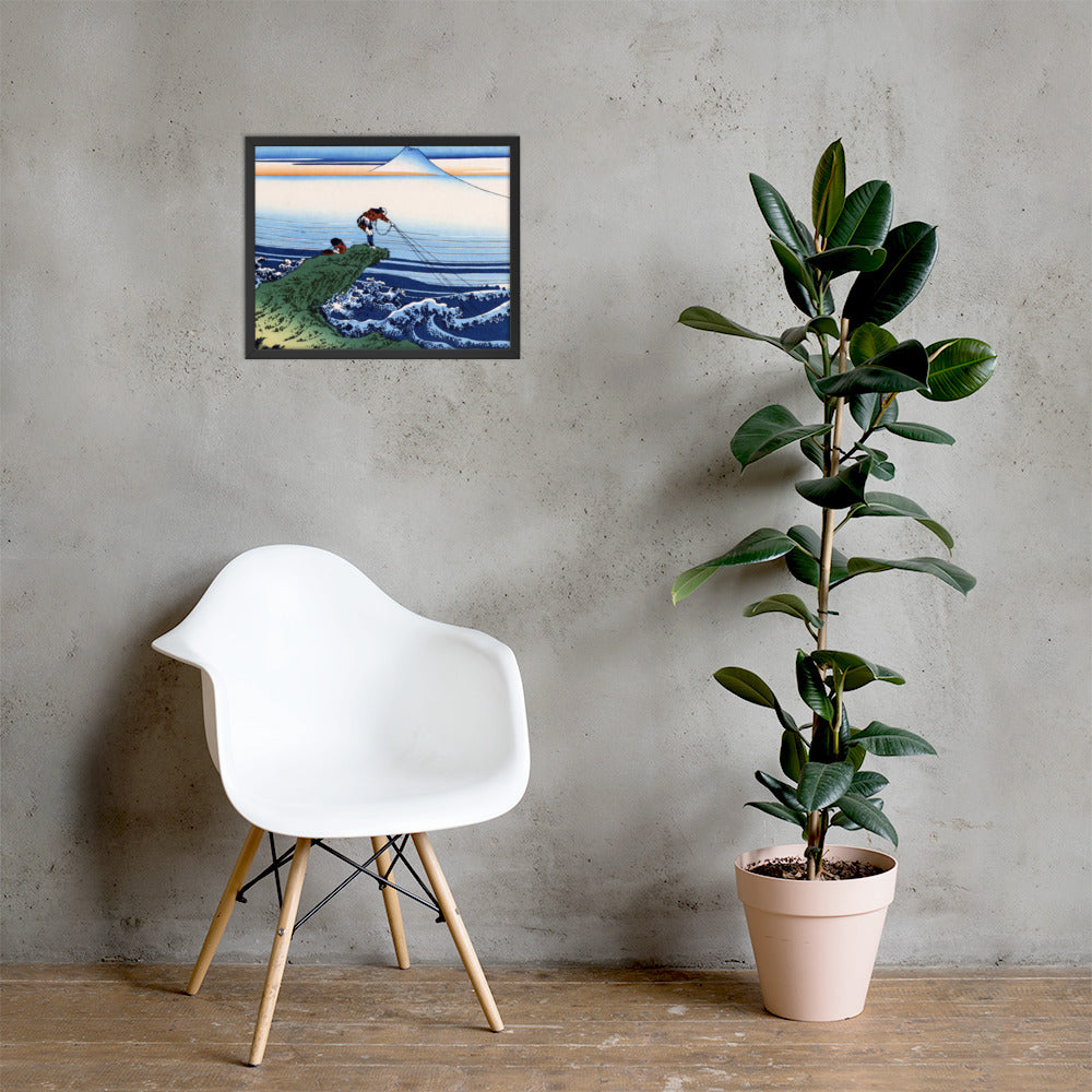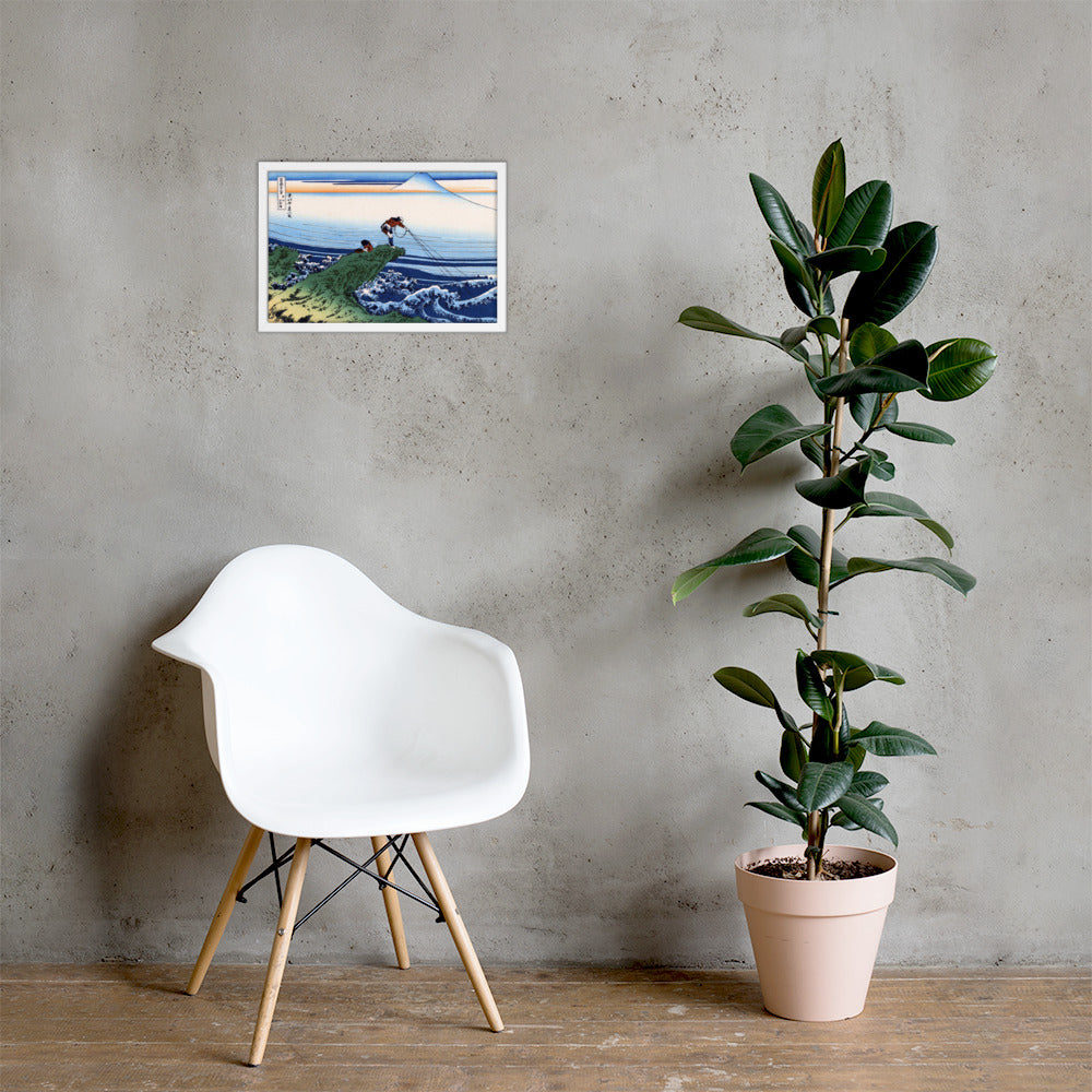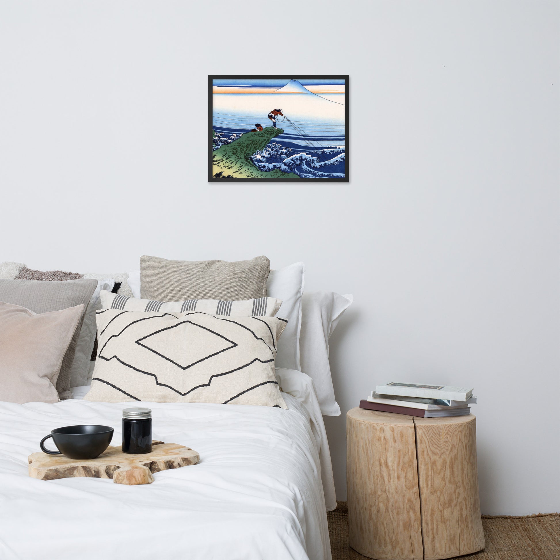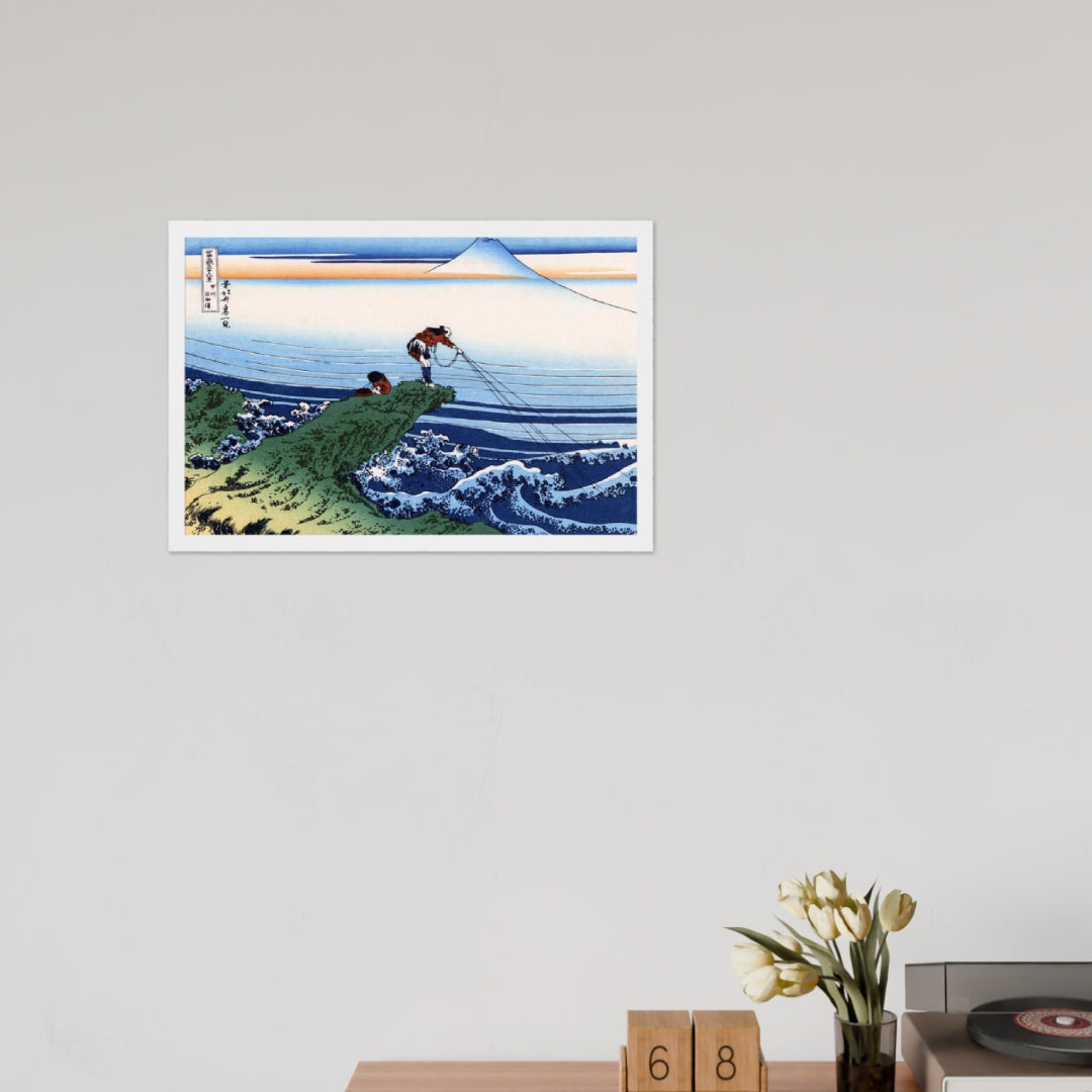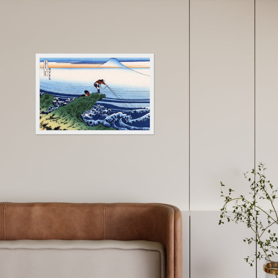 Immerse yourself in the quiet poetry of Kajikazawa in Kai Province by Katsushika Hokusai—a masterful Japanese Woodblock Print (Ukiyo-e) that captures the intimate relationship between humanity and nature. This framed wall print depicts a fisherman perched on rocky cliffs, casting his lines into stylized waves, while Mount Fuji rises serenely in the distance. The composition balances dynamic movement with meditative stillness, rendered in rich blues, soft gradients, and precise linework.