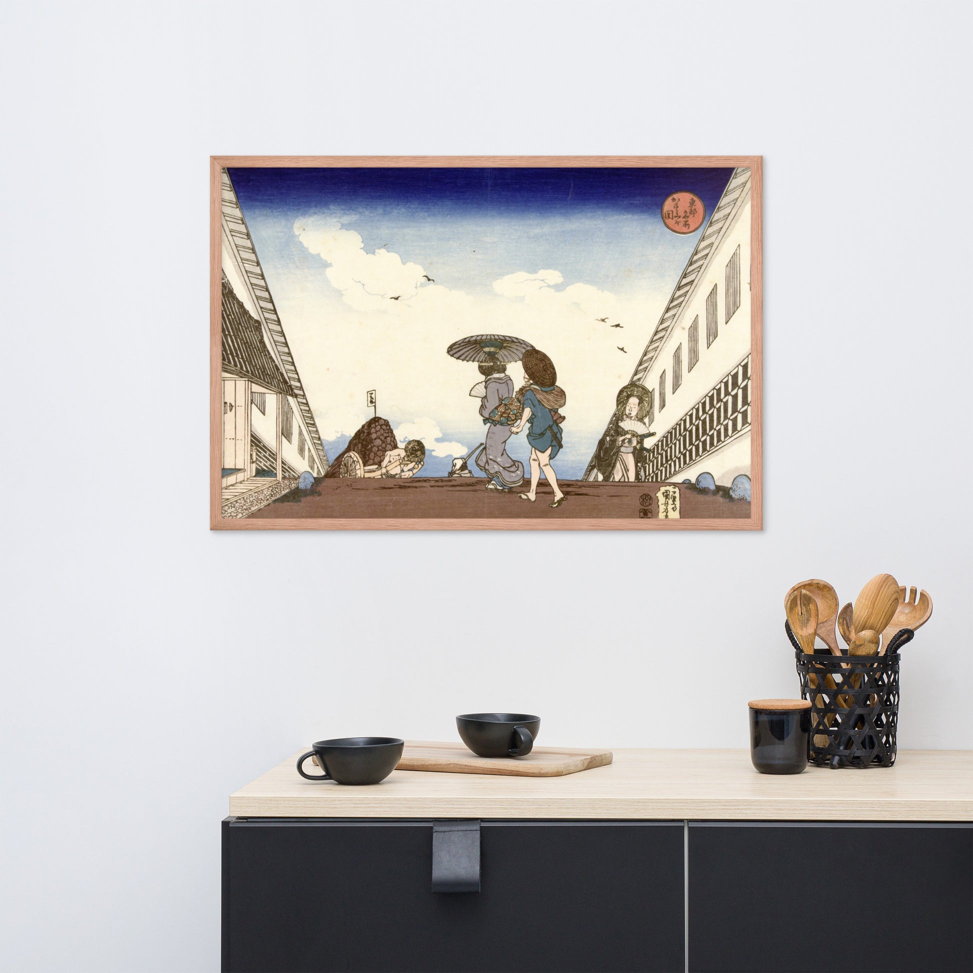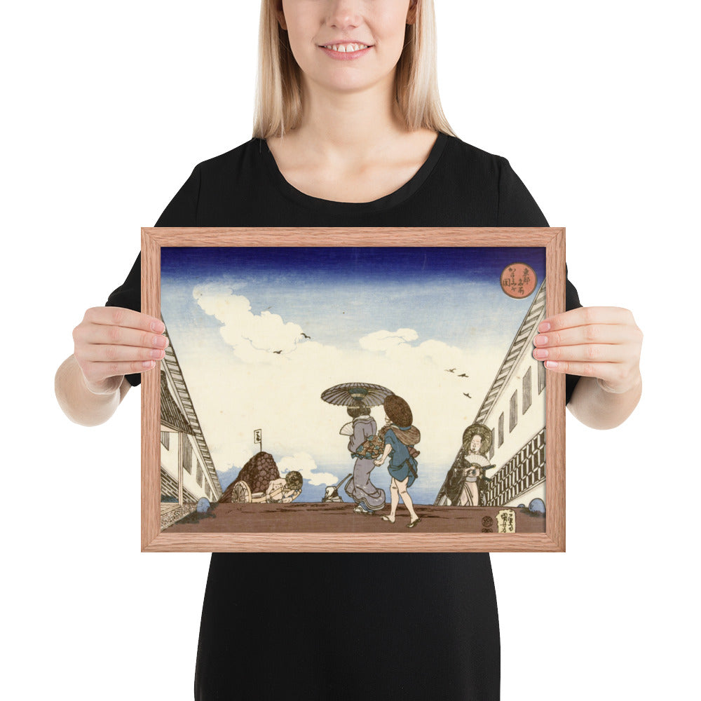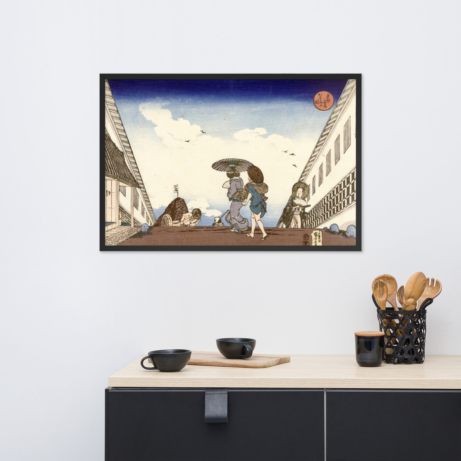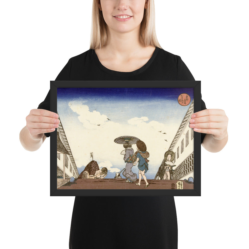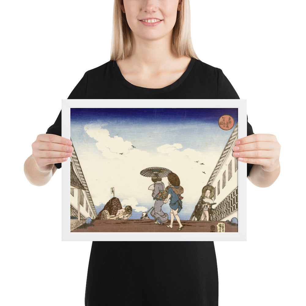 Step into the vibrant streets of Edo with Kasumigaseki by Utagawa Kuniyoshi—a captivating piece from the tradition of Japanese Woodblock Prints (Ukiyo-e). This framed artwork depicts a bustling moment in a historic district, where figures in flowing kimonos and straw hats navigate a richly textured urban scene. The interplay of patterned architecture, soft cloud gradients, and fluttering birds evokes both movement and calm, offering a window into 19th-century Japan’s daily life and aesthetic elegance.