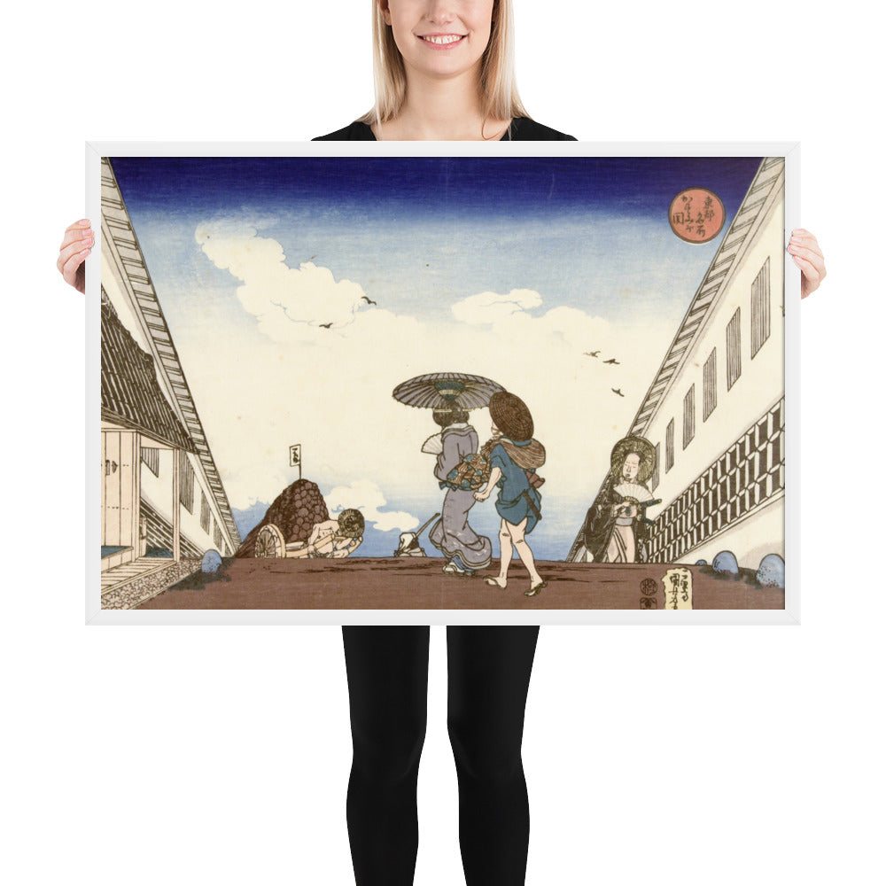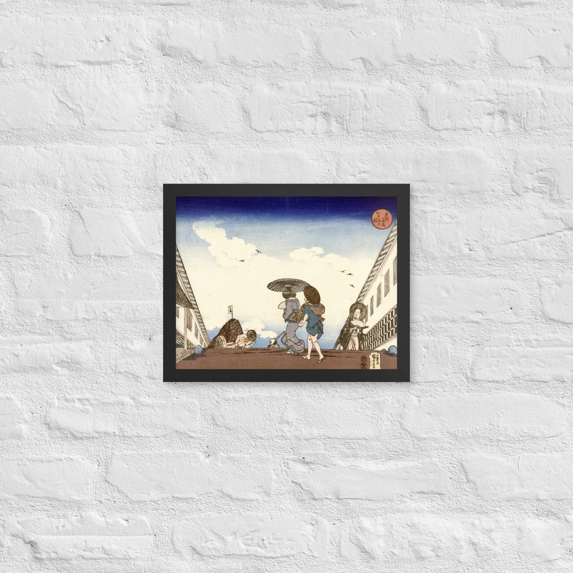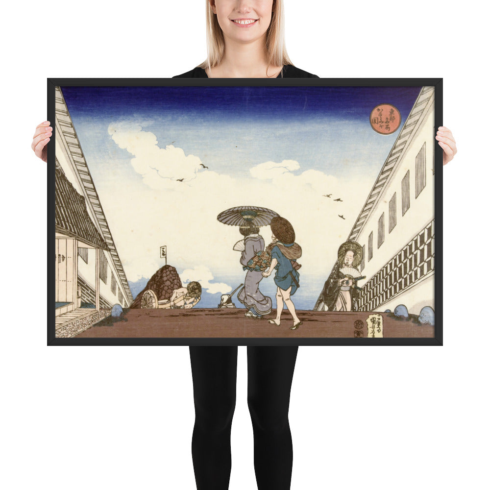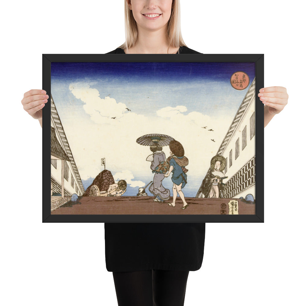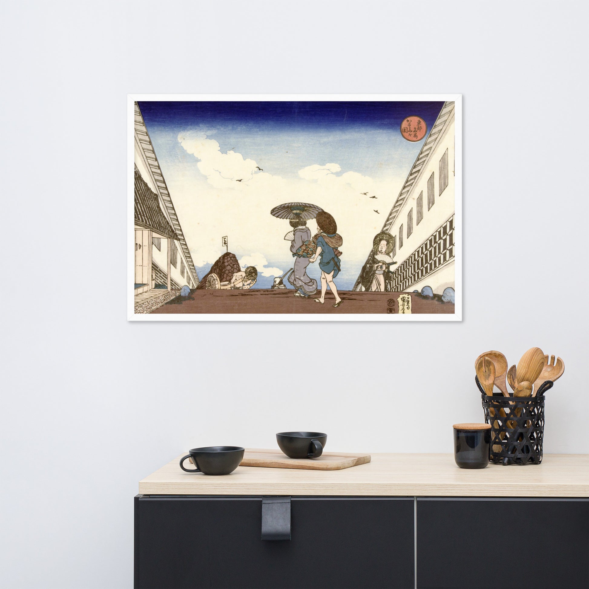 Step into the vibrant streets of Edo with Kasumigaseki by Utagawa Kuniyoshi—a captivating piece from the tradition of Japanese Woodblock Prints (Ukiyo-e). This framed artwork depicts a bustling moment in a historic district, where figures in flowing kimonos and straw hats navigate a richly textured urban scene. The interplay of patterned architecture, soft cloud gradients, and fluttering birds evokes both movement and calm, offering a window into 19th-century Japan’s daily life and aesthetic elegance.