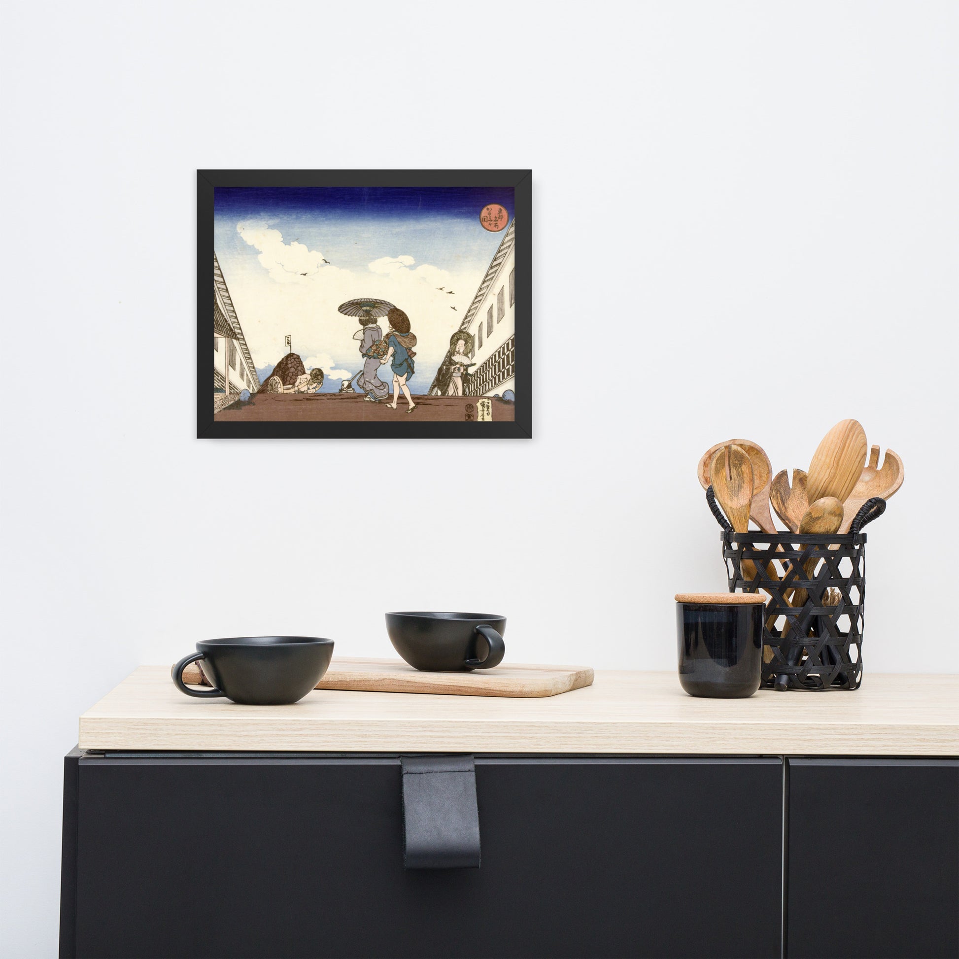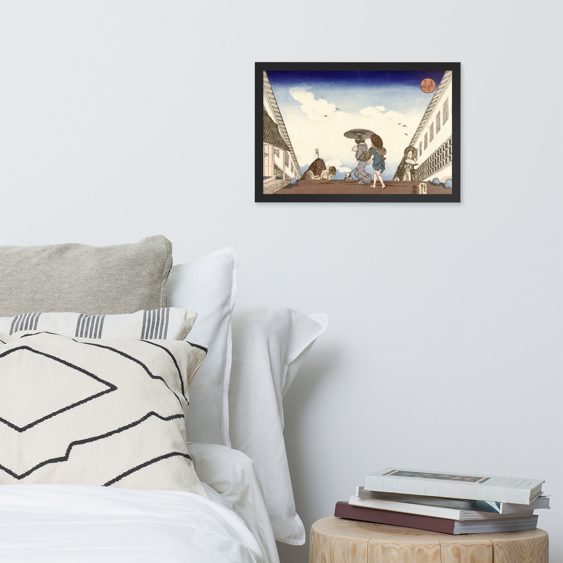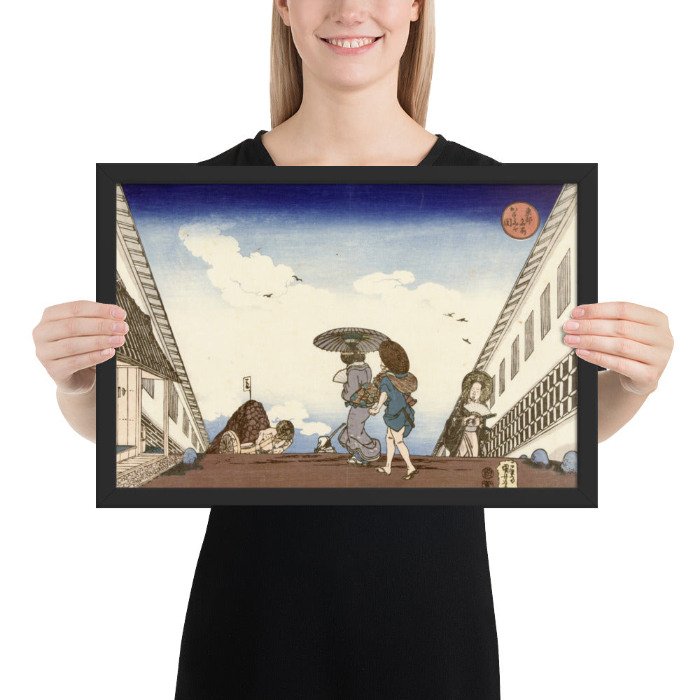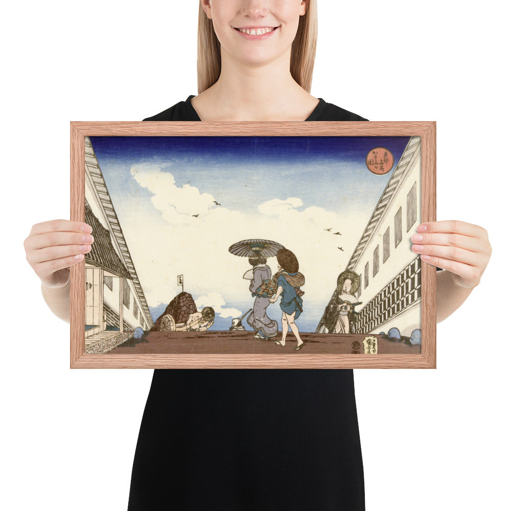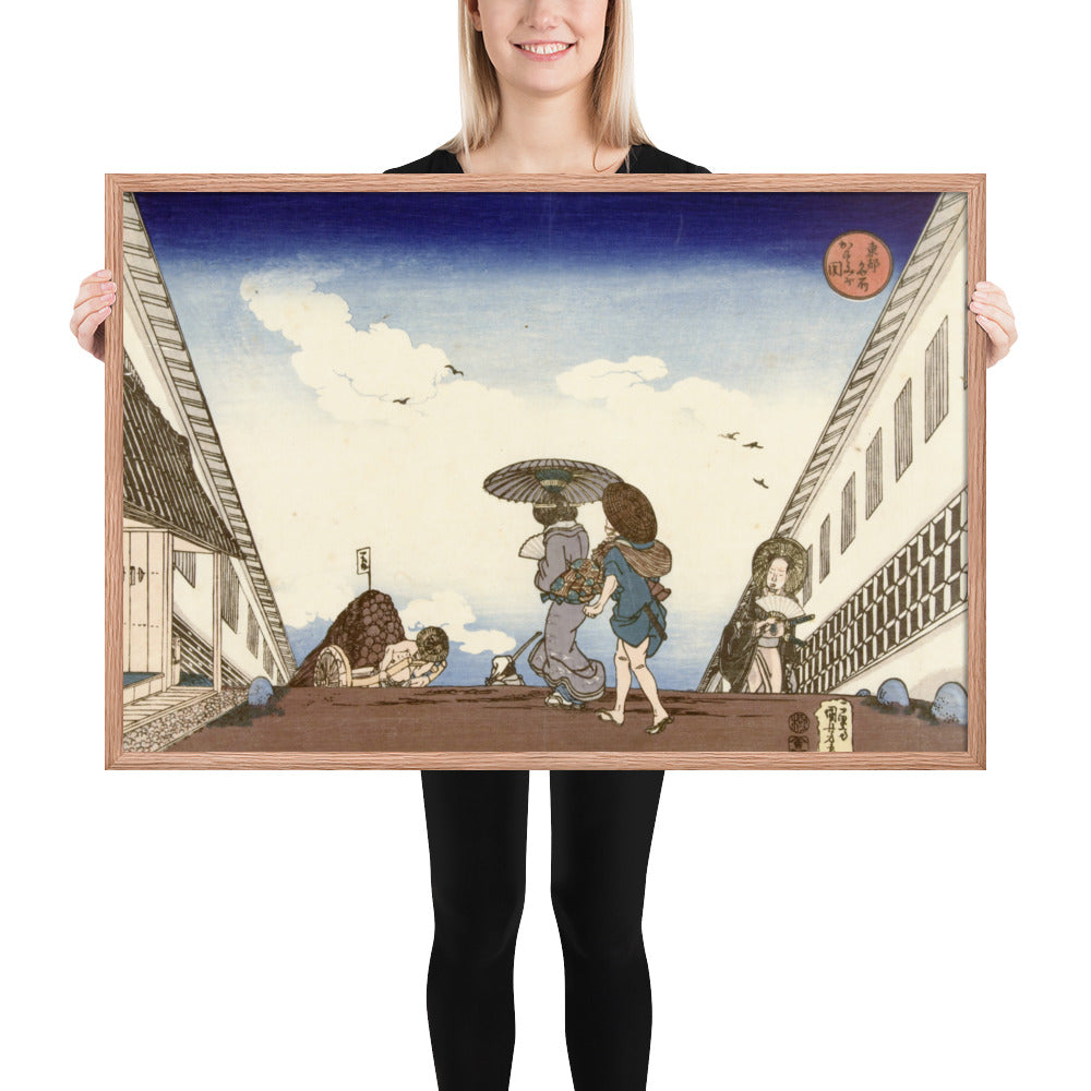 Step into the vibrant streets of Edo with Kasumigaseki by Utagawa Kuniyoshi—a captivating piece from the tradition of Japanese Woodblock Prints (Ukiyo-e). This framed artwork depicts a bustling moment in a historic district, where figures in flowing kimonos and straw hats navigate a richly textured urban scene. The interplay of patterned architecture, soft cloud gradients, and fluttering birds evokes both movement and calm, offering a window into 19th-century Japan’s daily life and aesthetic elegance.