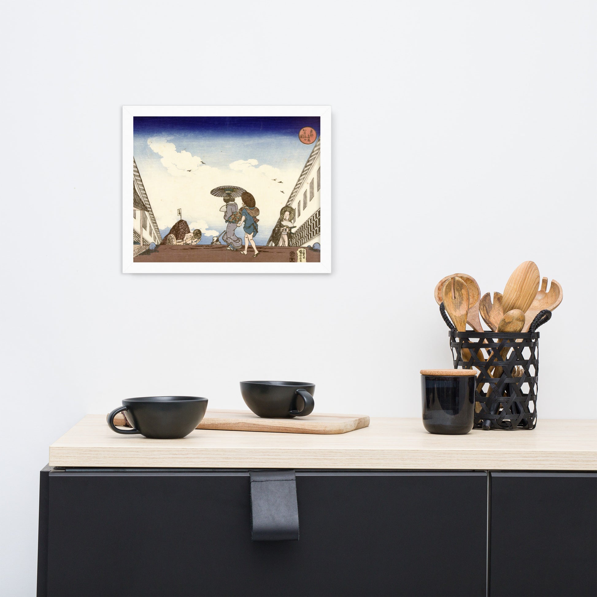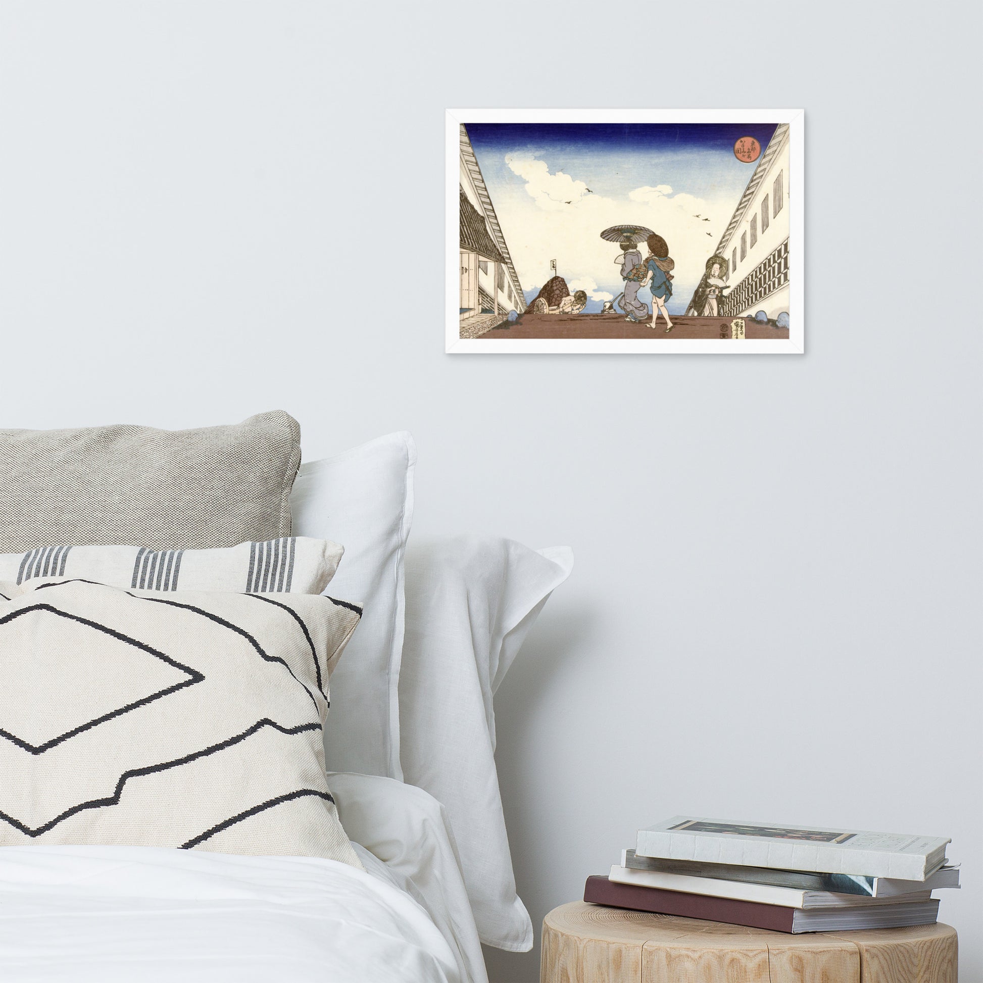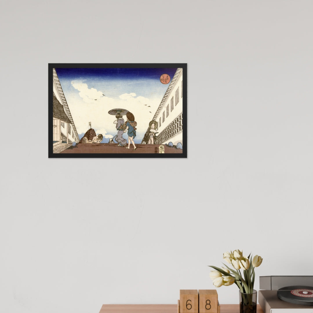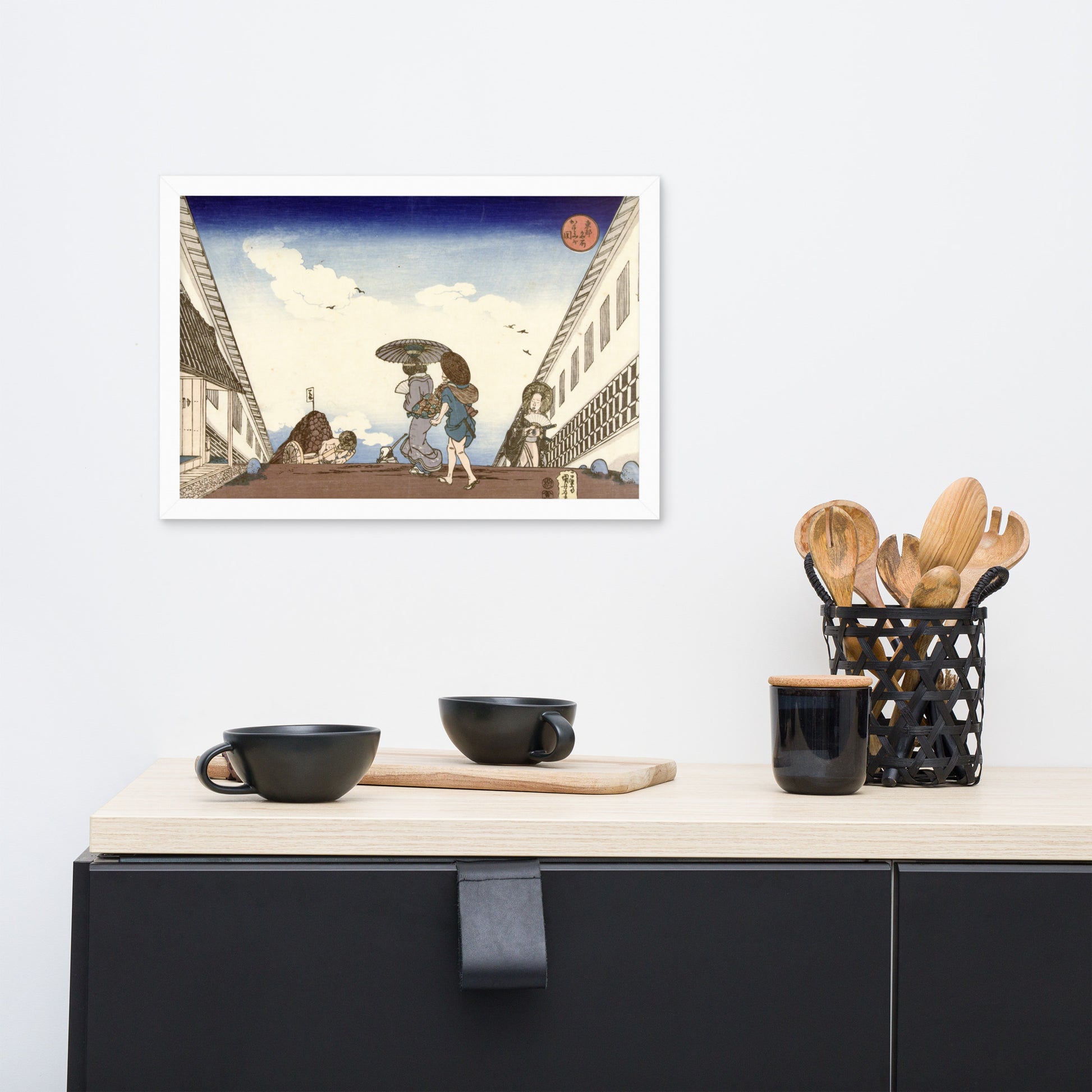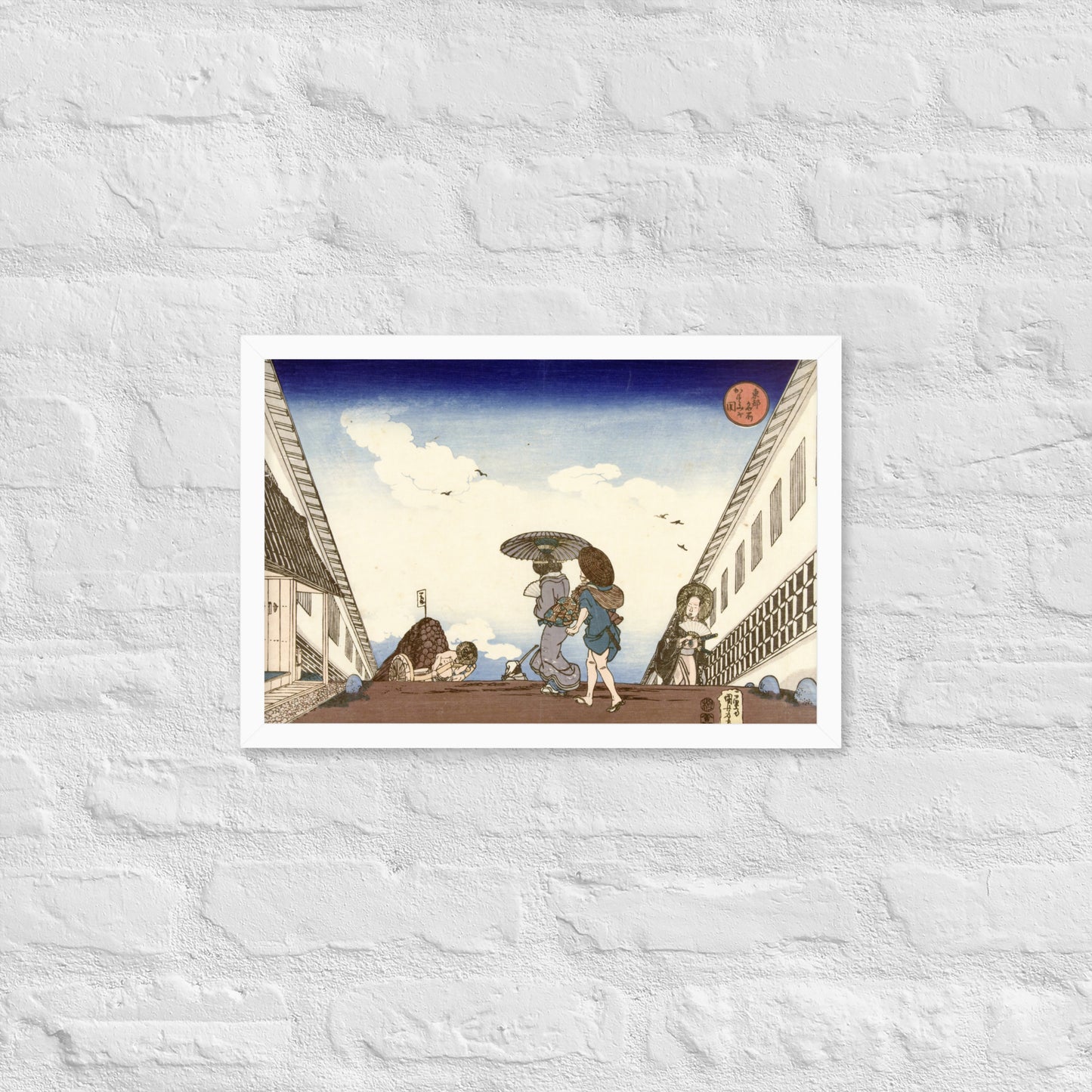 Step into the vibrant streets of Edo with Kasumigaseki by Utagawa Kuniyoshi—a captivating piece from the tradition of Japanese Woodblock Prints (Ukiyo-e). This framed artwork depicts a bustling moment in a historic district, where figures in flowing kimonos and straw hats navigate a richly textured urban scene. The interplay of patterned architecture, soft cloud gradients, and fluttering birds evokes both movement and calm, offering a window into 19th-century Japan’s daily life and aesthetic elegance.