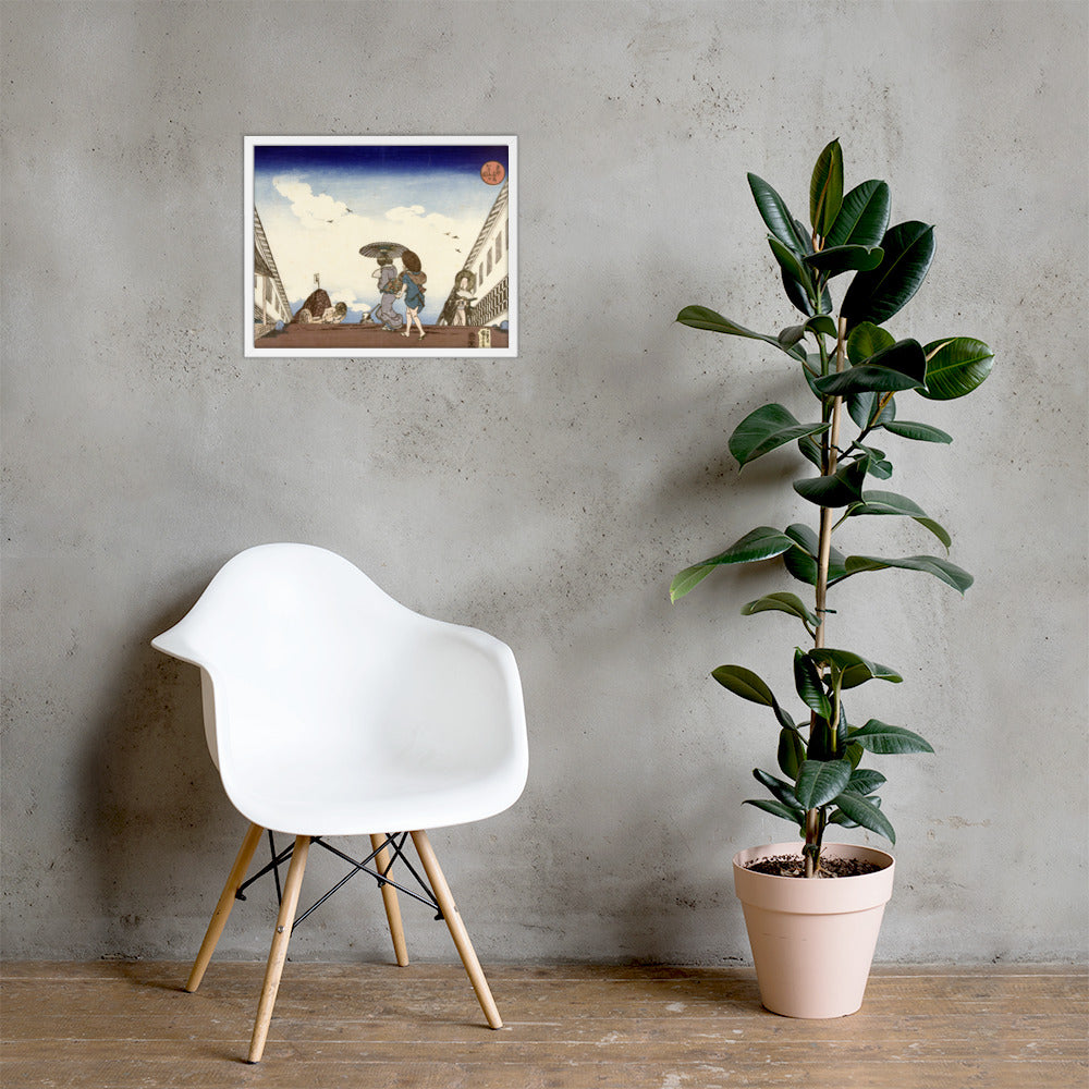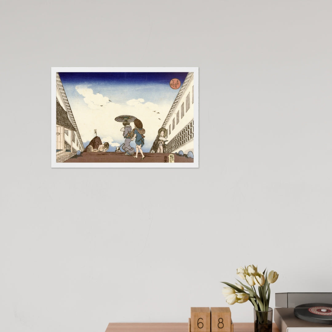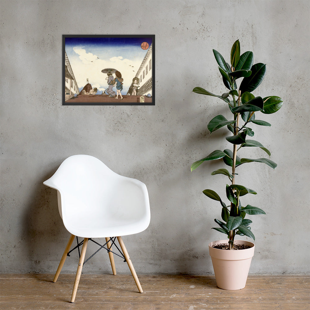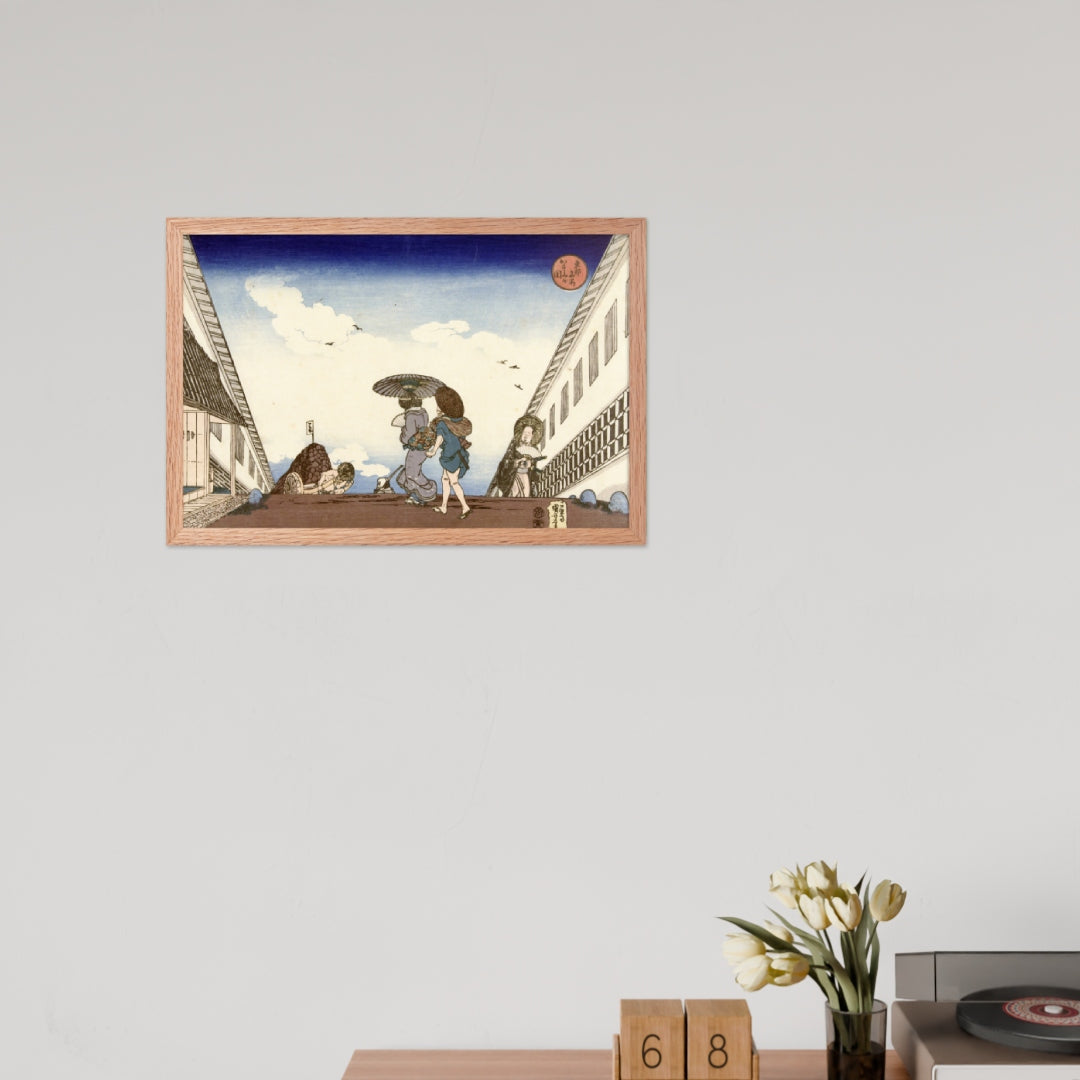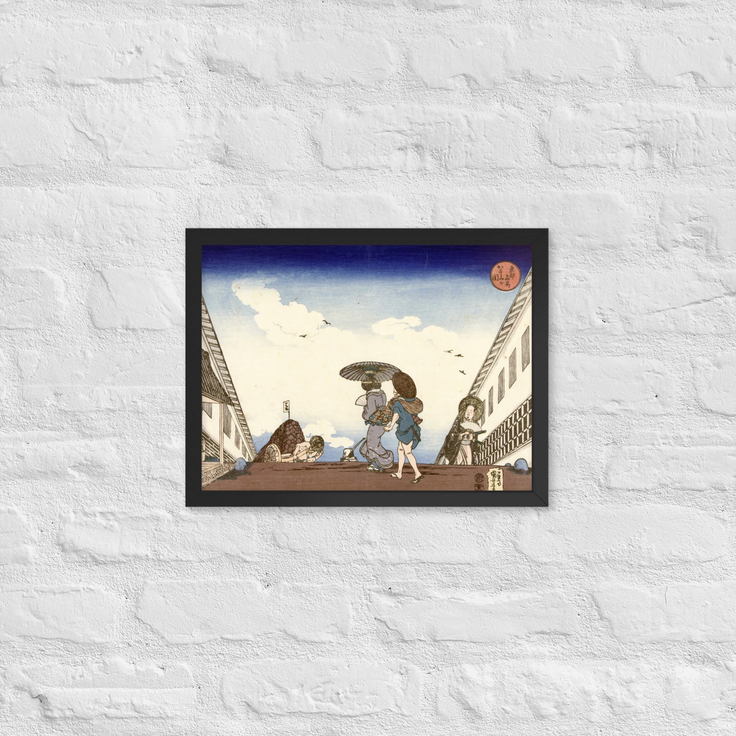 Step into the vibrant streets of Edo with Kasumigaseki by Utagawa Kuniyoshi—a captivating piece from the tradition of Japanese Woodblock Prints (Ukiyo-e). This framed artwork depicts a bustling moment in a historic district, where figures in flowing kimonos and straw hats navigate a richly textured urban scene. The interplay of patterned architecture, soft cloud gradients, and fluttering birds evokes both movement and calm, offering a window into 19th-century Japan’s daily life and aesthetic elegance.