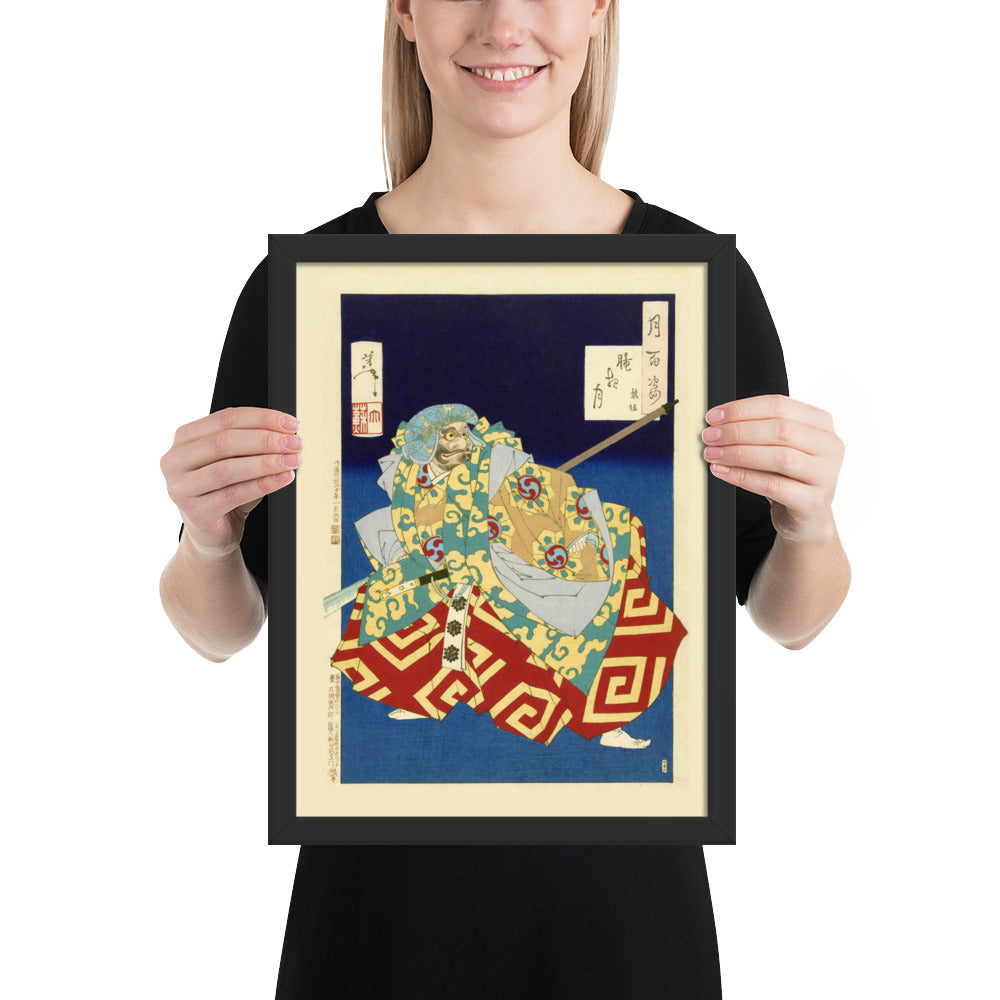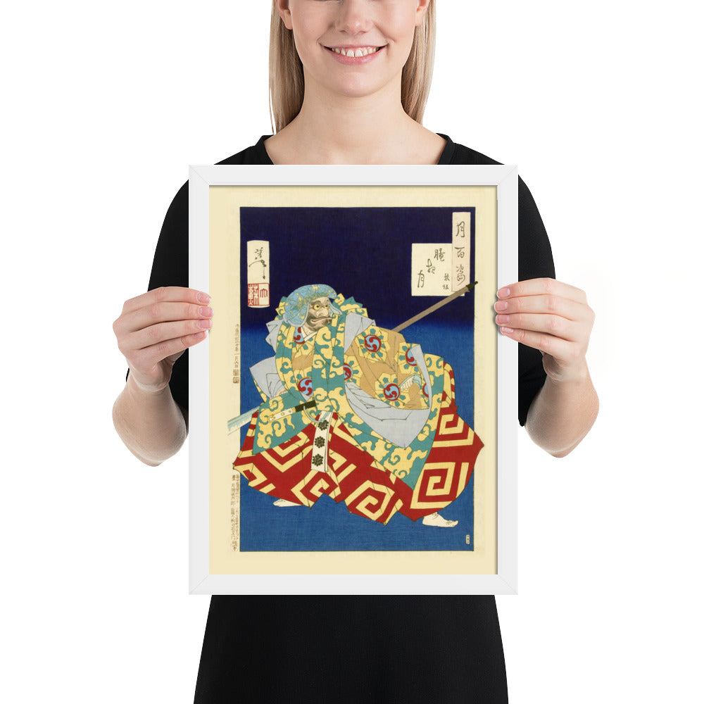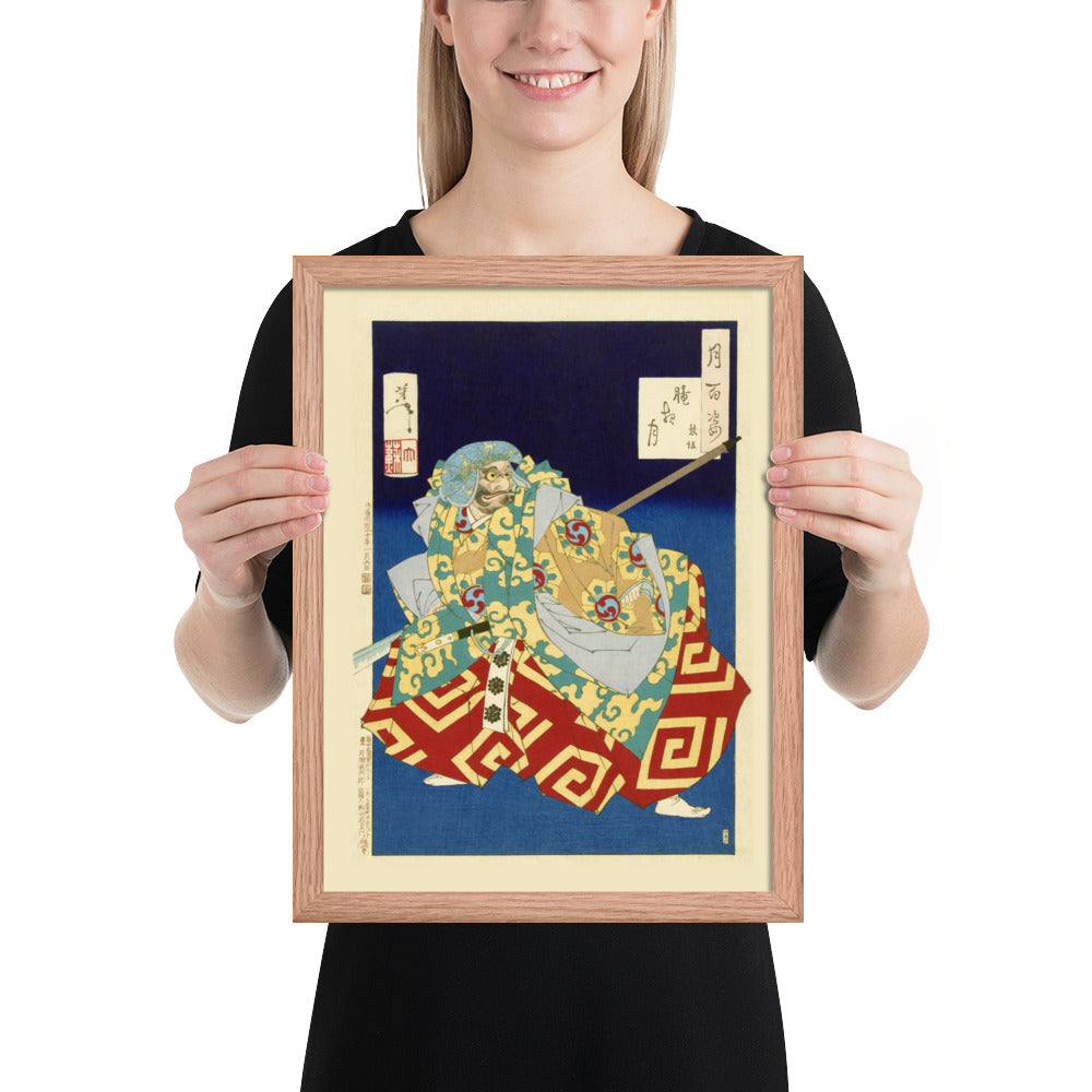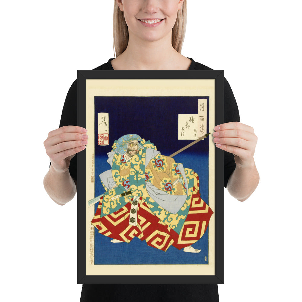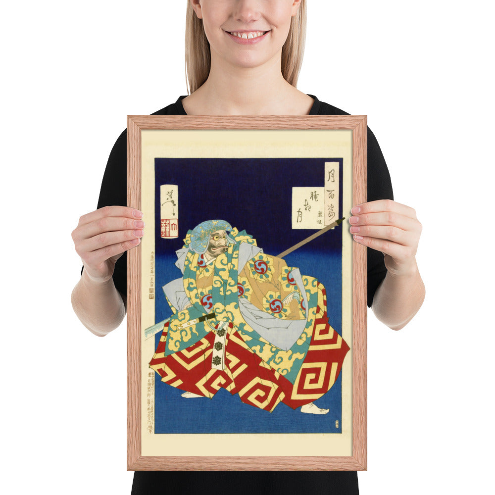 Unleash the spirit of legendary valor with Kumasaka by Tsukioka Yoshitoshi, a dynamic portrayal from the world of Japanese Woodblock Prints (Ukiyo-e). This framed artwork captures the fierce warrior Kumasaka no Chohan in full battle regalia, poised with a long spear and a commanding stance. His robe bursts with intricate red and white geometric patterns and floral motifs, set against a deep blue backdrop that intensifies the drama and focus.
