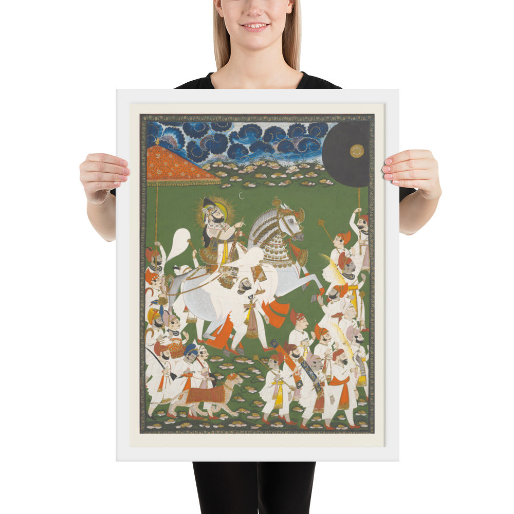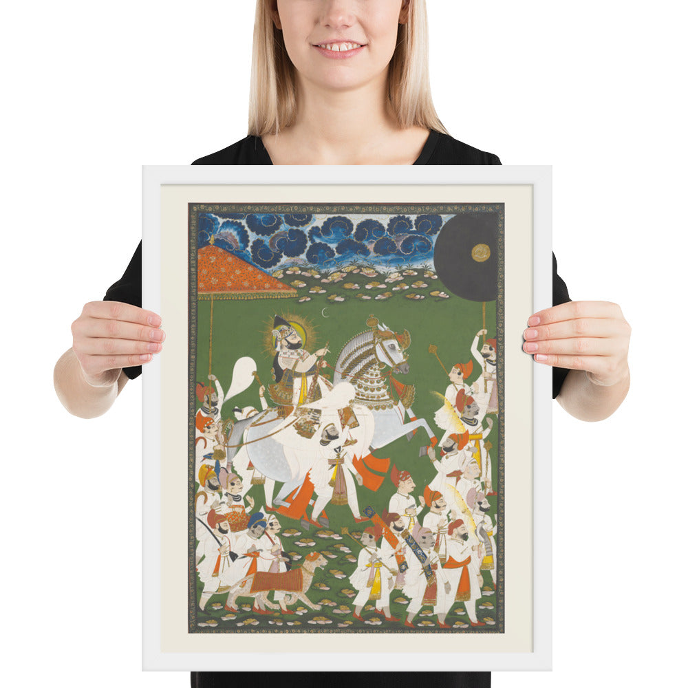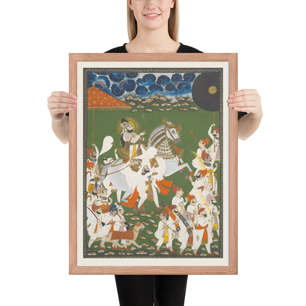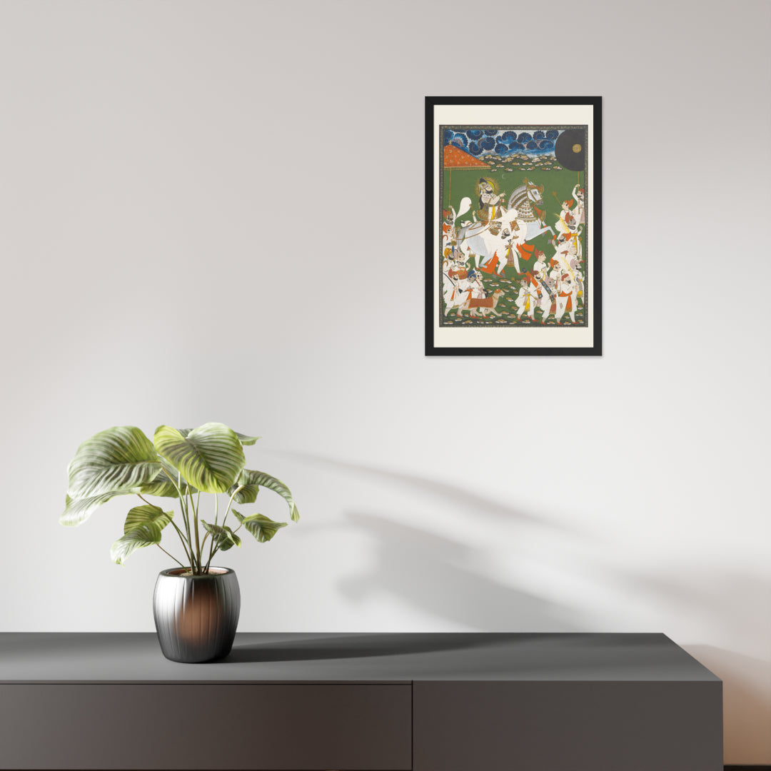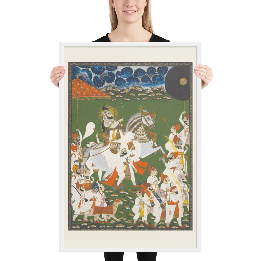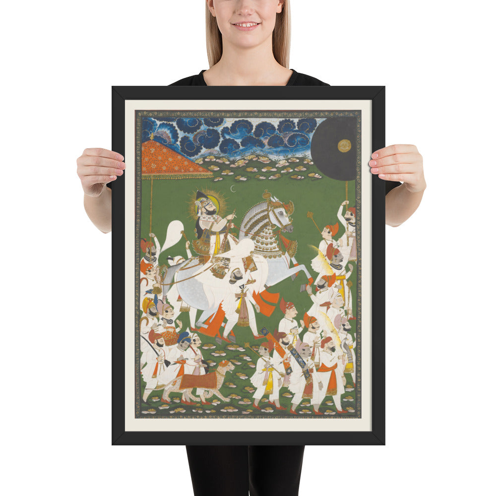 Step into a surreal royal dreamscape with Maharana Bhim Singh in Procession, a framed wall print that celebrates the grandeur of Indian miniature art. This richly detailed composition features the revered Maharana atop a white steed, surrounded by attendants, musicians, and ceremonial guards beneath a moonlit sky. The artwork’s intricate floral ground and dramatic celestial backdrop evoke a mystical procession frozen in time. Perfect for collectors of cultural heritage, lovers of surreal storytelling, or anyone seeking a regal centerpiece with historical depth and visual poetry.