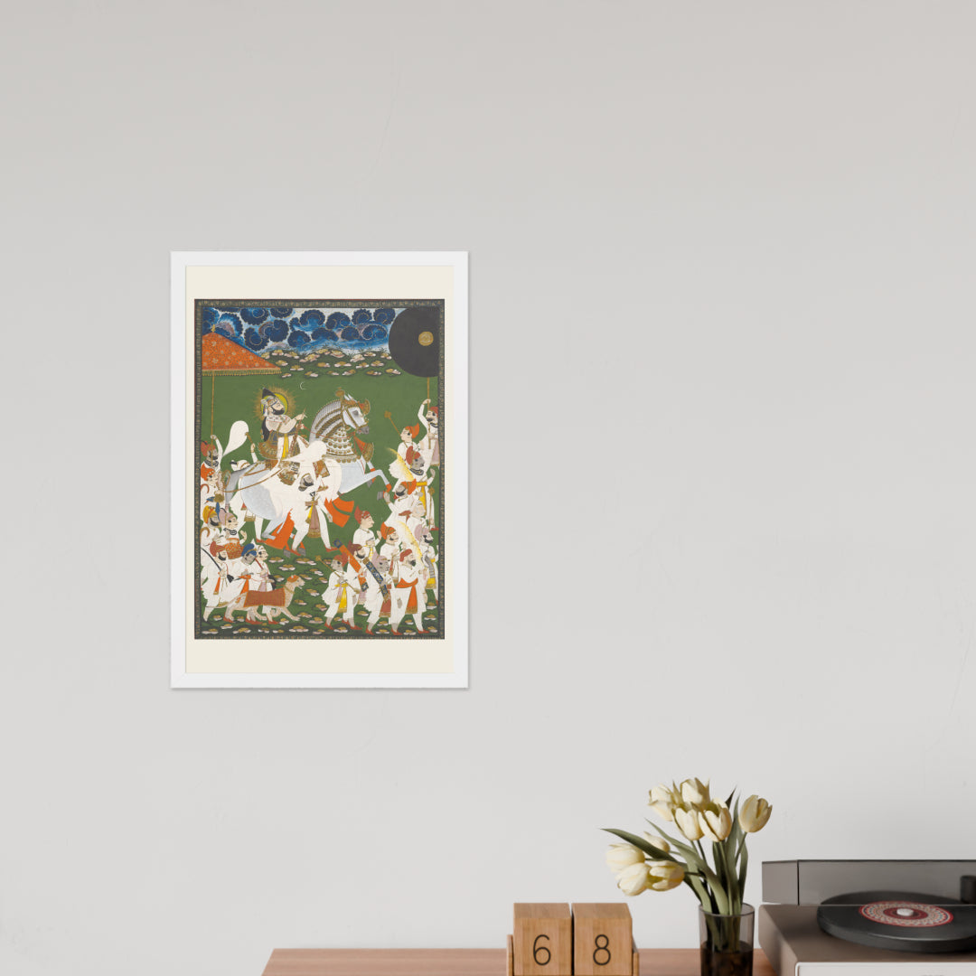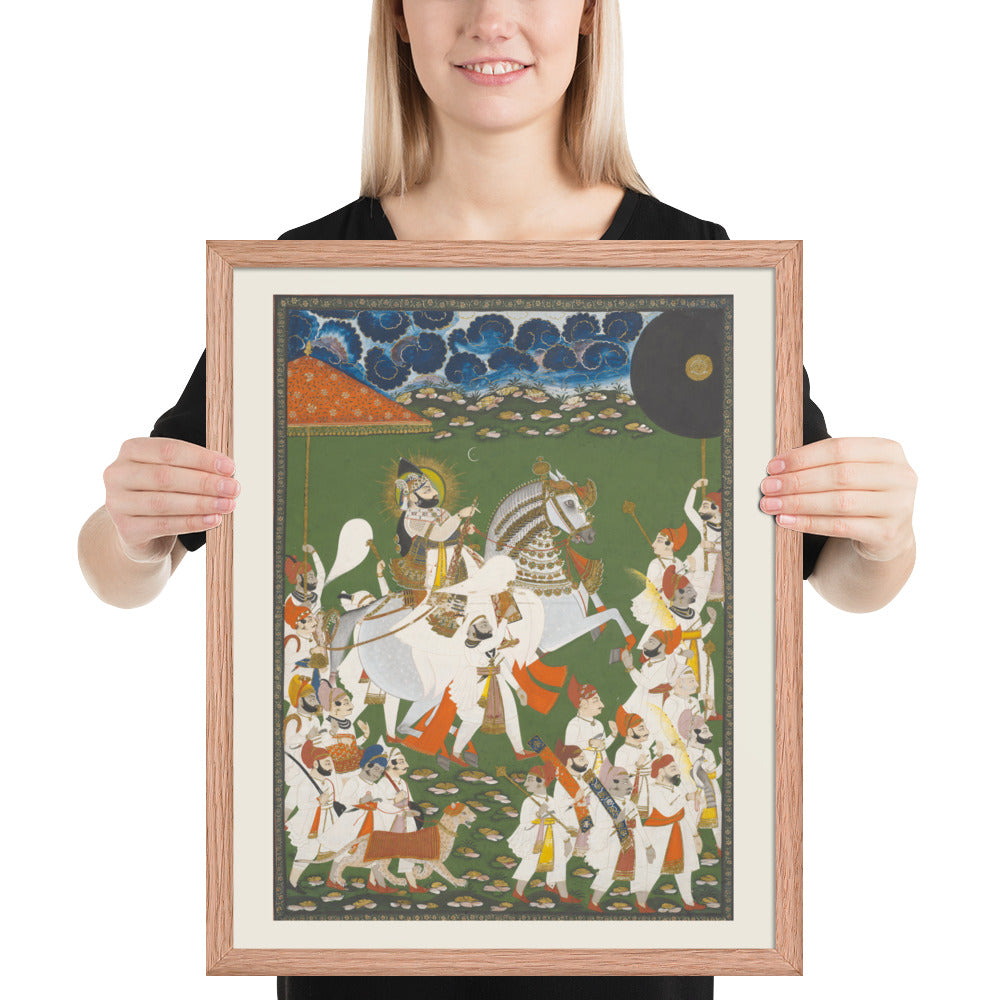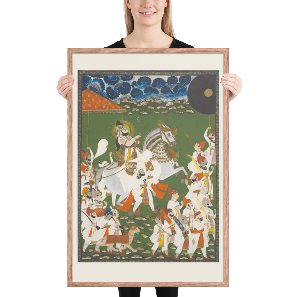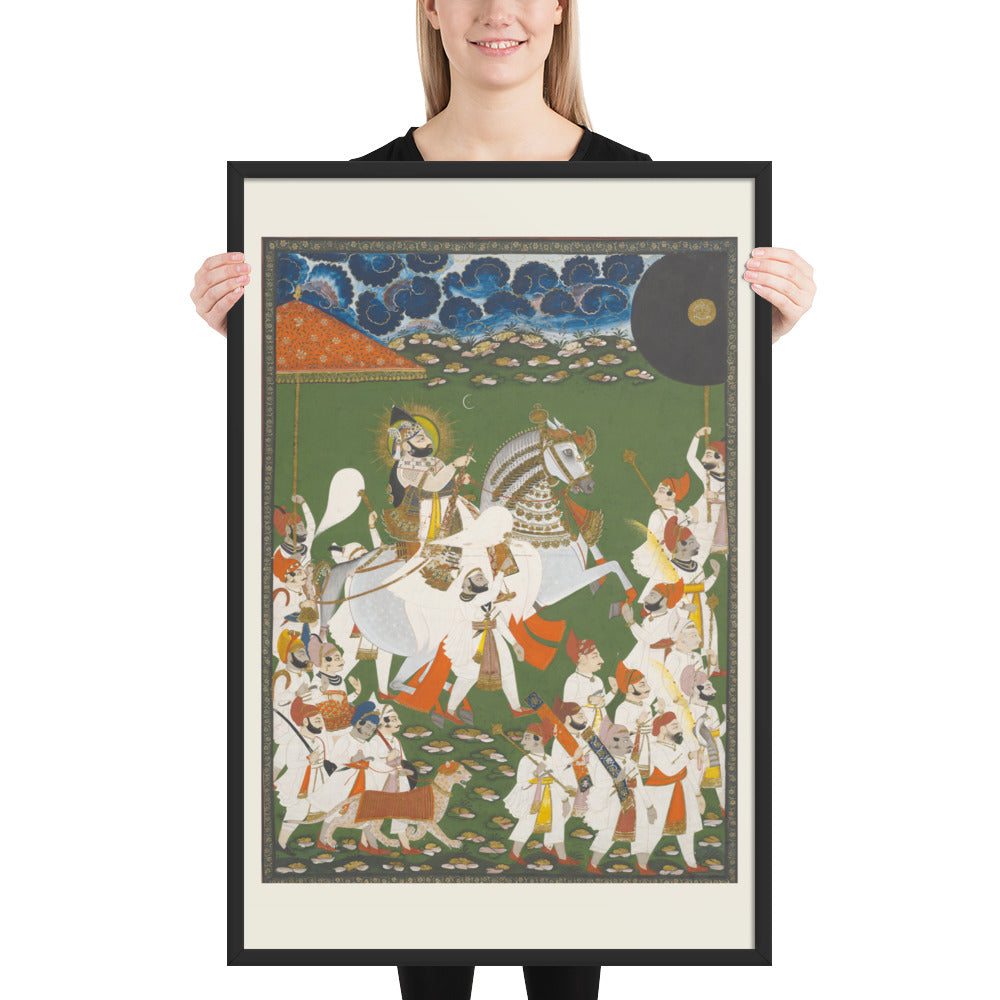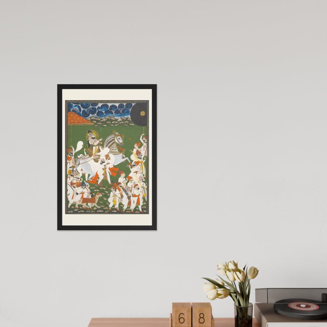 Step into a surreal royal dreamscape with Maharana Bhim Singh in Procession, a framed wall print that celebrates the grandeur of Indian miniature art. This richly detailed composition features the revered Maharana atop a white steed, surrounded by attendants, musicians, and ceremonial guards beneath a moonlit sky. The artwork’s intricate floral ground and dramatic celestial backdrop evoke a mystical procession frozen in time. Perfect for collectors of cultural heritage, lovers of surreal storytelling, or anyone seeking a regal centerpiece with historical depth and visual poetry.