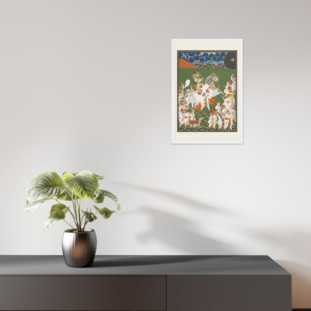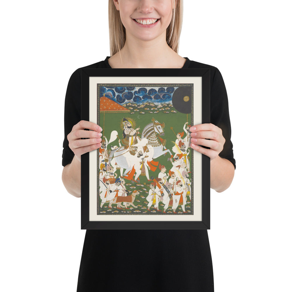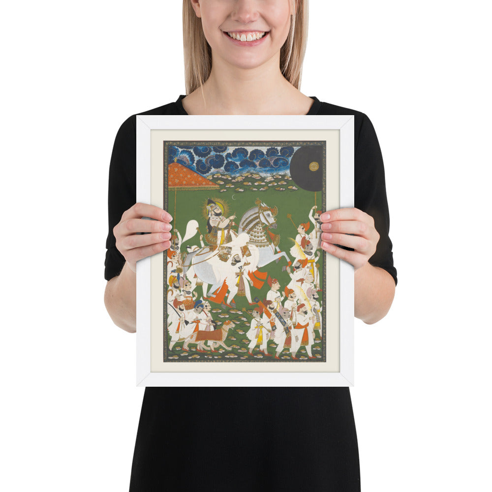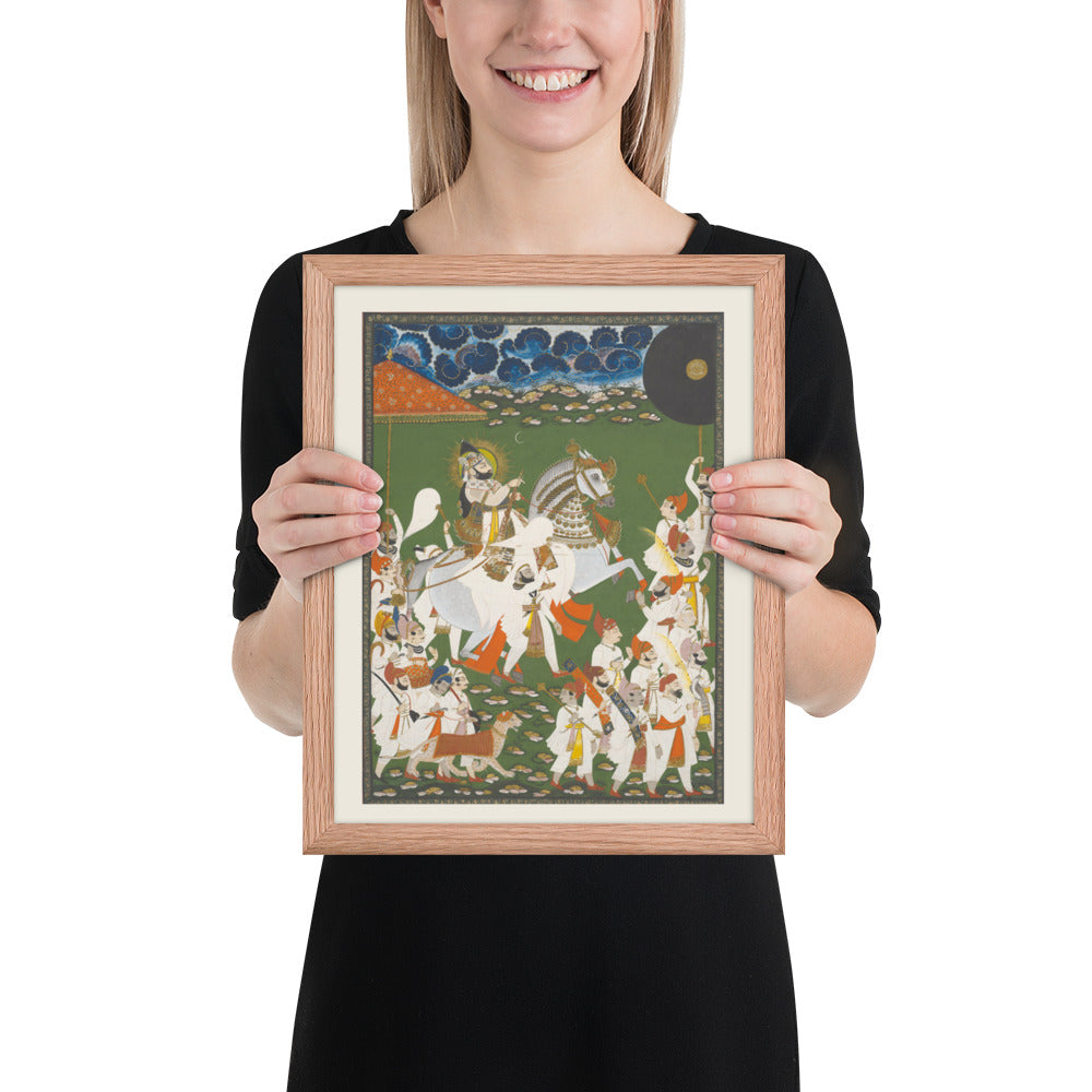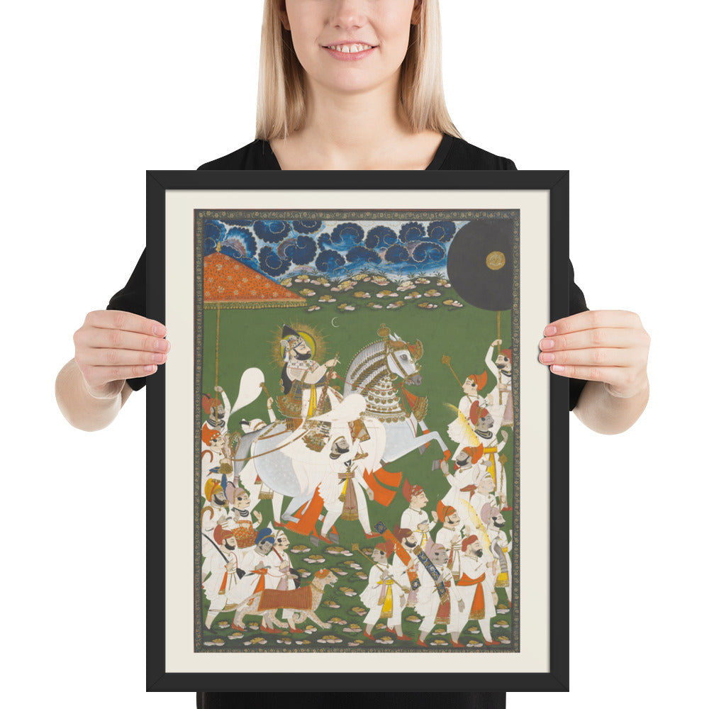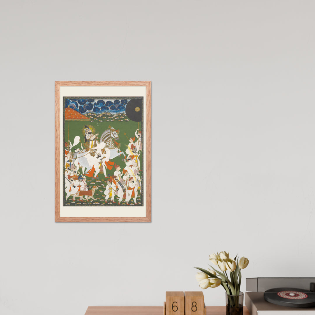Step into a surreal royal dreamscape with Maharana Bhim Singh in Procession, a framed wall print that celebrates the grandeur of Indian miniature art. This richly detailed composition features the revered Maharana atop a white steed, surrounded by attendants, musicians, and ceremonial guards beneath a moonlit sky. The artwork’s intricate floral ground and dramatic celestial backdrop evoke a mystical procession frozen in time. Perfect for collectors of cultural heritage, lovers of surreal storytelling, or anyone seeking a regal centerpiece with historical depth and visual poetry.