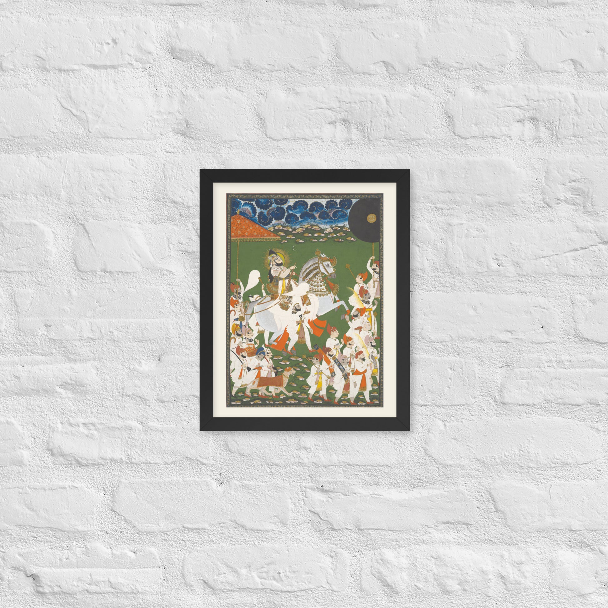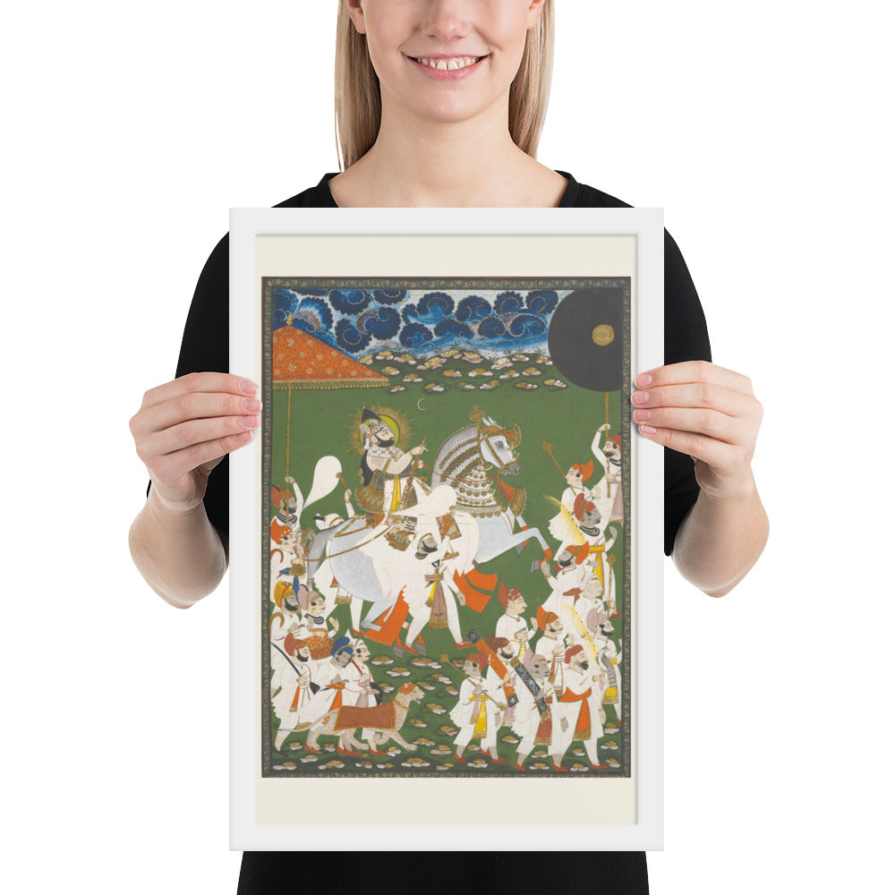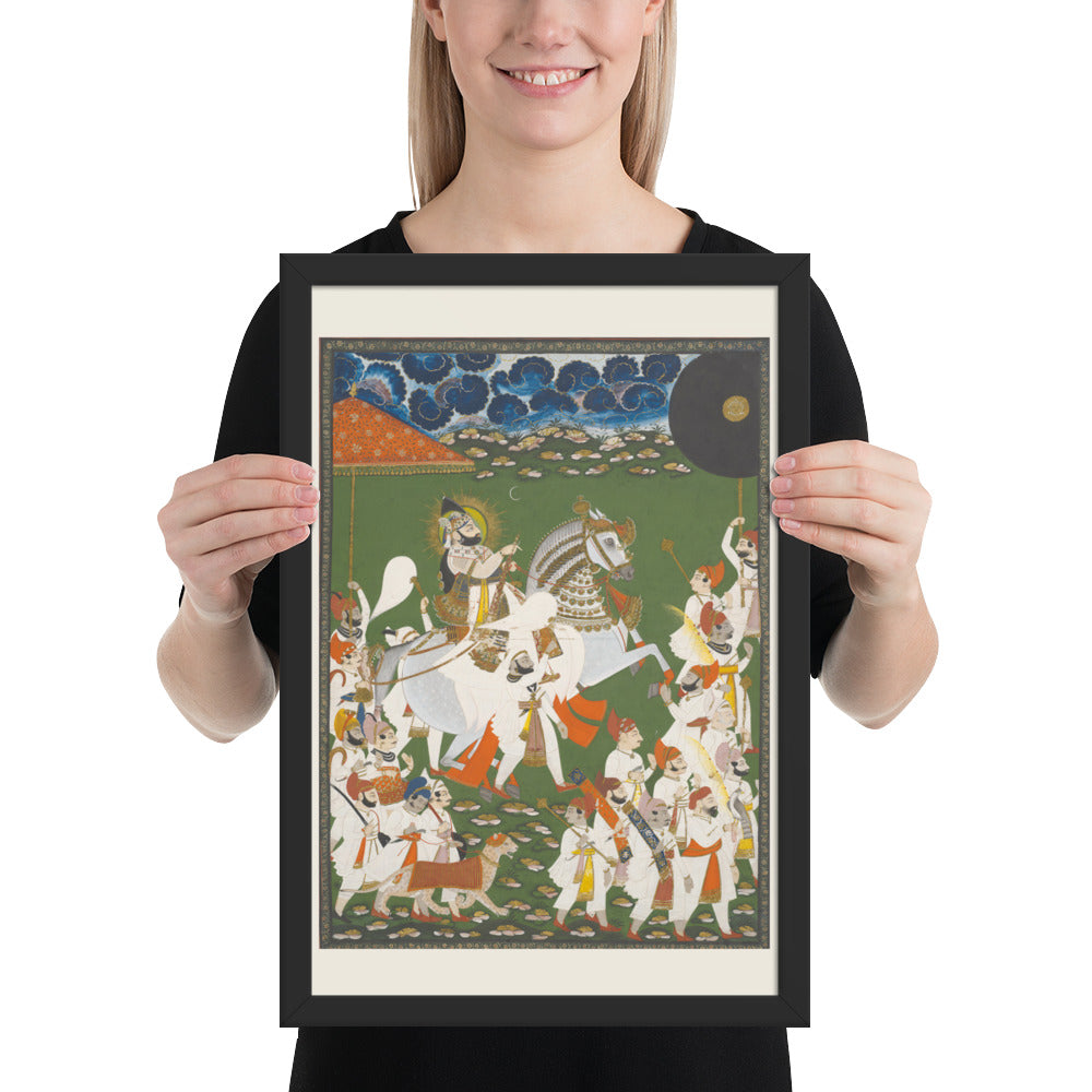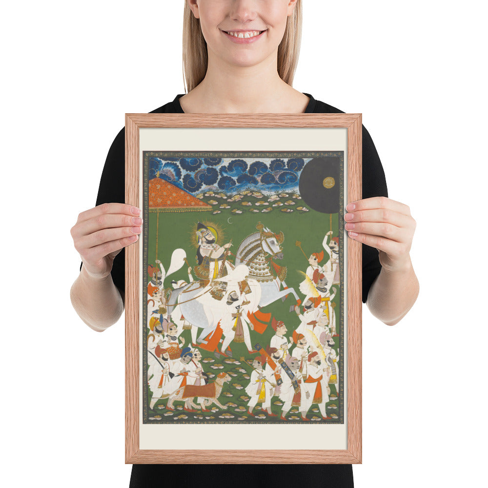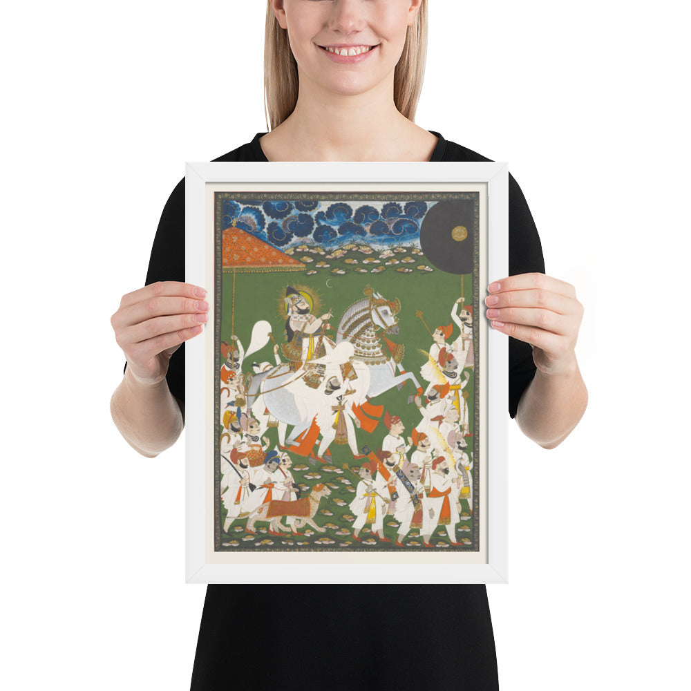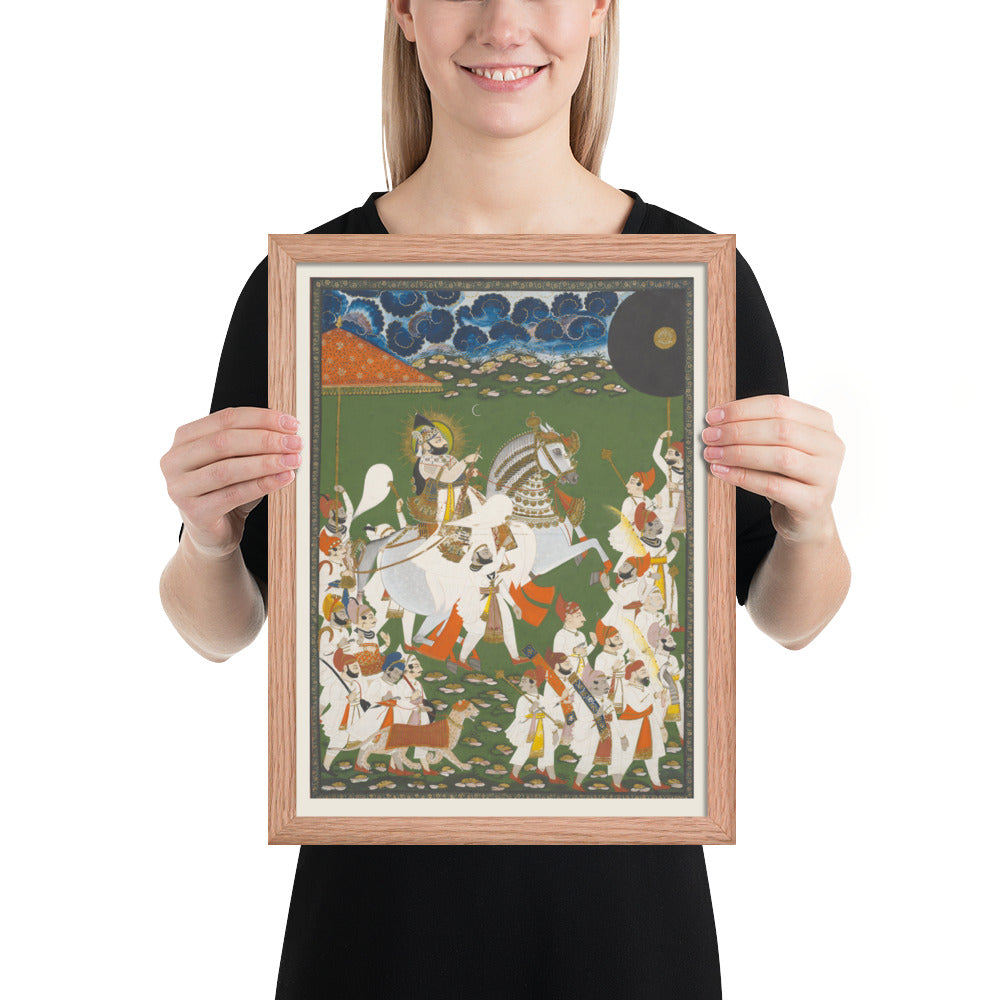 Step into a surreal royal dreamscape with Maharana Bhim Singh in Procession, a framed wall print that celebrates the grandeur of Indian miniature art. This richly detailed composition features the revered Maharana atop a white steed, surrounded by attendants, musicians, and ceremonial guards beneath a moonlit sky. The artwork’s intricate floral ground and dramatic celestial backdrop evoke a mystical procession frozen in time. Perfect for collectors of cultural heritage, lovers of surreal storytelling, or anyone seeking a regal centerpiece with historical depth and visual poetry.