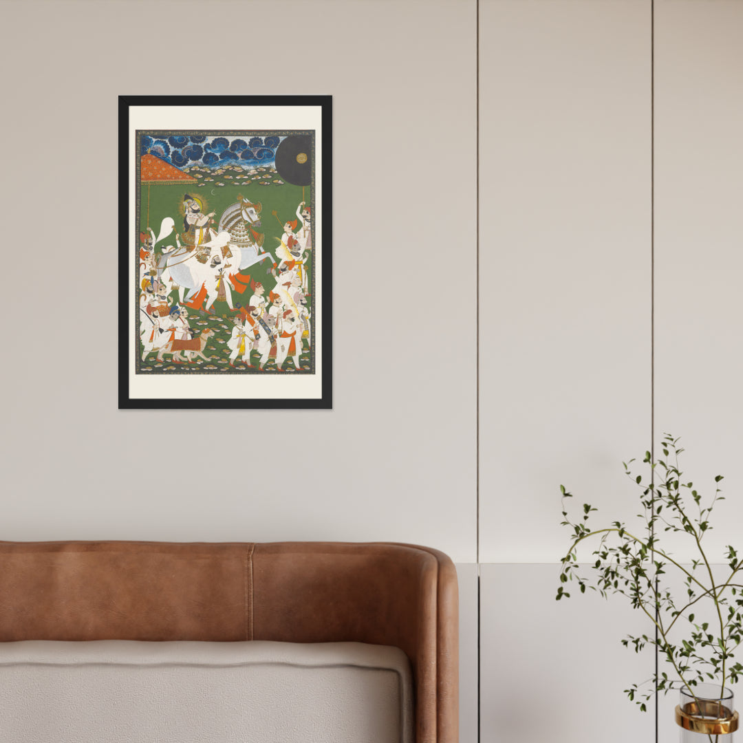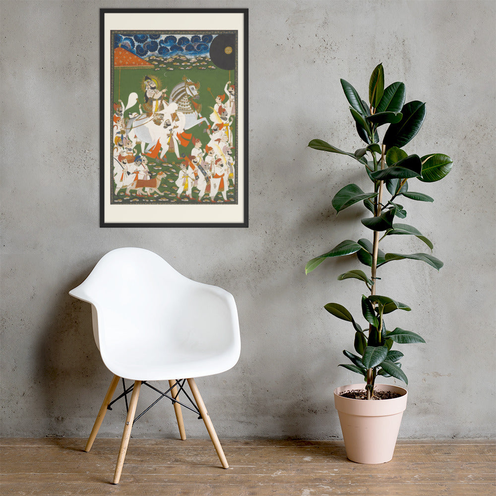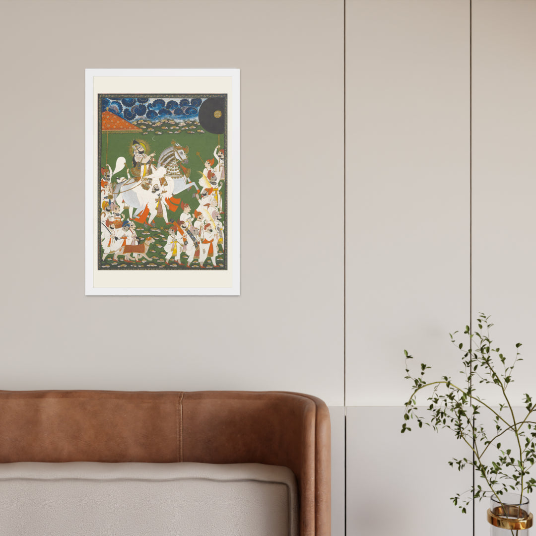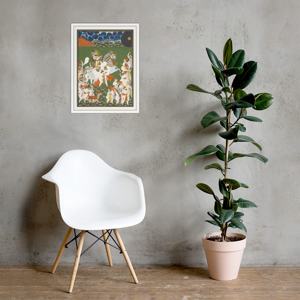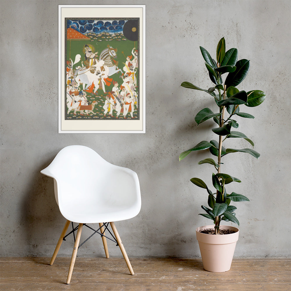 Step into a surreal royal dreamscape with Maharana Bhim Singh in Procession, a framed wall print that celebrates the grandeur of Indian miniature art. This richly detailed composition features the revered Maharana atop a white steed, surrounded by attendants, musicians, and ceremonial guards beneath a moonlit sky. The artwork’s intricate floral ground and dramatic celestial backdrop evoke a mystical procession frozen in time. Perfect for collectors of cultural heritage, lovers of surreal storytelling, or anyone seeking a regal centerpiece with historical depth and visual poetry.