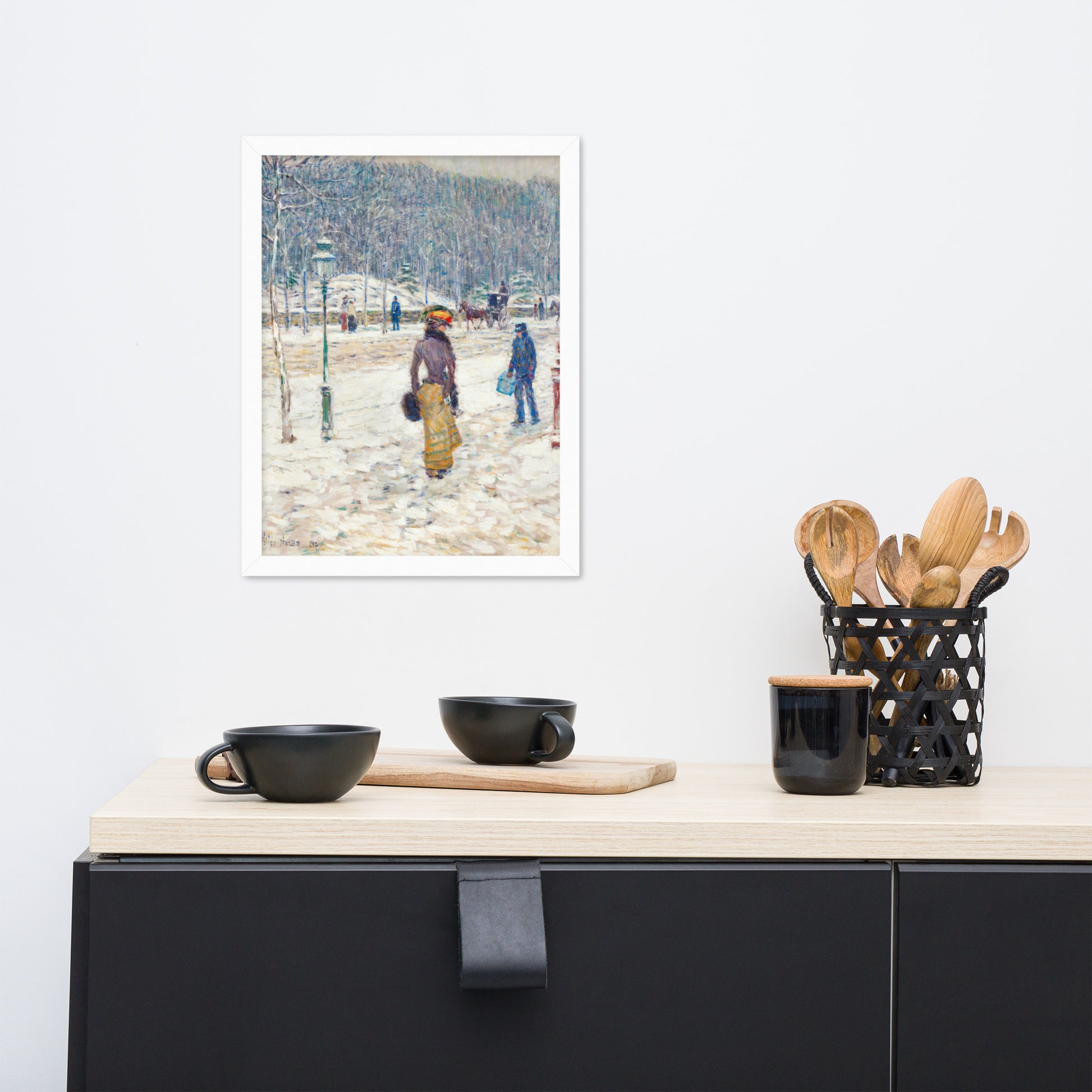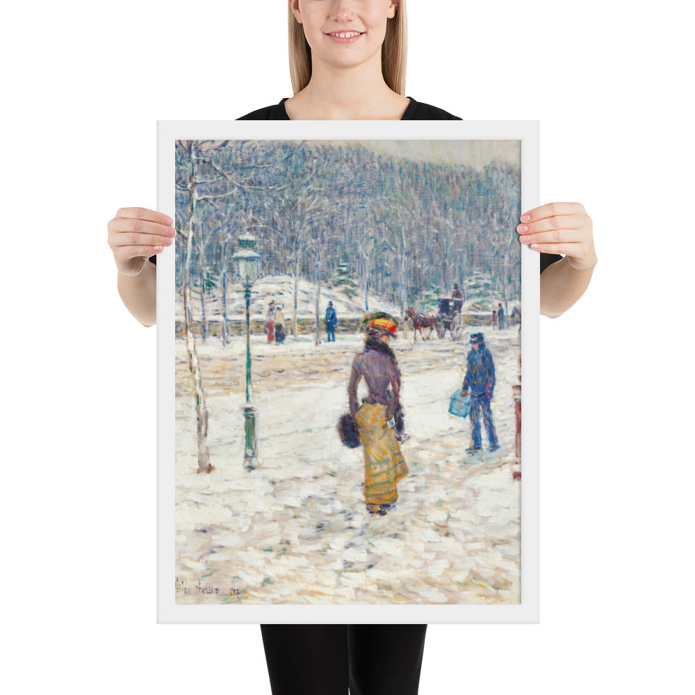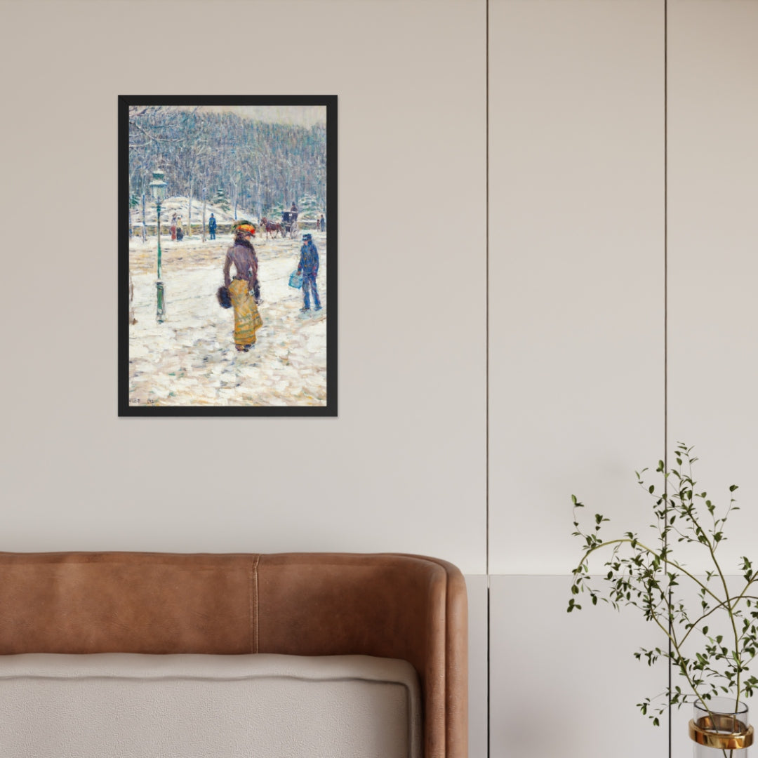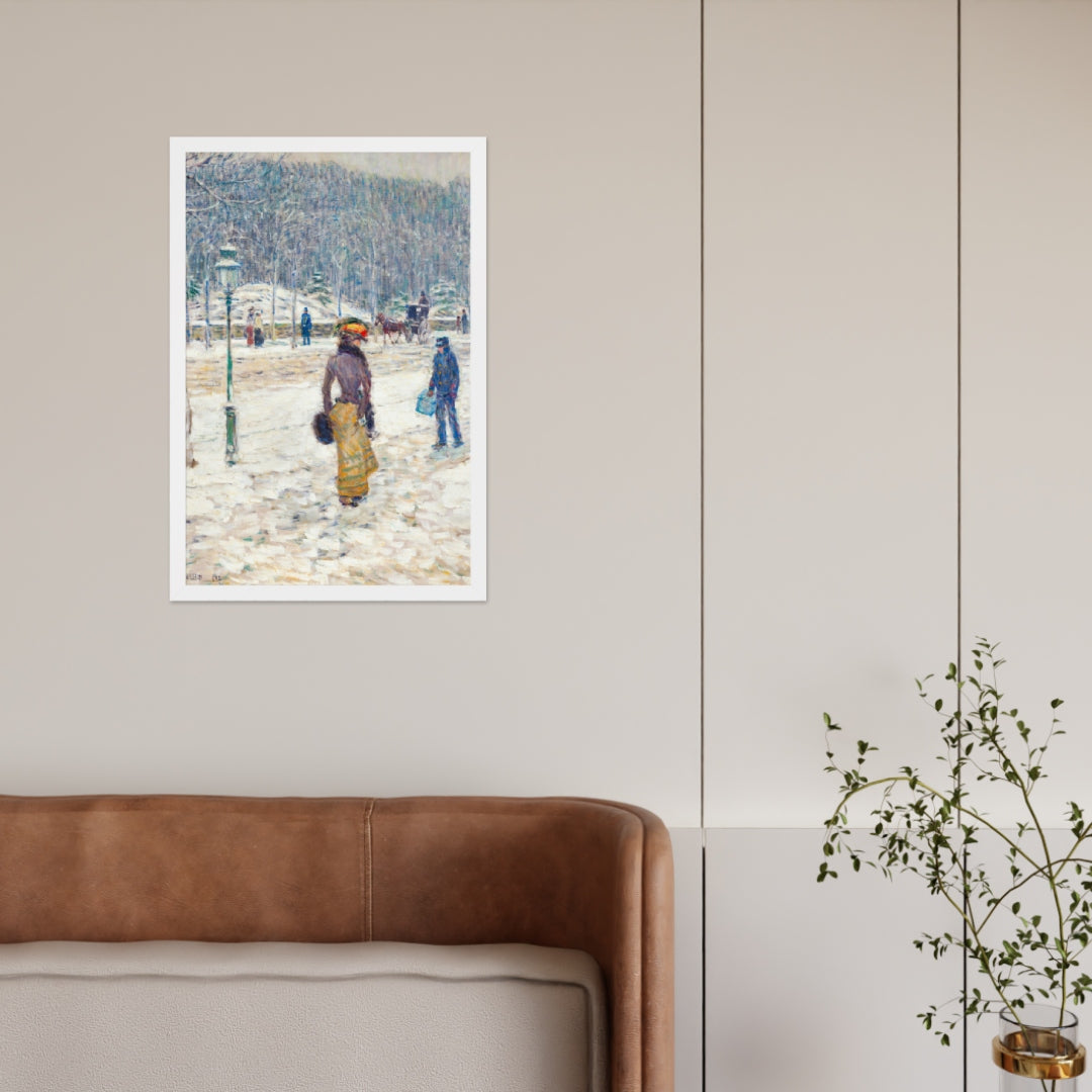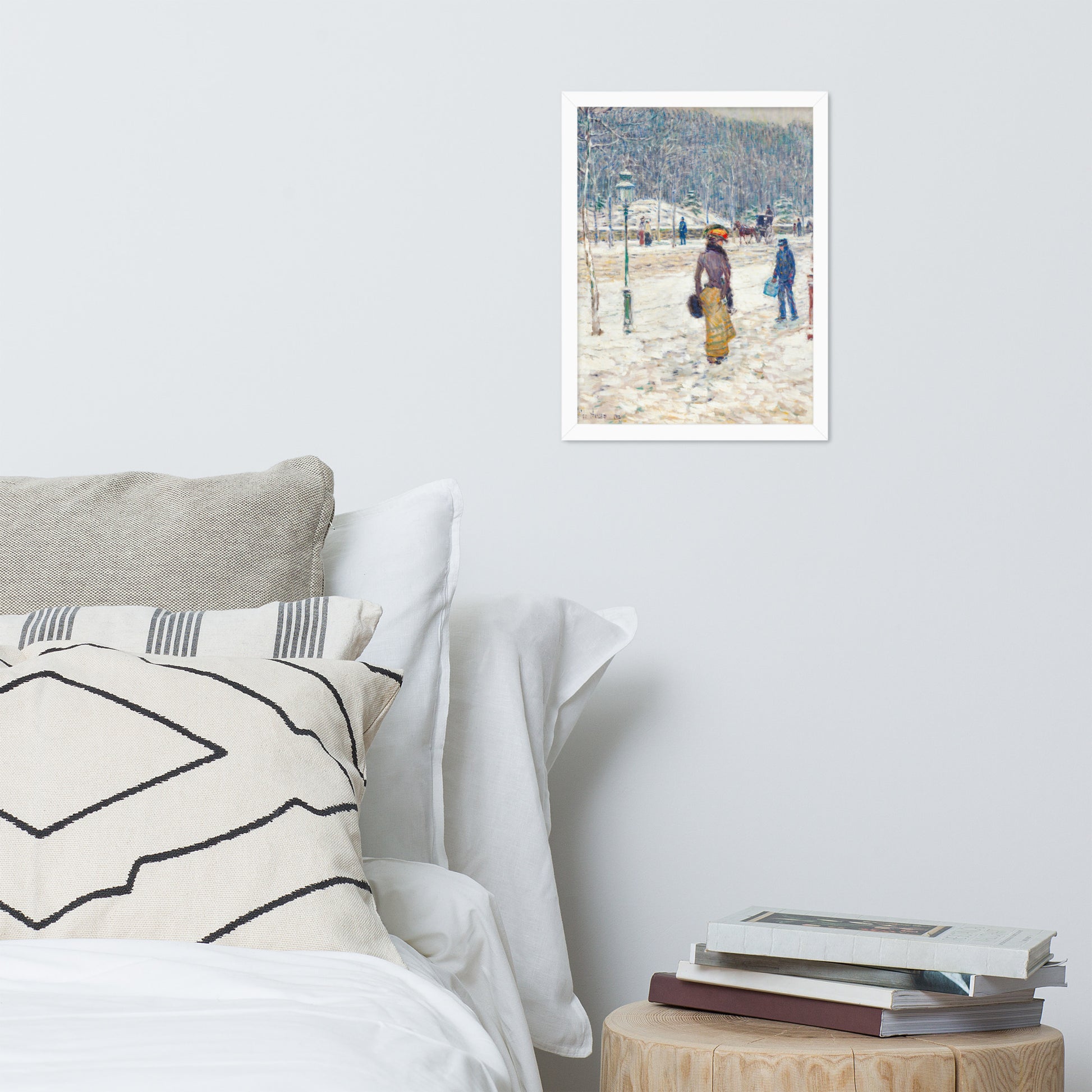 Step into the serene elegance of a snow-covered boulevard with New York Street by Frederick Childe Hassam, a masterwork of American Impressionism. This framed wall print captures the quiet poetry of winter in 1895 Manhattan, where horse-drawn carriages glide past bundled figures and bare trees shimmer under a muted sky. Hassam’s impressionist brushwork evokes movement and mood, blending soft textures with atmospheric light to create a timeless urban vignette.