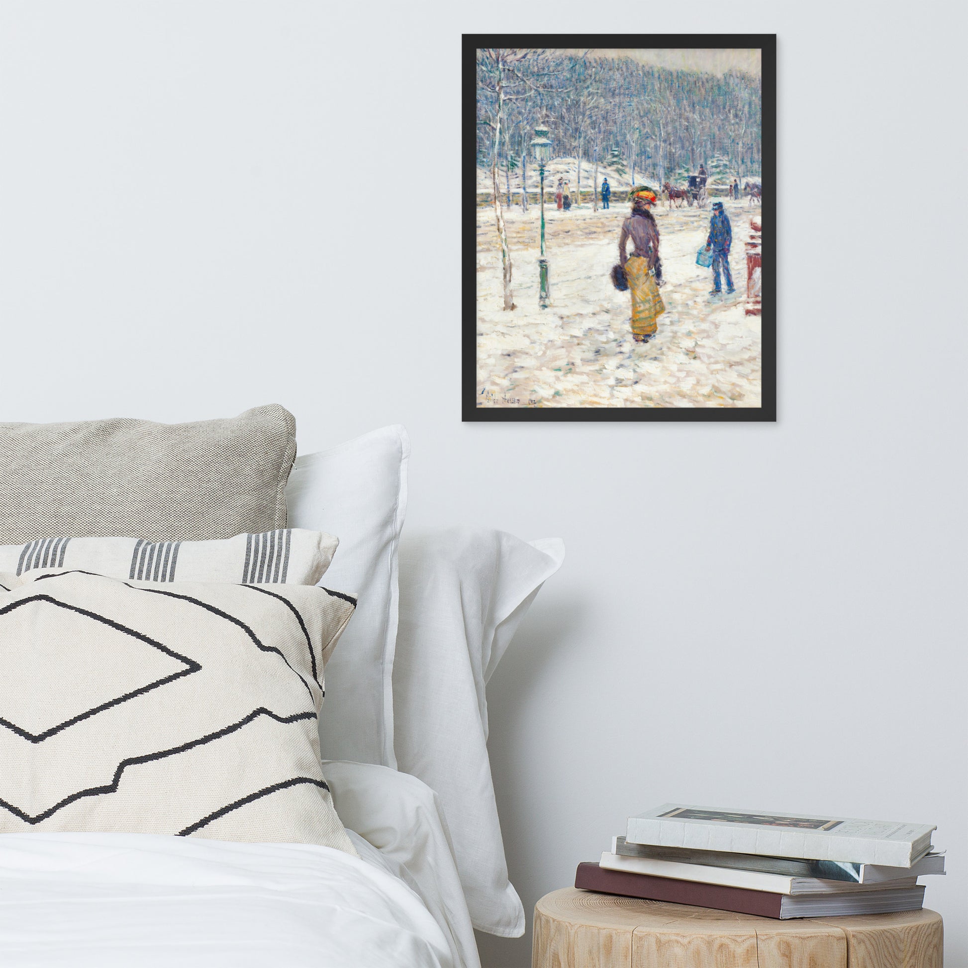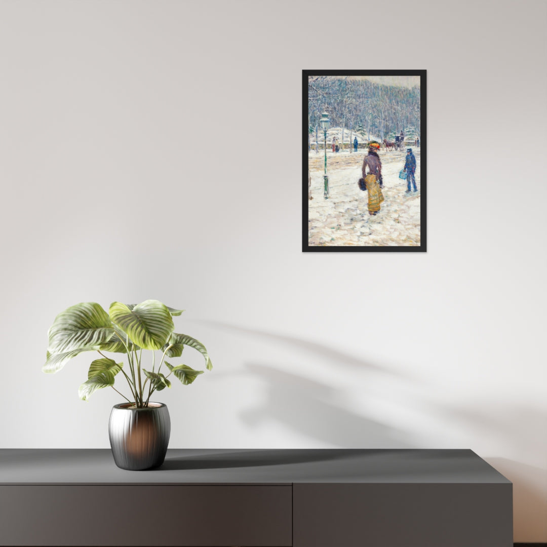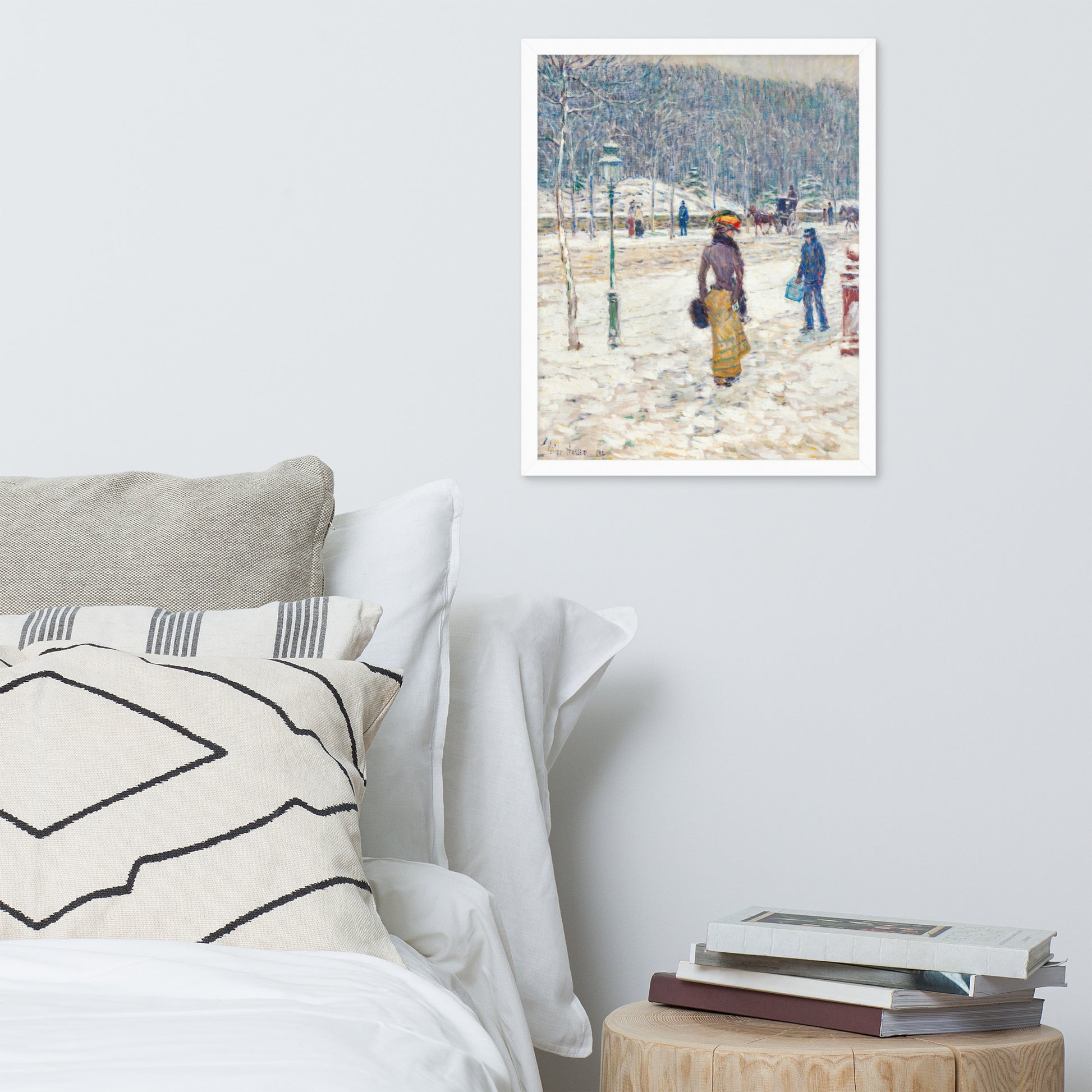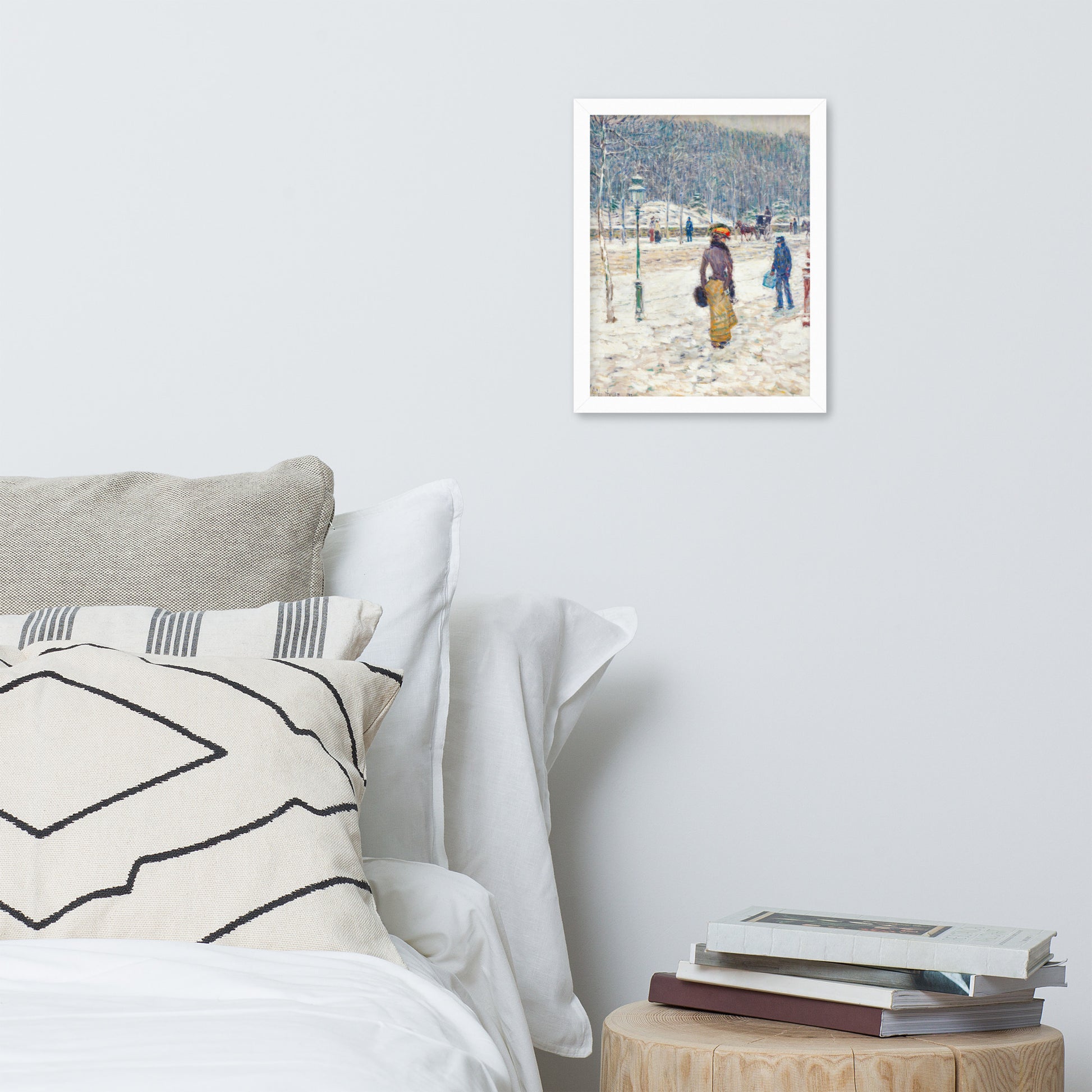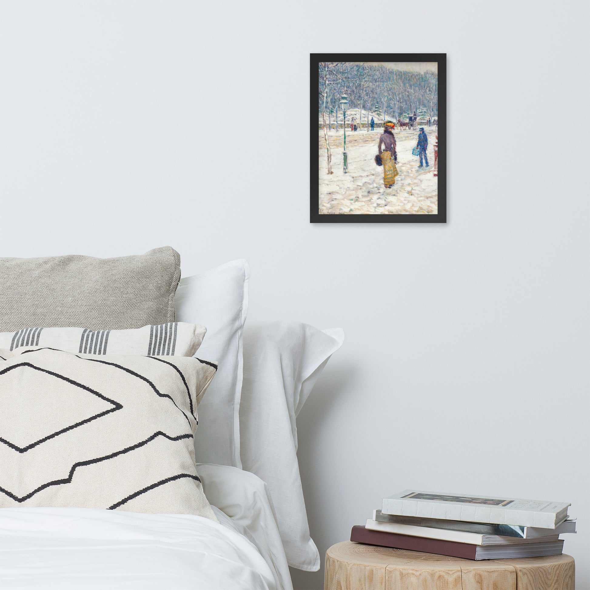 Step into the serene elegance of a snow-covered boulevard with New York Street by Frederick Childe Hassam, a masterwork of American Impressionism. This framed wall print captures the quiet poetry of winter in 1895 Manhattan, where horse-drawn carriages glide past bundled figures and bare trees shimmer under a muted sky. Hassam’s impressionist brushwork evokes movement and mood, blending soft textures with atmospheric light to create a timeless urban vignette.