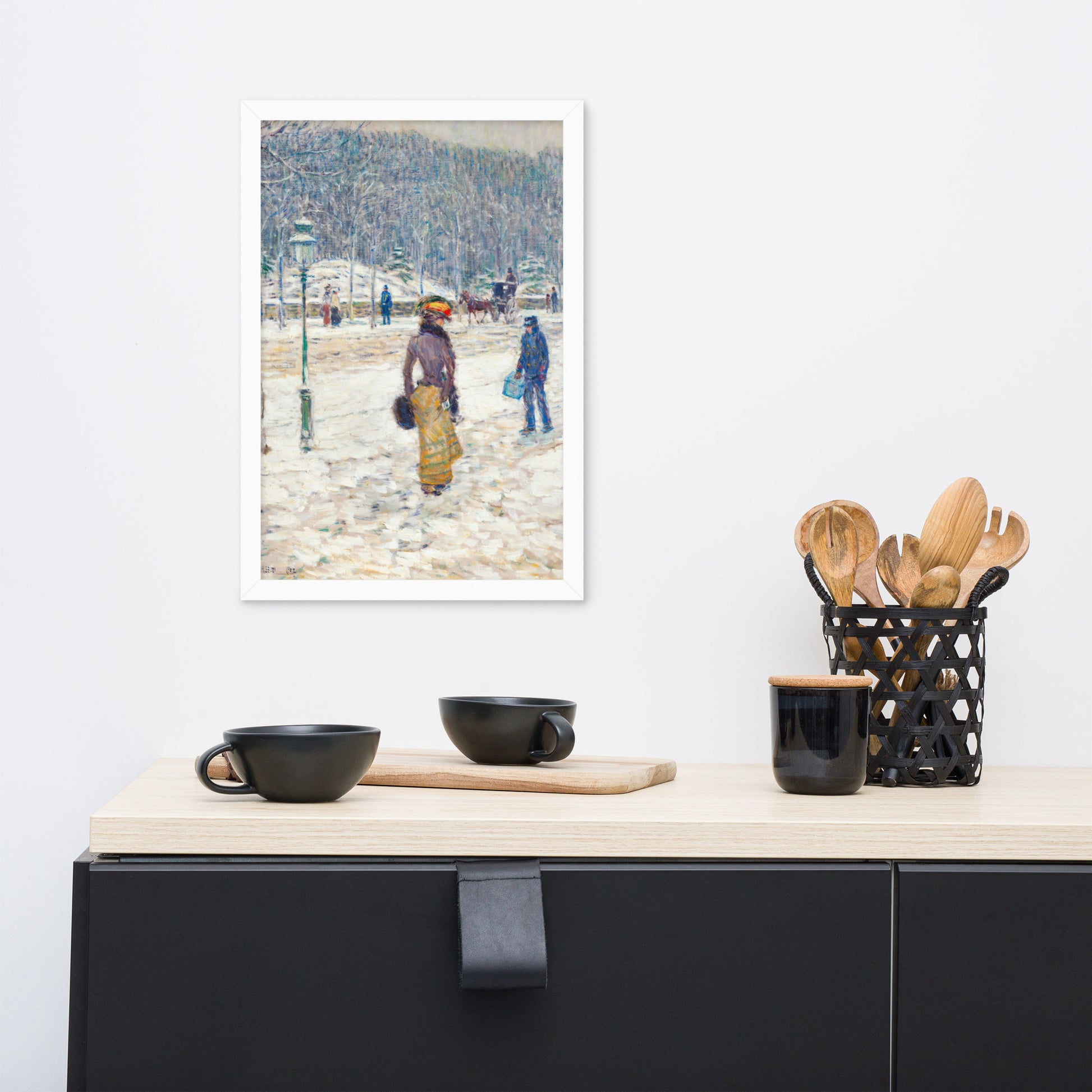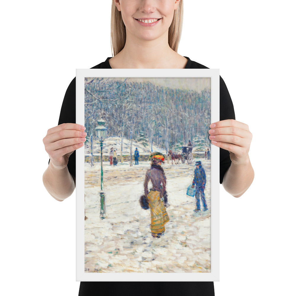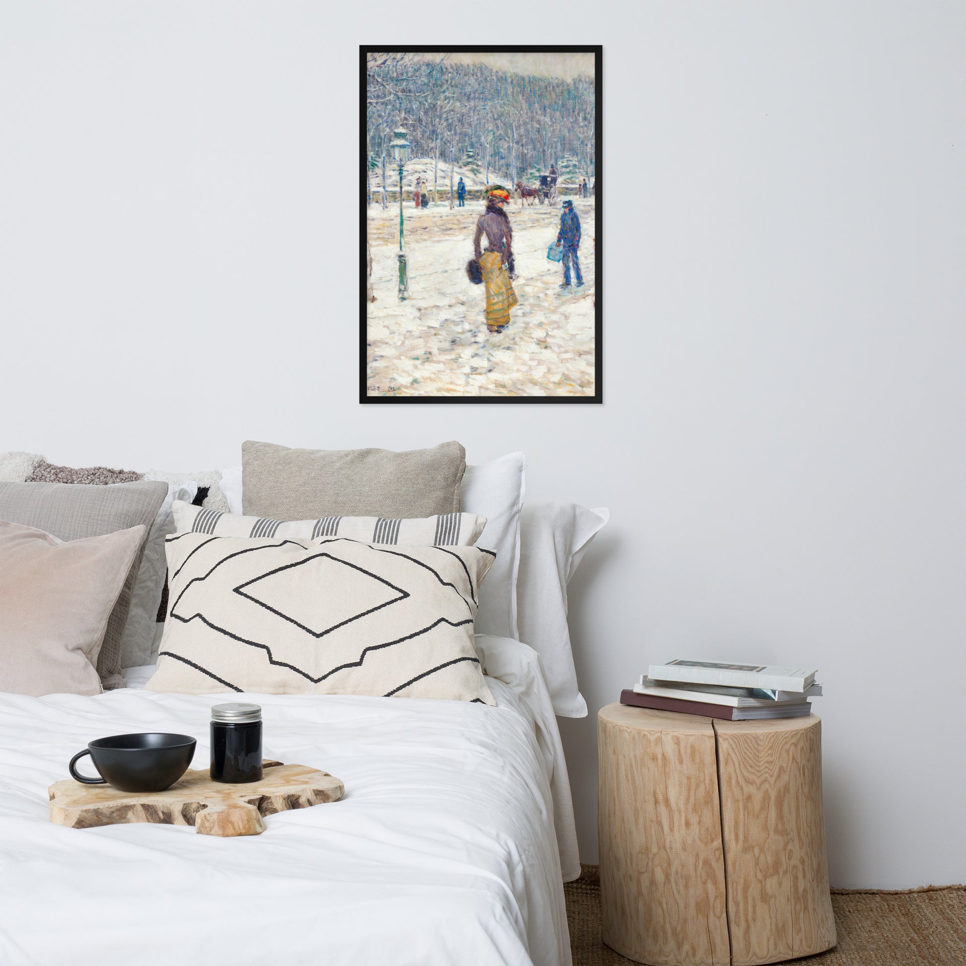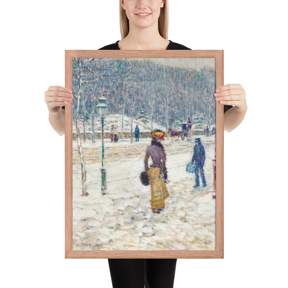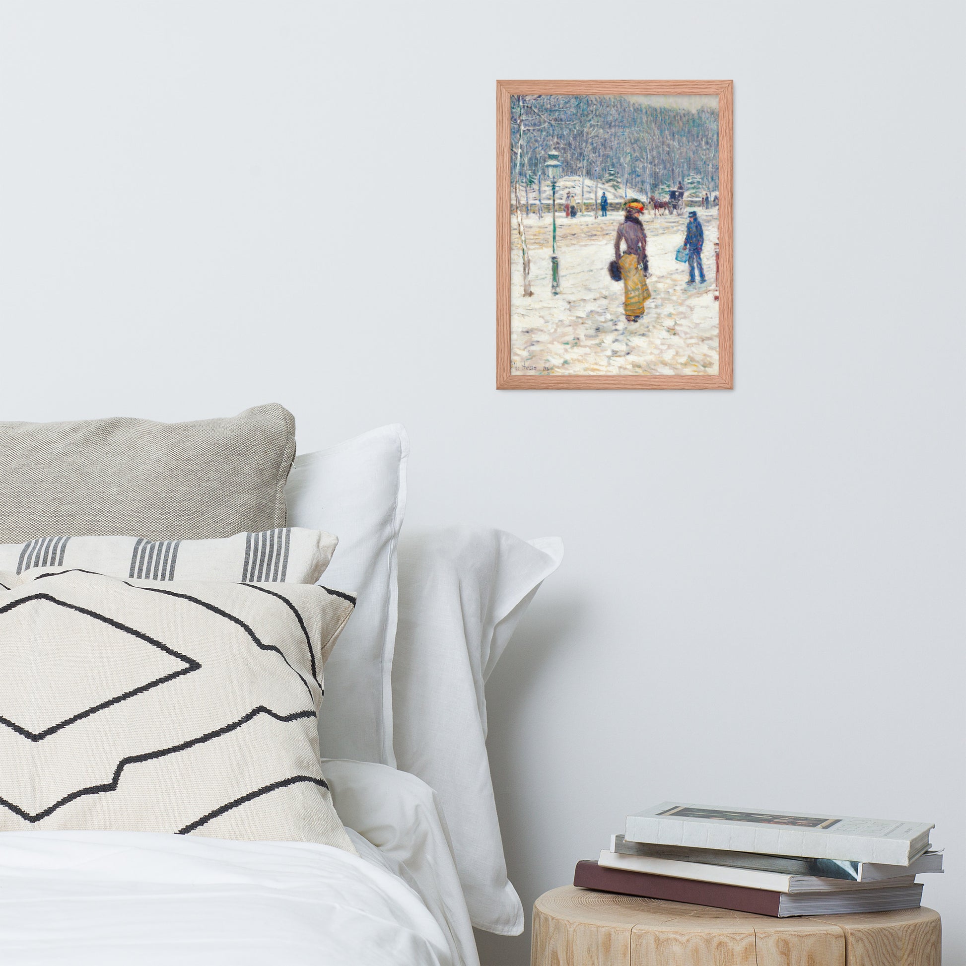Step into the serene elegance of a snow-covered boulevard with New York Street by Frederick Childe Hassam, a masterwork of American Impressionism. This framed wall print captures the quiet poetry of winter in 1895 Manhattan, where horse-drawn carriages glide past bundled figures and bare trees shimmer under a muted sky. Hassam’s impressionist brushwork evokes movement and mood, blending soft textures with atmospheric light to create a timeless urban vignette.
