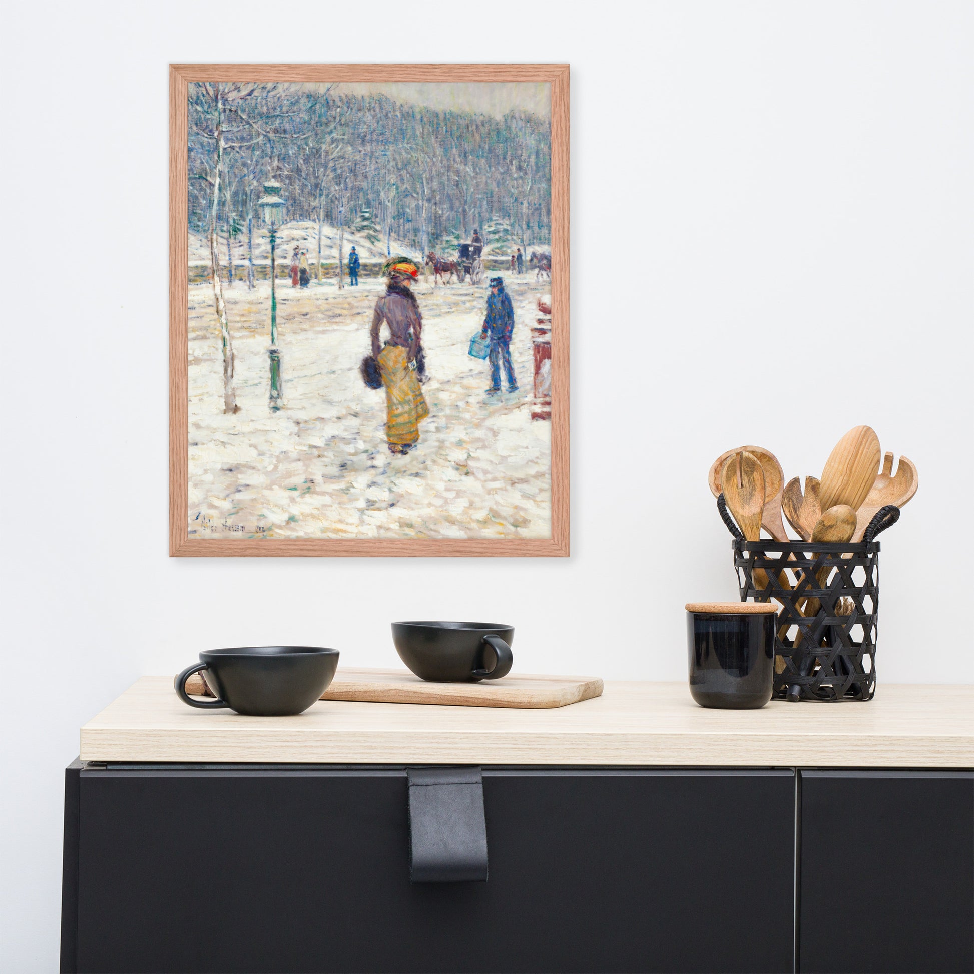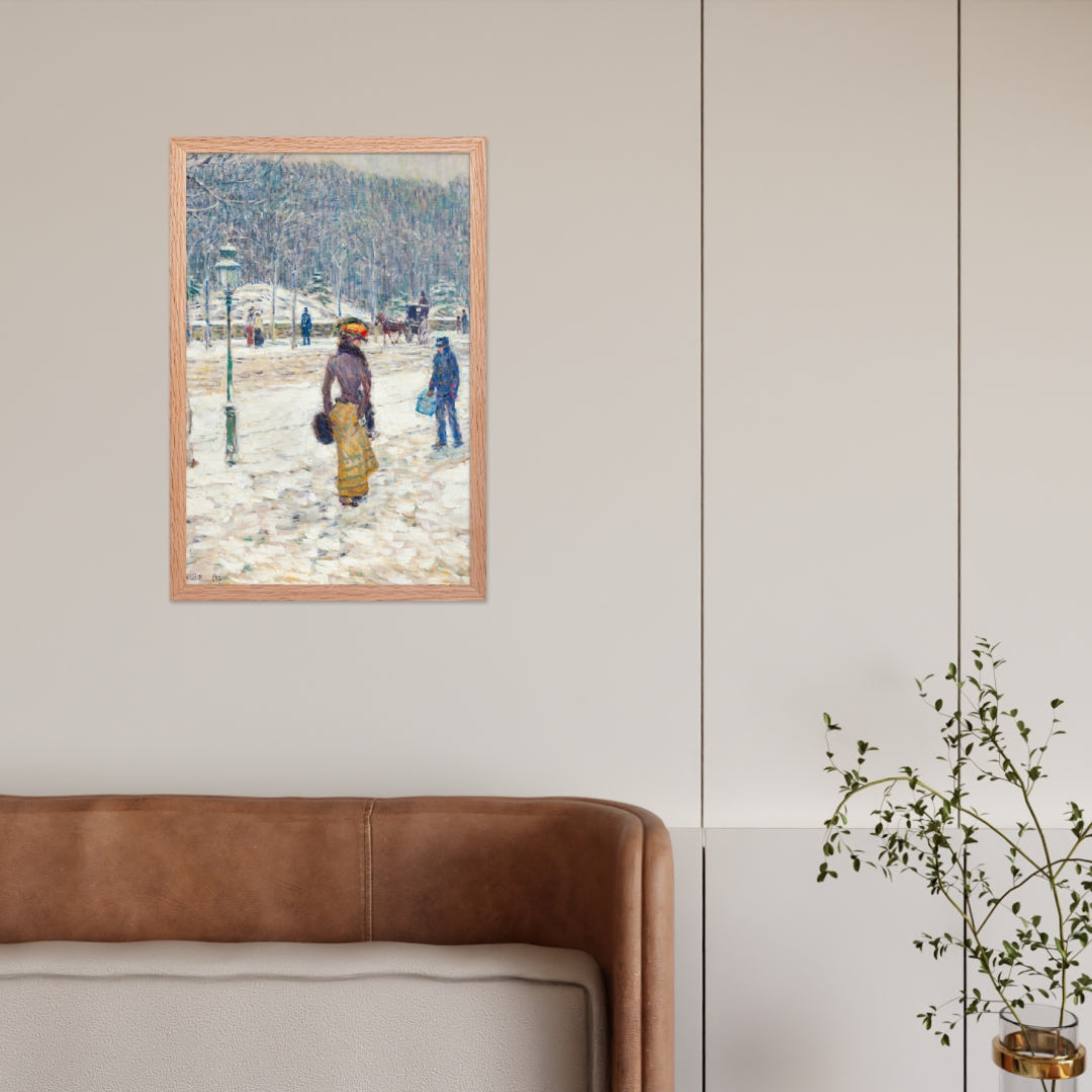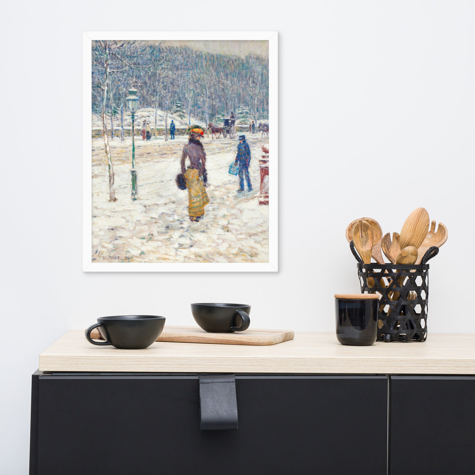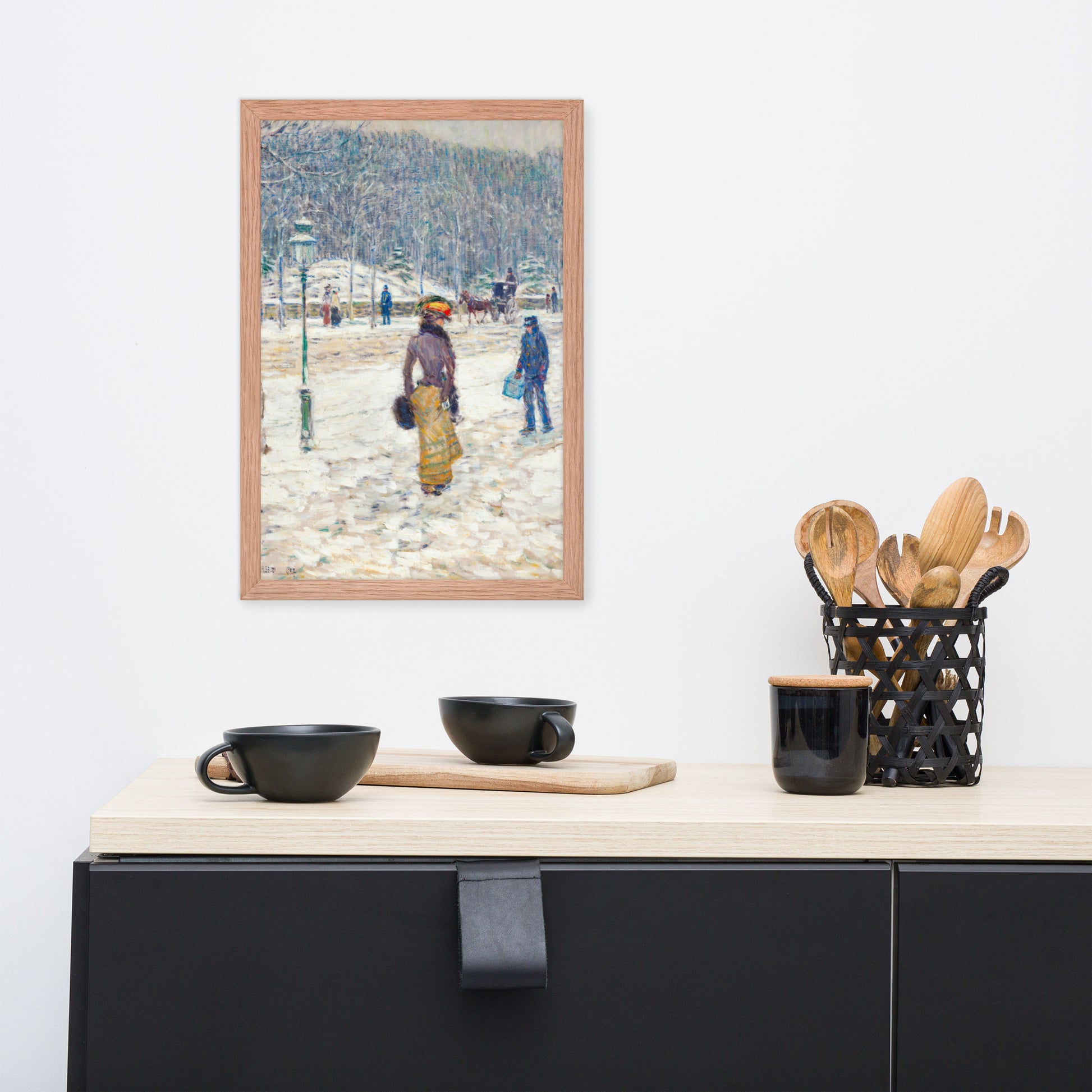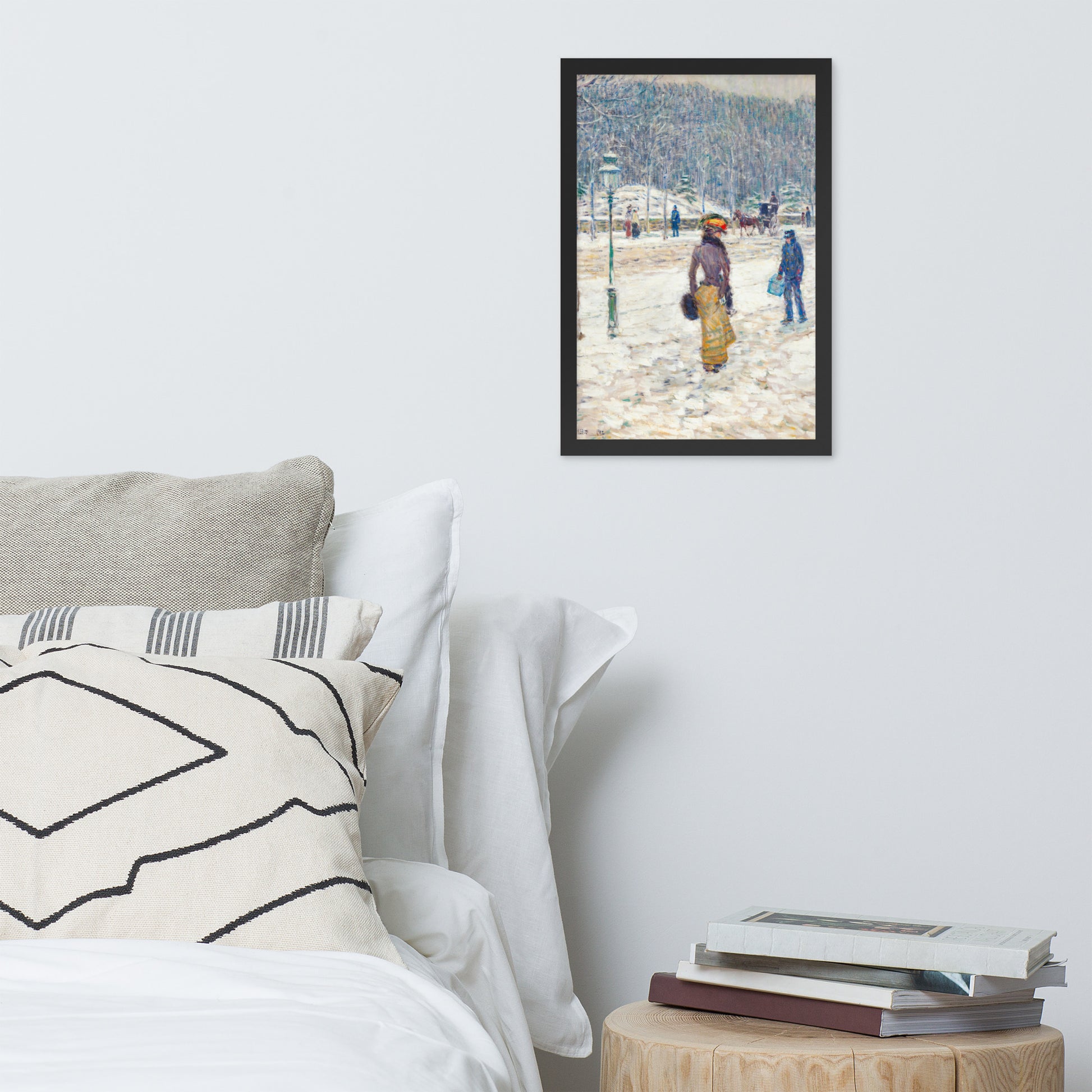 Step into the serene elegance of a snow-covered boulevard with New York Street by Frederick Childe Hassam, a masterwork of American Impressionism. This framed wall print captures the quiet poetry of winter in 1895 Manhattan, where horse-drawn carriages glide past bundled figures and bare trees shimmer under a muted sky. Hassam’s impressionist brushwork evokes movement and mood, blending soft textures with atmospheric light to create a timeless urban vignette.