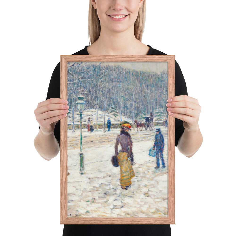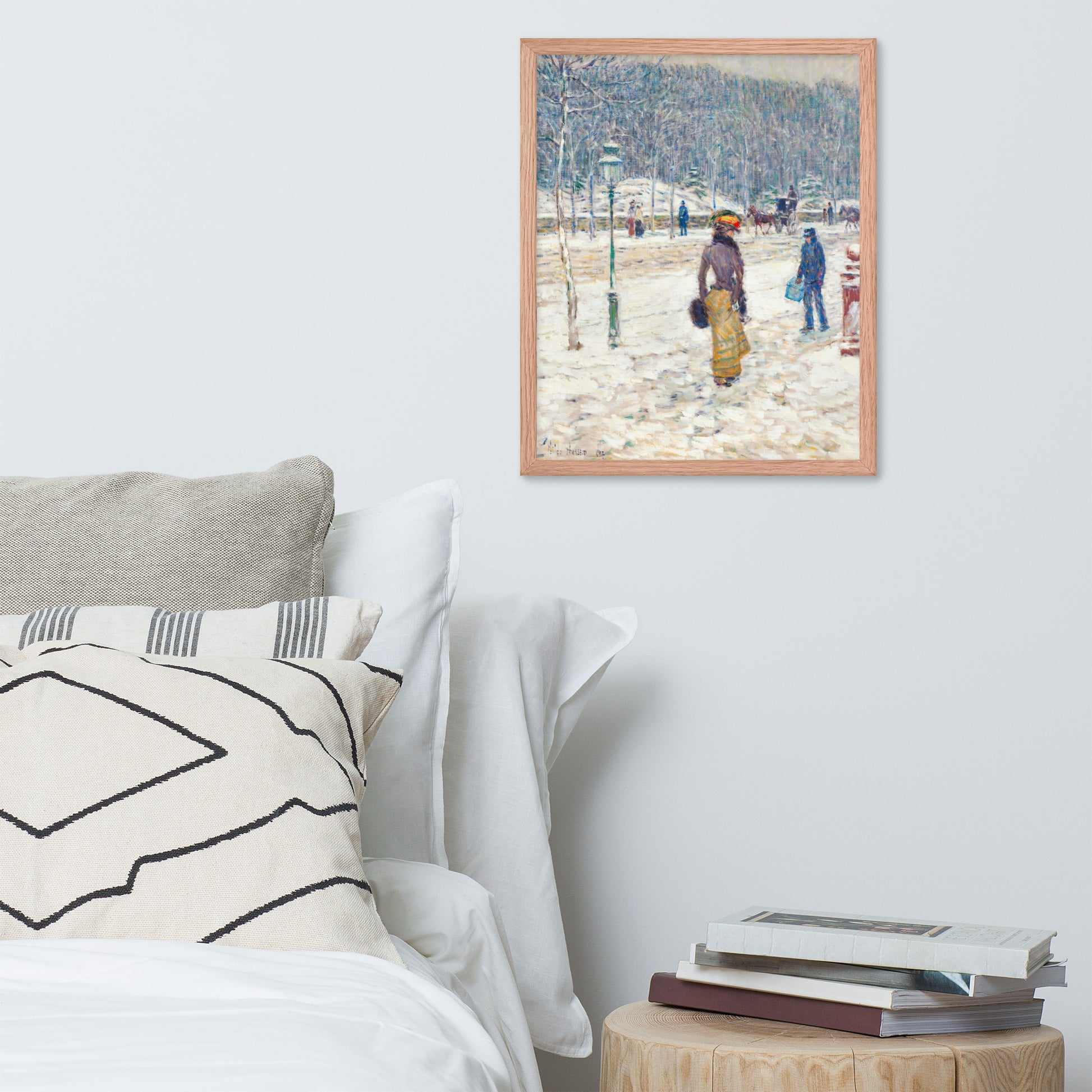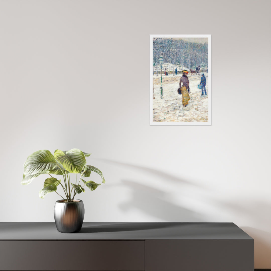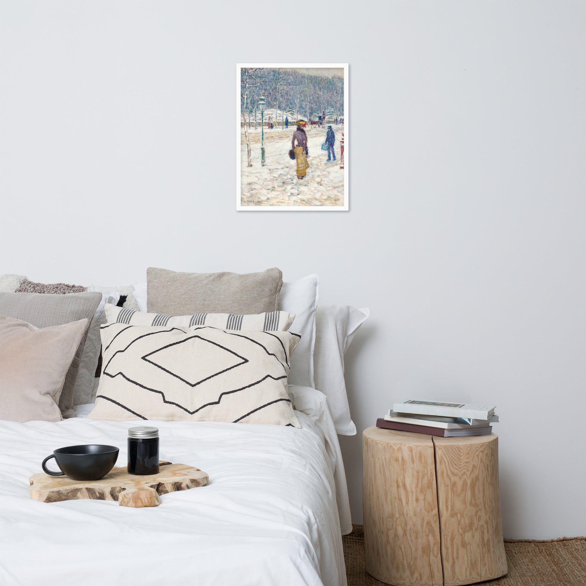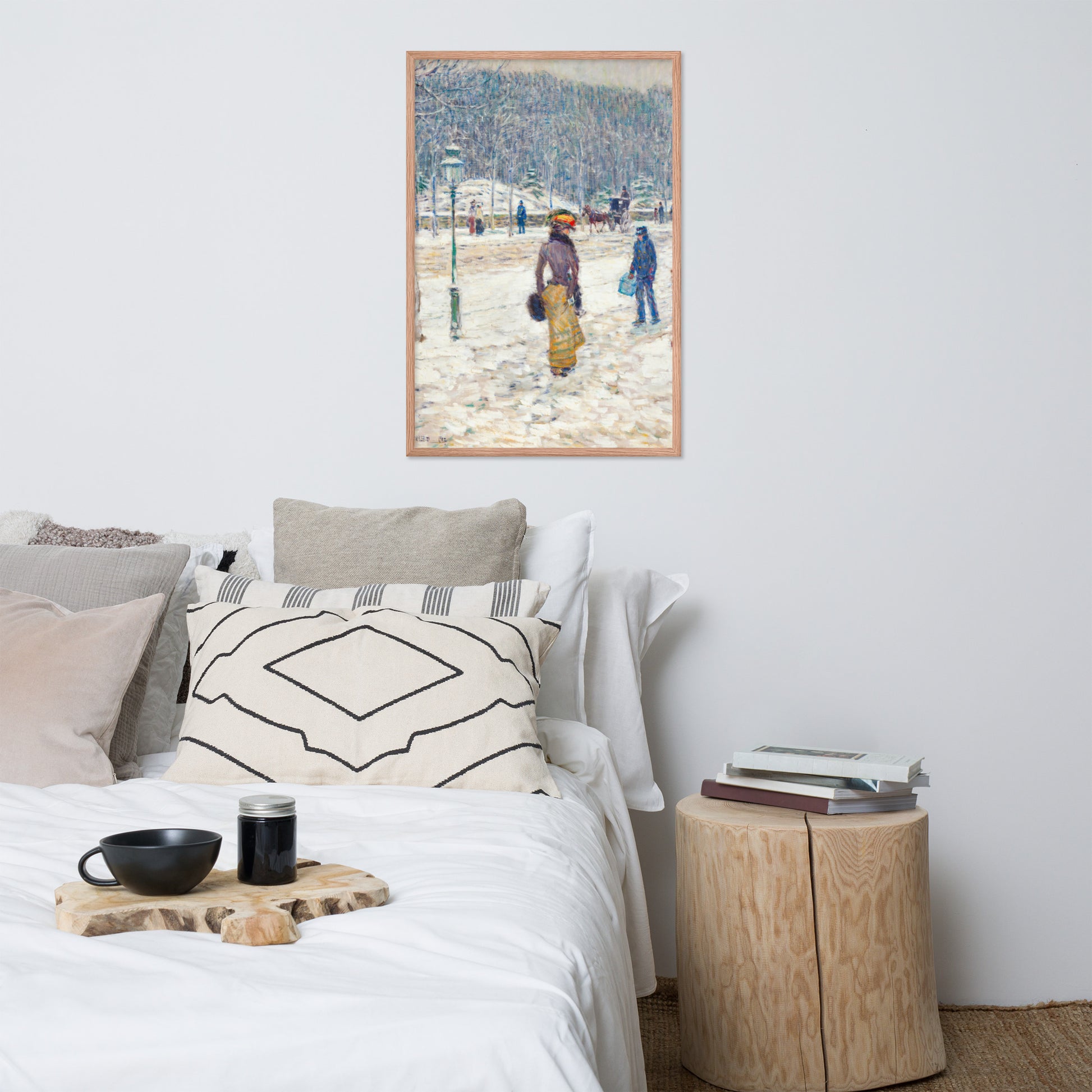 Step into the serene elegance of a snow-covered boulevard with New York Street by Frederick Childe Hassam, a masterwork of American Impressionism. This framed wall print captures the quiet poetry of winter in 1895 Manhattan, where horse-drawn carriages glide past bundled figures and bare trees shimmer under a muted sky. Hassam’s impressionist brushwork evokes movement and mood, blending soft textures with atmospheric light to create a timeless urban vignette.