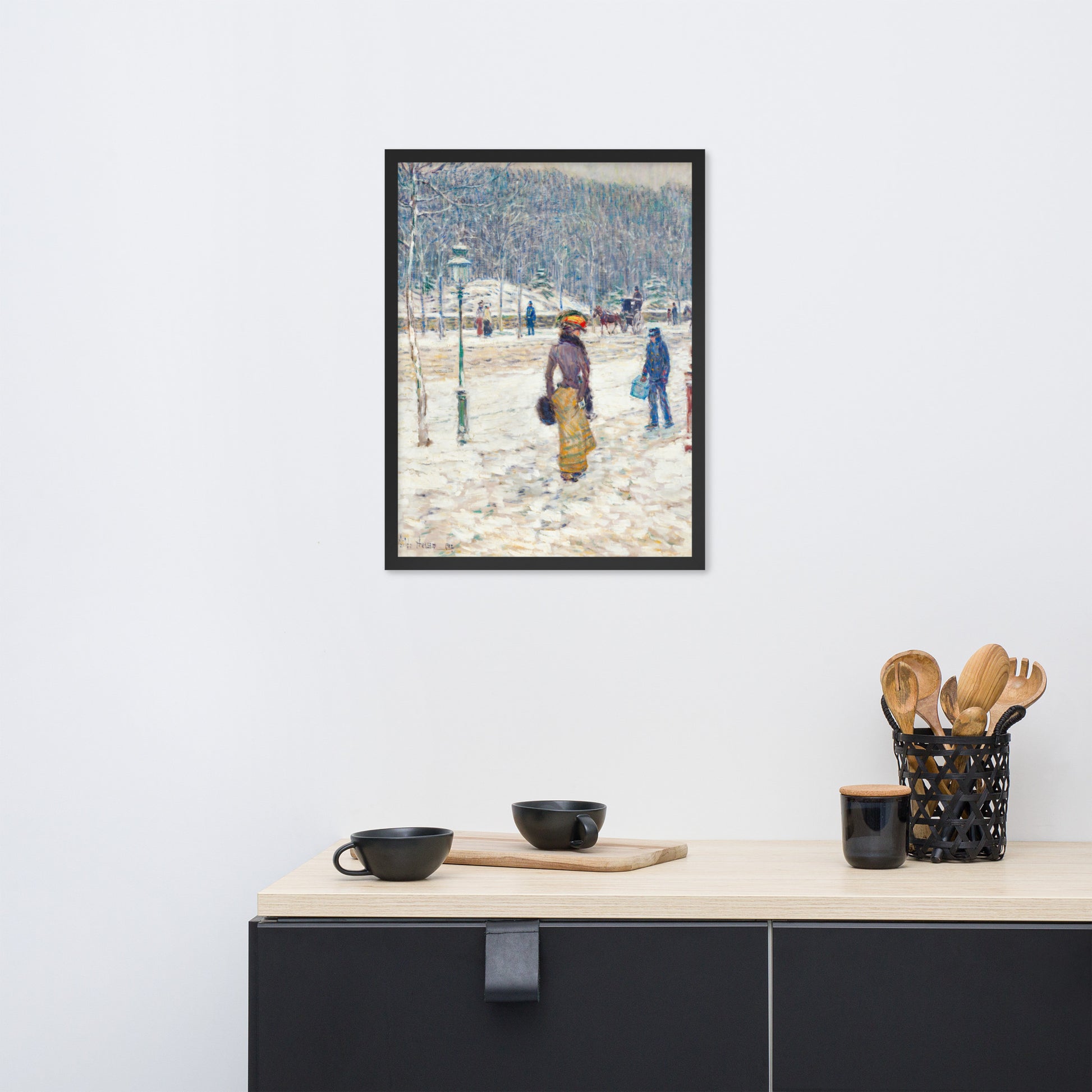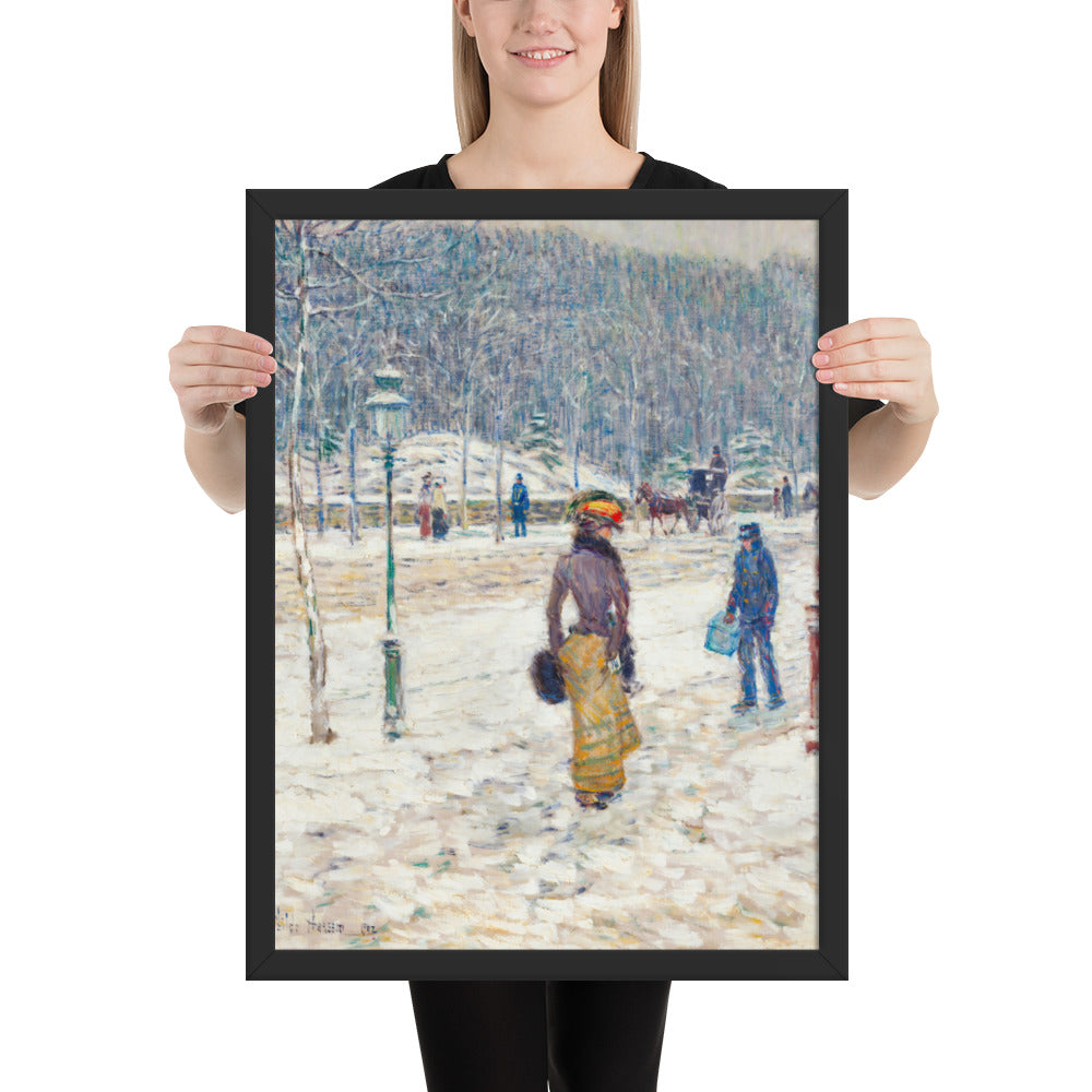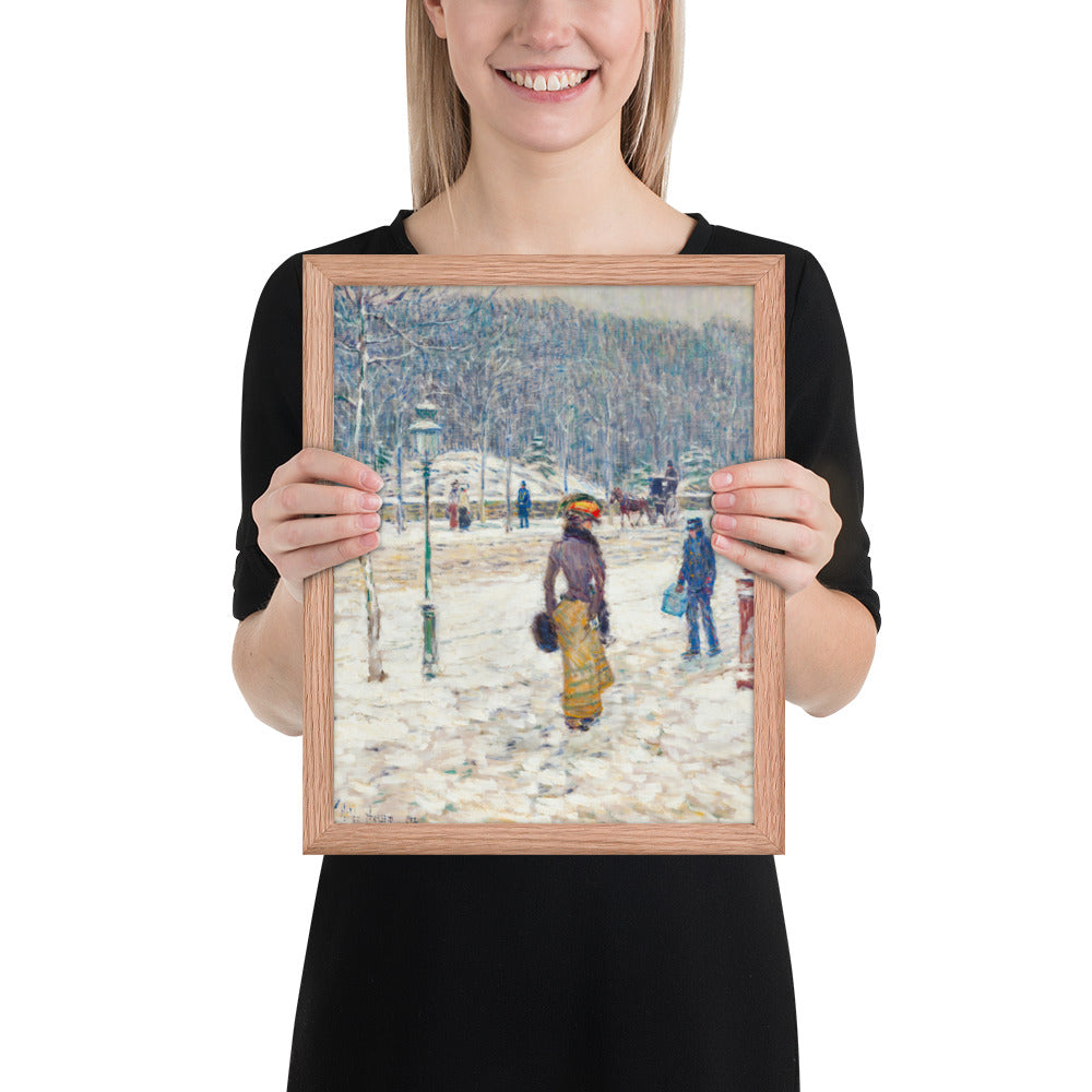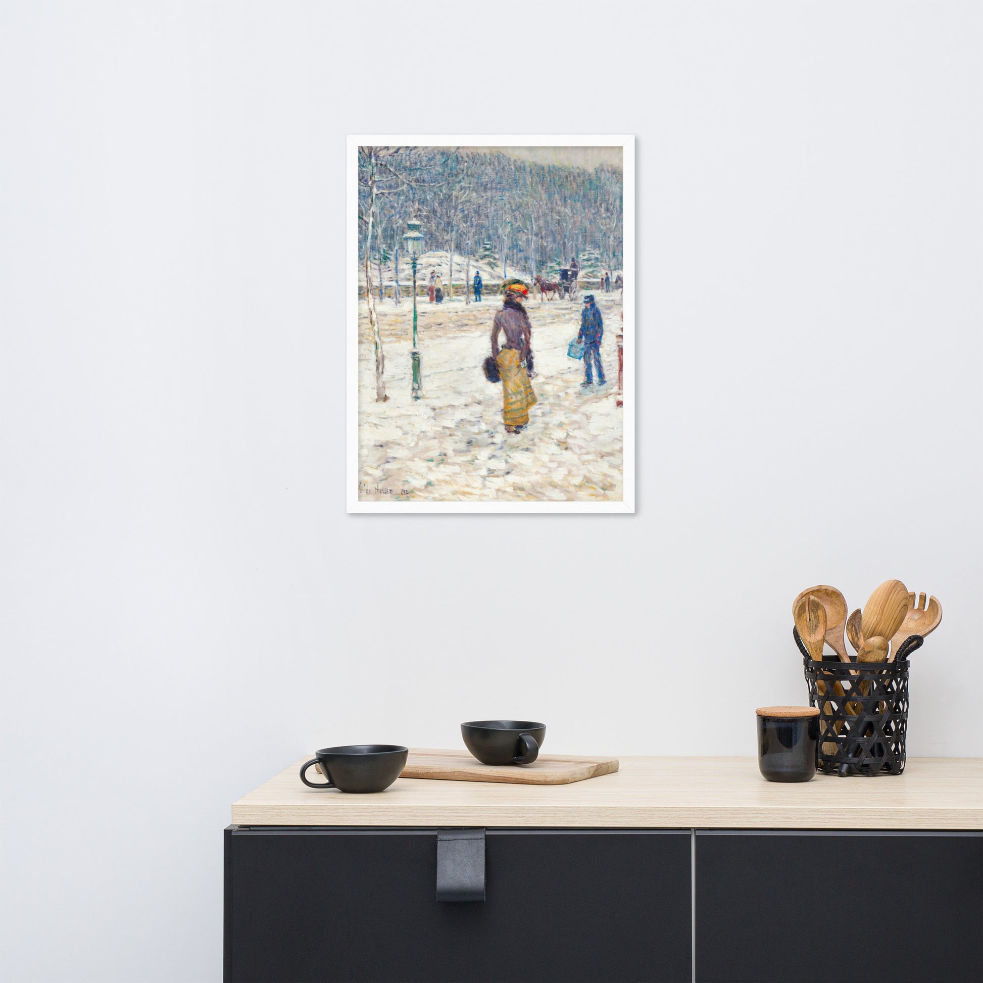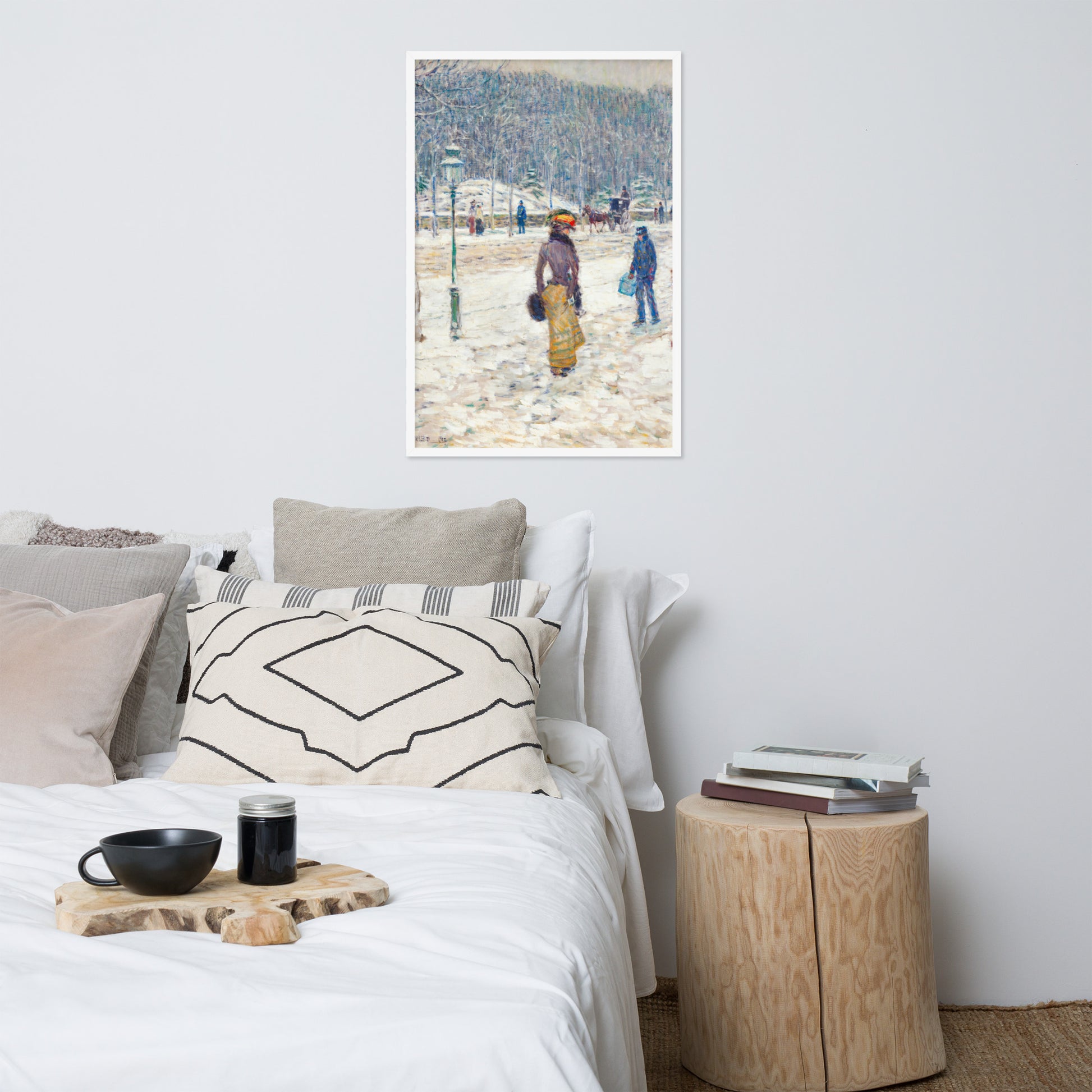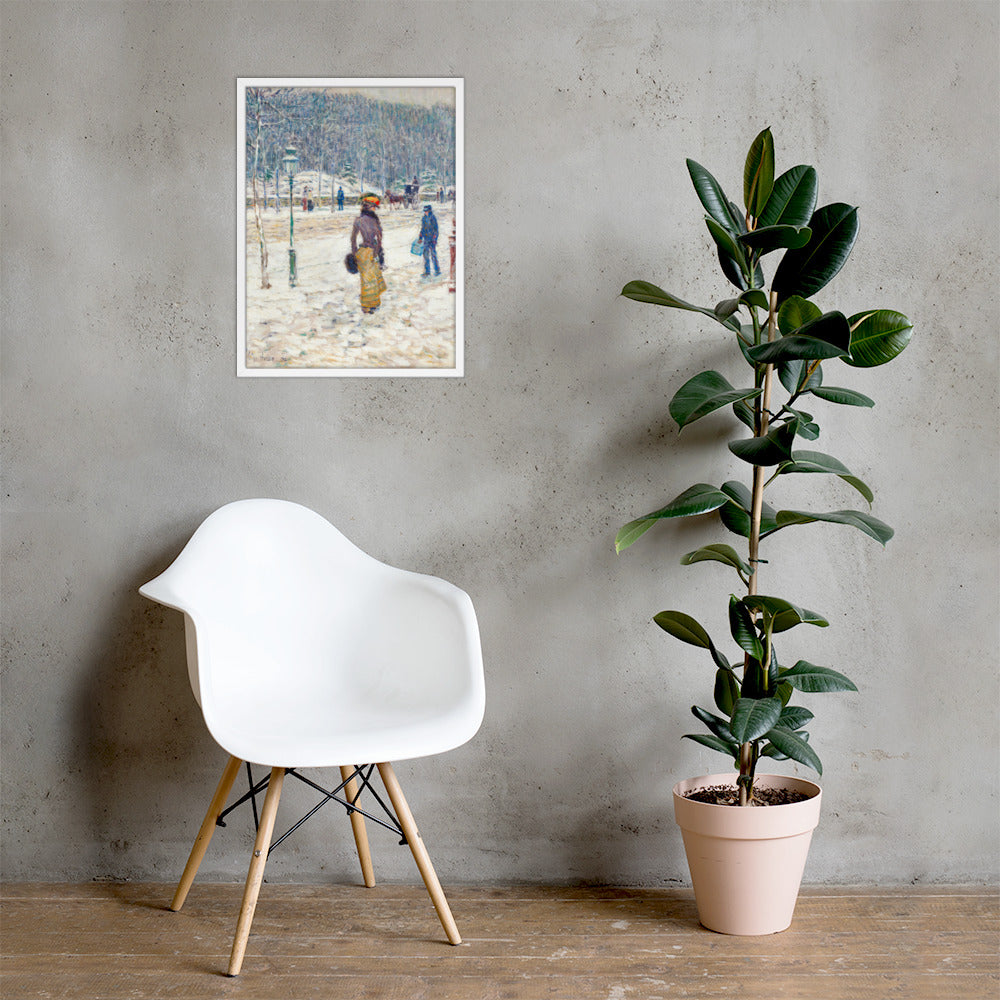 Step into the serene elegance of a snow-covered boulevard with New York Street by Frederick Childe Hassam, a masterwork of American Impressionism. This framed wall print captures the quiet poetry of winter in 1895 Manhattan, where horse-drawn carriages glide past bundled figures and bare trees shimmer under a muted sky. Hassam’s impressionist brushwork evokes movement and mood, blending soft textures with atmospheric light to create a timeless urban vignette.