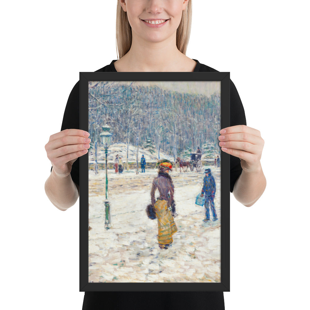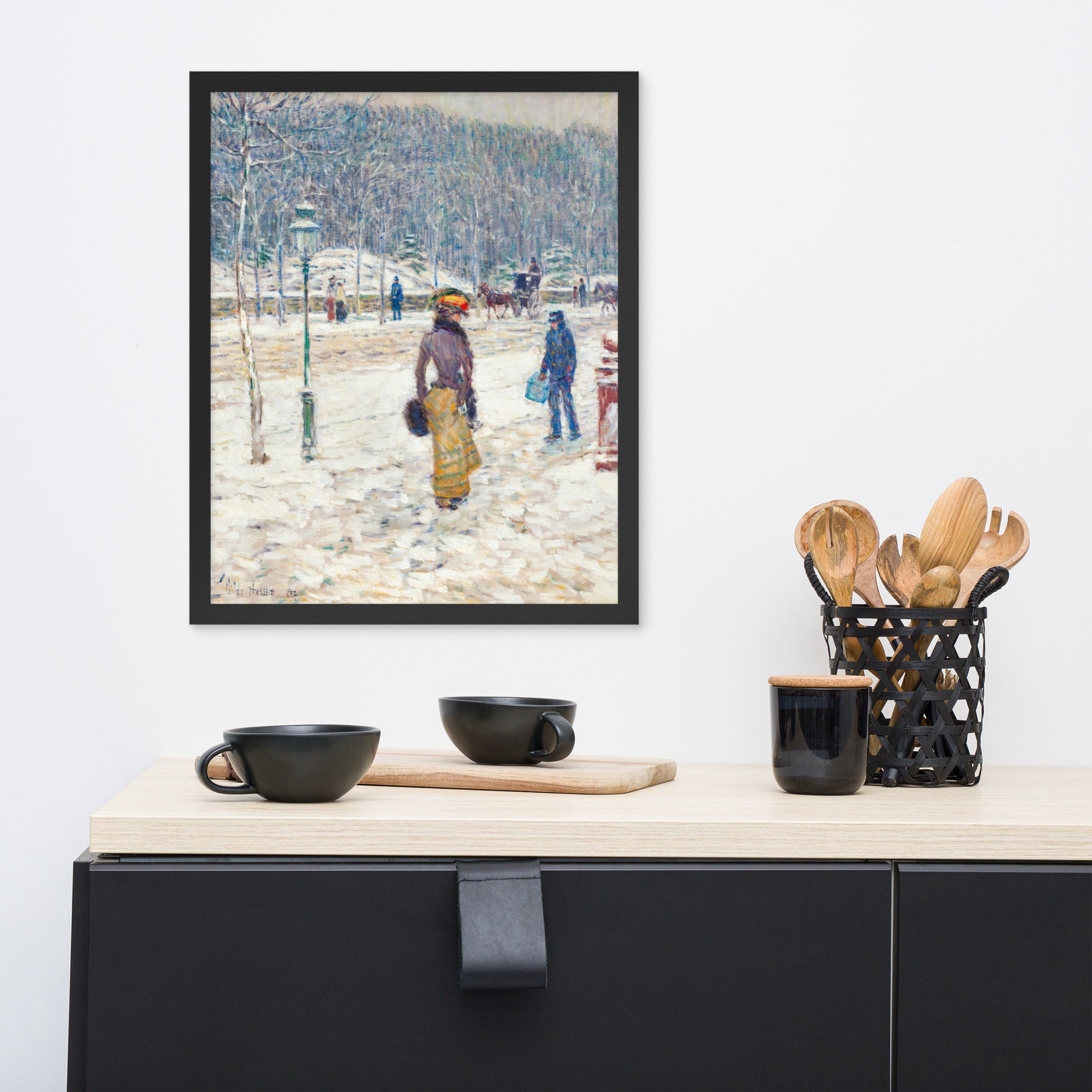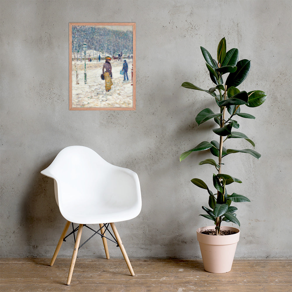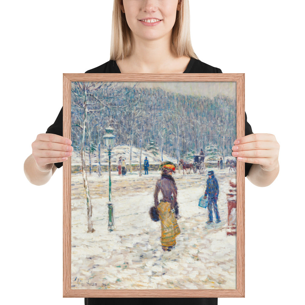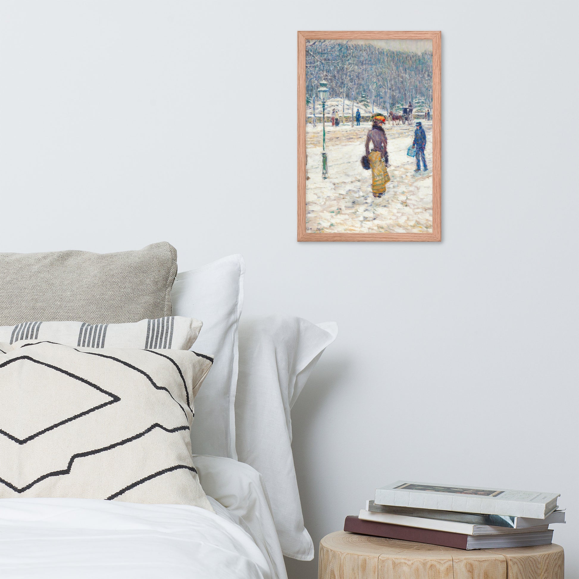 Step into the serene elegance of a snow-covered boulevard with New York Street by Frederick Childe Hassam, a masterwork of American Impressionism. This framed wall print captures the quiet poetry of winter in 1895 Manhattan, where horse-drawn carriages glide past bundled figures and bare trees shimmer under a muted sky. Hassam’s impressionist brushwork evokes movement and mood, blending soft textures with atmospheric light to create a timeless urban vignette.