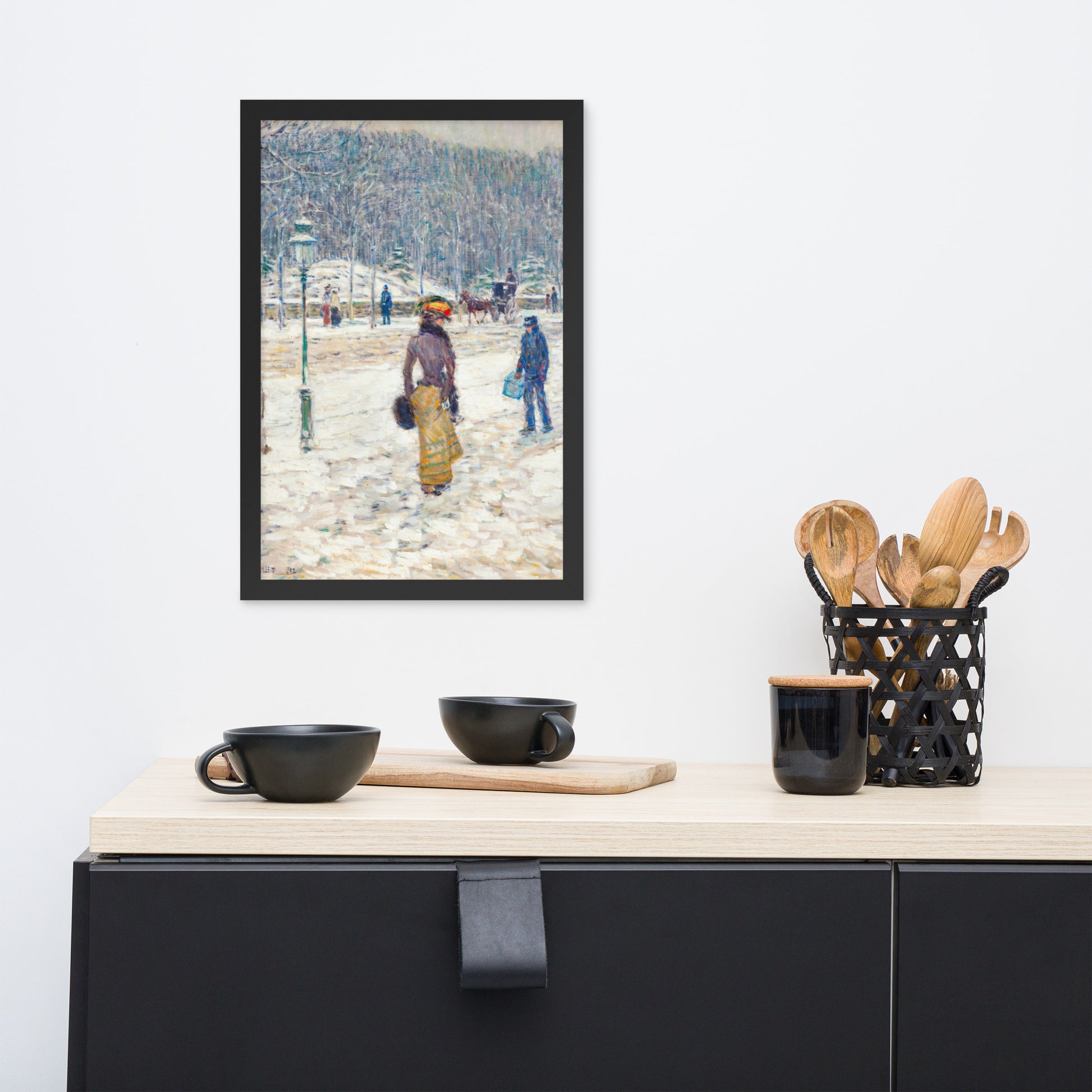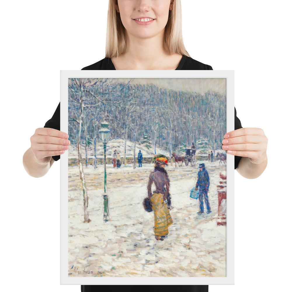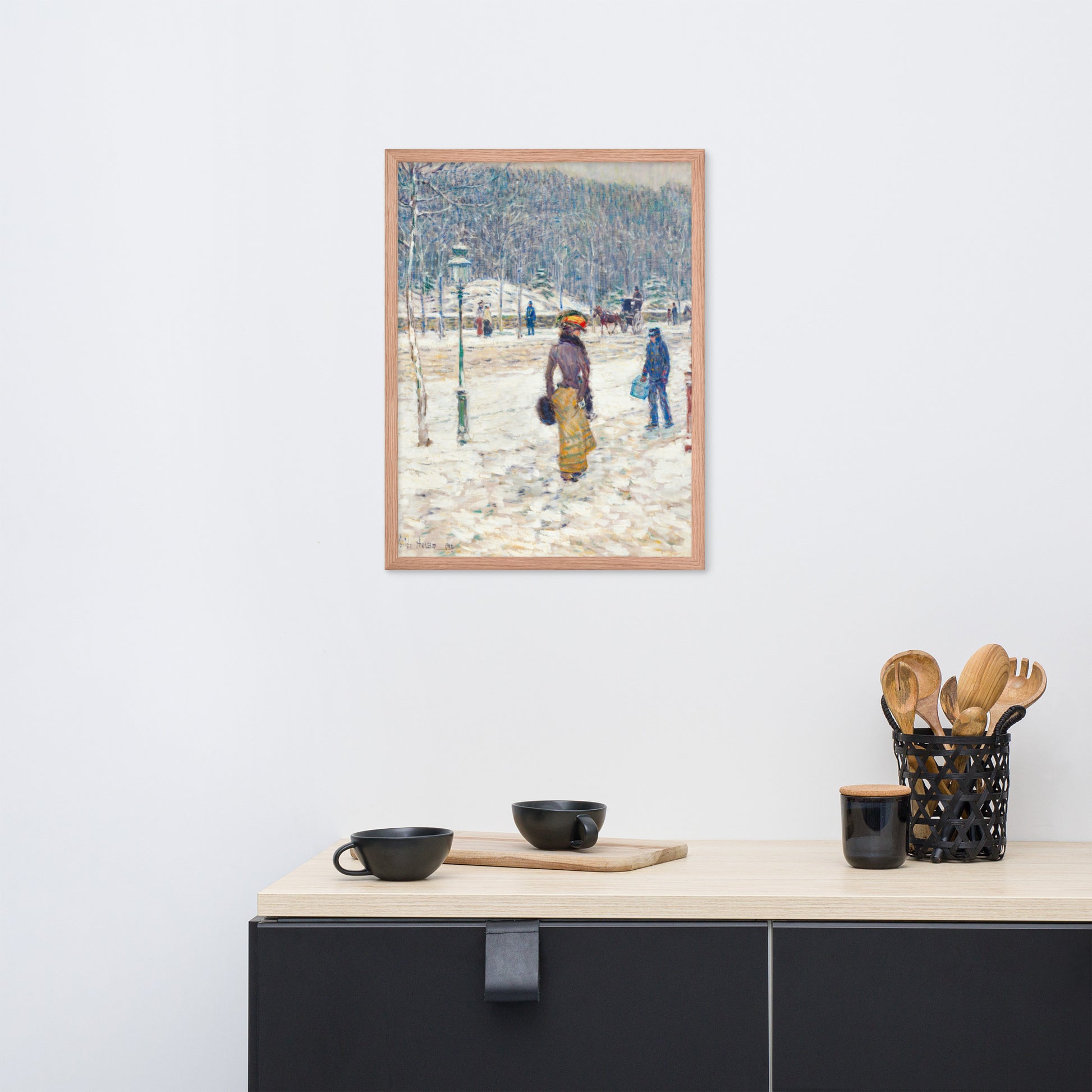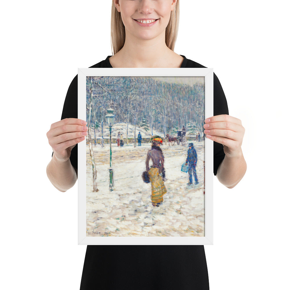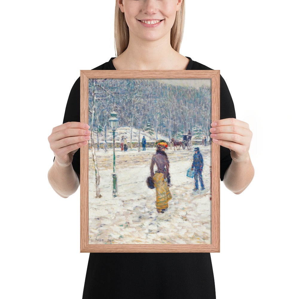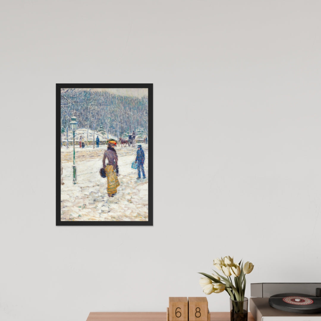Step into the serene elegance of a snow-covered boulevard with New York Street by Frederick Childe Hassam, a masterwork of American Impressionism. This framed wall print captures the quiet poetry of winter in 1895 Manhattan, where horse-drawn carriages glide past bundled figures and bare trees shimmer under a muted sky. Hassam’s impressionist brushwork evokes movement and mood, blending soft textures with atmospheric light to create a timeless urban vignette.