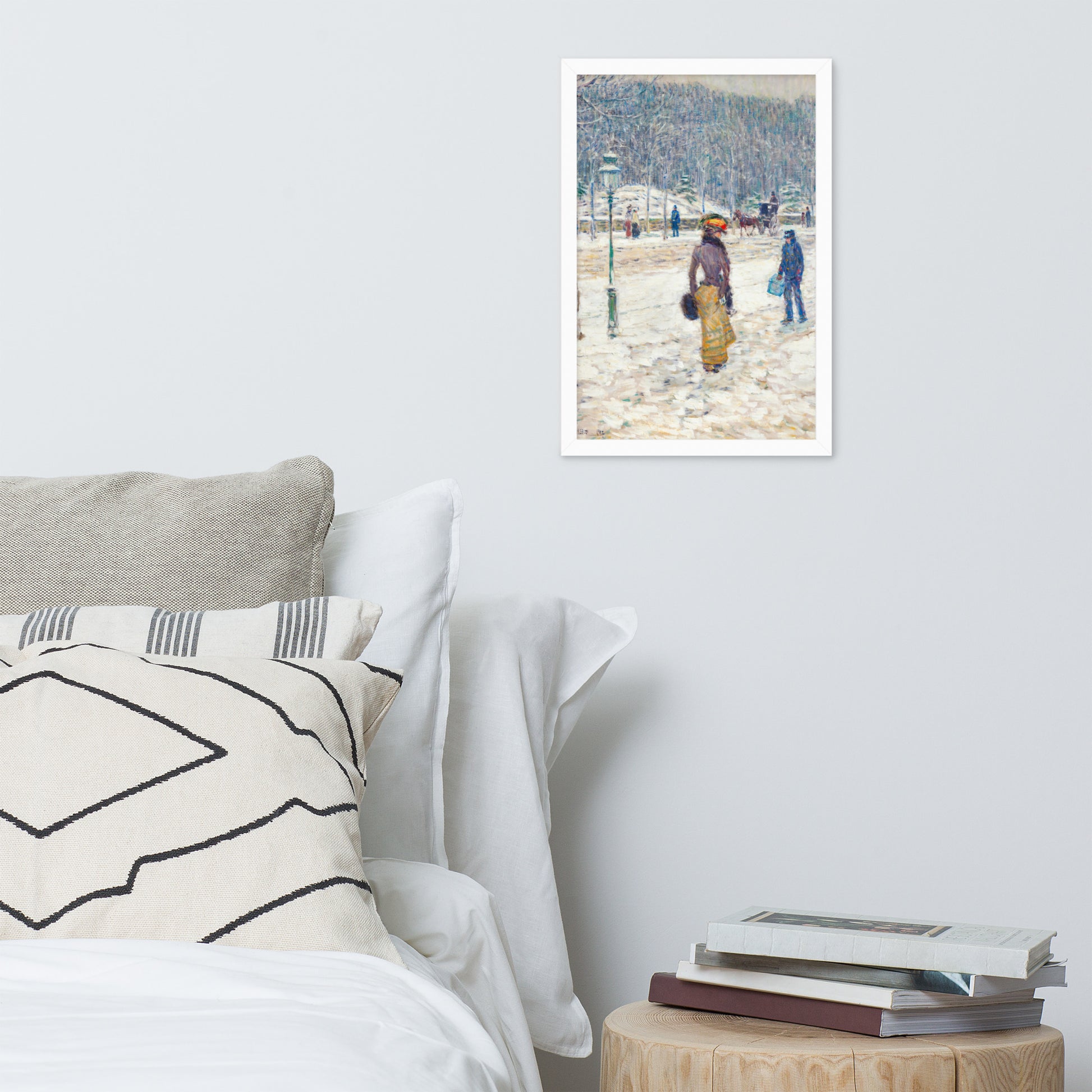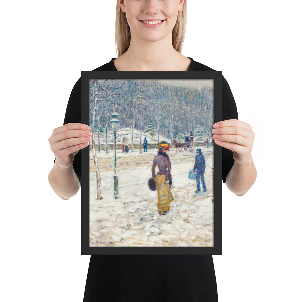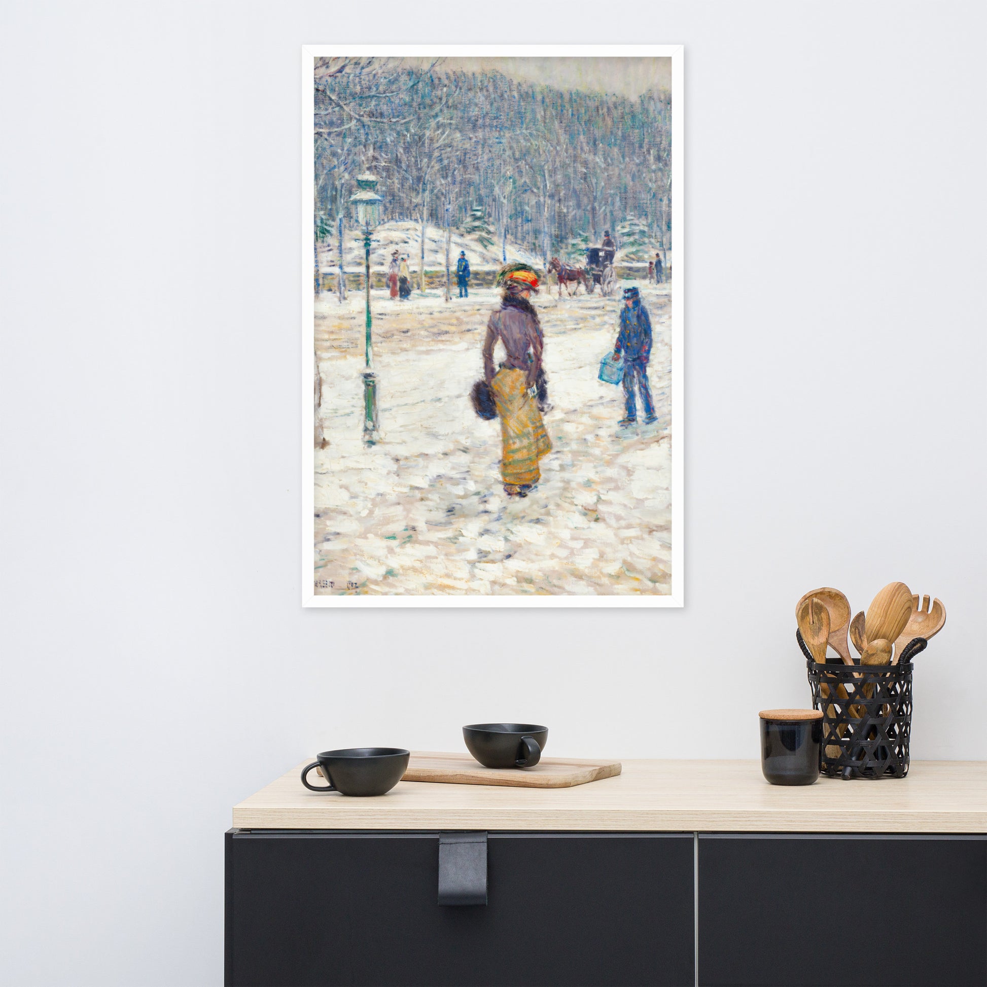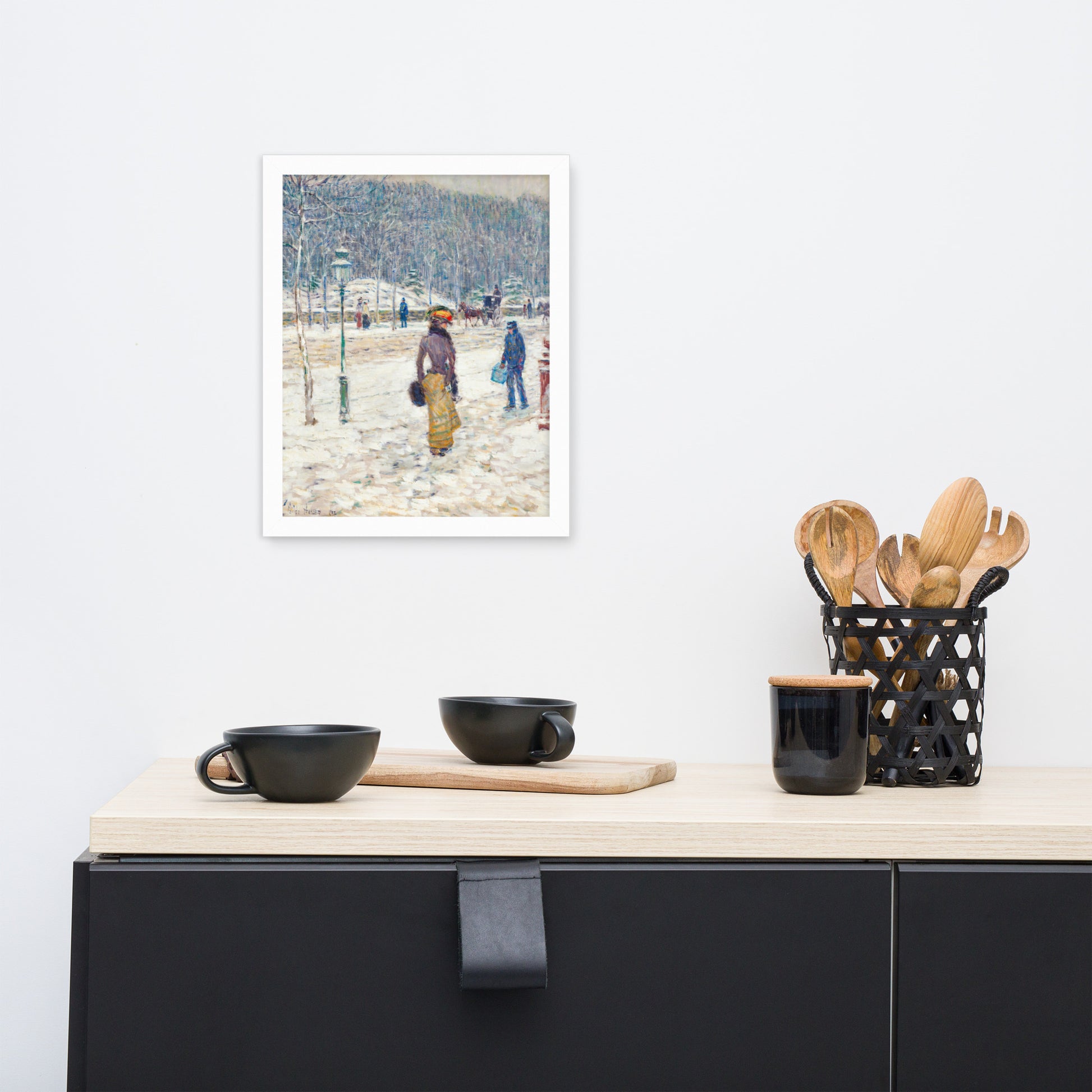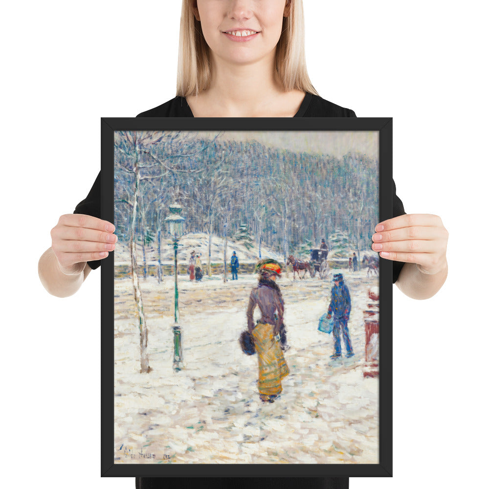 Step into the serene elegance of a snow-covered boulevard with New York Street by Frederick Childe Hassam, a masterwork of American Impressionism. This framed wall print captures the quiet poetry of winter in 1895 Manhattan, where horse-drawn carriages glide past bundled figures and bare trees shimmer under a muted sky. Hassam’s impressionist brushwork evokes movement and mood, blending soft textures with atmospheric light to create a timeless urban vignette.