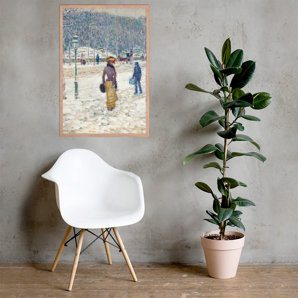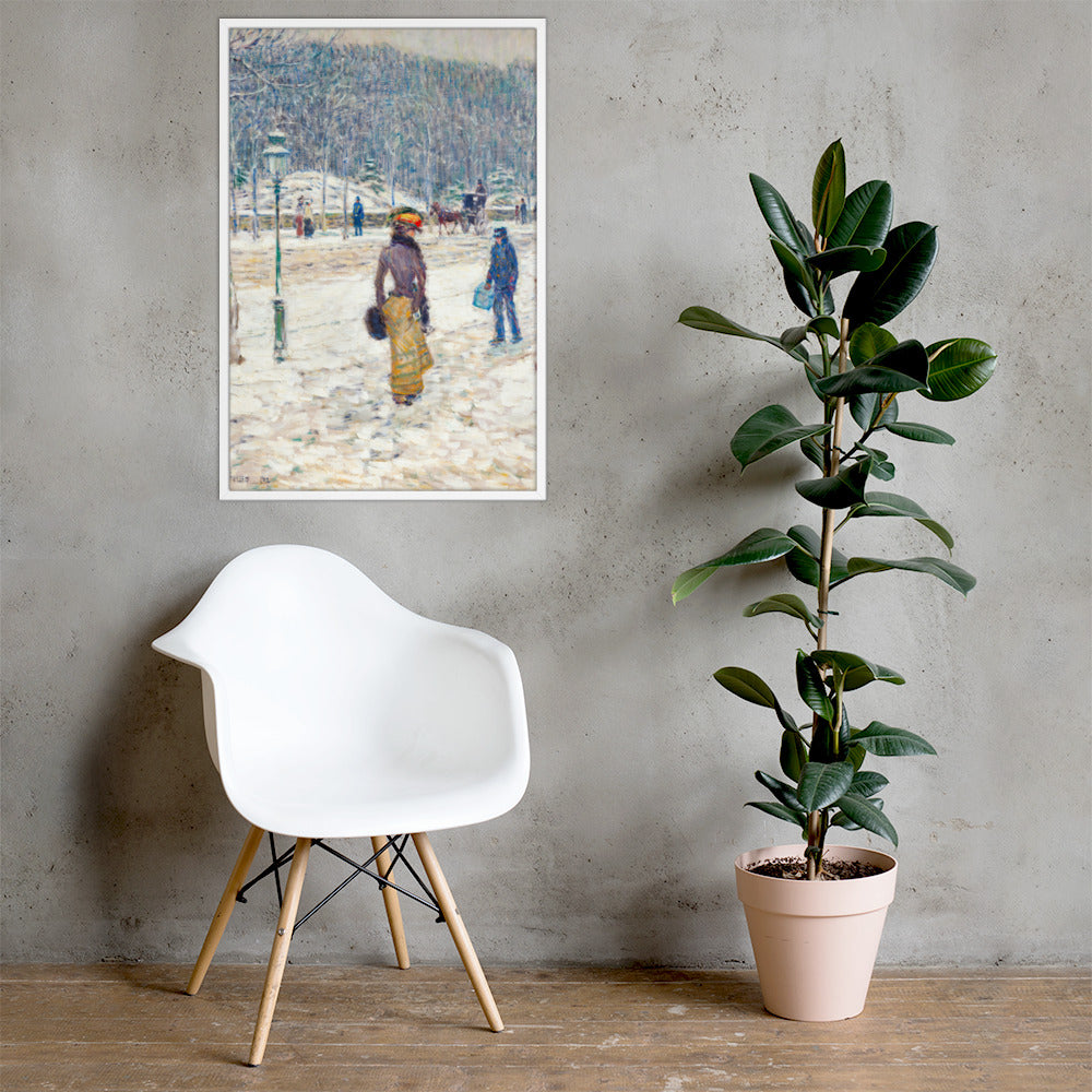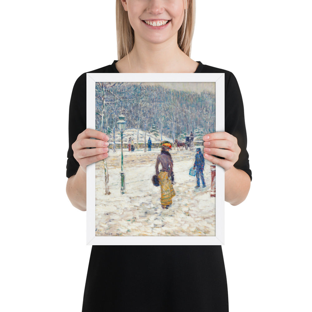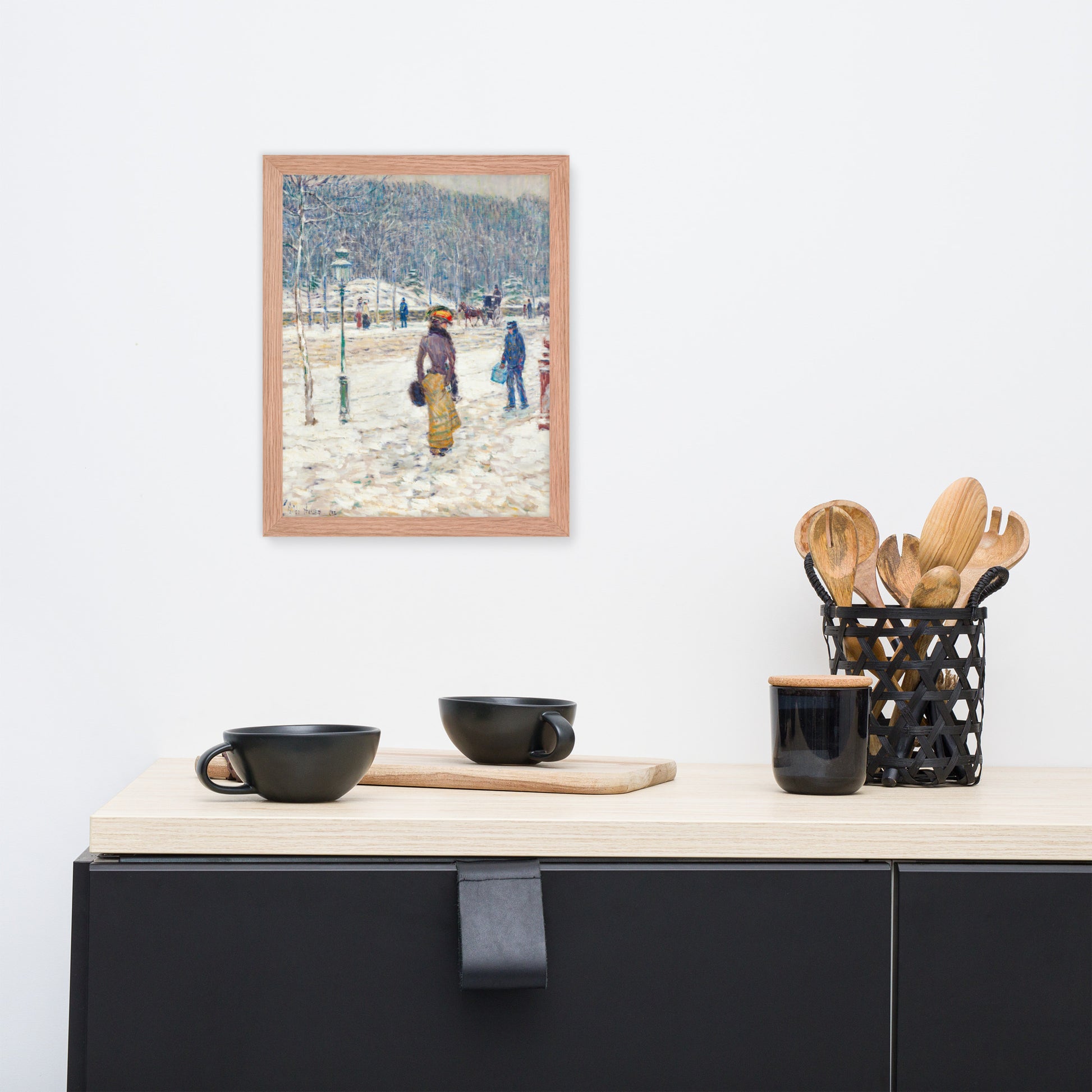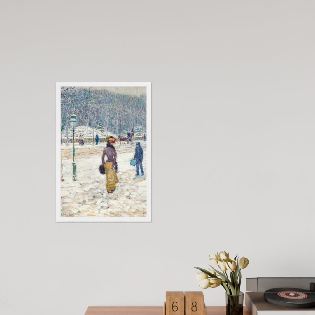 Step into the serene elegance of a snow-covered boulevard with New York Street by Frederick Childe Hassam, a masterwork of American Impressionism. This framed wall print captures the quiet poetry of winter in 1895 Manhattan, where horse-drawn carriages glide past bundled figures and bare trees shimmer under a muted sky. Hassam’s impressionist brushwork evokes movement and mood, blending soft textures with atmospheric light to create a timeless urban vignette.