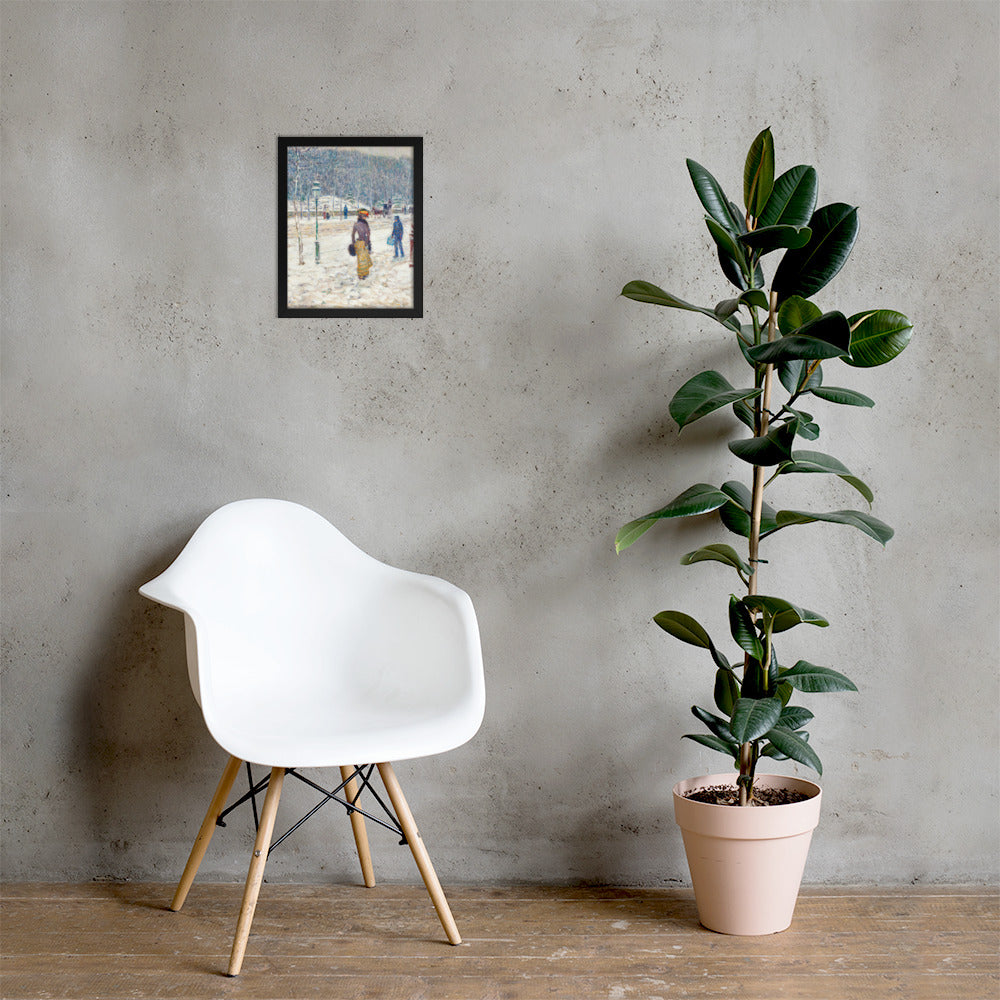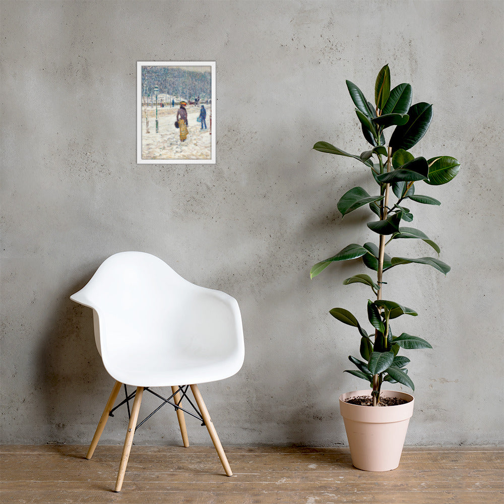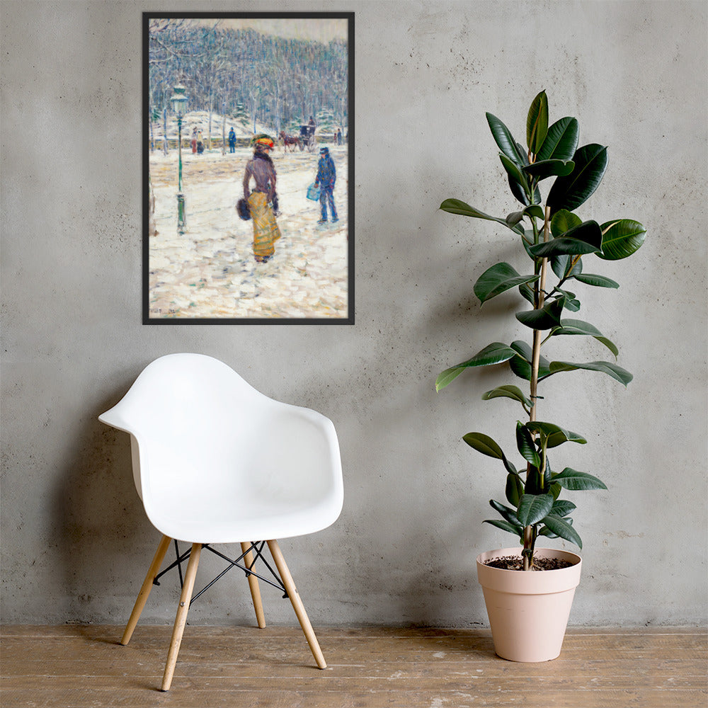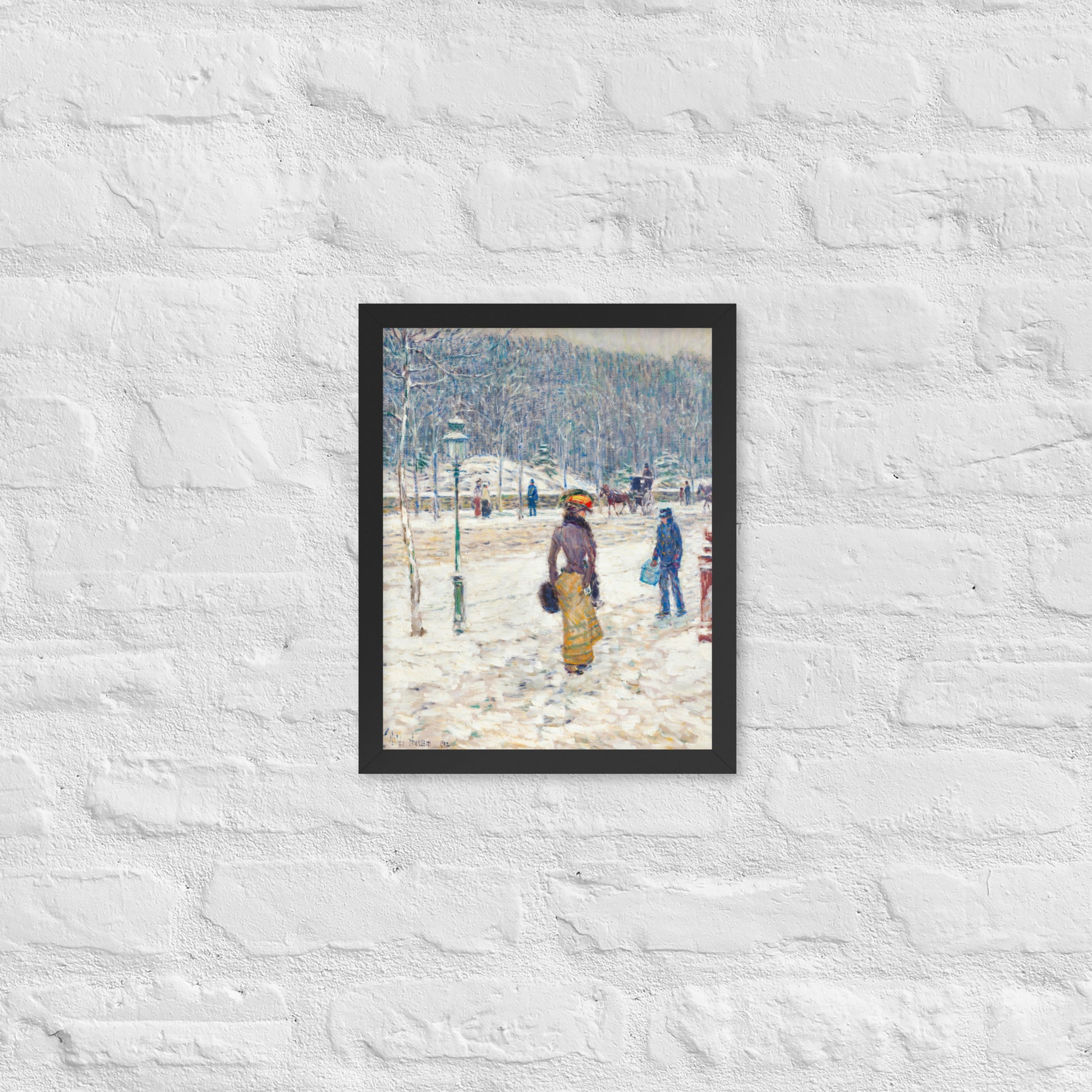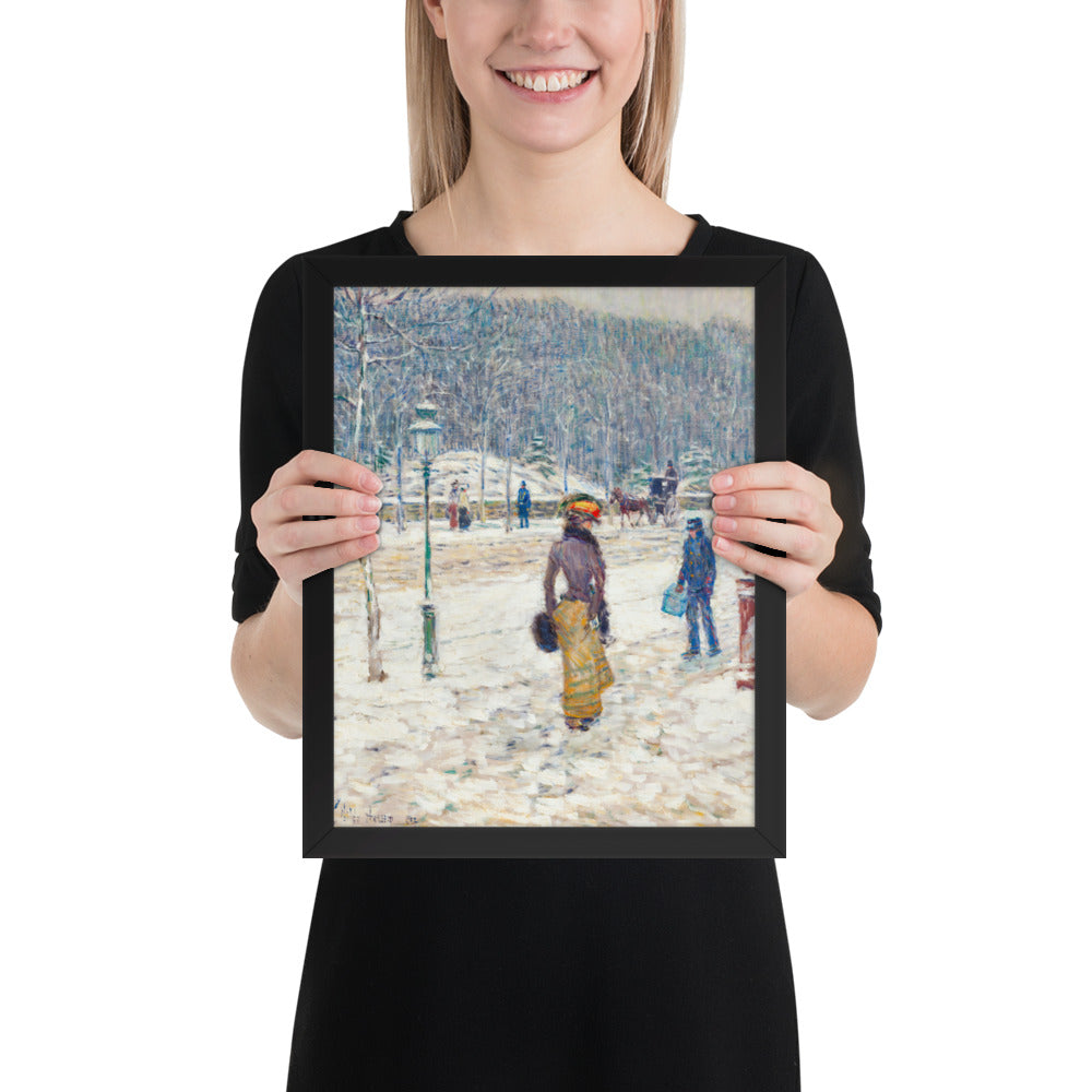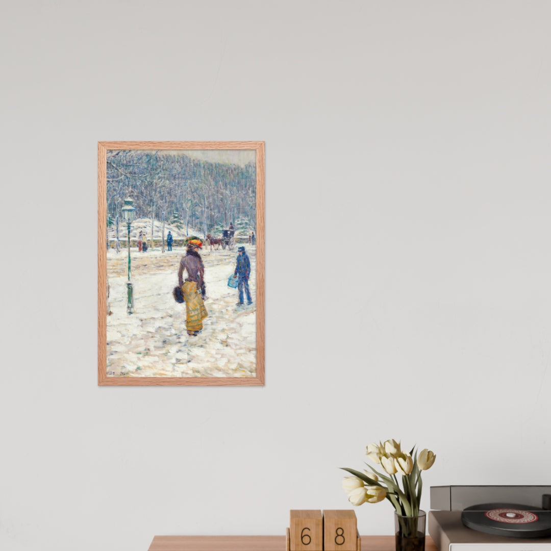 Step into the serene elegance of a snow-covered boulevard with New York Street by Frederick Childe Hassam, a masterwork of American Impressionism. This framed wall print captures the quiet poetry of winter in 1895 Manhattan, where horse-drawn carriages glide past bundled figures and bare trees shimmer under a muted sky. Hassam’s impressionist brushwork evokes movement and mood, blending soft textures with atmospheric light to create a timeless urban vignette.