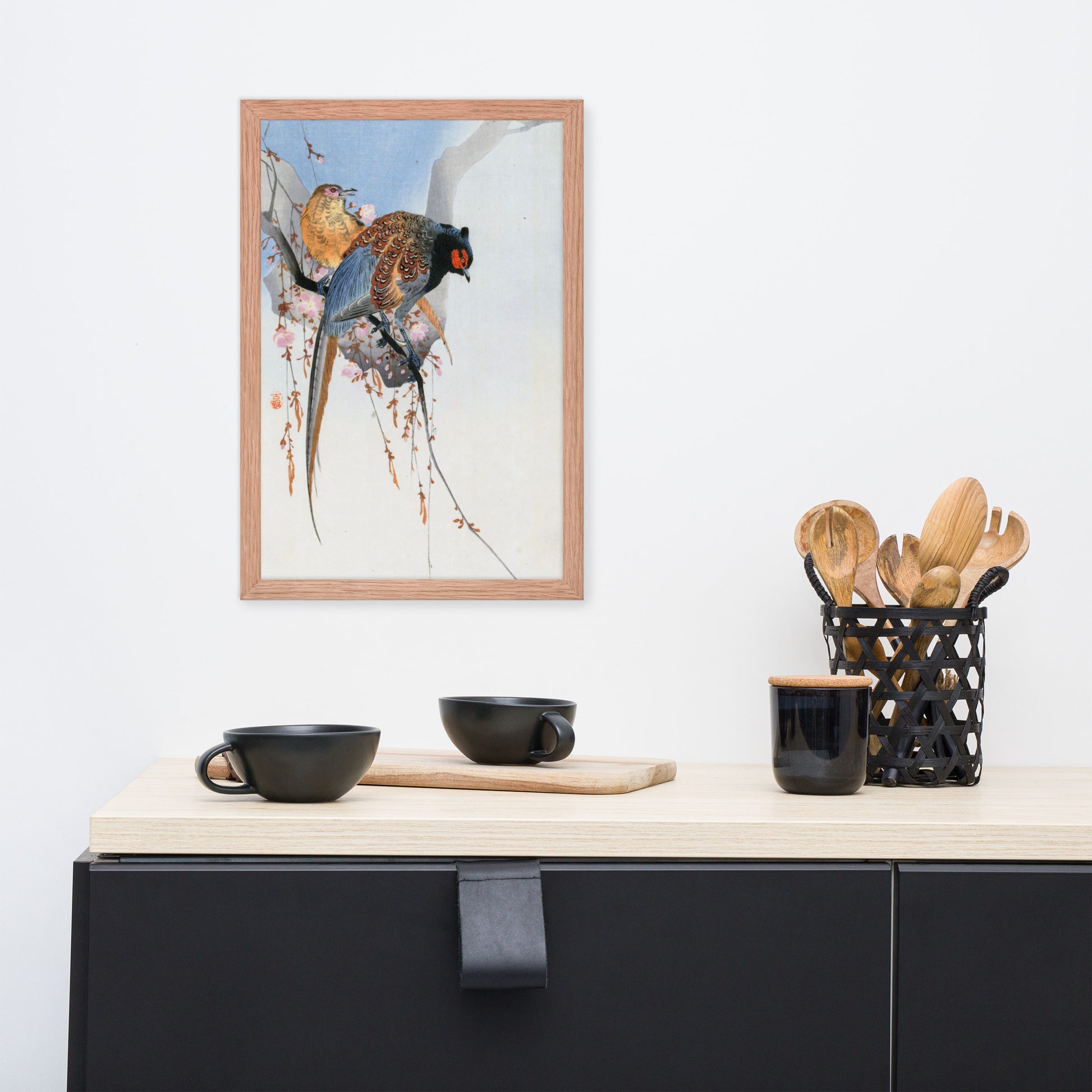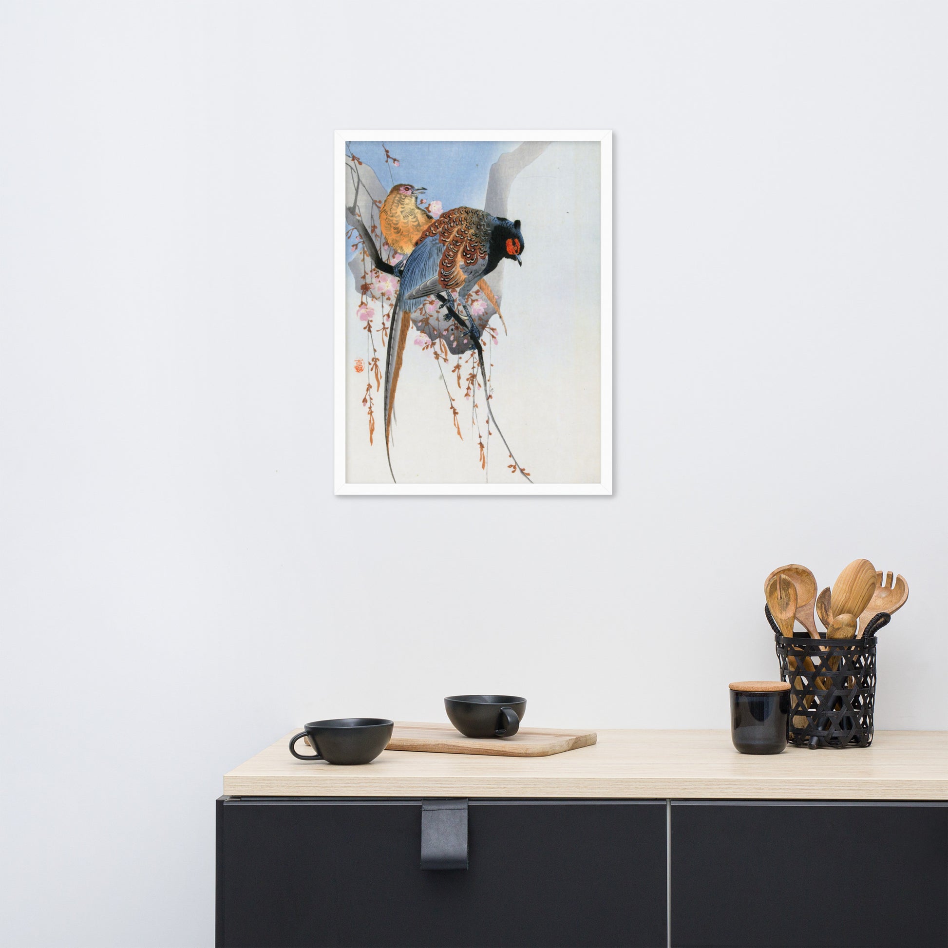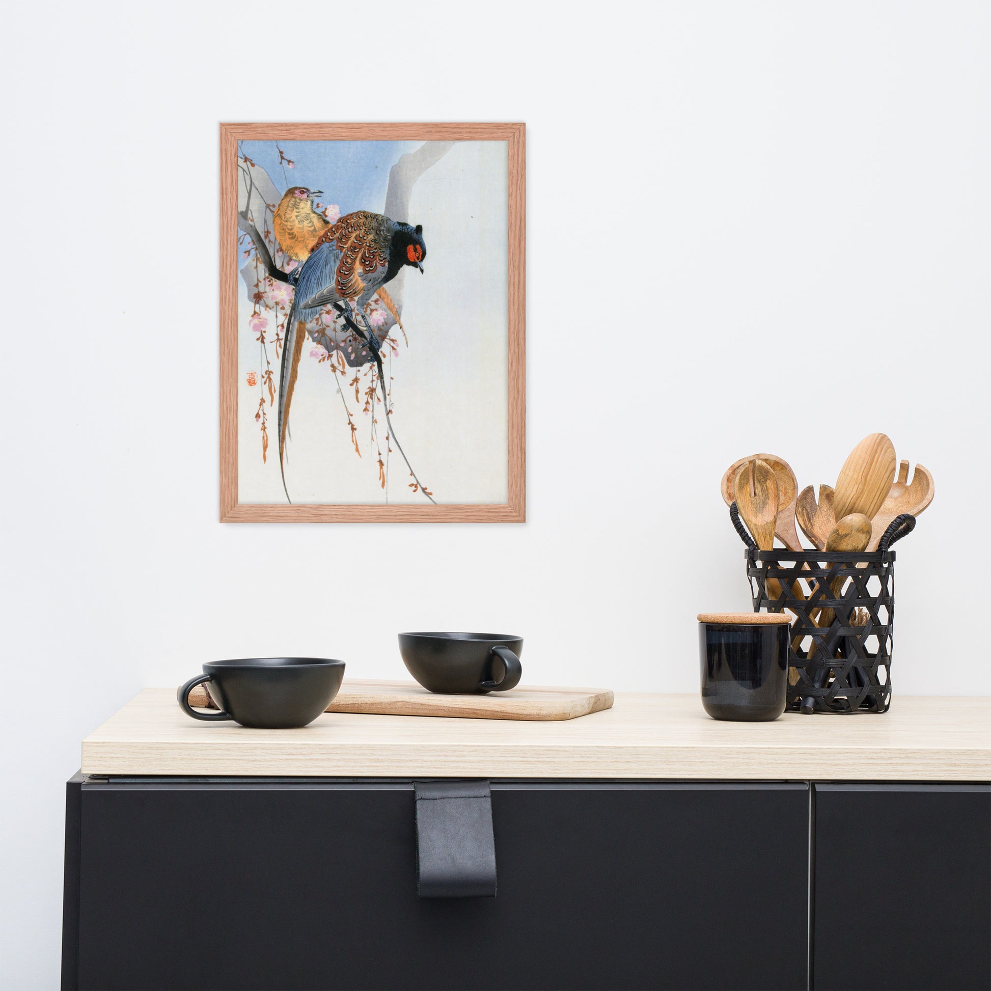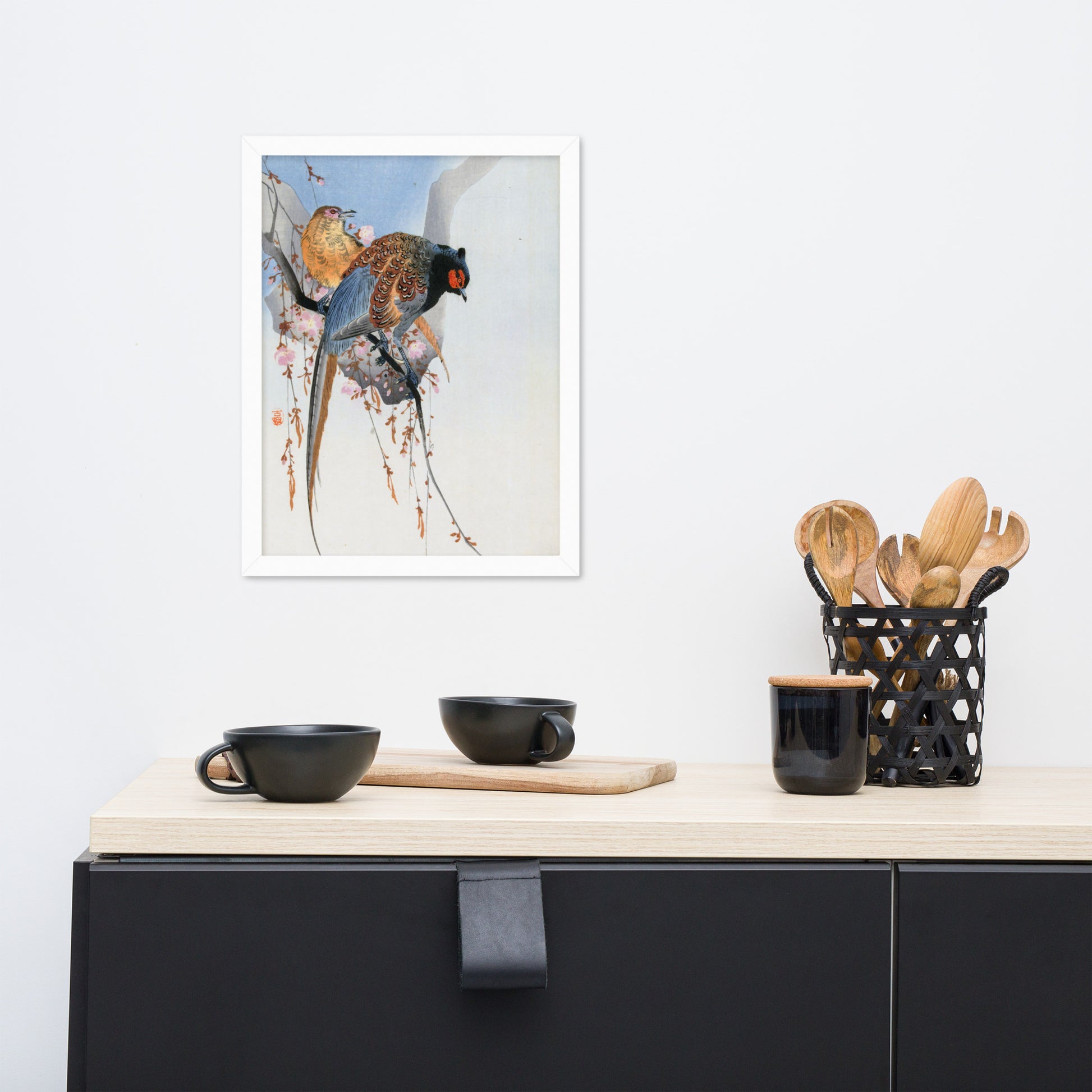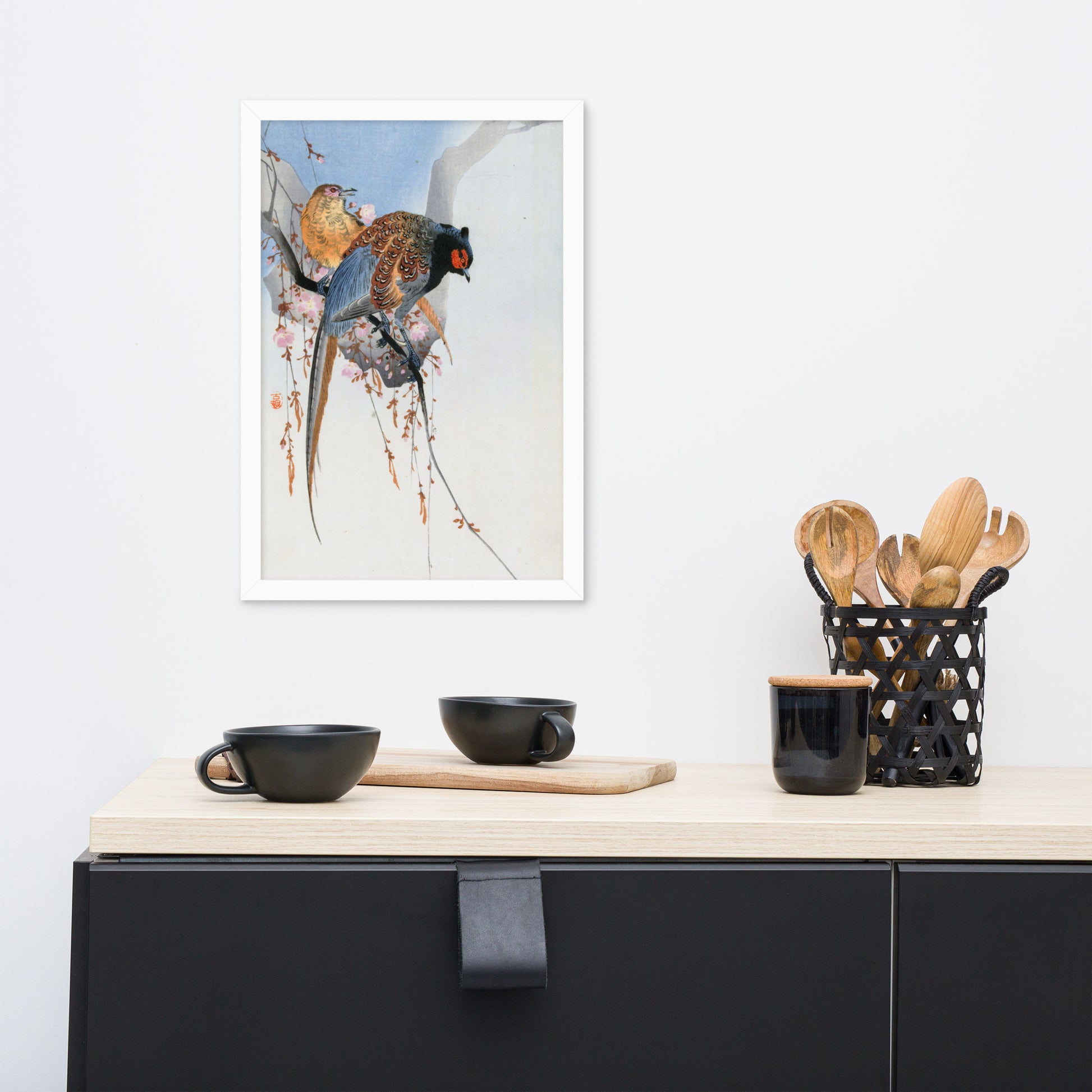 Invite tranquility and timeless beauty into your space with Pheasant Couple and Plum Blossom by Ohara Koson, a serene composition from the tradition of Japanese Woodblock Prints (Ukiyo-e). This framed artwork captures two pheasants perched gracefully on a blossoming branch—one adorned in vivid blue and russet plumage with striking red facial markings, the other in warm earth tones that echo the softness of early spring.