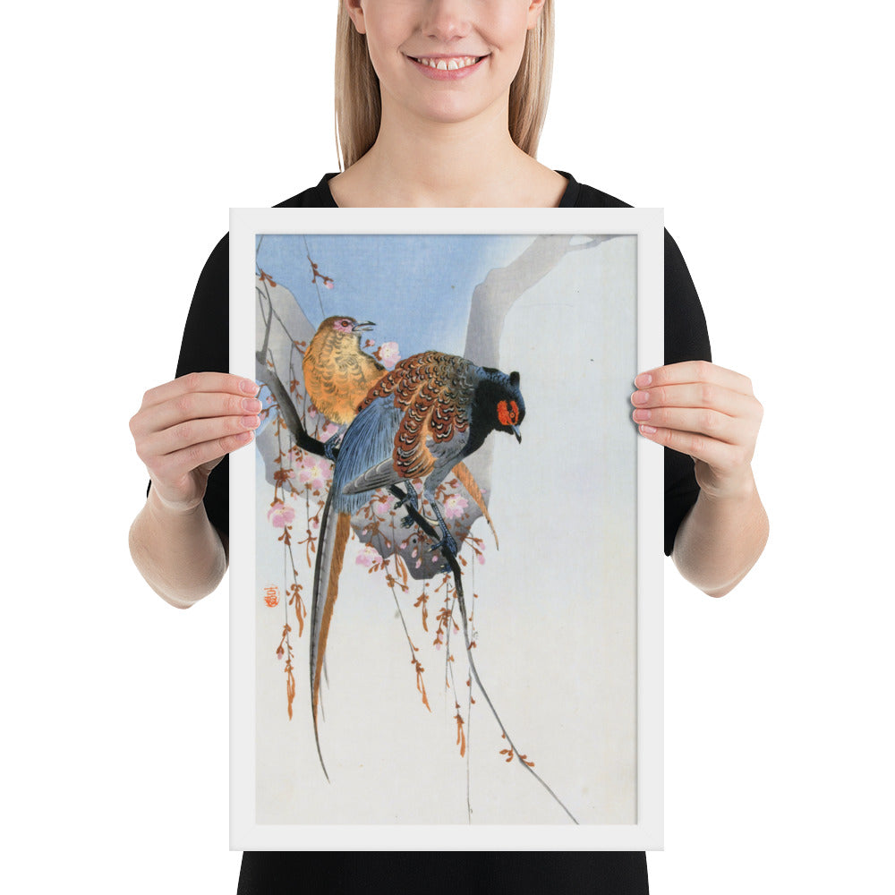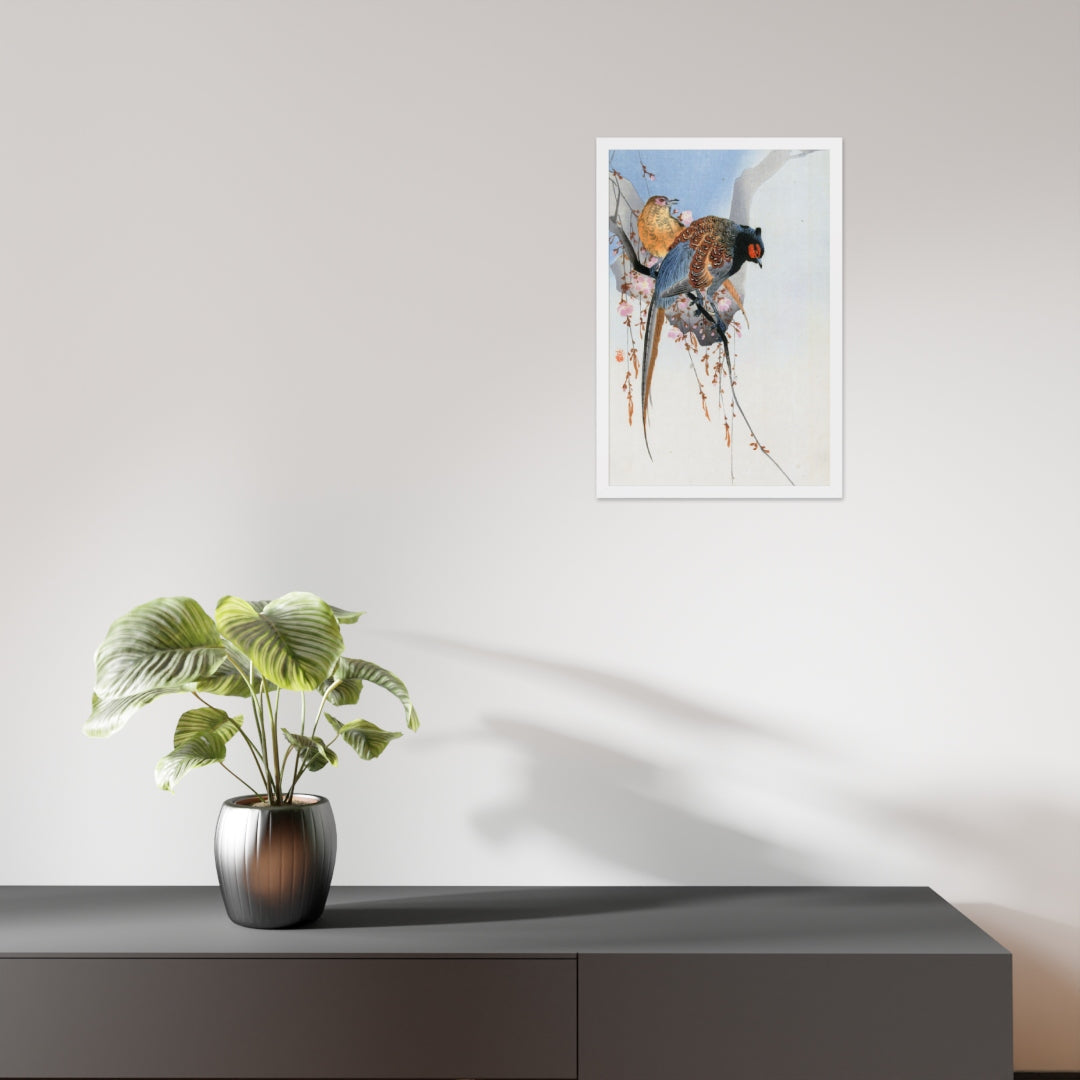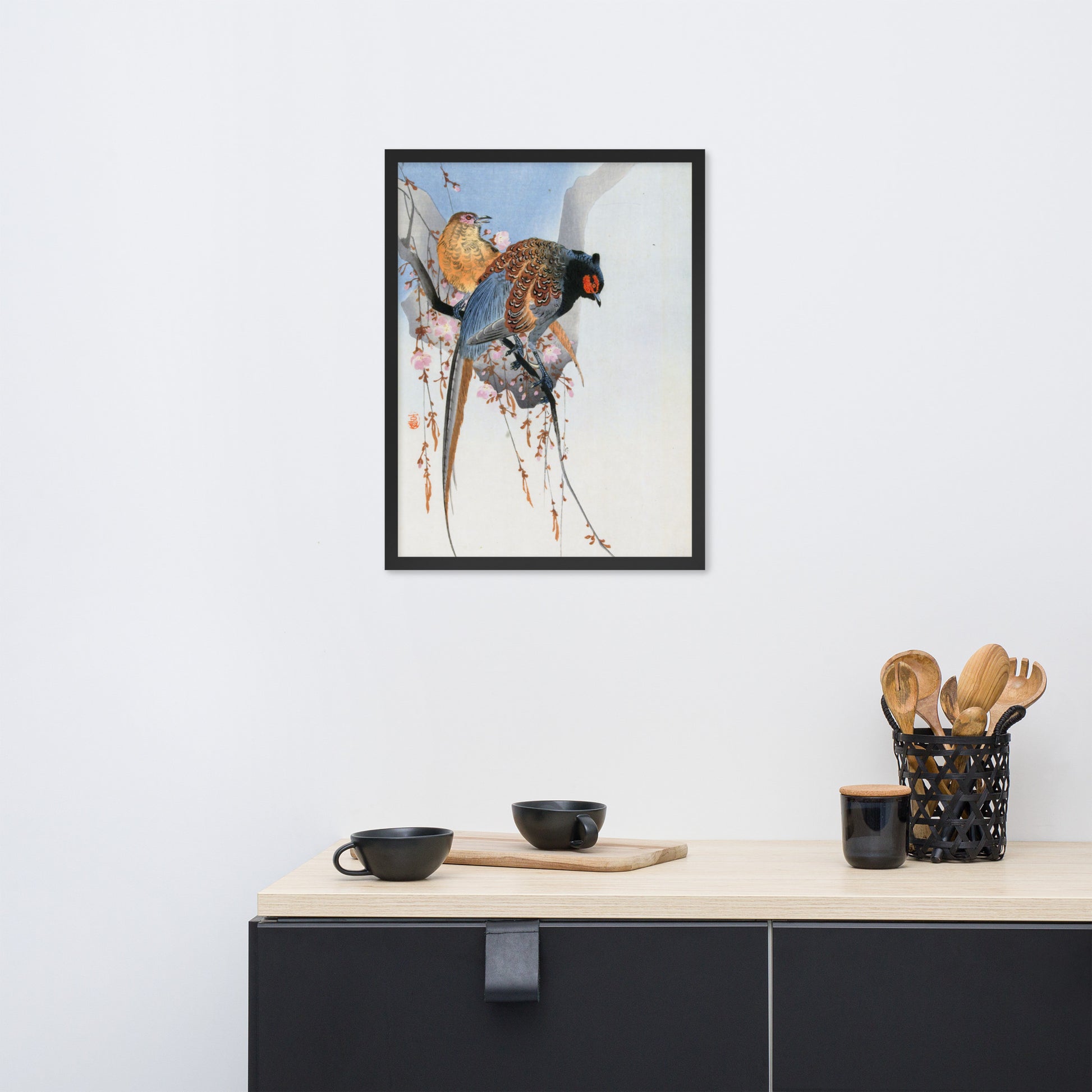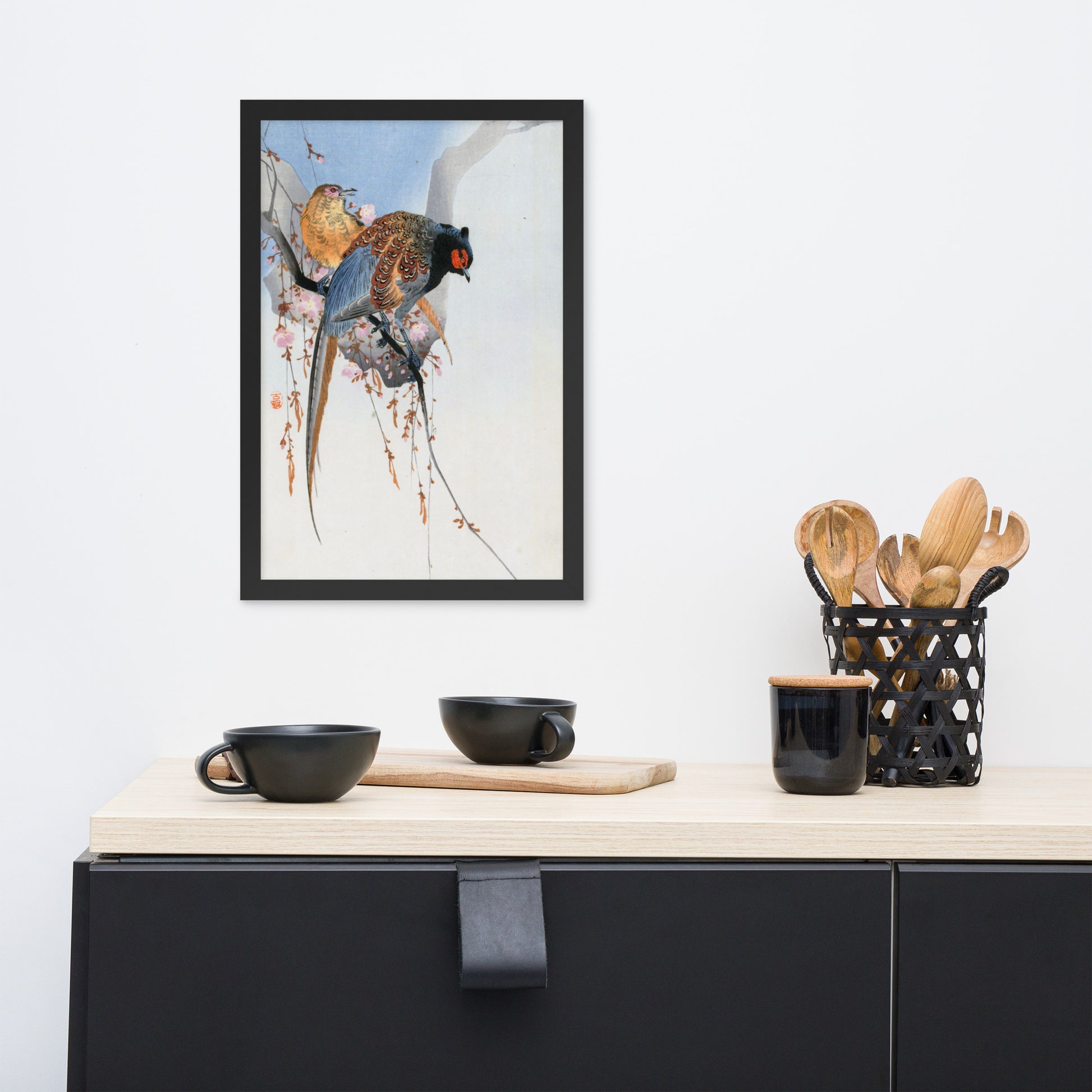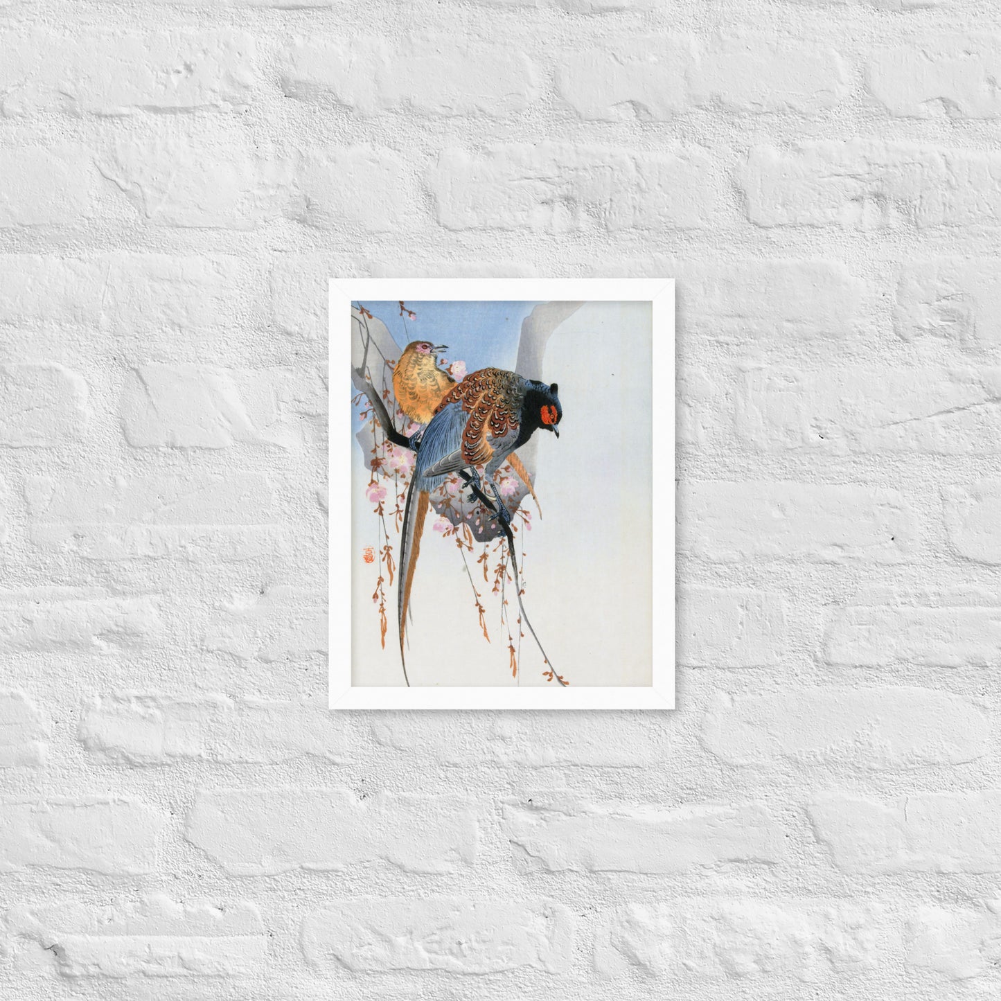 Invite tranquility and timeless beauty into your space with Pheasant Couple and Plum Blossom by Ohara Koson, a serene composition from the tradition of Japanese Woodblock Prints (Ukiyo-e). This framed artwork captures two pheasants perched gracefully on a blossoming branch—one adorned in vivid blue and russet plumage with striking red facial markings, the other in warm earth tones that echo the softness of early spring.