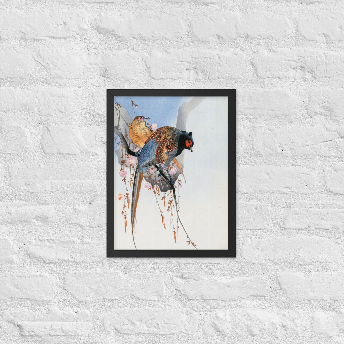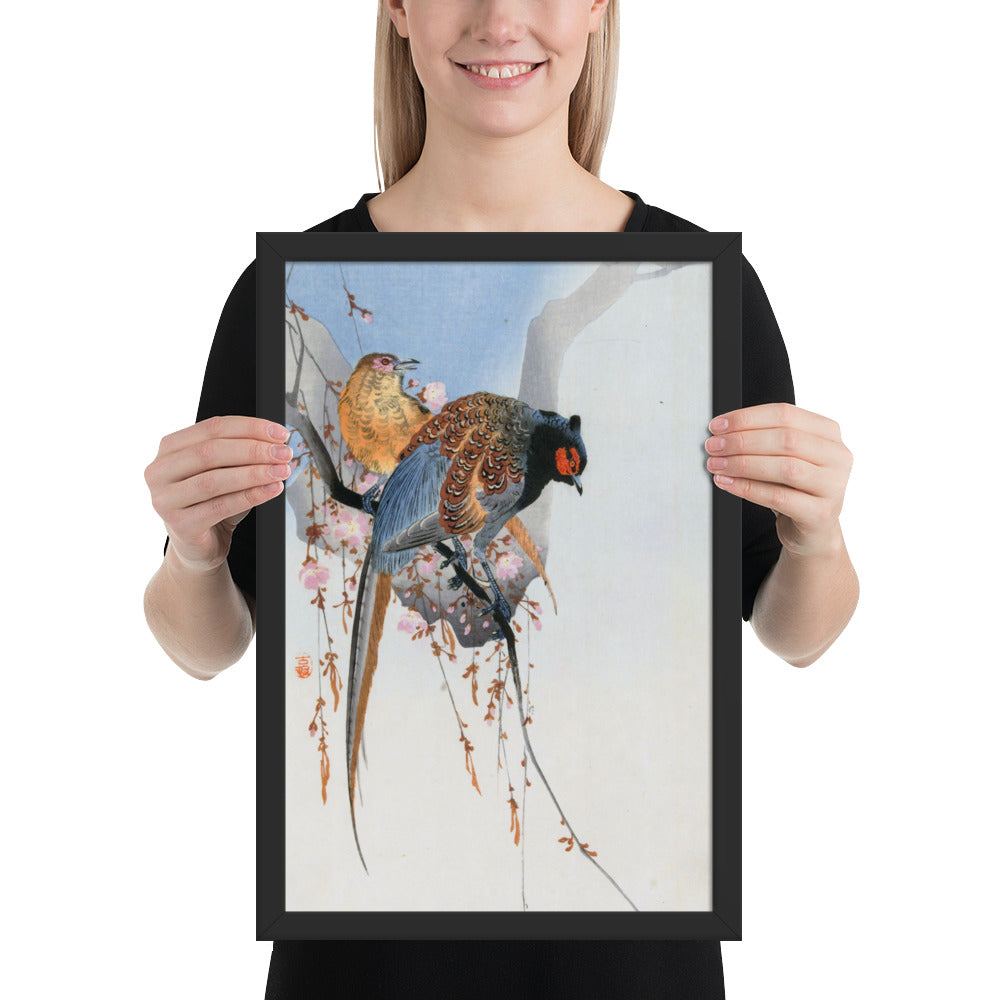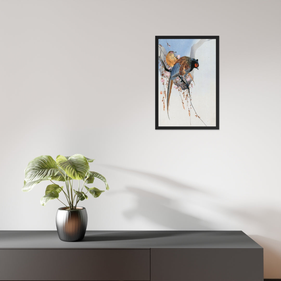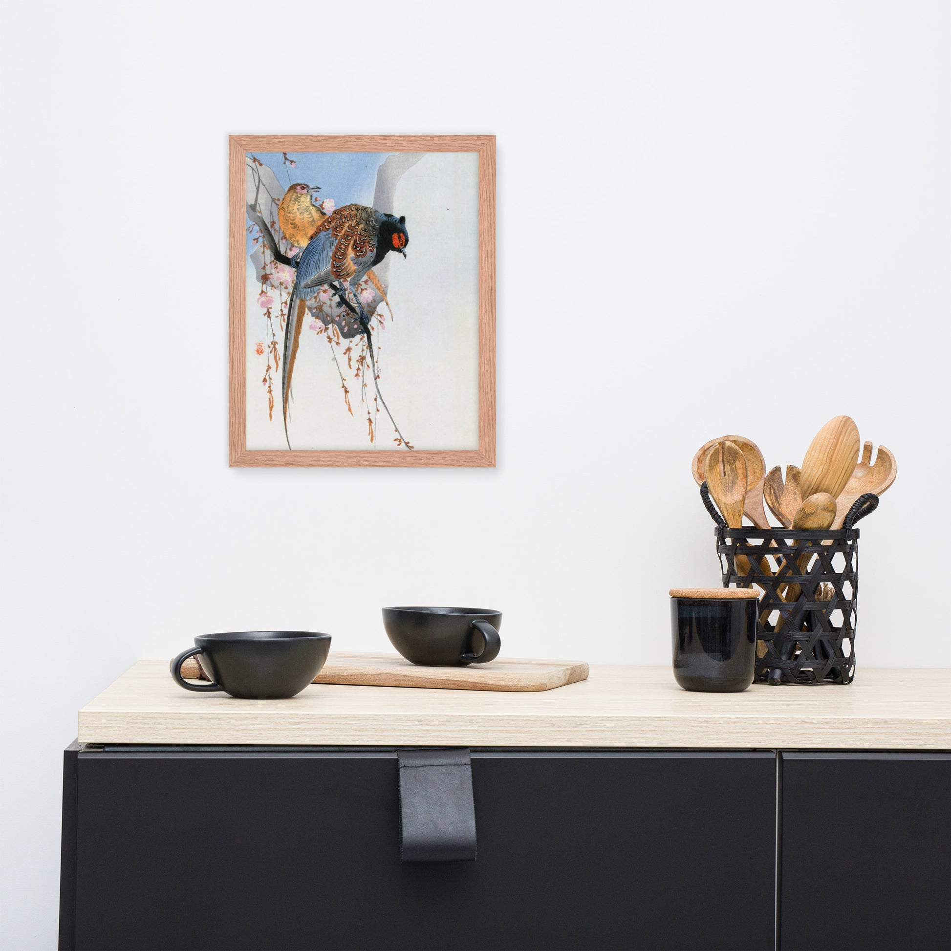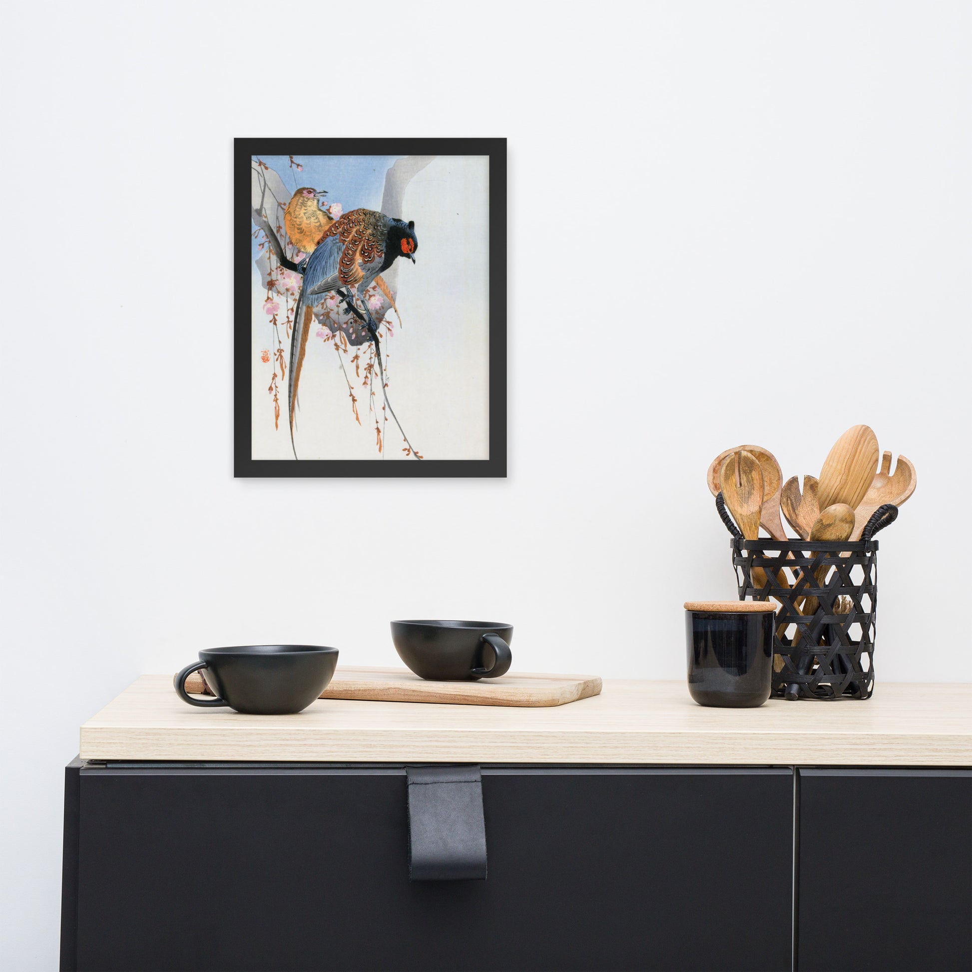 Invite tranquility and timeless beauty into your space with Pheasant Couple and Plum Blossom by Ohara Koson, a serene composition from the tradition of Japanese Woodblock Prints (Ukiyo-e). This framed artwork captures two pheasants perched gracefully on a blossoming branch—one adorned in vivid blue and russet plumage with striking red facial markings, the other in warm earth tones that echo the softness of early spring.