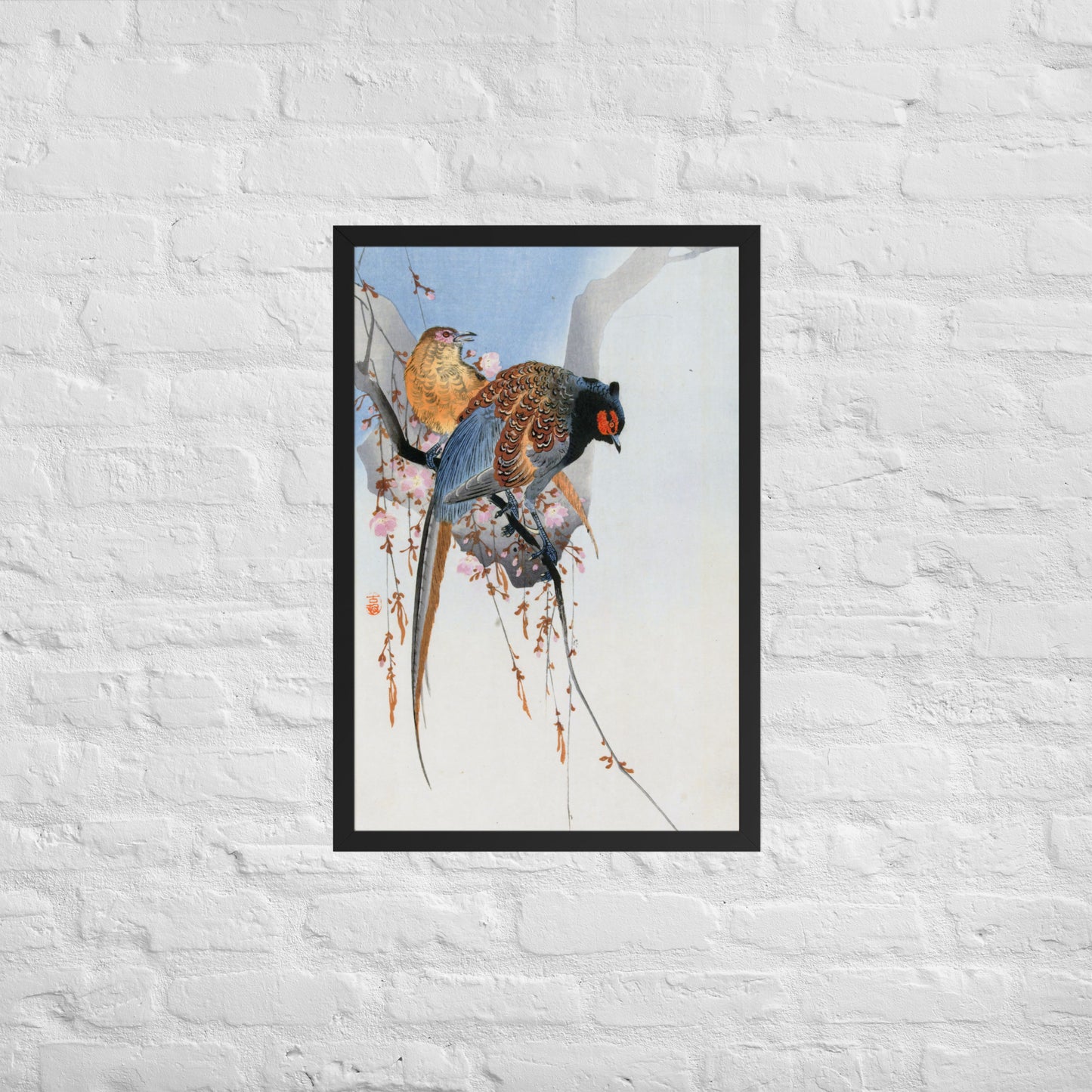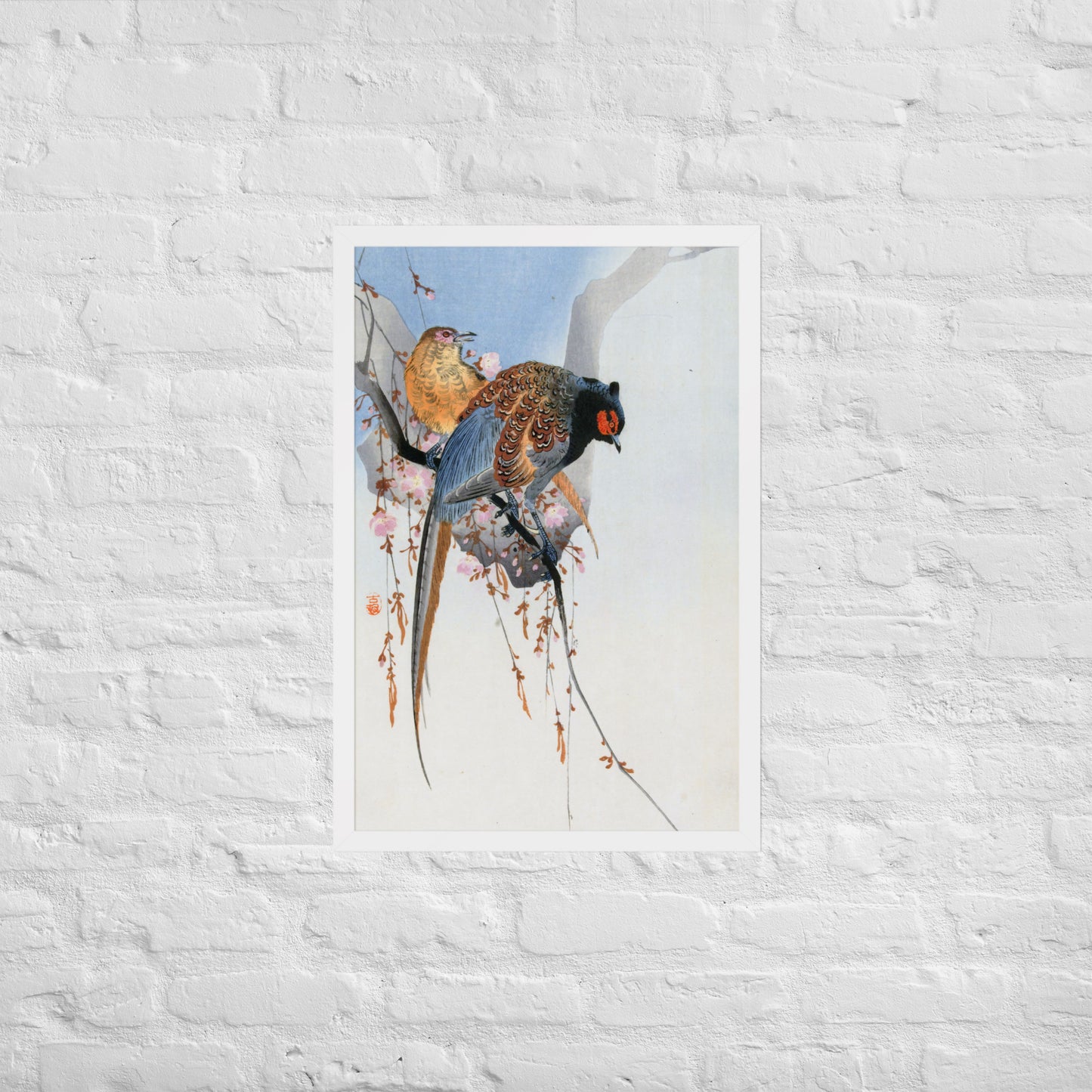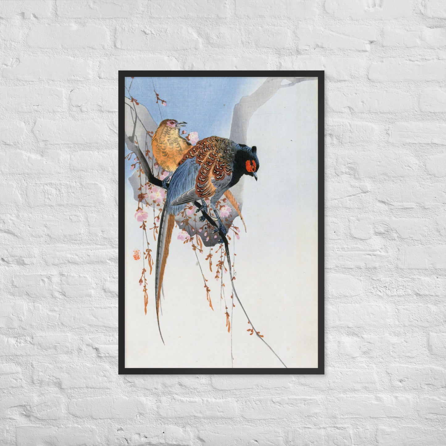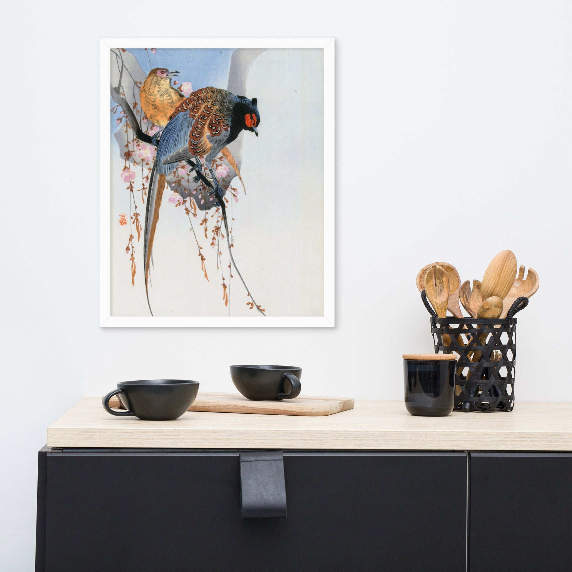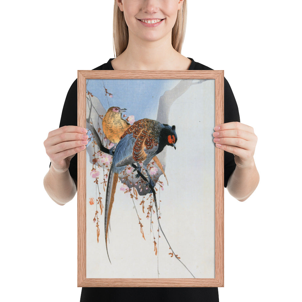 Invite tranquility and timeless beauty into your space with Pheasant Couple and Plum Blossom by Ohara Koson, a serene composition from the tradition of Japanese Woodblock Prints (Ukiyo-e). This framed artwork captures two pheasants perched gracefully on a blossoming branch—one adorned in vivid blue and russet plumage with striking red facial markings, the other in warm earth tones that echo the softness of early spring.