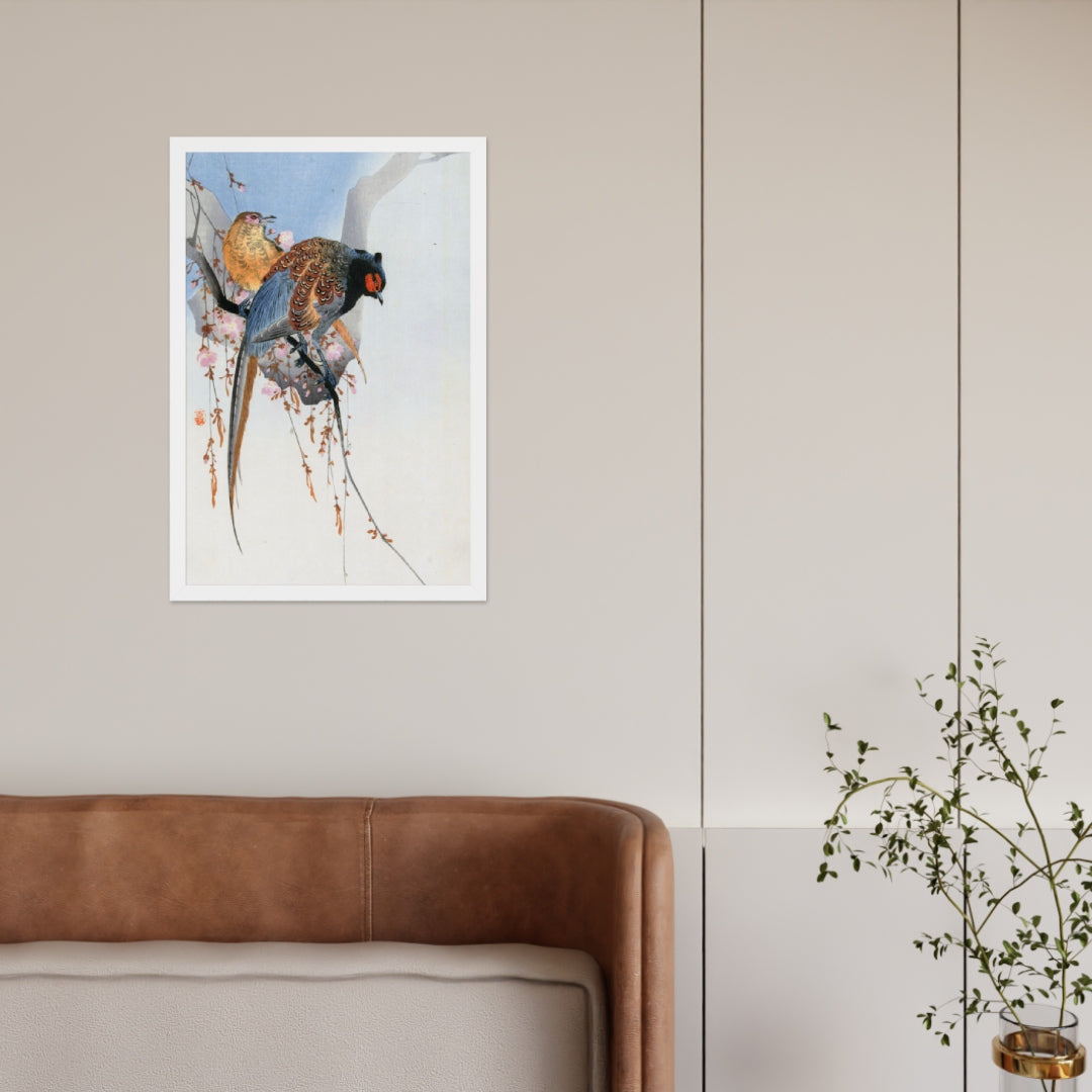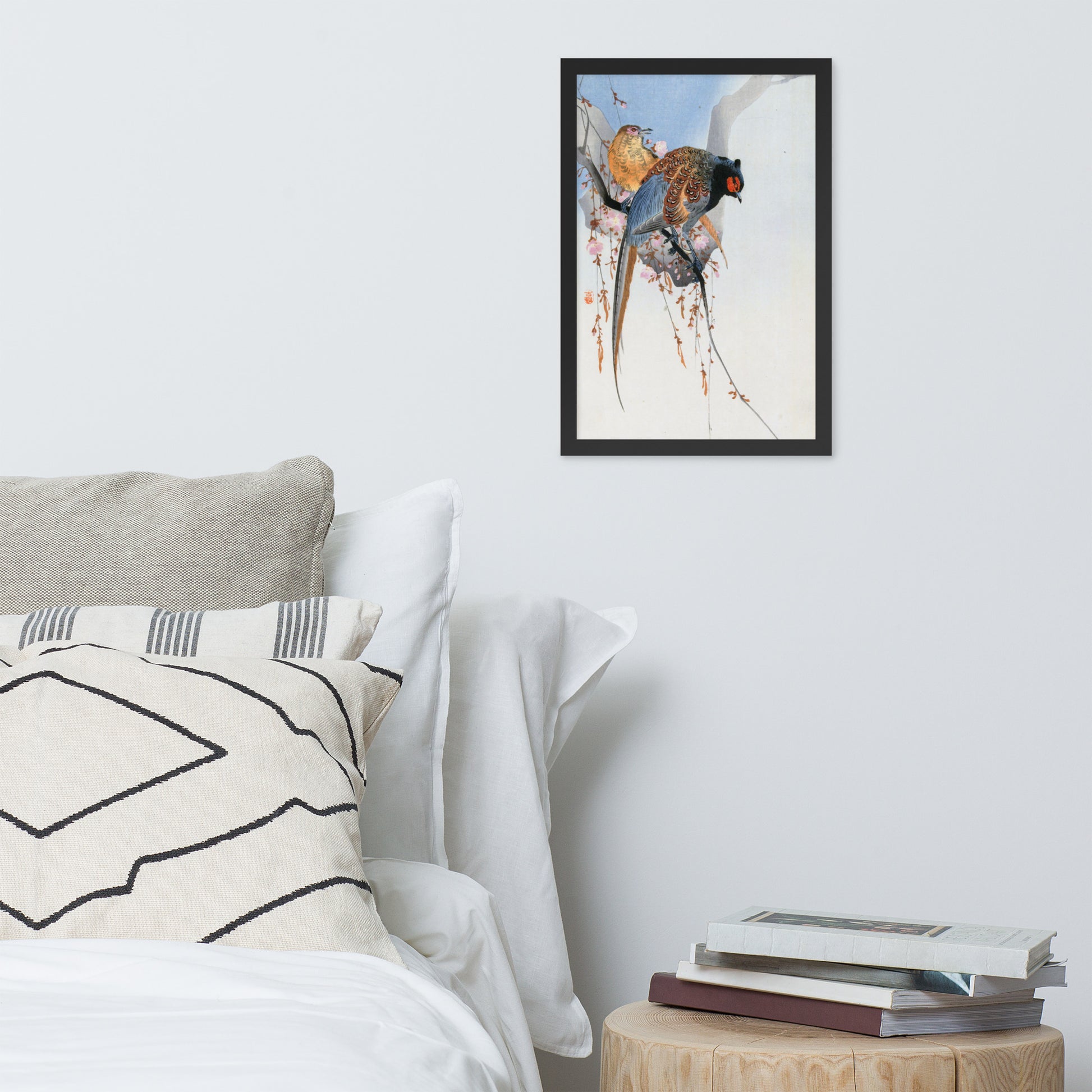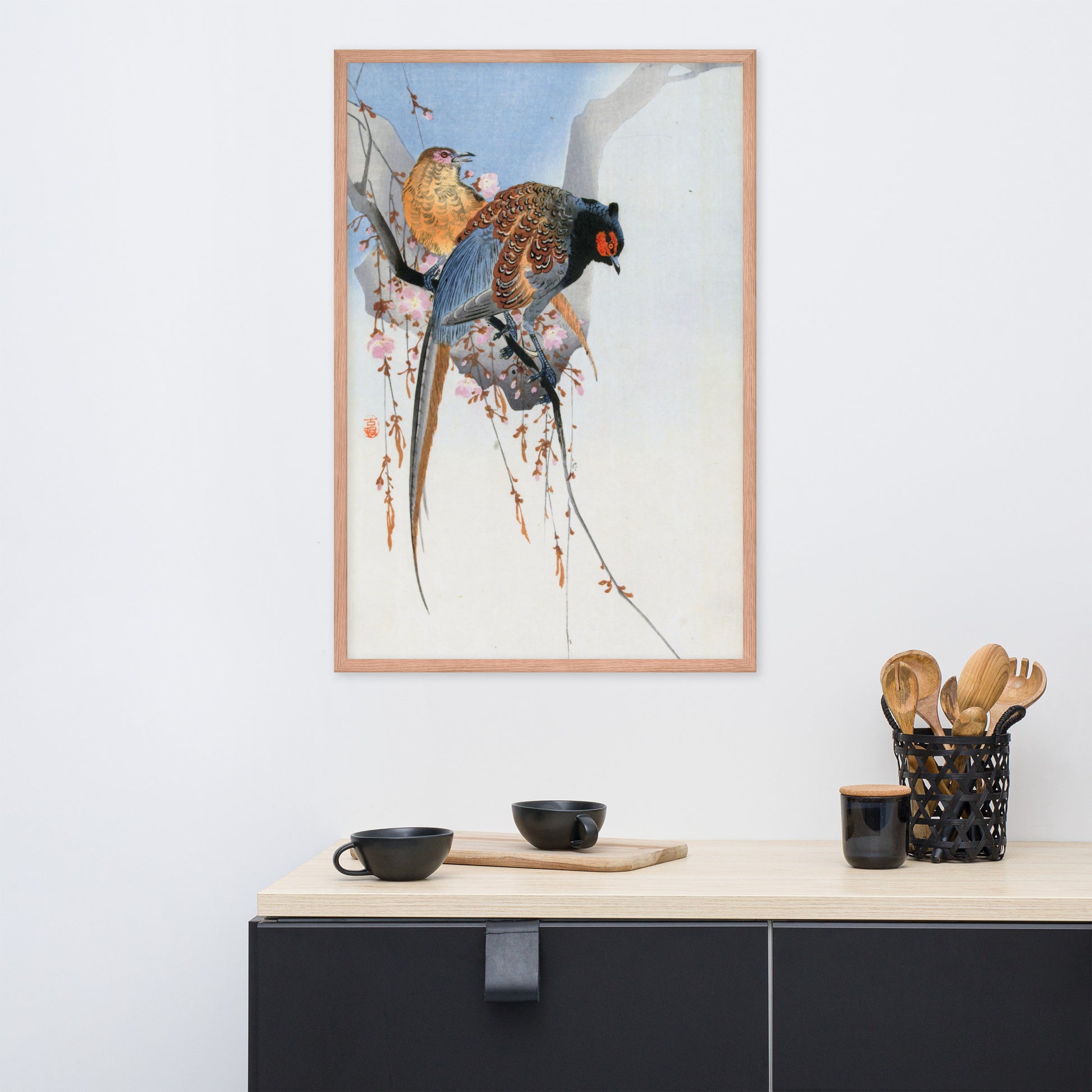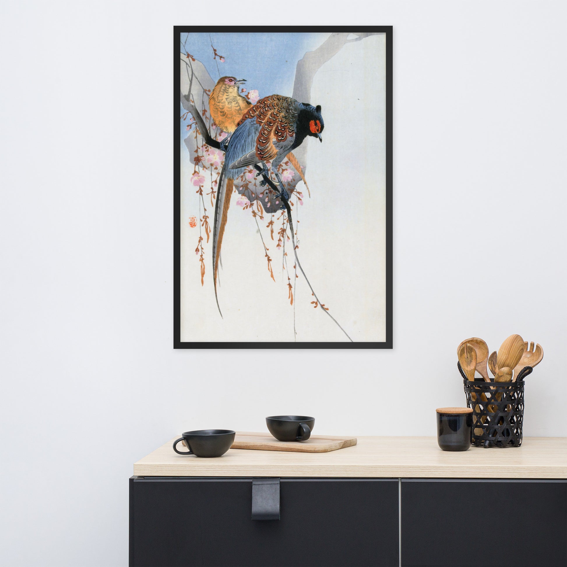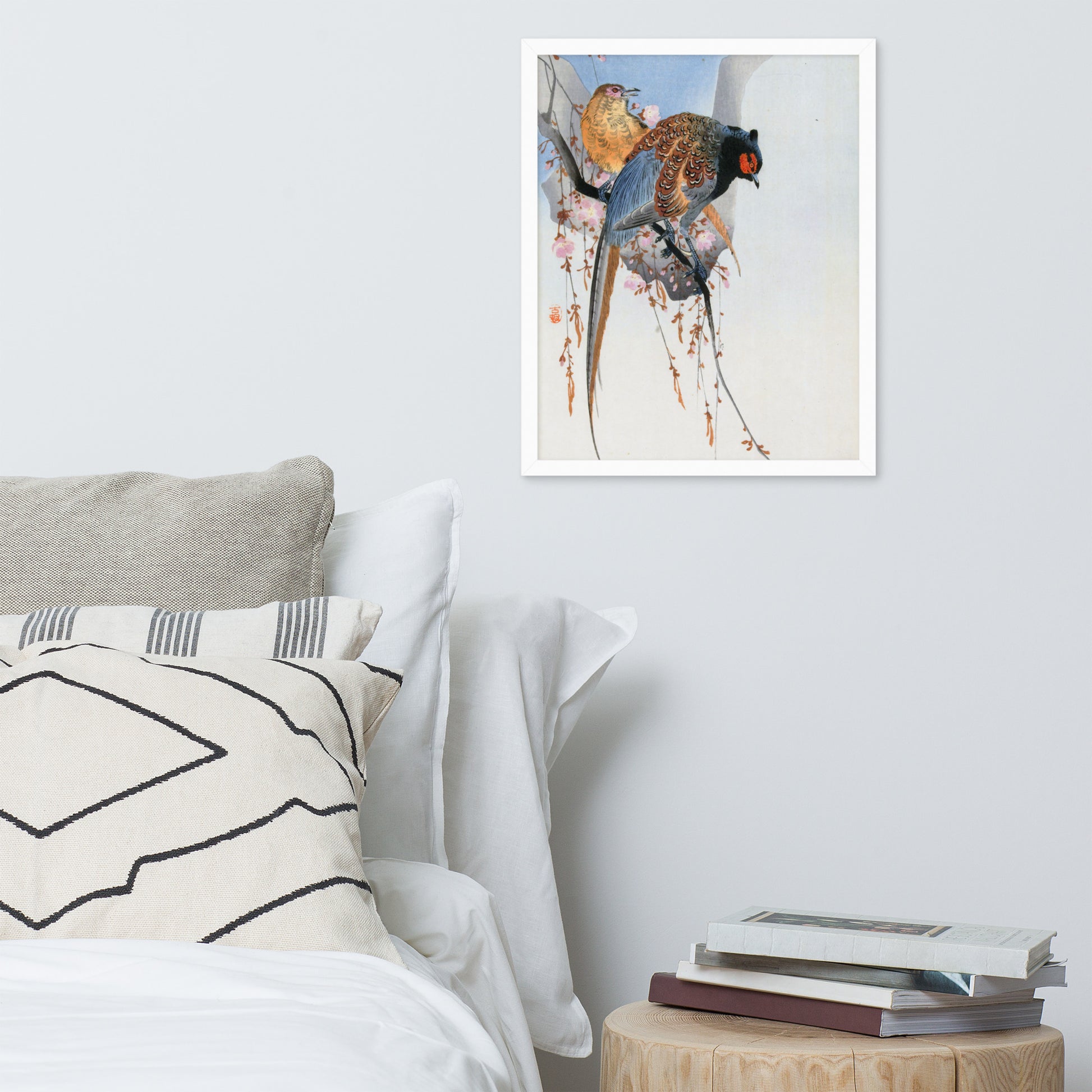 Invite tranquility and timeless beauty into your space with Pheasant Couple and Plum Blossom by Ohara Koson, a serene composition from the tradition of Japanese Woodblock Prints (Ukiyo-e). This framed artwork captures two pheasants perched gracefully on a blossoming branch—one adorned in vivid blue and russet plumage with striking red facial markings, the other in warm earth tones that echo the softness of early spring.