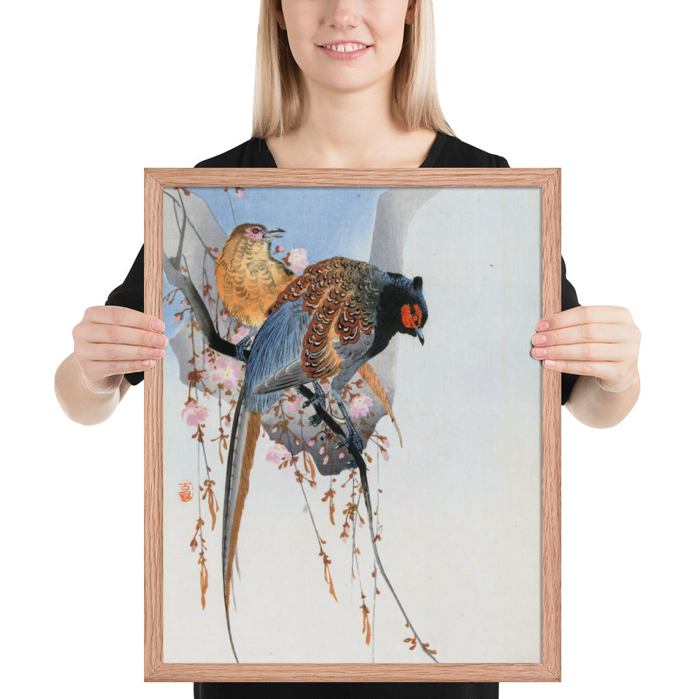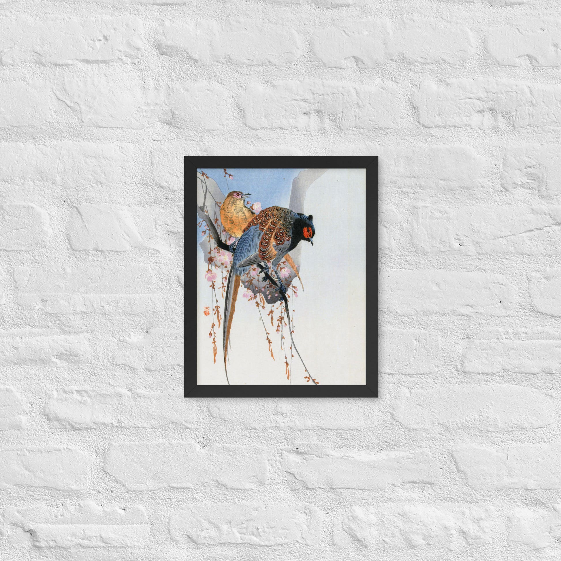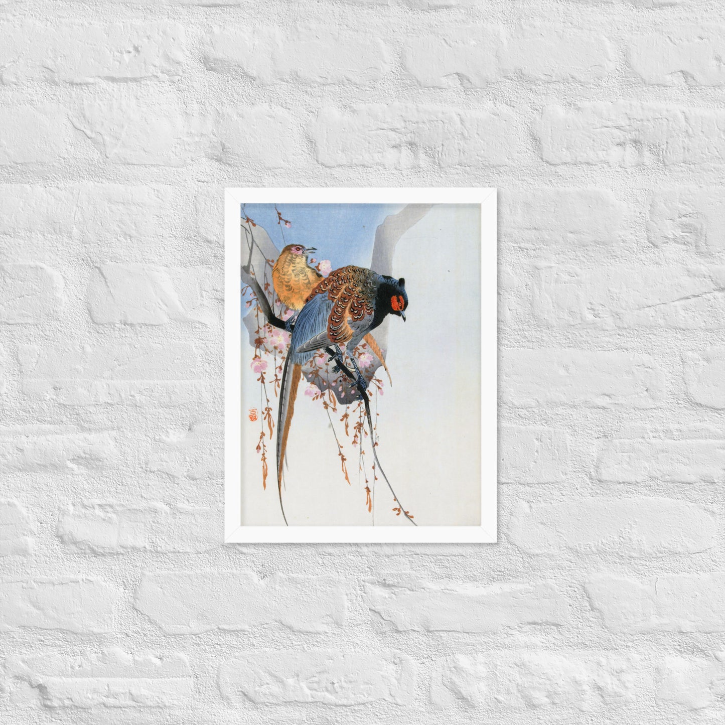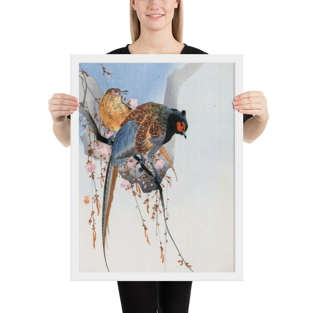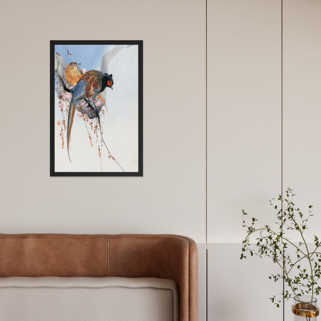 Invite tranquility and timeless beauty into your space with Pheasant Couple and Plum Blossom by Ohara Koson, a serene composition from the tradition of Japanese Woodblock Prints (Ukiyo-e). This framed artwork captures two pheasants perched gracefully on a blossoming branch—one adorned in vivid blue and russet plumage with striking red facial markings, the other in warm earth tones that echo the softness of early spring.