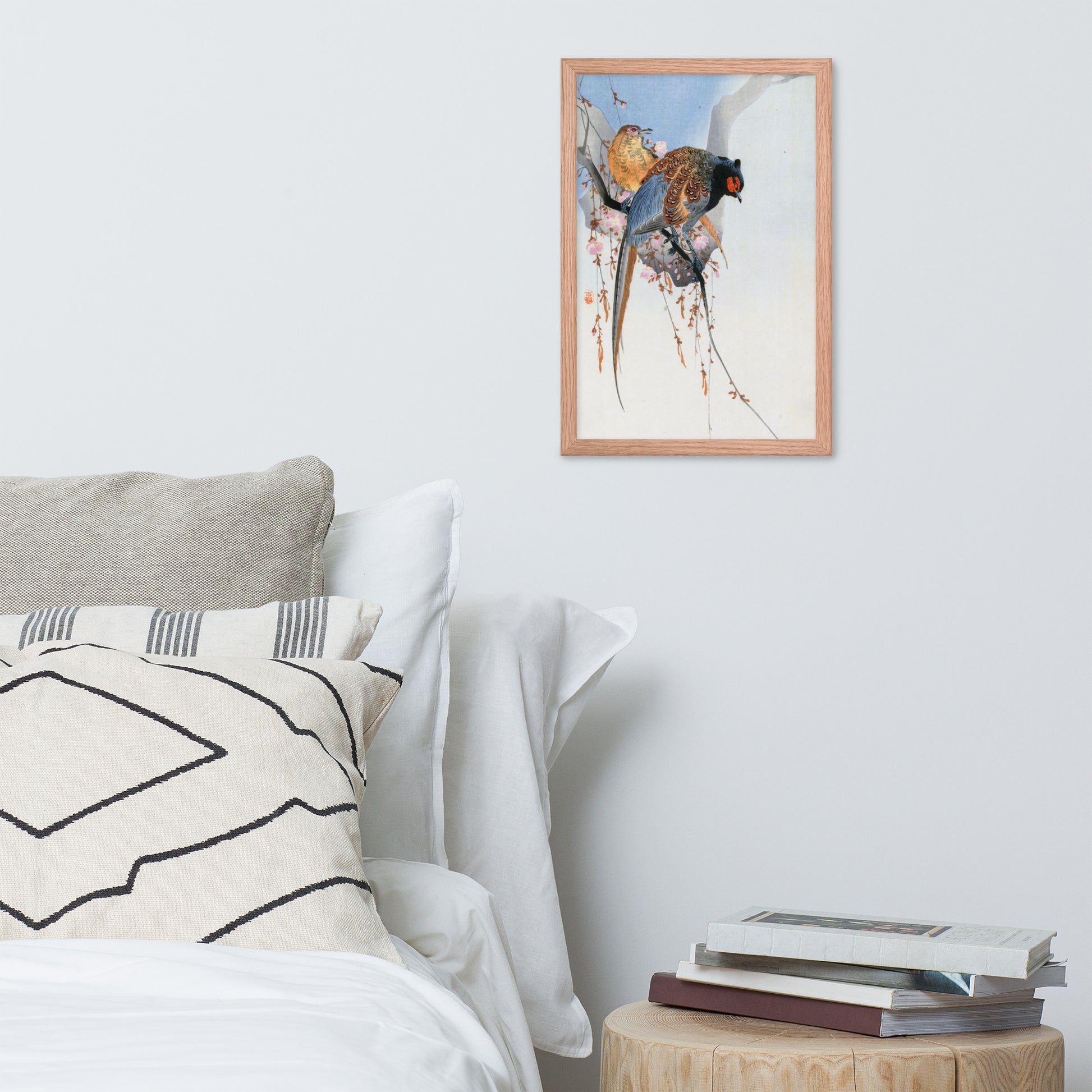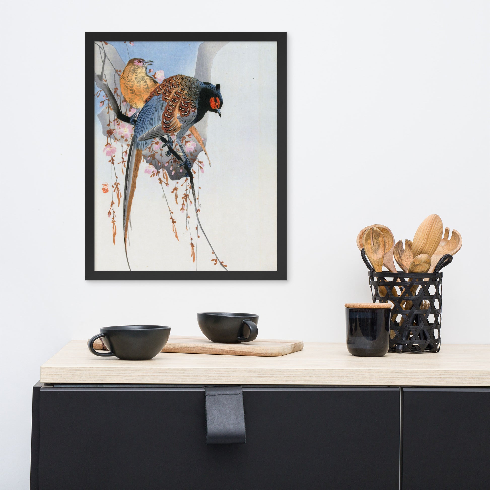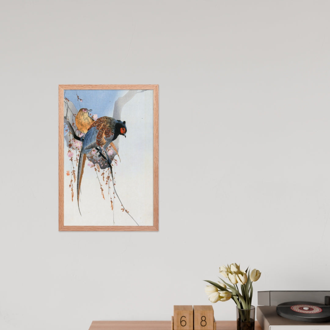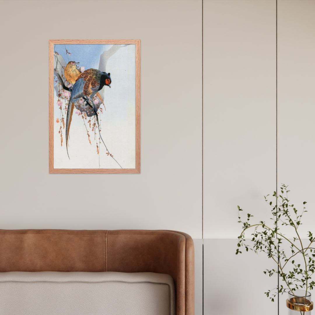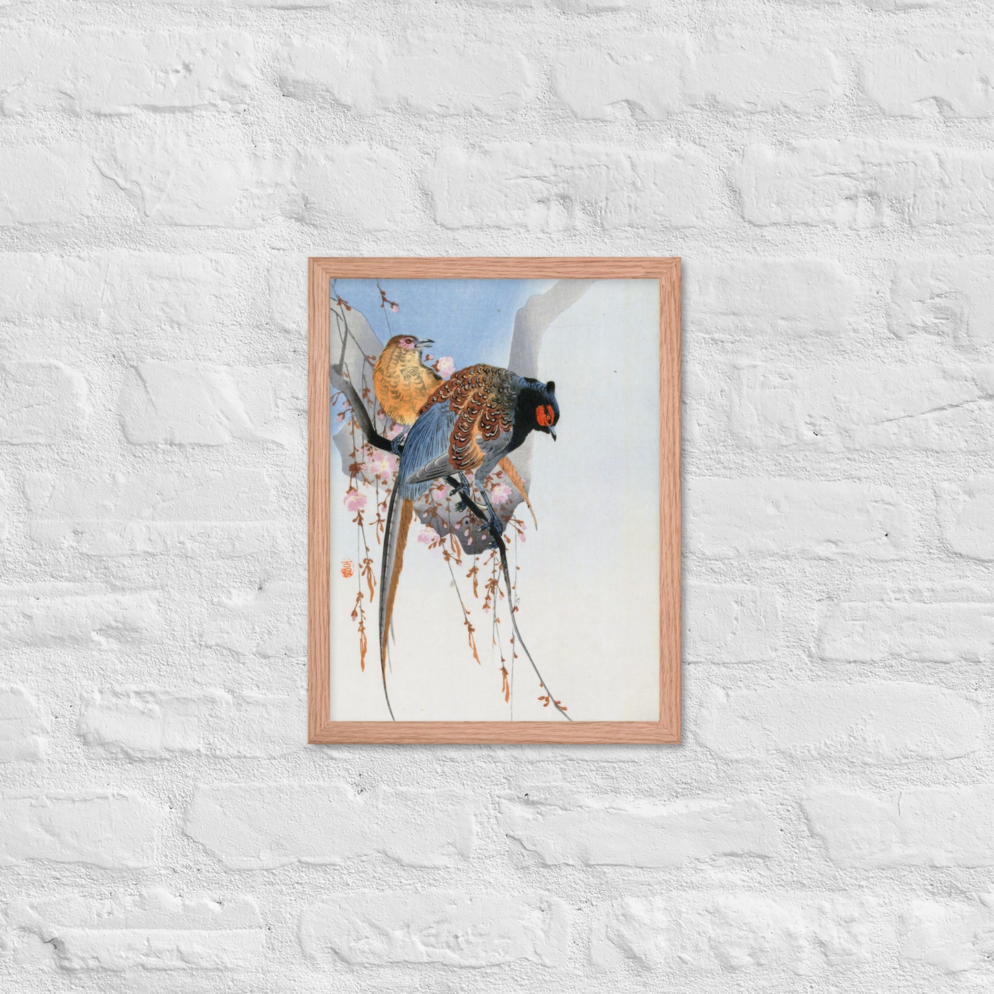 Invite tranquility and timeless beauty into your space with Pheasant Couple and Plum Blossom by Ohara Koson, a serene composition from the tradition of Japanese Woodblock Prints (Ukiyo-e). This framed artwork captures two pheasants perched gracefully on a blossoming branch—one adorned in vivid blue and russet plumage with striking red facial markings, the other in warm earth tones that echo the softness of early spring.