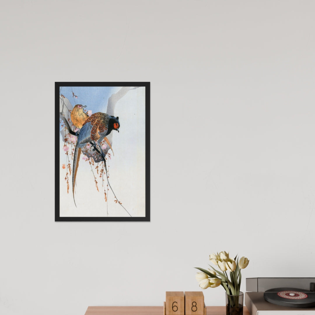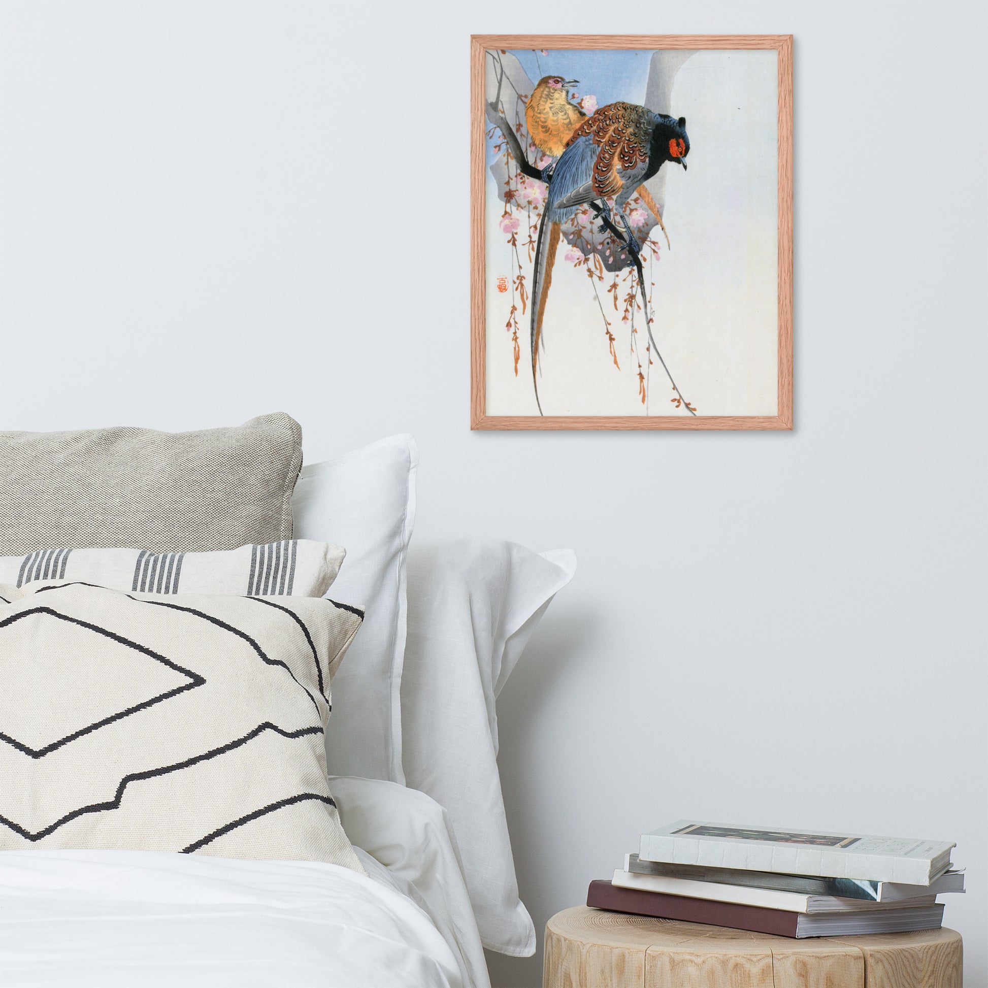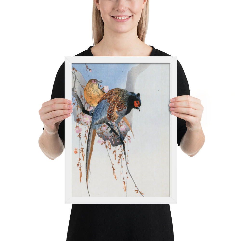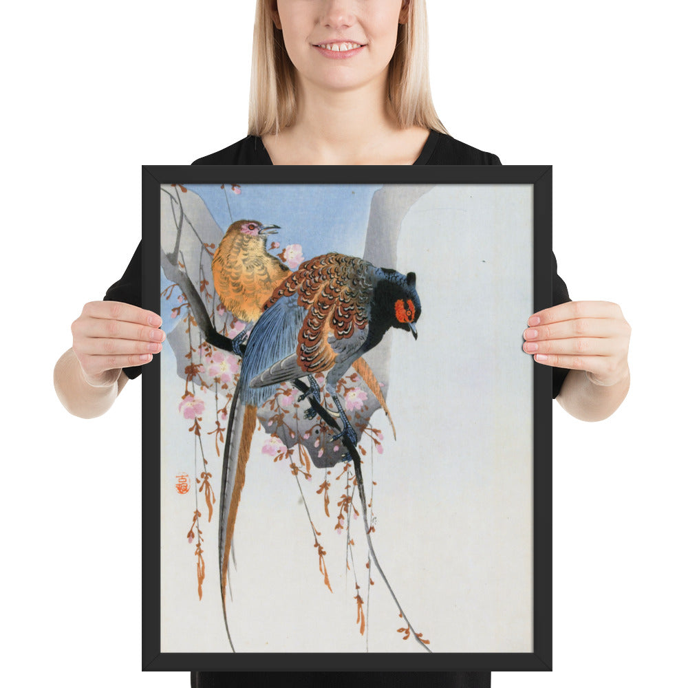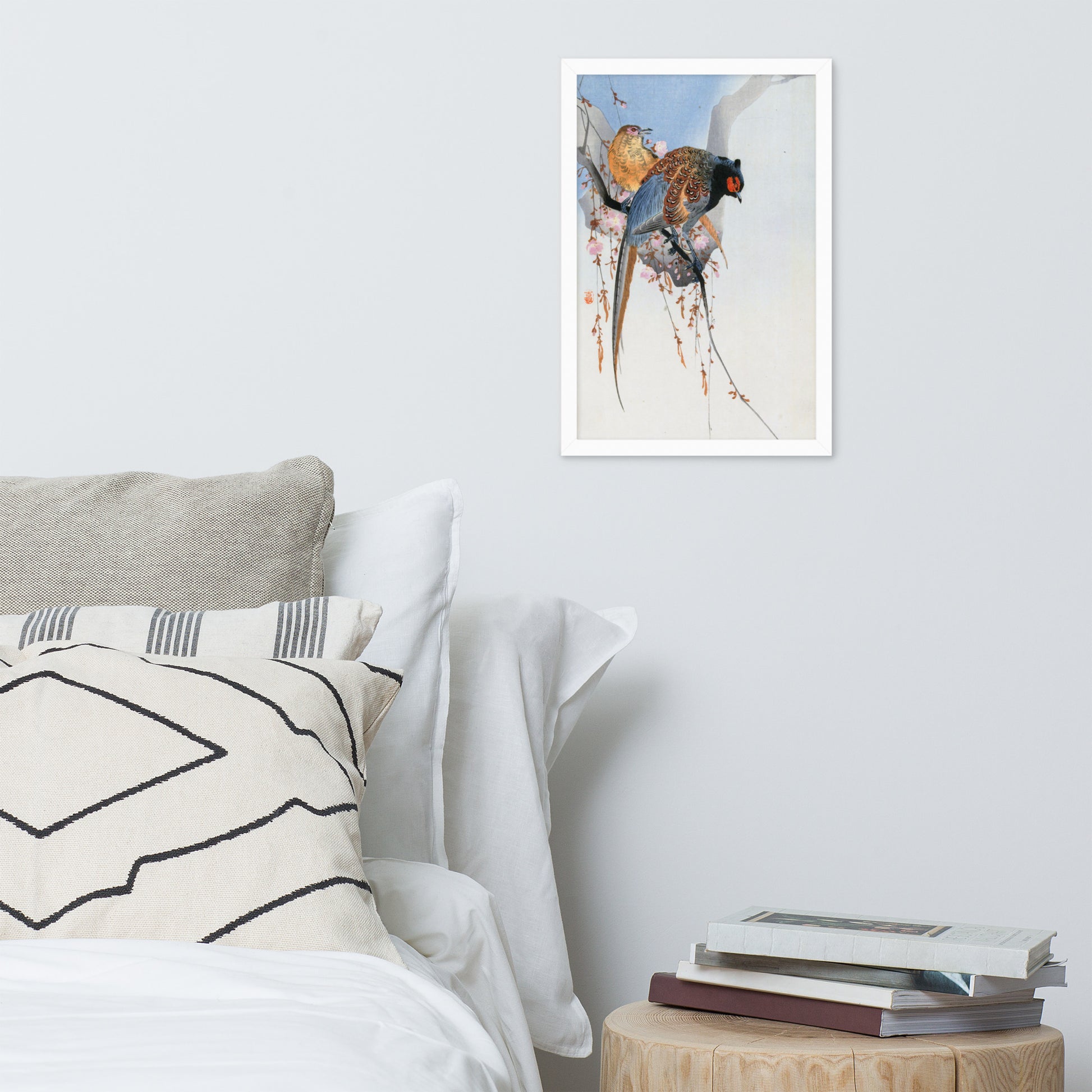 Invite tranquility and timeless beauty into your space with Pheasant Couple and Plum Blossom by Ohara Koson, a serene composition from the tradition of Japanese Woodblock Prints (Ukiyo-e). This framed artwork captures two pheasants perched gracefully on a blossoming branch—one adorned in vivid blue and russet plumage with striking red facial markings, the other in warm earth tones that echo the softness of early spring.