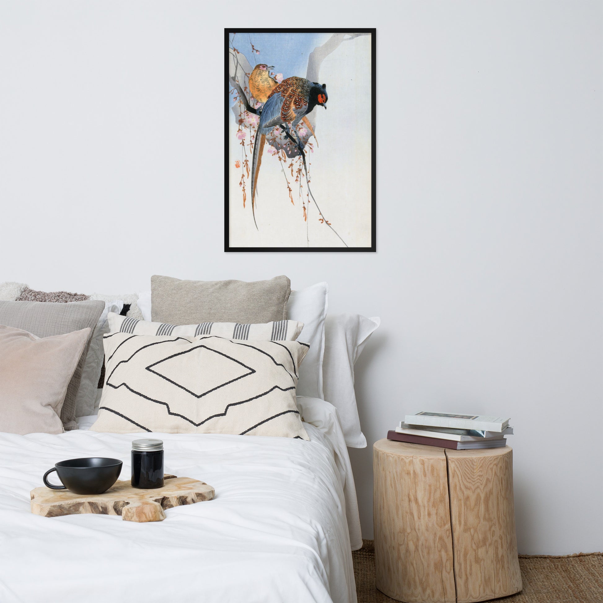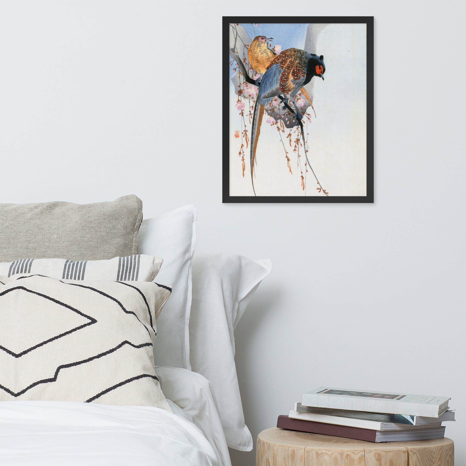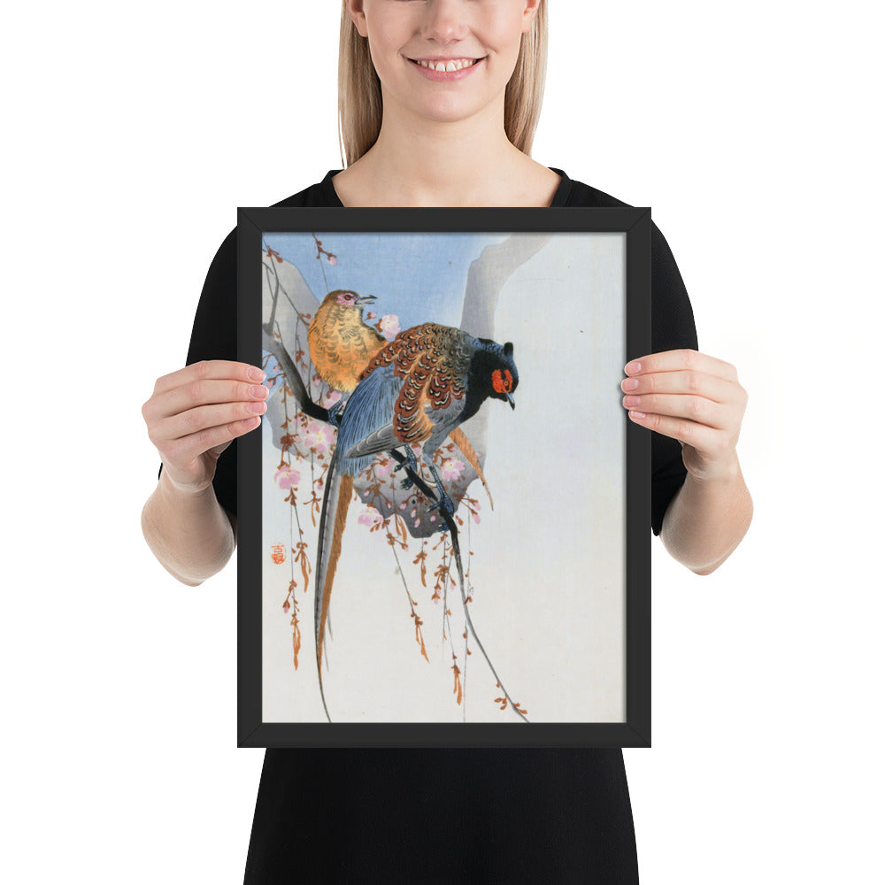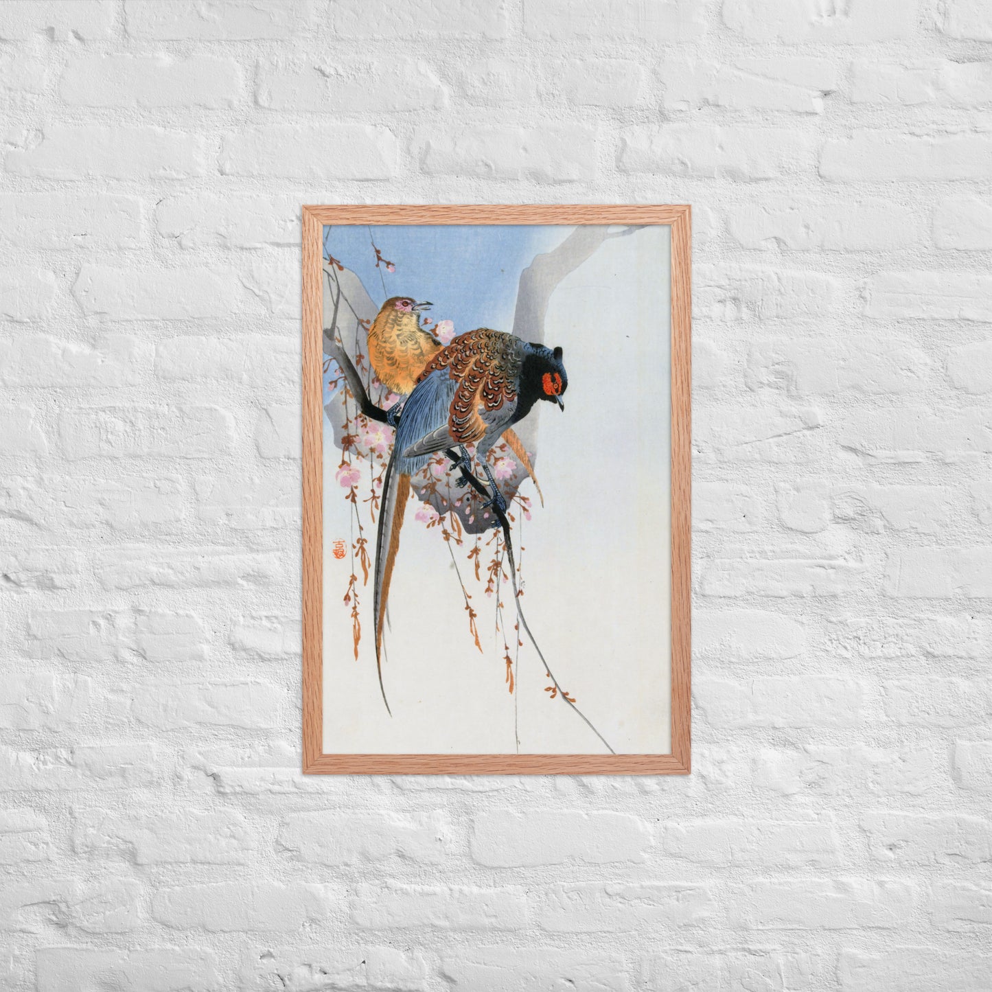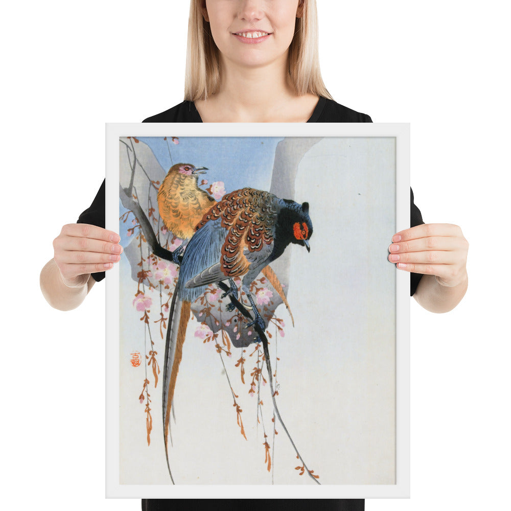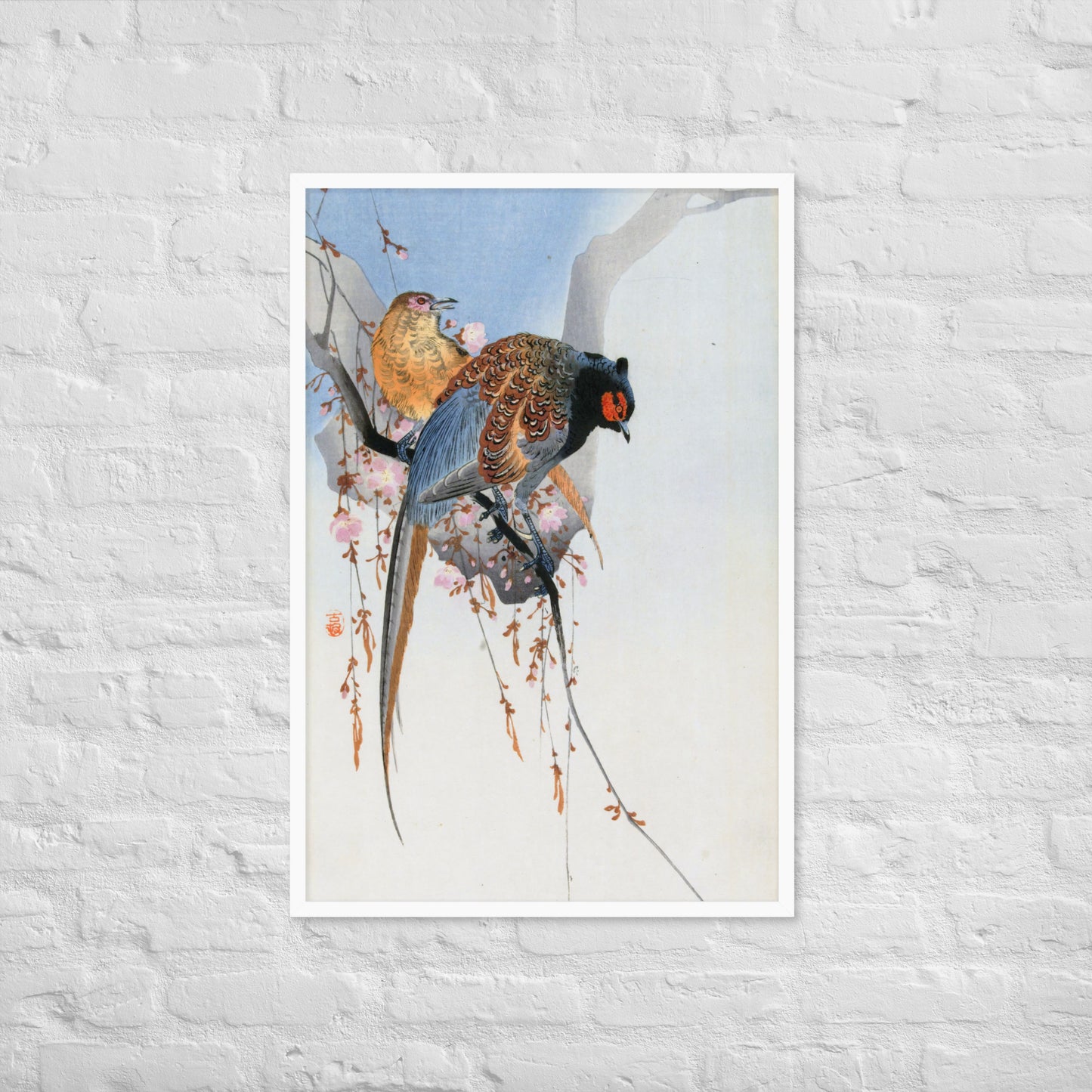 Invite tranquility and timeless beauty into your space with Pheasant Couple and Plum Blossom by Ohara Koson, a serene composition from the tradition of Japanese Woodblock Prints (Ukiyo-e). This framed artwork captures two pheasants perched gracefully on a blossoming branch—one adorned in vivid blue and russet plumage with striking red facial markings, the other in warm earth tones that echo the softness of early spring.
