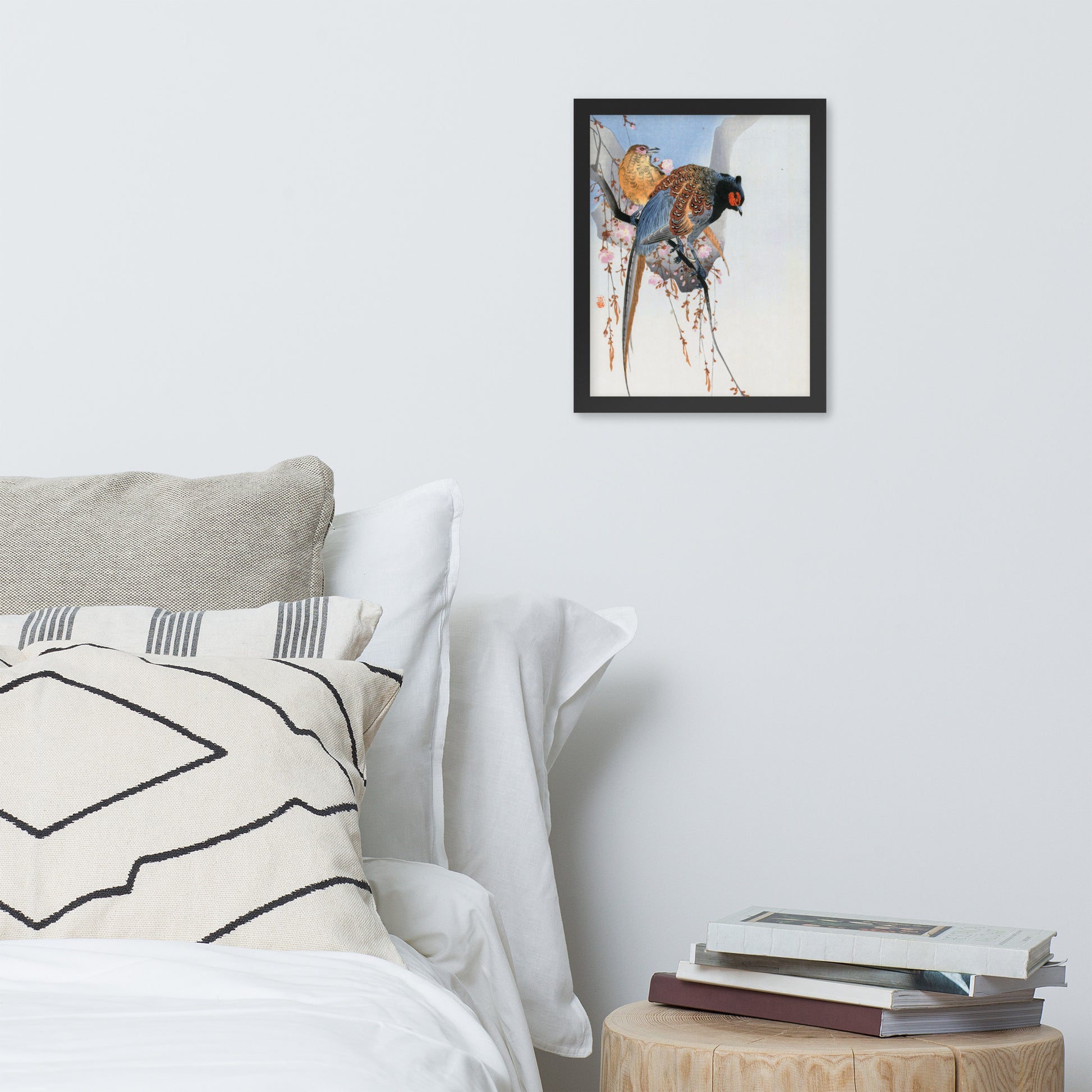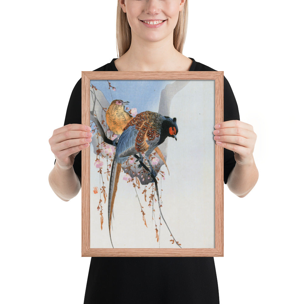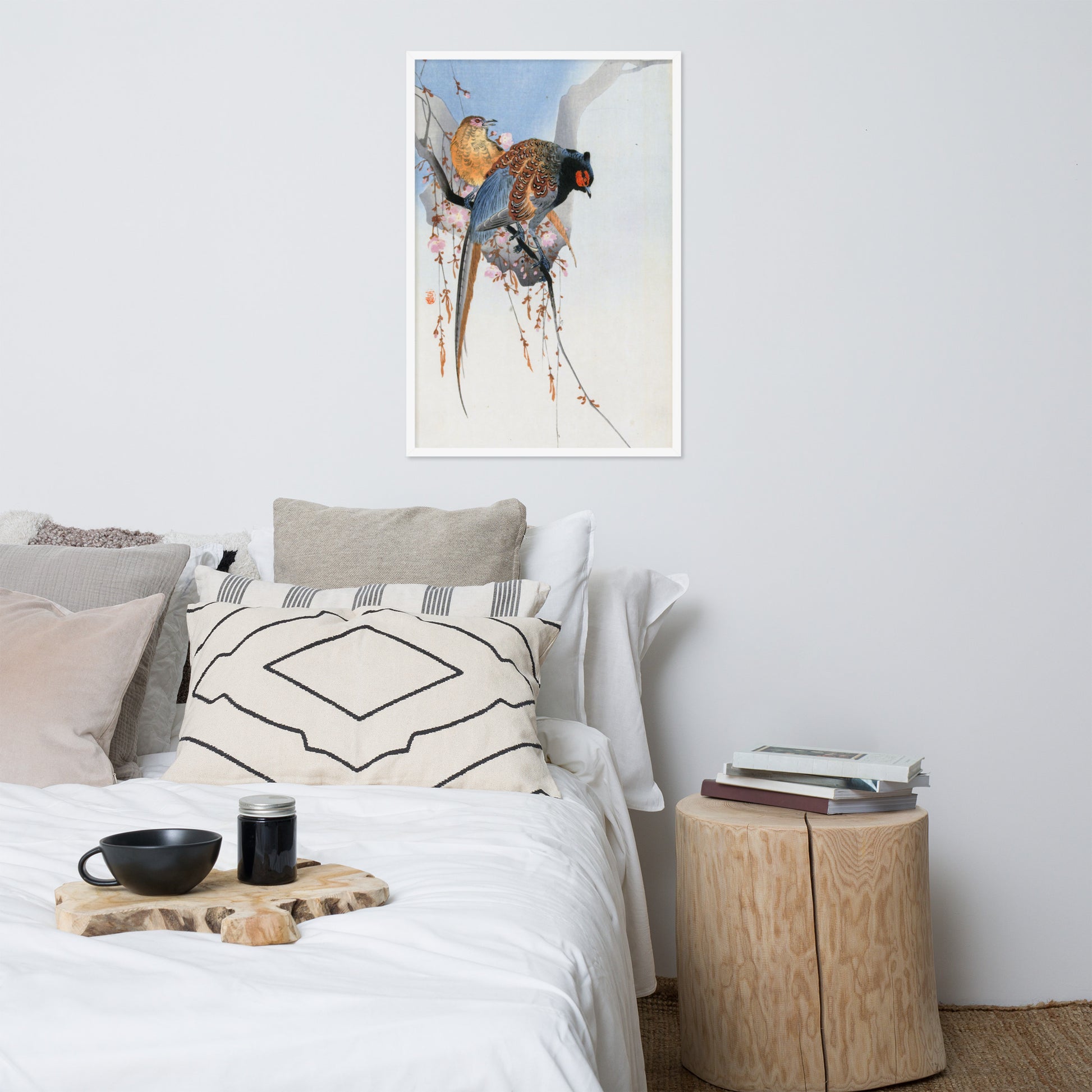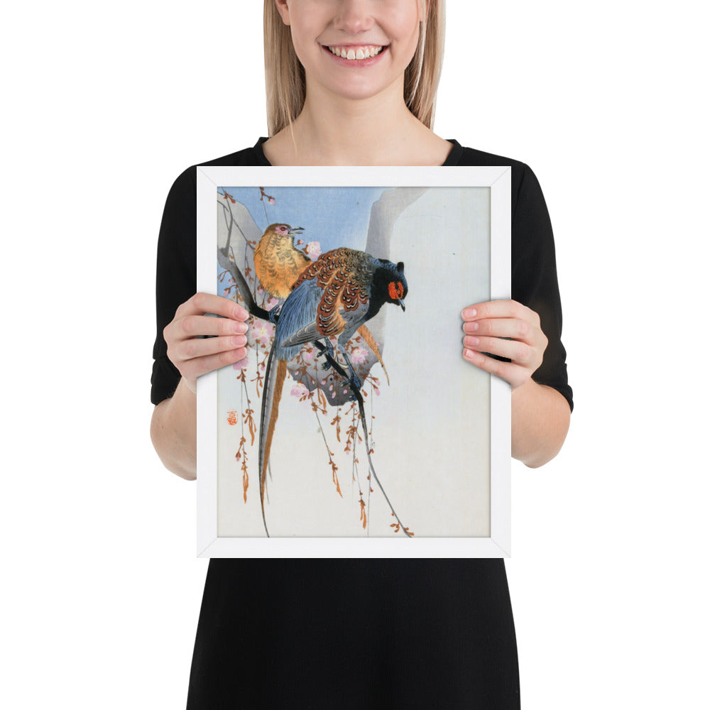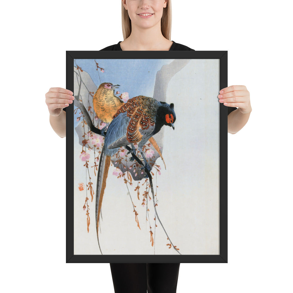 Invite tranquility and timeless beauty into your space with Pheasant Couple and Plum Blossom by Ohara Koson, a serene composition from the tradition of Japanese Woodblock Prints (Ukiyo-e). This framed artwork captures two pheasants perched gracefully on a blossoming branch—one adorned in vivid blue and russet plumage with striking red facial markings, the other in warm earth tones that echo the softness of early spring.