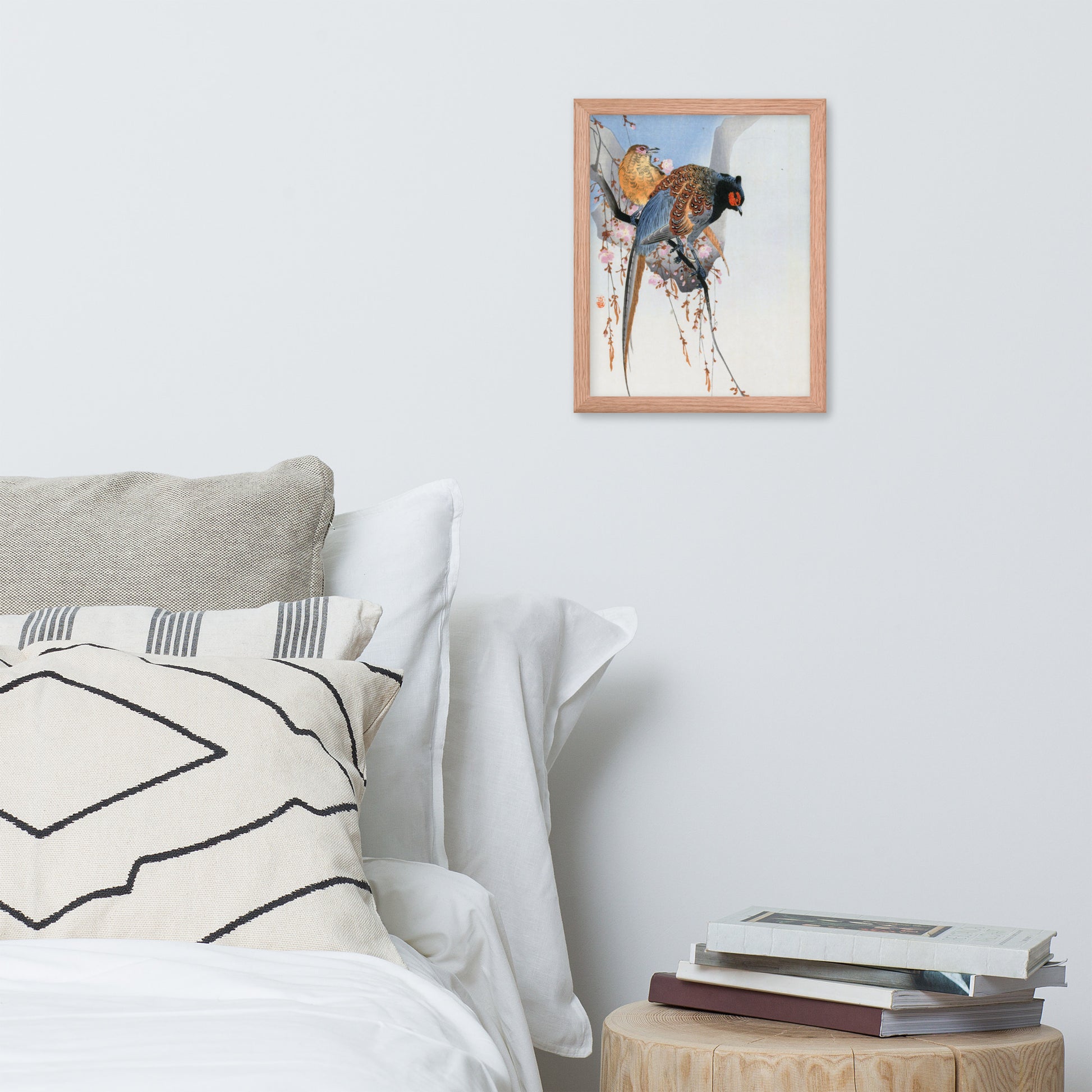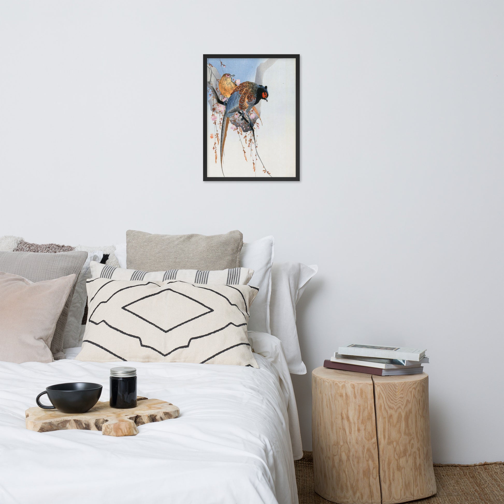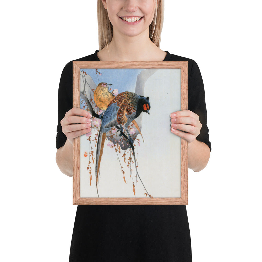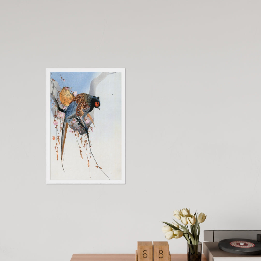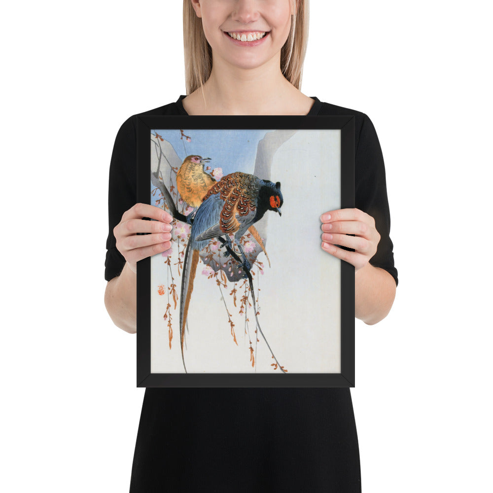 Invite tranquility and timeless beauty into your space with Pheasant Couple and Plum Blossom by Ohara Koson, a serene composition from the tradition of Japanese Woodblock Prints (Ukiyo-e). This framed artwork captures two pheasants perched gracefully on a blossoming branch—one adorned in vivid blue and russet plumage with striking red facial markings, the other in warm earth tones that echo the softness of early spring.